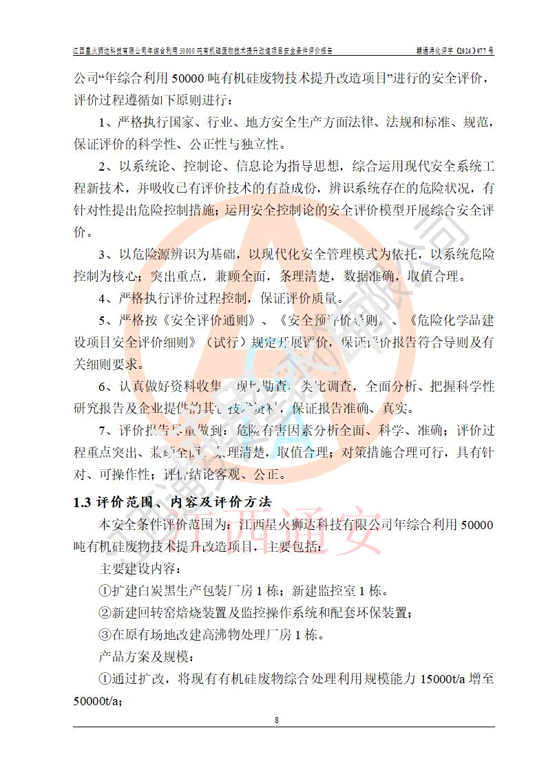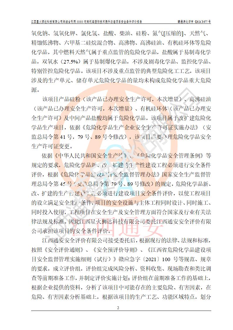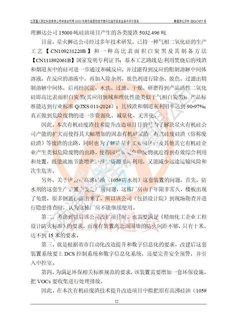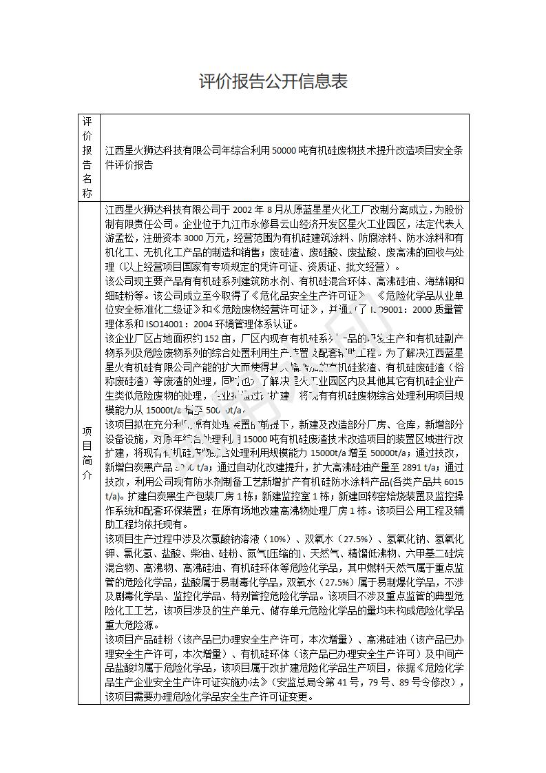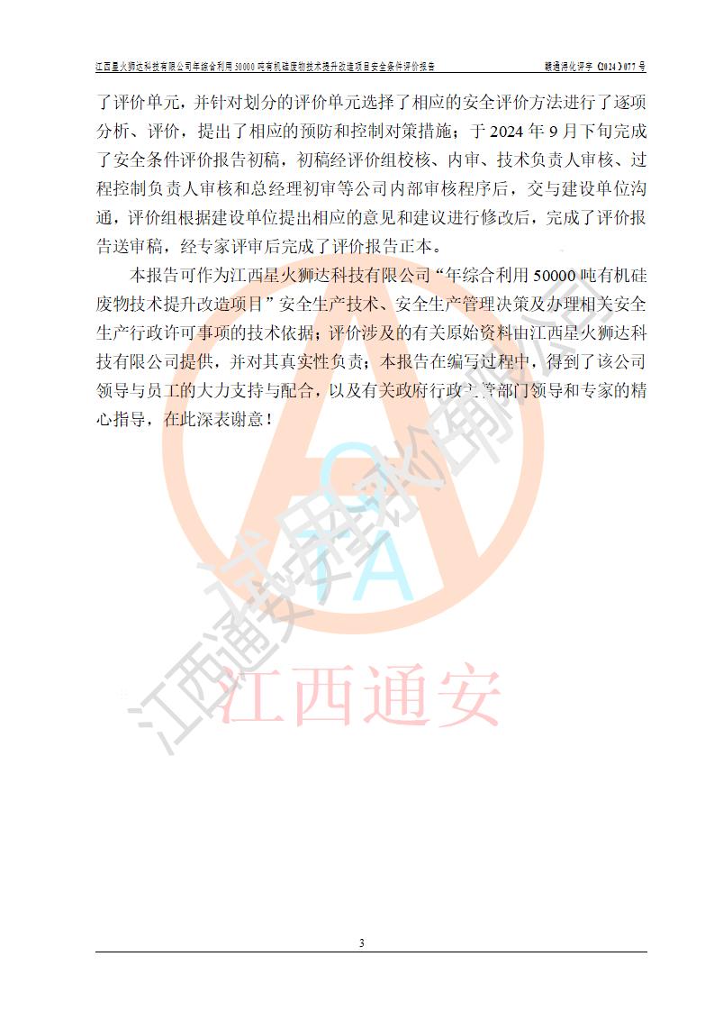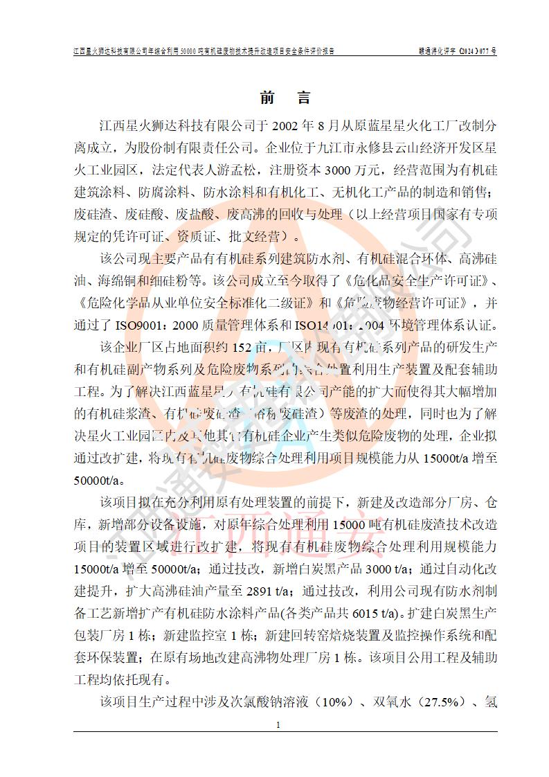 江西星火獅達科技有限公司年綜合利用50000噸有機硅廢物技術(shù)提升改造項目安全條件評價報告