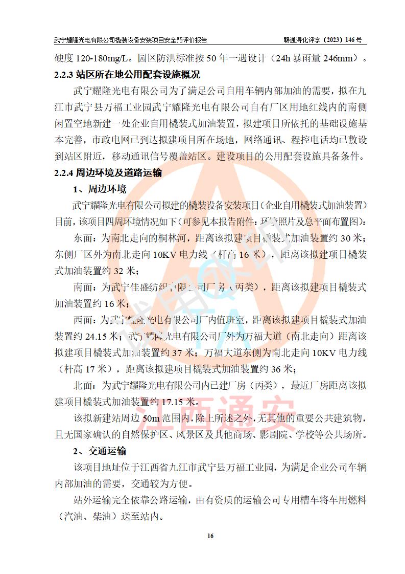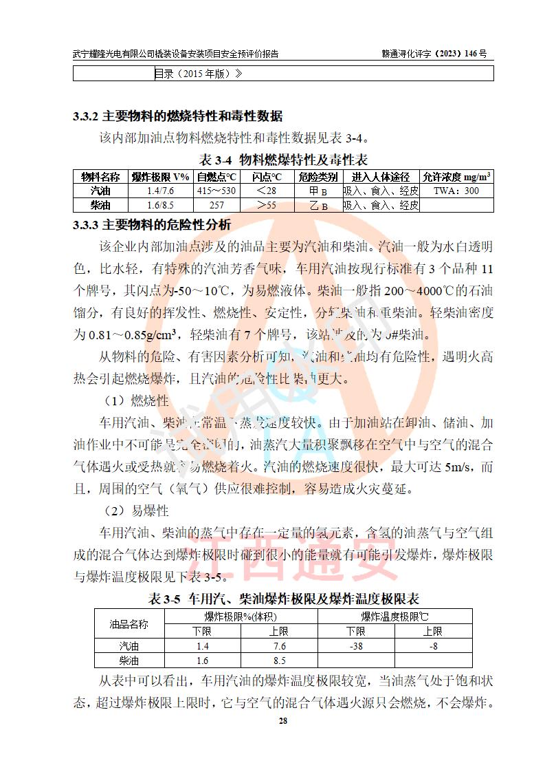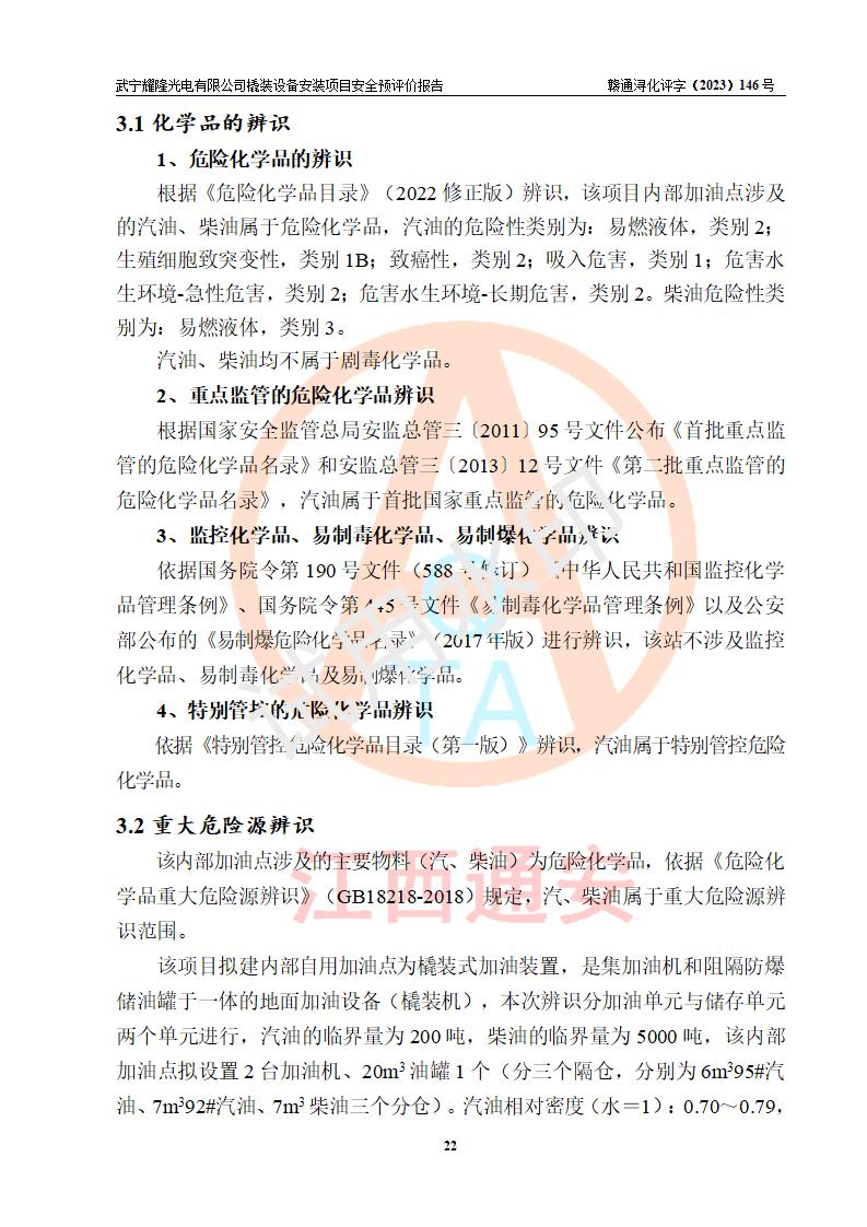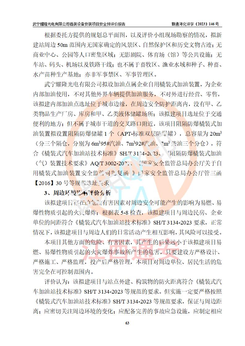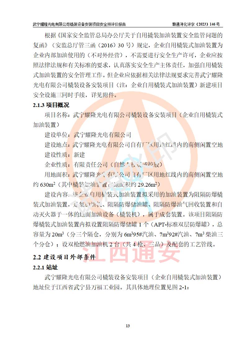 項(xiàng)目簡介 | 武寧耀隆光電有限公司,成立于2013年07月04日。公司地址位于江西省九江市武寧縣萬福工業(yè)園。經(jīng)營范圍:節(jié)能燈、照明電器、LED照明、燈具配件、銷售(以上項(xiàng)目**有專項(xiàng)規(guī)定的憑**許可證經(jīng)營)。 武寧耀隆光電有限公司為了滿足公司自用**內(nèi)部加油的需要,擬在九江市武寧縣萬福工業(yè)園武寧耀隆光電有限公司自有廠區(qū)用地紅線內(nèi)的南側(cè)閑置空地新建一處企業(yè)自用橇裝式加油裝置,該企業(yè)自用橇裝式加油裝置擬采用的加油裝置為阻隔防爆橇裝式加油裝置,是集加油機(jī)、阻隔防爆儲(chǔ)油罐、阻隔防爆油氣回收裝置和自動(dòng)滅火器于一體的地面加油設(shè)備(橇裝機(jī)),屬于成套裝置。該項(xiàng)目阻隔防爆橇裝式加油裝置擬設(shè)置阻隔防爆儲(chǔ)罐1個(gè)(APT-標(biāo)準(zhǔn)雙層防爆罐),總?cè)萘繛?/span>20m3 該項(xiàng)目擬建內(nèi)部自用加油點(diǎn)涉及的汽油、柴油為易燃液體,屬于《危險(xiǎn)化學(xué)品目錄》([2022]第8號(hào)公告修改)內(nèi)危險(xiǎn)化學(xué)品,汽油還屬于**重點(diǎn)監(jiān)管和特別管控的危險(xiǎn)化學(xué)品。 該項(xiàng)目擬建內(nèi)部加油點(diǎn)不涉及劇毒品、監(jiān)控化學(xué)品、易制毒化學(xué)品、易制爆化學(xué)品。 該加油站點(diǎn)涉及的汽油屬于《危險(xiǎn)化學(xué)品重大危險(xiǎn)源辨識(shí)》范圍內(nèi)物質(zhì),其加油單元與儲(chǔ)存單元均未*過規(guī)定的臨界量,未構(gòu)成危險(xiǎn)化學(xué)品重大危險(xiǎn)源。 | |||