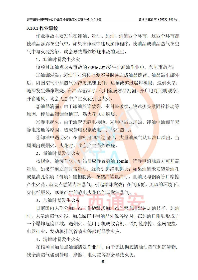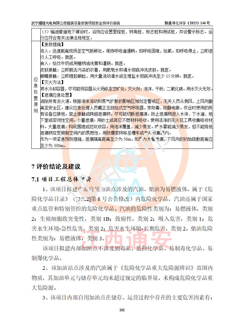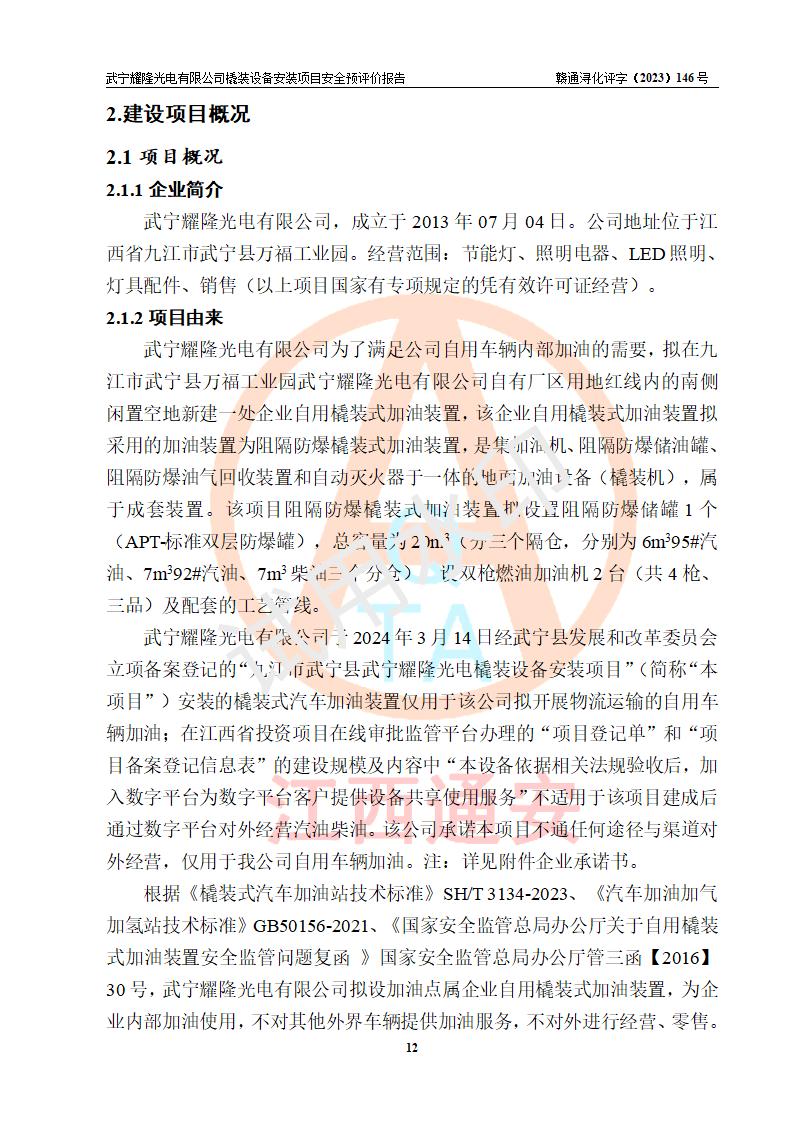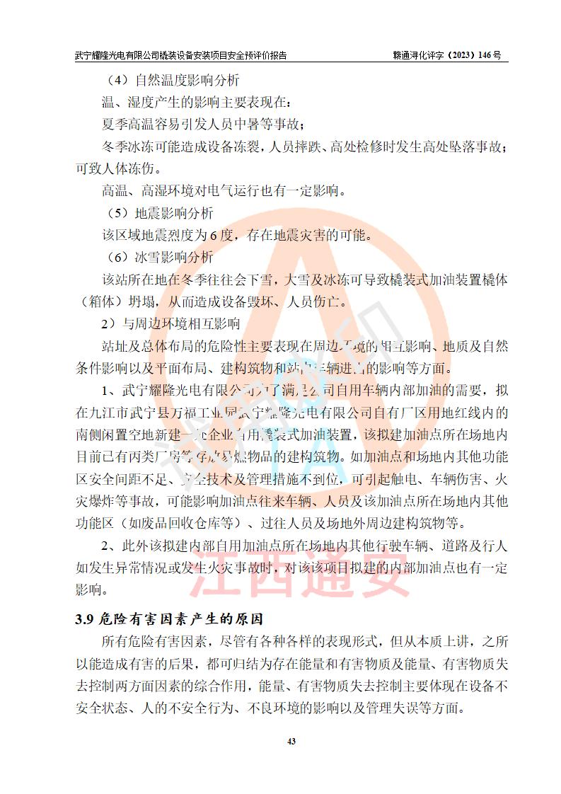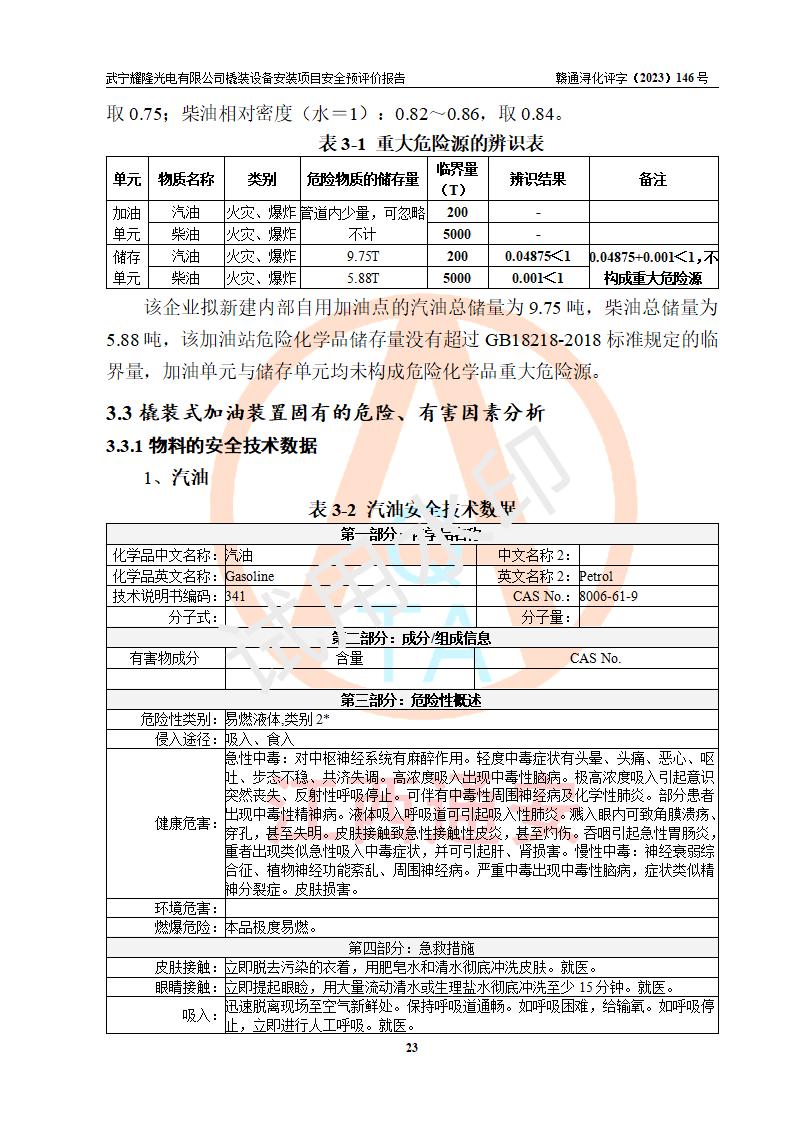項(xiàng)目簡介 | 武寧耀隆光電有限公司,成立于2013年07月04日。公司地址位于江西省九江市武寧縣萬福工業(yè)園。經(jīng)營范圍:節(jié)能燈、照明電器、LED照明、燈具配件、銷售(以上項(xiàng)目**有專項(xiàng)規(guī)定的憑**許可證經(jīng)營)。 武寧耀隆光電有限公司為了滿足公司自用**內(nèi)部加油的需要,擬在九江市武寧縣萬福工業(yè)園武寧耀隆光電有限公司自有廠區(qū)用地紅線內(nèi)的南側(cè)閑置空地新建一處企業(yè)自用橇裝式加油裝置,該企業(yè)自用橇裝式加油裝置擬采用的加油裝置為阻隔防爆橇裝式加油裝置,是集加油機(jī)、阻隔防爆儲(chǔ)油罐、阻隔防爆油氣回收裝置和自動(dòng)滅火器于一體的地面加油設(shè)備(橇裝機(jī)),屬于成套裝置。該項(xiàng)目阻隔防爆橇裝式加油裝置擬設(shè)置阻隔防爆儲(chǔ)罐1個(gè)(APT-標(biāo)準(zhǔn)雙層防爆罐),總?cè)萘繛?/span>20m3 該項(xiàng)目擬建內(nèi)部自用加油點(diǎn)涉及的汽油、柴油為易燃液體,屬于《危險(xiǎn)化學(xué)品目錄》([2022]第8號(hào)公告修改)內(nèi)危險(xiǎn)化學(xué)品,汽油還屬于**重點(diǎn)監(jiān)管和特別管控的危險(xiǎn)化學(xué)品。 該項(xiàng)目擬建內(nèi)部加油點(diǎn)不涉及劇毒品、監(jiān)控化學(xué)品、易制毒化學(xué)品、易制爆化學(xué)品。 該加油站點(diǎn)涉及的汽油屬于《危險(xiǎn)化學(xué)品重大危險(xiǎn)源辨識(shí)》范圍內(nèi)物質(zhì),其加油單元與儲(chǔ)存單元均未*過規(guī)定的臨界量,未構(gòu)成危險(xiǎn)化學(xué)品重大危險(xiǎn)源。 | |||