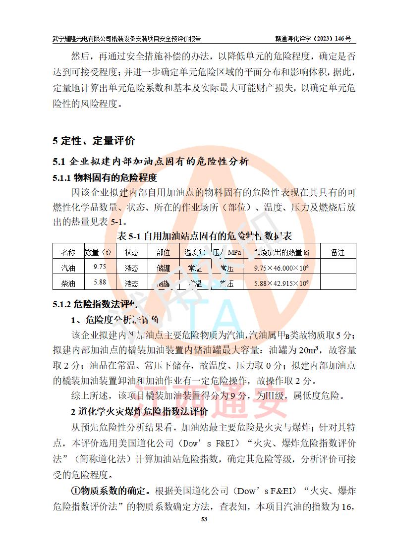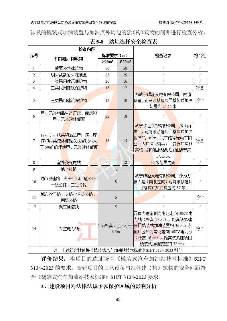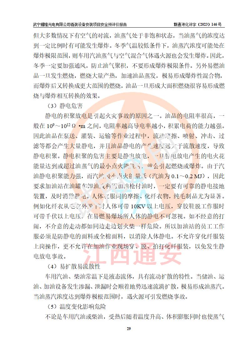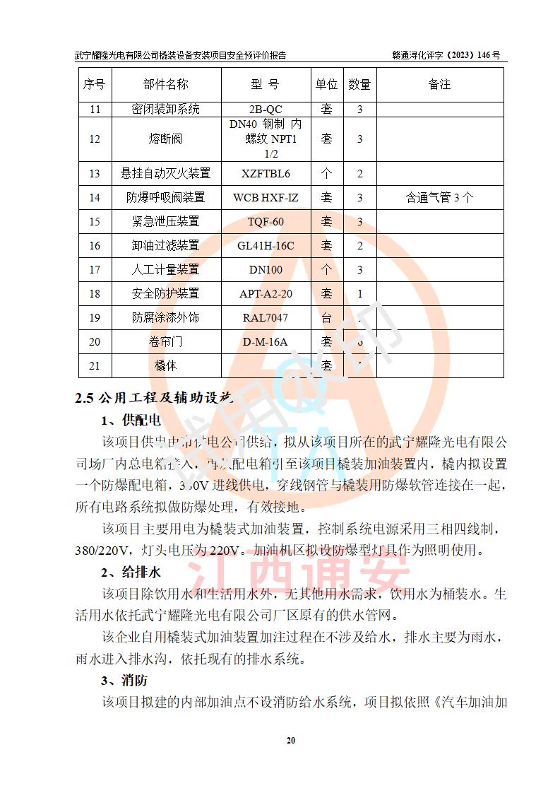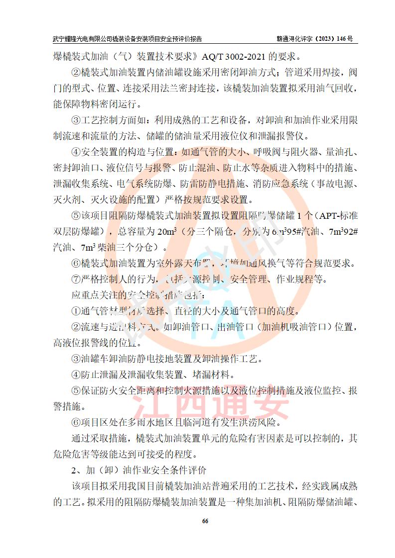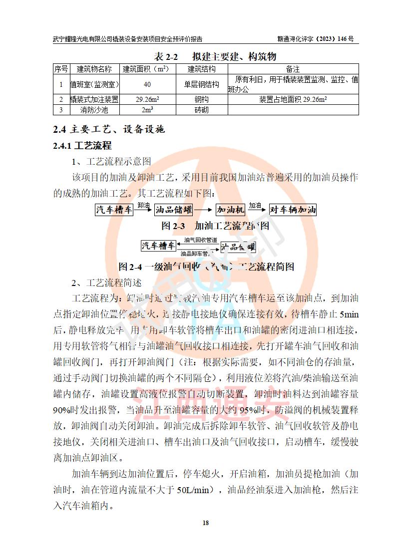 項(xiàng)目簡介 | 武寧耀隆光電有限公司,成立于2013年07月04日。公司地址位于江西省九江市武寧縣萬福工業(yè)園。經(jīng)營范圍:節(jié)能燈、照明電器、LED照明、燈具配件、銷售(以上項(xiàng)目**有專項(xiàng)規(guī)定的憑**許可證經(jīng)營)。 武寧耀隆光電有限公司為了滿足公司自用**內(nèi)部加油的需要,擬在九江市武寧縣萬福工業(yè)園武寧耀隆光電有限公司自有廠區(qū)用地紅線內(nèi)的南側(cè)閑置空地新建一處企業(yè)自用橇裝式加油裝置,該企業(yè)自用橇裝式加油裝置擬采用的加油裝置為阻隔防爆橇裝式加油裝置,是集加油機(jī)、阻隔防爆儲(chǔ)油罐、阻隔防爆油氣回收裝置和自動(dòng)滅火器于一體的地面加油設(shè)備(橇裝機(jī)),屬于成套裝置。該項(xiàng)目阻隔防爆橇裝式加油裝置擬設(shè)置阻隔防爆儲(chǔ)罐1個(gè)(APT-標(biāo)準(zhǔn)雙層防爆罐),總?cè)萘繛?/span>20m3 該項(xiàng)目擬建內(nèi)部自用加油點(diǎn)涉及的汽油、柴油為易燃液體,屬于《危險(xiǎn)化學(xué)品目錄》([2022]第8號(hào)公告修改)內(nèi)危險(xiǎn)化學(xué)品,汽油還屬于**重點(diǎn)監(jiān)管和特別管控的危險(xiǎn)化學(xué)品。 該項(xiàng)目擬建內(nèi)部加油點(diǎn)不涉及劇毒品、監(jiān)控化學(xué)品、易制毒化學(xué)品、易制爆化學(xué)品。 該加油站點(diǎn)涉及的汽油屬于《危險(xiǎn)化學(xué)品重大危險(xiǎn)源辨識(shí)》范圍內(nèi)物質(zhì),其加油單元與儲(chǔ)存單元均未*過規(guī)定的臨界量,未構(gòu)成危險(xiǎn)化學(xué)品重大危險(xiǎn)源。 | |||