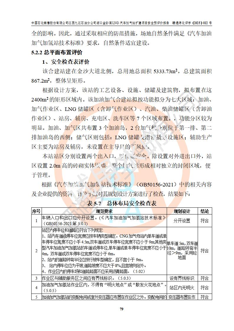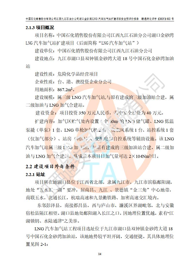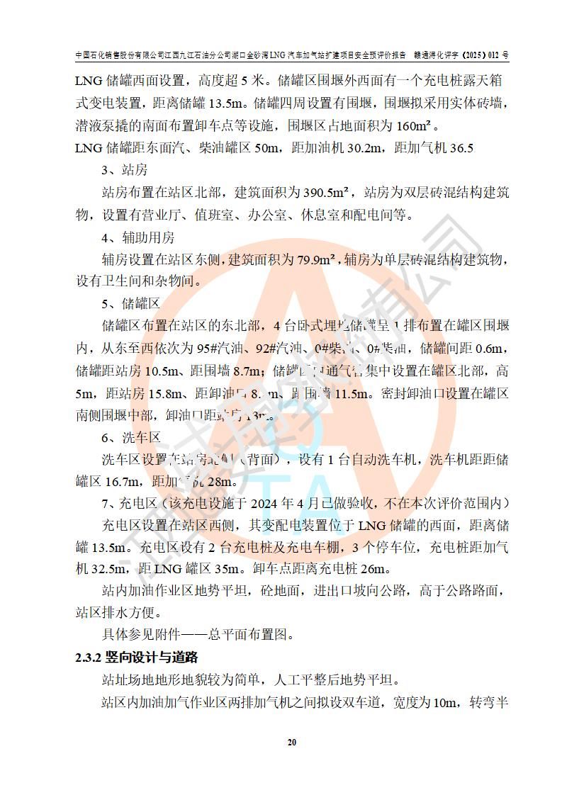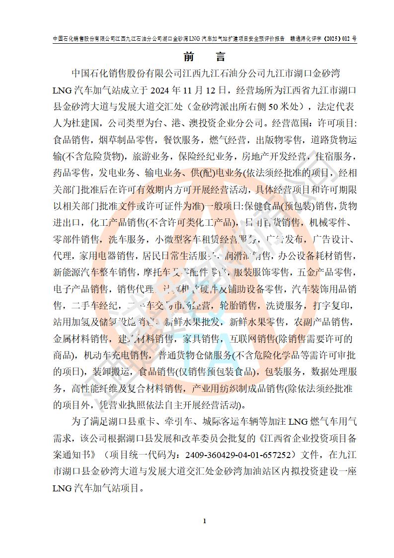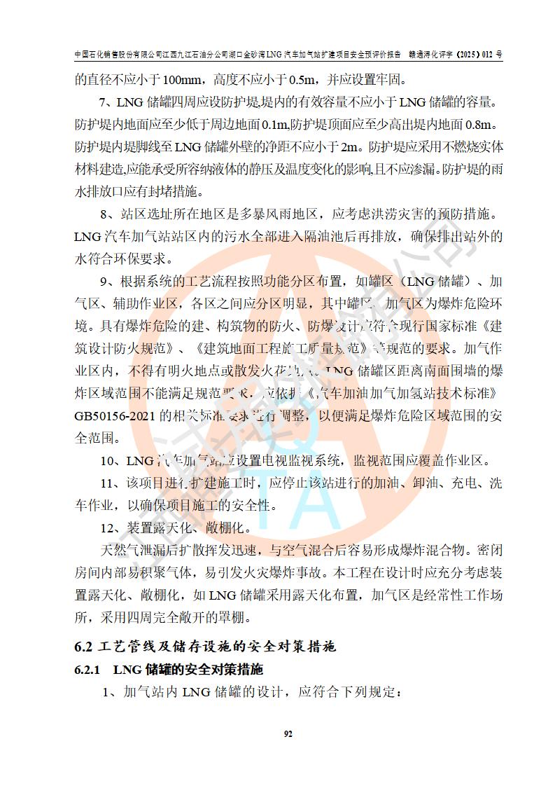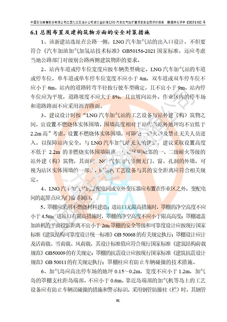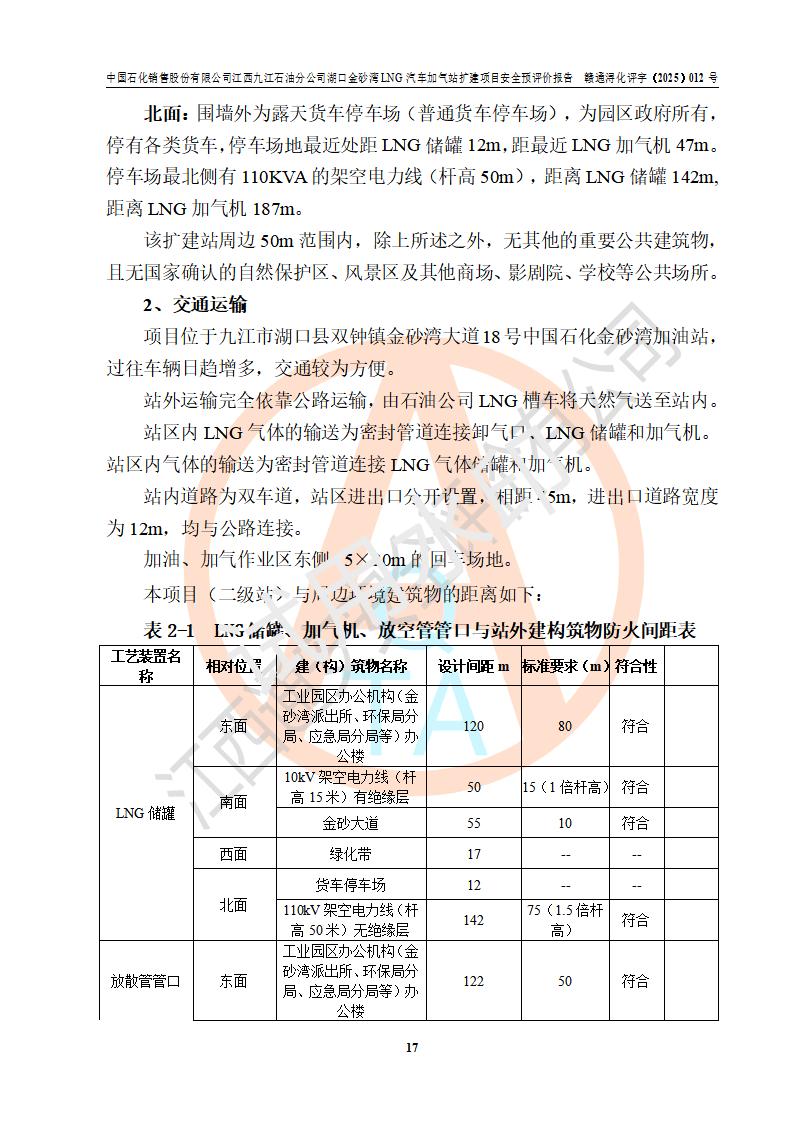 項目簡介 | 中國石化銷售股份有限公司江西九江石油分公司九江市湖口金砂灣LNG汽車加氣站成立于2024年11月12日,經(jīng)營場所為江西省九江市湖口縣金砂灣大道與發(fā)展大道交匯處(金砂灣派出所右側50米處),法定**人為杜建國,公司類型為臺、港、澳投資企業(yè)分公司。經(jīng)營范圍:許可項目:食品銷售,煙草制品零售,餐飲服務,燃氣經(jīng)營,出版物零售,道路貨物運輸(不含危險貨物),旅游業(yè)務,**經(jīng)紀業(yè)務,房地產(chǎn)開發(fā)經(jīng)營,住宿服務,藥品零售,發(fā)電業(yè)務、輸電業(yè)務、供(配)電業(yè)務(依法須經(jīng)批準的項目,經(jīng)相關部門批準后在許可**期內方可開展經(jīng)營活動,具體經(jīng)營項目和許可期限以相關部門批準文件或許可證件為準)一般項日:保健食品(預包裝)銷售,貨物進出口,化工產(chǎn)品銷售(不含許可類化工產(chǎn)品),日用百貨銷售,機械零件、零部件銷售,洗車服務,小微型客車租賃經(jīng)營服務,廣告發(fā)布,廣告設計、代理,家用電器銷售,居民日常生活服務,潤滑油銷售,辦公設備耗材銷售,新能源汽車整車銷售,摩托車及零配件零售,服裝服飾零售,五金產(chǎn)品零售,電子產(chǎn)品銷售,銷售代理,計算機軟硬件及鋪助設備零售,汽車裝飾用品銷售,二手車經(jīng)紀,二手車交易市場經(jīng)營,輪胎銷售,洗燙服務,打字復印,站用加氫及儲氫設施銷售,新鮮水果批發(fā),新鮮水果零售,農(nóng)副產(chǎn)品銷售,金屬材料銷售,建筑材料銷售,家具銷售,互聯(lián)網(wǎng)銷售(除銷售需要許可的商品),機動車充電銷售,普通貨物倉儲服務(不含危險化學品等需許可審批的項日),裝卸搬運,食品銷售(僅銷售預包裝食品),包裝服務,數(shù)據(jù)處理服務,***纖維及復合材料銷售,產(chǎn)業(yè)用紡織制成品銷售(除依法須經(jīng)批準的項目外,憑營業(yè)執(zhí)照依法自主開展經(jīng)營活動)。 為了滿足湖口縣重卡、牽引車、城際客運**等加注LNG燃氣車用氣需求,該公司根據(jù)湖口縣發(fā)展和改革委員會批復的《江西省企業(yè)投資項目備案通知書》(項目統(tǒng)一代碼為:2409-360429-04-01-657252)文件,在九江市湖口縣金砂灣大道與發(fā)展大道交匯處金砂灣加油站區(qū)內擬投資建設一座LNG汽車加氣站項目。 湖口金砂灣加油站的建設用地已取得湖口縣不動產(chǎn)登記局頒發(fā)的不動產(chǎn)權證書:贛(2023)湖口縣不動產(chǎn)權第0002564號。 擬擴建LNG汽車加氣站總用地面積為5333.73m2,總建筑面積為867.2m2,站區(qū)內加氣機擬設置為2機2槍。LNG貯氣區(qū)內設置1個60m3的LNG儲氣罐、LNG低溫泵撬1套(含雙泵、BOG空溫式加熱器),加氣能力為2×104Nm3/d。按現(xiàn)行《汽車加油加氣加氫站技術標準》對LNG加氣站的等級劃分,該LNG汽車加氣站屬三級站,與原有建成的三級加油站合建,屬二級加油與LNG加氣合建站。建成后本項目日加氣量可達2×104Nm3/日。 該二級加油與LNG加氣合建站內加氣設施已于2017年建設完成,但一直未投入使用?,F(xiàn)因公司市場發(fā)展需要,擬重新啟動投入使用。依據(jù)《中華人民共和國安全生產(chǎn)法》、《燃氣經(jīng)營許可管理辦法》、《城鎮(zhèn)燃氣管理條例》等法律和規(guī)定的要求,新建、改建、擴建危險化學品儲存裝置和設施的建設項目安全條件審查(審批、核準、備案)前,建設單位應當選擇有資質的安全評價機構對建設項目進行安全條件評價,以**工程項目的安全設施與主體工程同時設計、同時施工、同時投入使用,為**工程項目在安全生產(chǎn)及安全管理方面符合**及行業(yè)有關法律法規(guī)及標準,中國石化銷售股份有限公司江西江西九江石油分公司湖口金砂灣LNG汽車加氣站擴建項目委托江西通安安全評價有限公司承擔中國石化銷售股份有限公司江西九江石油分公司湖口金砂灣LNG汽車加氣站擴建項目的安全預評價。該企業(yè)應辦理燃氣經(jīng)營許可證。 江西通安安全評價有限公司接受委托后,成立了評價組,于2025年2月踏勘了建設地址。根據(jù)相關法律、法規(guī)和標準的規(guī)定,按照《安全評價通則》(AQ8001-2007)、《安全預評價導則》(AQ8002-2007)的要求,在資料收集、現(xiàn)場勘探和類比調查的基礎上,對項目的工程技術資料進行了認真分析。建設項目內在的危險、有害因素對建設項目周邊單位生產(chǎn)、經(jīng)營活動或者居民生活的影響以及建設項目周邊單位生產(chǎn)、經(jīng)營活動或者居民生活對建設項目的影響等,經(jīng)過定性分析與定量計算,編制完成了本建設項目安全預評價報告,為相關部門實行安全監(jiān)察、為**相關部門建設項目設立安全審查以及為企業(yè)建設項目實施“三同時”提供安全技術依據(jù)。 本次安全評價范圍:中國石化銷售股份有限公司江西九江石油分公司湖口金砂灣LNG汽車加氣站擴建項目的選址、總平面布置、主體裝置和輔助設施的安全條件,包括經(jīng)營過程中的危險和危害因素、建設項目的安全條件以及規(guī)劃設計中提出的工藝、設備設施的安全可靠性和勞動安全管理方面的組織、機構、人員、防護設施、作業(yè)環(huán)境及管理制度等。 本站中涉及加油作業(yè)、汽、柴油儲罐區(qū)、充電作業(yè)、洗車作業(yè)、站房頂光伏板區(qū)均不在此次評價范圍內,僅作一般性描述。涉及工程的環(huán)境、消防及職業(yè