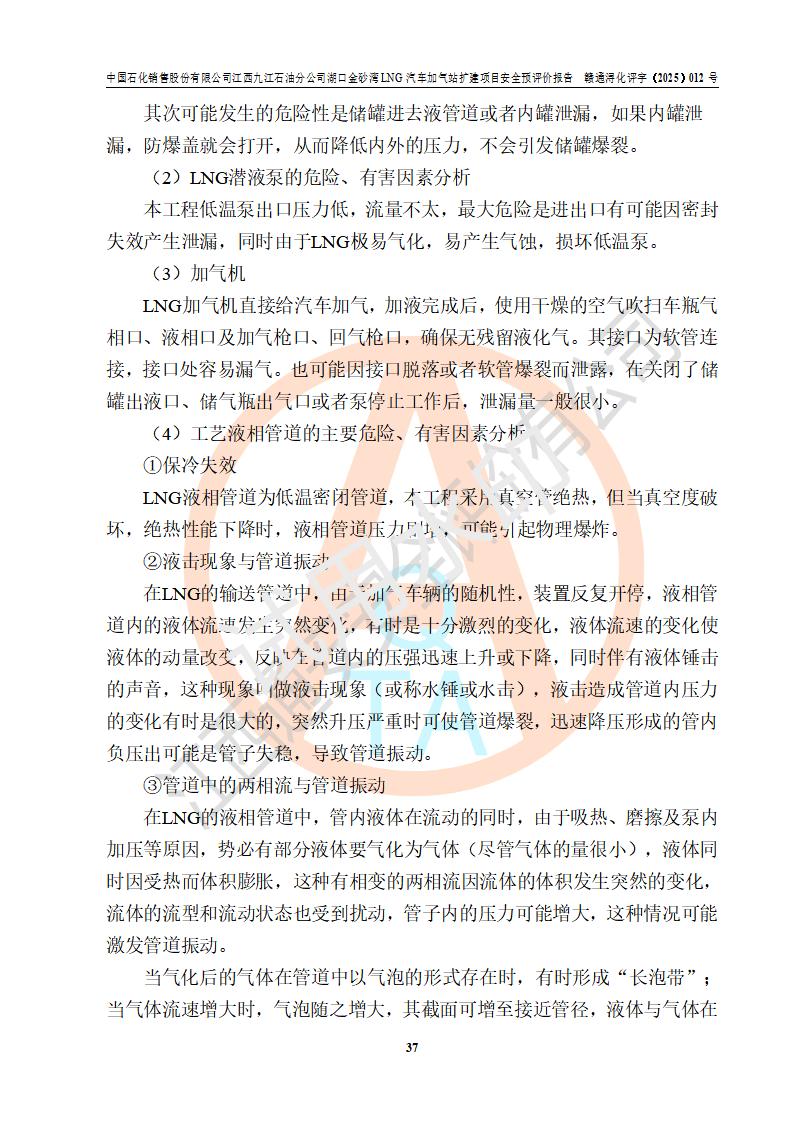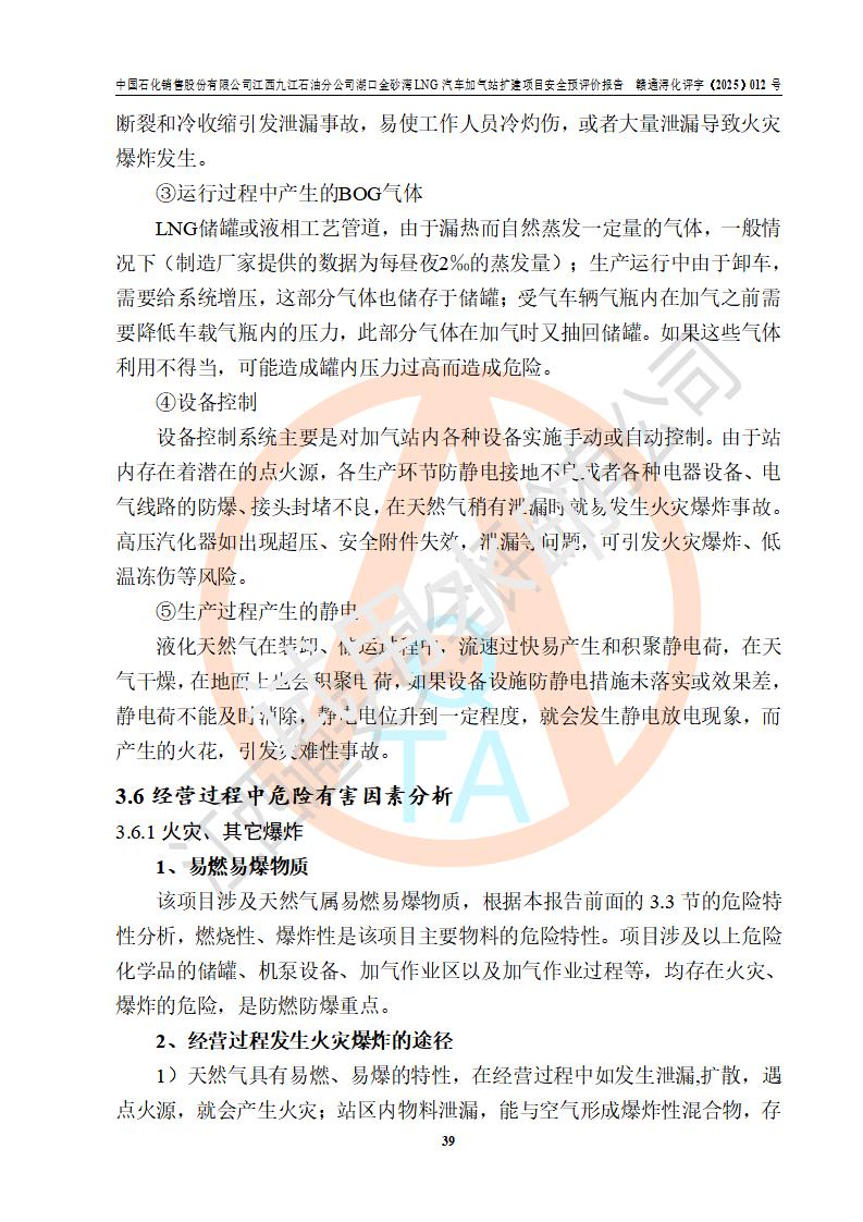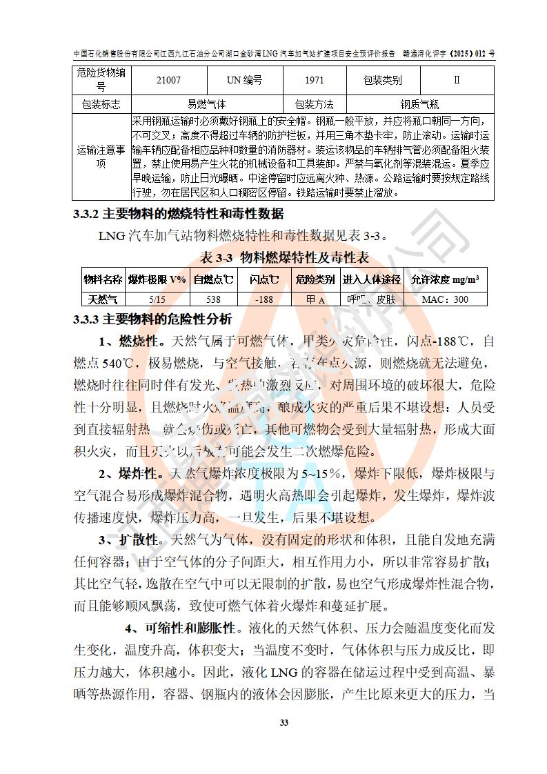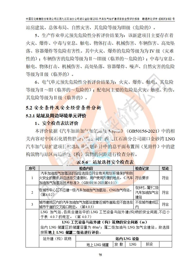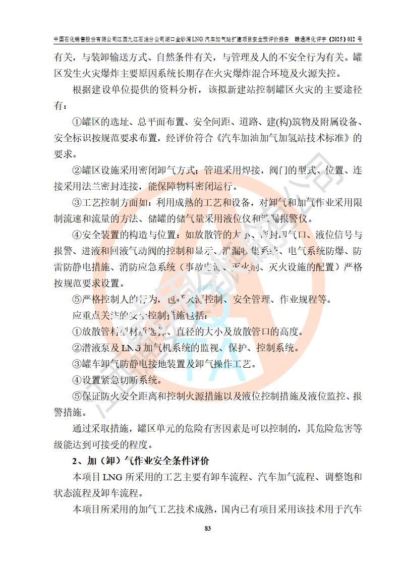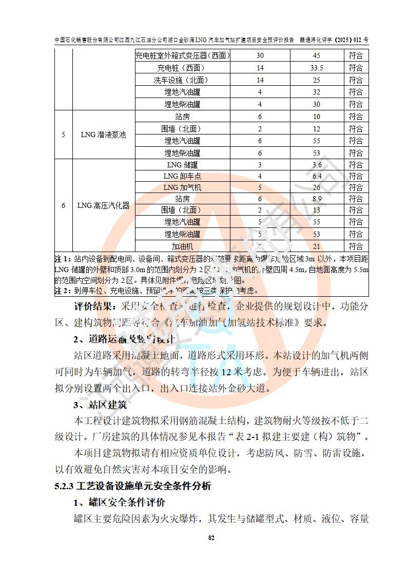 項目簡介 | 中國石化銷售股份有限公司江西九江石油分公司九江市湖口金砂灣LNG汽車加氣站成立于2024年11月12日,經(jīng)營場所為江西省九江市湖口縣金砂灣大道與發(fā)展大道交匯處(金砂灣派出所右側50米處),法定**人為杜建國,公司類型為臺、港、澳投資企業(yè)分公司。經(jīng)營范圍:許可項目:食品銷售,煙草制品零售,餐飲服務,燃氣經(jīng)營,出版物零售,道路貨物運輸(不含危險貨物),旅游業(yè)務,**經(jīng)紀業(yè)務,房地產(chǎn)開發(fā)經(jīng)營,住宿服務,藥品零售,發(fā)電業(yè)務、輸電業(yè)務、供(配)電業(yè)務(依法須經(jīng)批準的項目,經(jīng)相關部門批準后在許可**期內方可開展經(jīng)營活動,具體經(jīng)營項目和許可期限以相關部門批準文件或許可證件為準)一般項日:保健食品(預包裝)銷售,貨物進出口,化工產(chǎn)品銷售(不含許可類化工產(chǎn)品),日用百貨銷售,機械零件、零部件銷售,洗車服務,小微型客車租賃經(jīng)營服務,廣告發(fā)布,廣告設計、代理,家用電器銷售,居民日常生活服務,潤滑油銷售,辦公設備耗材銷售,新能源汽車整車銷售,摩托車及零配件零售,服裝服飾零售,五金產(chǎn)品零售,電子產(chǎn)品銷售,銷售代理,計算機軟硬件及鋪助設備零售,汽車裝飾用品銷售,二手車經(jīng)紀,二手車交易市場經(jīng)營,輪胎銷售,洗燙服務,打字復印,站用加氫及儲氫設施銷售,新鮮水果批發(fā),新鮮水果零售,農(nóng)副產(chǎn)品銷售,金屬材料銷售,建筑材料銷售,家具銷售,互聯(lián)網(wǎng)銷售(除銷售需要許可的商品),機動車充電銷售,普通貨物倉儲服務(不含危險化學品等需許可審批的項日),裝卸搬運,食品銷售(僅銷售預包裝食品),包裝服務,數(shù)據(jù)處理服務,***纖維及復合材料銷售,產(chǎn)業(yè)用紡織制成品銷售(除依法須經(jīng)批準的項目外,憑營業(yè)執(zhí)照依法自主開展經(jīng)營活動)。 為了滿足湖口縣重卡、牽引車、城際客運**等加注LNG燃氣車用氣需求,該公司根據(jù)湖口縣發(fā)展和改革委員會批復的《江西省企業(yè)投資項目備案通知書》(項目統(tǒng)一代碼為:2409-360429-04-01-657252)文件,在九江市湖口縣金砂灣大道與發(fā)展大道交匯處金砂灣加油站區(qū)內擬投資建設一座LNG汽車加氣站項目。 湖口金砂灣加油站的建設用地已取得湖口縣不動產(chǎn)登記局頒發(fā)的不動產(chǎn)權證書:贛(2023)湖口縣不動產(chǎn)權第0002564號。 擬擴建LNG汽車加氣站總用地面積為5333.73m2,總建筑面積為867.2m2,站區(qū)內加氣機擬設置為2機2槍。LNG貯氣區(qū)內設置1個60m3的LNG儲氣罐、LNG低溫泵撬1套(含雙泵、BOG空溫式加熱器),加氣能力為2×104Nm3/d。按現(xiàn)行《汽車加油加氣加氫站技術標準》對LNG加氣站的等級劃分,該LNG汽車加氣站屬三級站,與原有建成的三級加油站合建,屬二級加油與LNG加氣合建站。建成后本項目日加氣量可達2×104Nm3/日。 該二級加油與LNG加氣合建站內加氣設施已于2017年建設完成,但一直未投入使用?,F(xiàn)因公司市場發(fā)展需要,擬重新啟動投入使用。依據(jù)《中華人民共和國安全生產(chǎn)法》、《燃氣經(jīng)營許可管理辦法》、《城鎮(zhèn)燃氣管理條例》等法律和規(guī)定的要求,新建、改建、擴建危險化學品儲存裝置和設施的建設項目安全條件審查(審批、核準、備案)前,建設單位應當選擇有資質的安全評價機構對建設項目進行安全條件評價,以**工程項目的安全設施與主體工程同時設計、同時施工、同時投入使用,為**工程項目在安全生產(chǎn)及安全管理方面符合**及行業(yè)有關法律法規(guī)及標準,中國石化銷售股份有限公司江西江西九江石油分公司湖口金砂灣LNG汽車加氣站擴建項目委托江西通安安全評價有限公司承擔中國石化銷售股份有限公司江西九江石油分公司湖口金砂灣LNG汽車加氣站擴建項目的安全預評價。該企業(yè)應辦理燃氣經(jīng)營許可證。 江西通安安全評價有限公司接受委托后,成立了評價組,于2025年2月踏勘了建設地址。根據(jù)相關法律、法規(guī)和標準的規(guī)定,按照《安全評價通則》(AQ8001-2007)、《安全預評價導則》(AQ8002-2007)的要求,在資料收集、現(xiàn)場勘探和類比調查的基礎上,對項目的工程技術資料進行了認真分析。建設項目內在的危險、有害因素對建設項目周邊單位生產(chǎn)、經(jīng)營活動或者居民生活的影響以及建設項目周邊單位生產(chǎn)、經(jīng)營活動或者居民生活對建設項目的影響等,經(jīng)過定性分析與定量計算,編制完成了本建設項目安全預評價報告,為相關部門實行安全監(jiān)察、為**相關部門建設項目設立安全審查以及為企業(yè)建設項目實施“三同時”提供安全技術依據(jù)。 本次安全評價范圍:中國石化銷售股份有限公司江西九江石油分公司湖口金砂灣LNG汽車加氣站擴建項目的選址、總平面布置、主體裝置和輔助設施的安全條件,包括經(jīng)營過程中的危險和危害因素、建設項目的安全條件以及規(guī)劃設計中提出的工藝、設備設施的安全可靠性和勞動安全管理方面的組織、機構、人員、防護設施、作業(yè)環(huán)境及管理制度等。 本站中涉及加油作業(yè)、汽、柴油儲罐區(qū)、充電作業(yè)、洗車作業(yè)、站房頂光伏板區(qū)均不在此次評價范圍內,僅作一般性描述。涉及工程的環(huán)境、消防及職業(yè