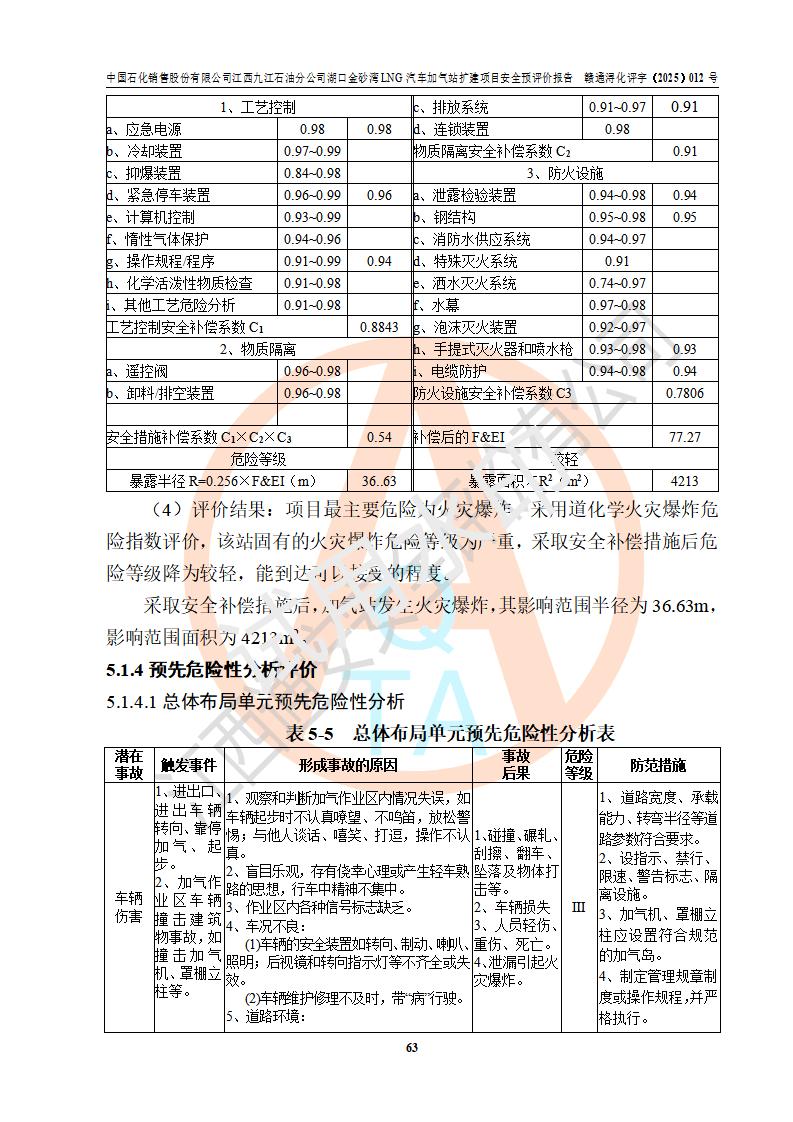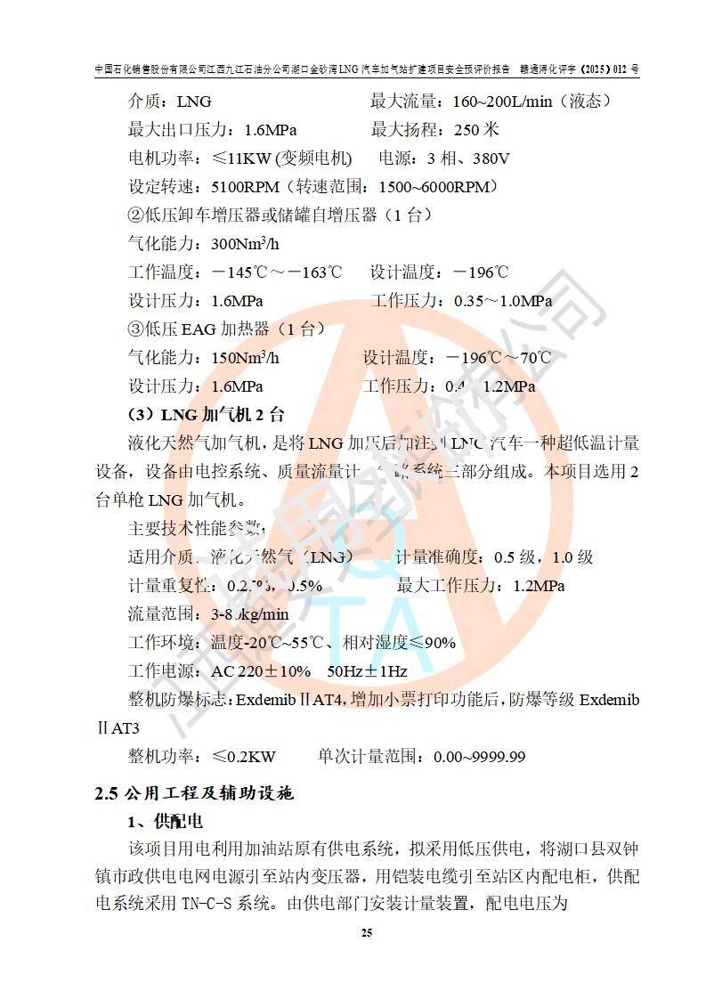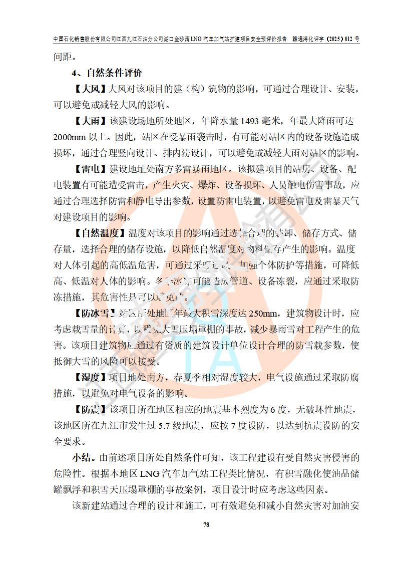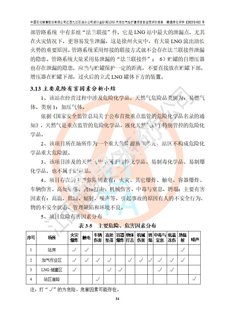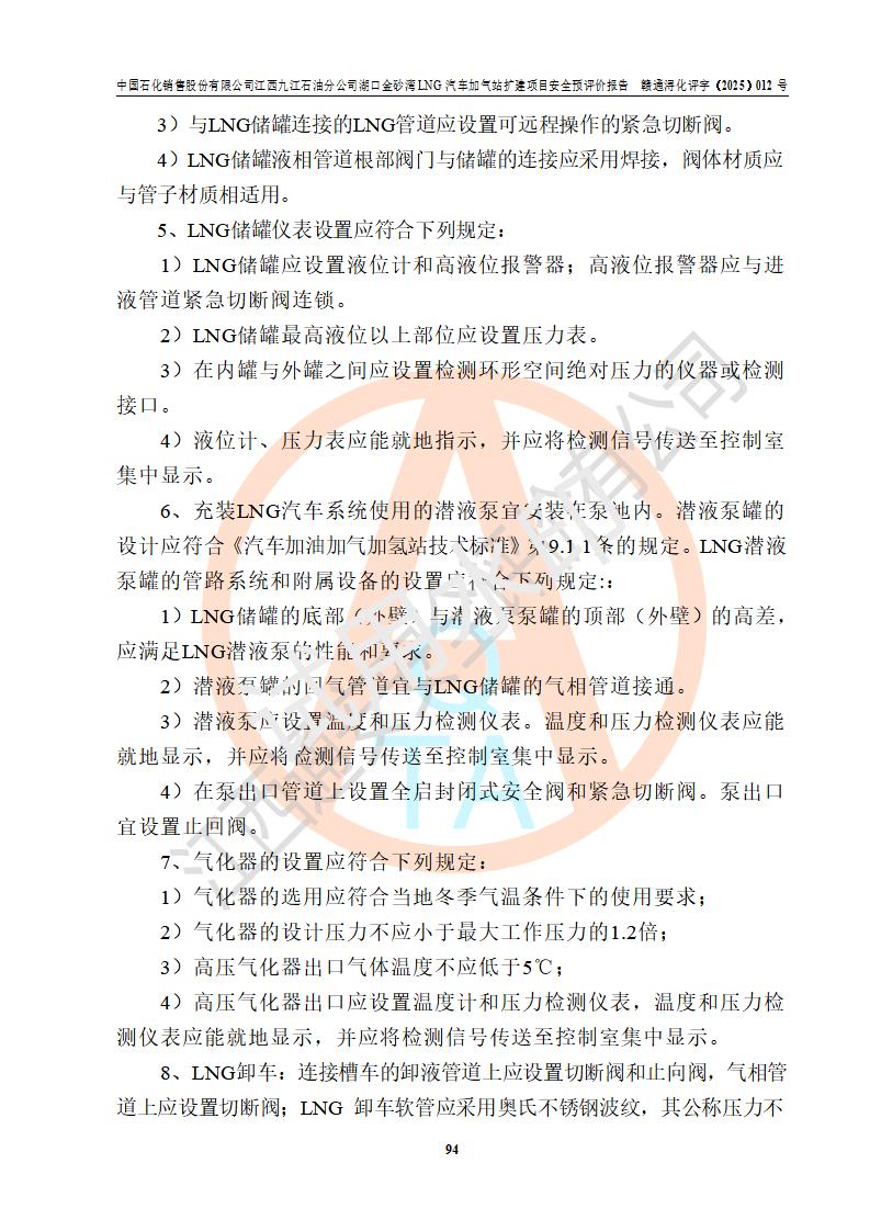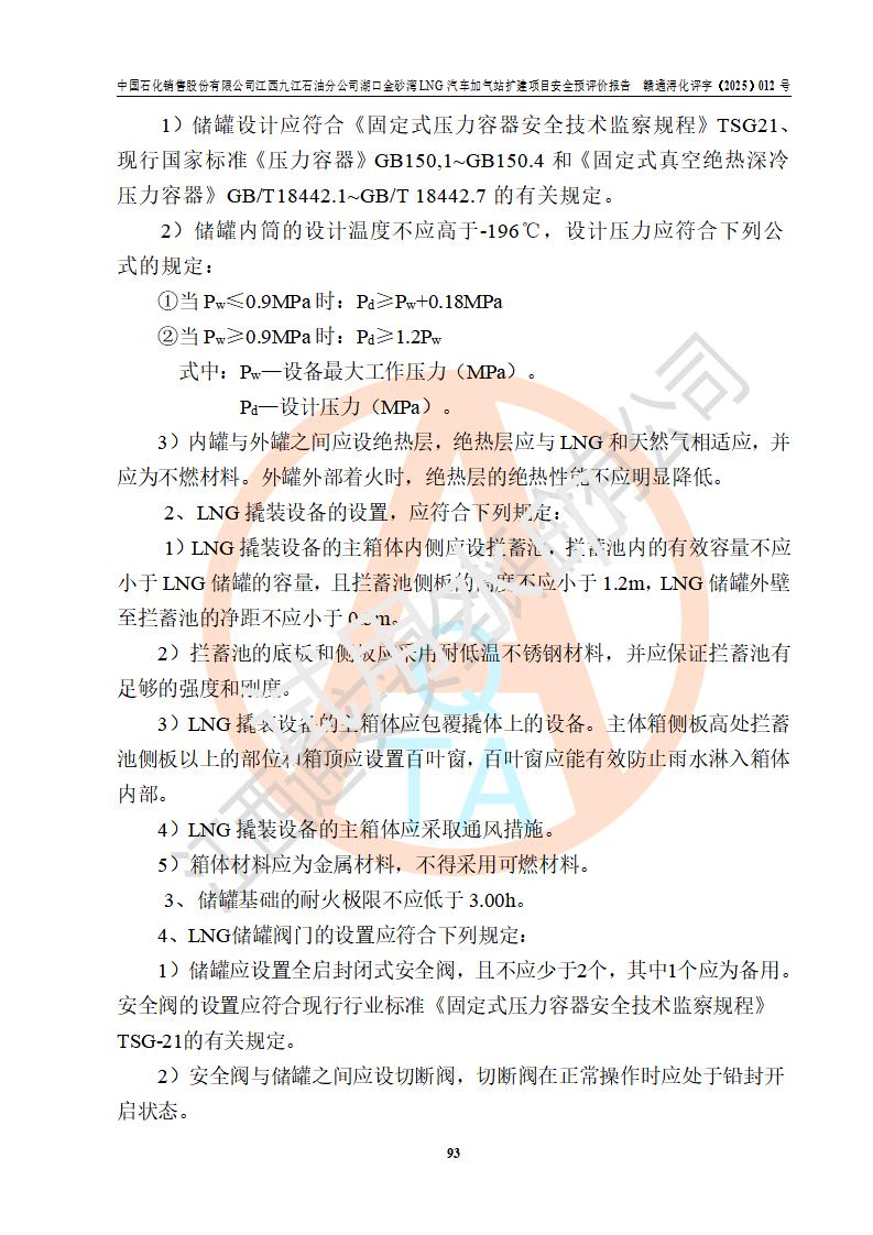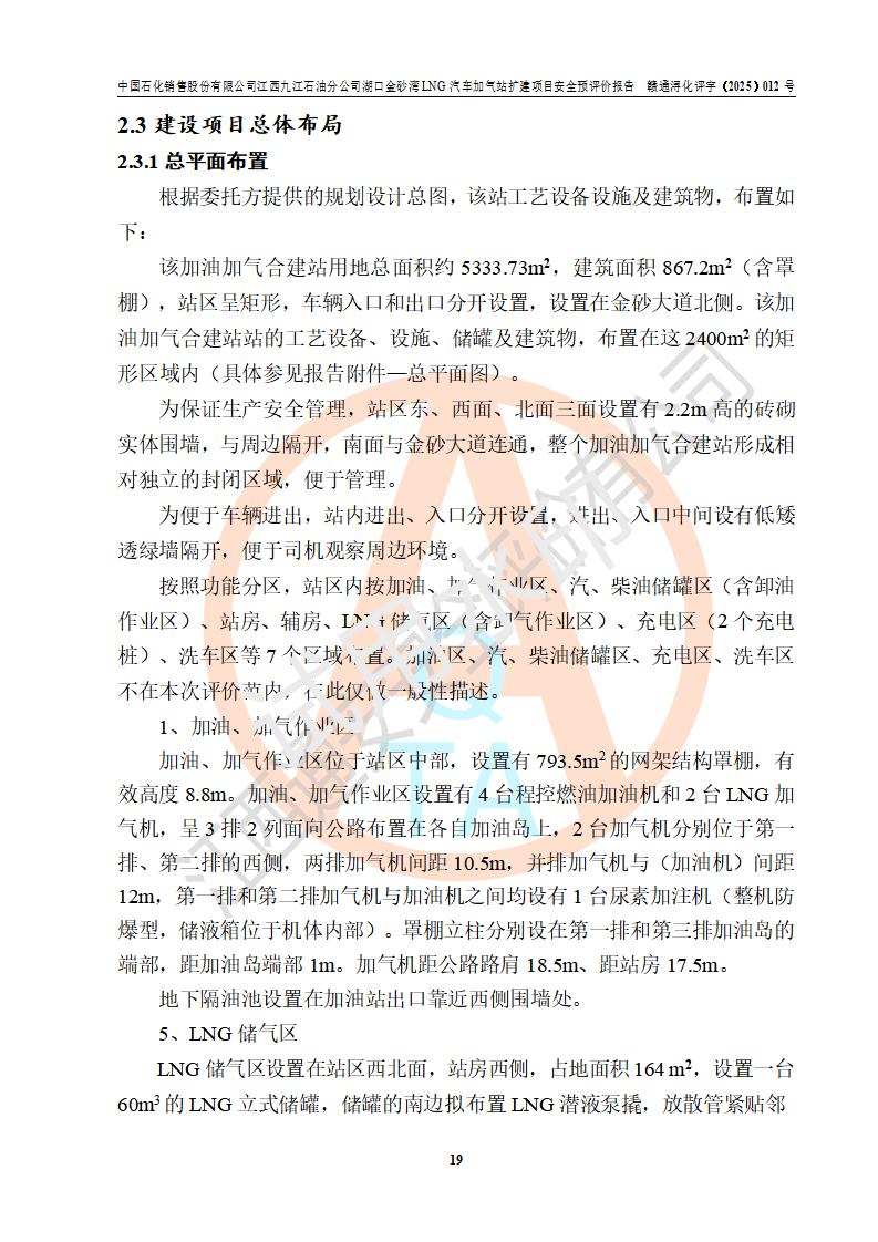 項目簡介 | 中國石化銷售股份有限公司江西九江石油分公司九江市湖口金砂灣LNG汽車加氣站成立于2024年11月12日,經(jīng)營場所為江西省九江市湖口縣金砂灣大道與發(fā)展大道交匯處(金砂灣派出所右側50米處),法定**人為杜建國,公司類型為臺、港、澳投資企業(yè)分公司。經(jīng)營范圍:許可項目:食品銷售,煙草制品零售,餐飲服務,燃氣經(jīng)營,出版物零售,道路貨物運輸(不含危險貨物),旅游業(yè)務,**經(jīng)紀業(yè)務,房地產(chǎn)開發(fā)經(jīng)營,住宿服務,藥品零售,發(fā)電業(yè)務、輸電業(yè)務、供(配)電業(yè)務(依法須經(jīng)批準的項目,經(jīng)相關部門批準后在許可**期內方可開展經(jīng)營活動,具體經(jīng)營項目和許可期限以相關部門批準文件或許可證件為準)一般項日:保健食品(預包裝)銷售,貨物進出口,化工產(chǎn)品銷售(不含許可類化工產(chǎn)品),日用百貨銷售,機械零件、零部件銷售,洗車服務,小微型客車租賃經(jīng)營服務,廣告發(fā)布,廣告設計、代理,家用電器銷售,居民日常生活服務,潤滑油銷售,辦公設備耗材銷售,新能源汽車整車銷售,摩托車及零配件零售,服裝服飾零售,五金產(chǎn)品零售,電子產(chǎn)品銷售,銷售代理,計算機軟硬件及鋪助設備零售,汽車裝飾用品銷售,二手車經(jīng)紀,二手車交易市場經(jīng)營,輪胎銷售,洗燙服務,打字復印,站用加氫及儲氫設施銷售,新鮮水果批發(fā),新鮮水果零售,農(nóng)副產(chǎn)品銷售,金屬材料銷售,建筑材料銷售,家具銷售,互聯(lián)網(wǎng)銷售(除銷售需要許可的商品),機動車充電銷售,普通貨物倉儲服務(不含危險化學品等需許可審批的項日),裝卸搬運,食品銷售(僅銷售預包裝食品),包裝服務,數(shù)據(jù)處理服務,***纖維及復合材料銷售,產(chǎn)業(yè)用紡織制成品銷售(除依法須經(jīng)批準的項目外,憑營業(yè)執(zhí)照依法自主開展經(jīng)營活動)。 為了滿足湖口縣重卡、牽引車、城際客運**等加注LNG燃氣車用氣需求,該公司根據(jù)湖口縣發(fā)展和改革委員會批復的《江西省企業(yè)投資項目備案通知書》(項目統(tǒng)一代碼為:2409-360429-04-01-657252)文件,在九江市湖口縣金砂灣大道與發(fā)展大道交匯處金砂灣加油站區(qū)內擬投資建設一座LNG汽車加氣站項目。 湖口金砂灣加油站的建設用地已取得湖口縣不動產(chǎn)登記局頒發(fā)的不動產(chǎn)權證書:贛(2023)湖口縣不動產(chǎn)權第0002564號。 擬擴建LNG汽車加氣站總用地面積為5333.73m2,總建筑面積為867.2m2,站區(qū)內加氣機擬設置為2機2槍。LNG貯氣區(qū)內設置1個60m3的LNG儲氣罐、LNG低溫泵撬1套(含雙泵、BOG空溫式加熱器),加氣能力為2×104Nm3/d。按現(xiàn)行《汽車加油加氣加氫站技術標準》對LNG加氣站的等級劃分,該LNG汽車加氣站屬三級站,與原有建成的三級加油站合建,屬二級加油與LNG加氣合建站。建成后本項目日加氣量可達2×104Nm3/日。 該二級加油與LNG加氣合建站內加氣設施已于2017年建設完成,但一直未投入使用?,F(xiàn)因公司市場發(fā)展需要,擬重新啟動投入使用。依據(jù)《中華人民共和國安全生產(chǎn)法》、《燃氣經(jīng)營許可管理辦法》、《城鎮(zhèn)燃氣管理條例》等法律和規(guī)定的要求,新建、改建、擴建危險化學品儲存裝置和設施的建設項目安全條件審查(審批、核準、備案)前,建設單位應當選擇有資質的安全評價機構對建設項目進行安全條件評價,以**工程項目的安全設施與主體工程同時設計、同時施工、同時投入使用,為**工程項目在安全生產(chǎn)及安全管理方面符合**及行業(yè)有關法律法規(guī)及標準,中國石化銷售股份有限公司江西江西九江石油分公司湖口金砂灣LNG汽車加氣站擴建項目委托江西通安安全評價有限公司承擔中國石化銷售股份有限公司江西九江石油分公司湖口金砂灣LNG汽車加氣站擴建項目的安全預評價。該企業(yè)應辦理燃氣經(jīng)營許可證。 江西通安安全評價有限公司接受委托后,成立了評價組,于2025年2月踏勘了建設地址。根據(jù)相關法律、法規(guī)和標準的規(guī)定,按照《安全評價通則》(AQ8001-2007)、《安全預評價導則》(AQ8002-2007)的要求,在資料收集、現(xiàn)場勘探和類比調查的基礎上,對項目的工程技術資料進行了認真分析。建設項目內在的危險、有害因素對建設項目周邊單位生產(chǎn)、經(jīng)營活動或者居民生活的影響以及建設項目周邊單位生產(chǎn)、經(jīng)營活動或者居民生活對建設項目的影響等,經(jīng)過定性分析與定量計算,編制完成了本建設項目安全預評價報告,為相關部門實行安全監(jiān)察、為**相關部門建設項目設立安全審查以及為企業(yè)建設項目實施“三同時”提供安全技術依據(jù)。 本次安全評價范圍:中國石化銷售股份有限公司江西九江石油分公司湖口金砂灣LNG汽車加氣站擴建項目的選址、總平面布置、主體裝置和輔助設施的安全條件,包括經(jīng)營過程中的危險和危害因素、建設項目的安全條件以及規(guī)劃設計中提出的工藝、設備設施的安全可靠性和勞動安全管理方面的組織、機構、人員、防護設施、作業(yè)環(huán)境及管理制度等。 本站中涉及加油作業(yè)、汽、柴油儲罐區(qū)、充電作業(yè)、洗車作業(yè)、站房頂光伏板區(qū)均不在此次評價范圍內,僅作一般性描述。涉及工程的環(huán)境、消防及職業(yè