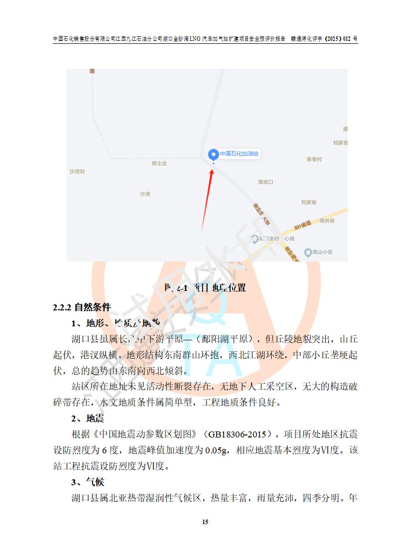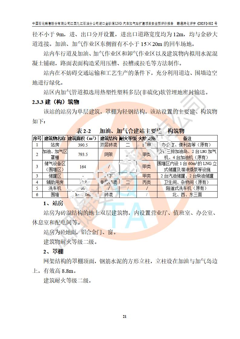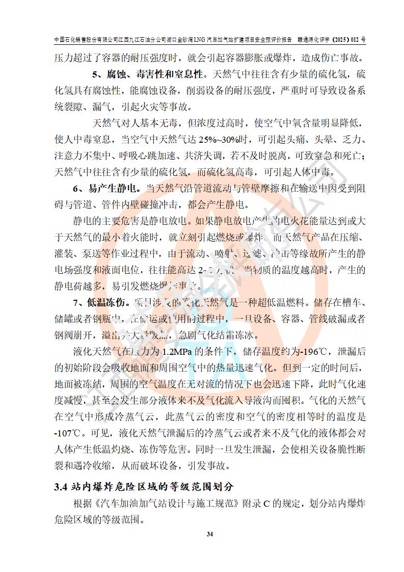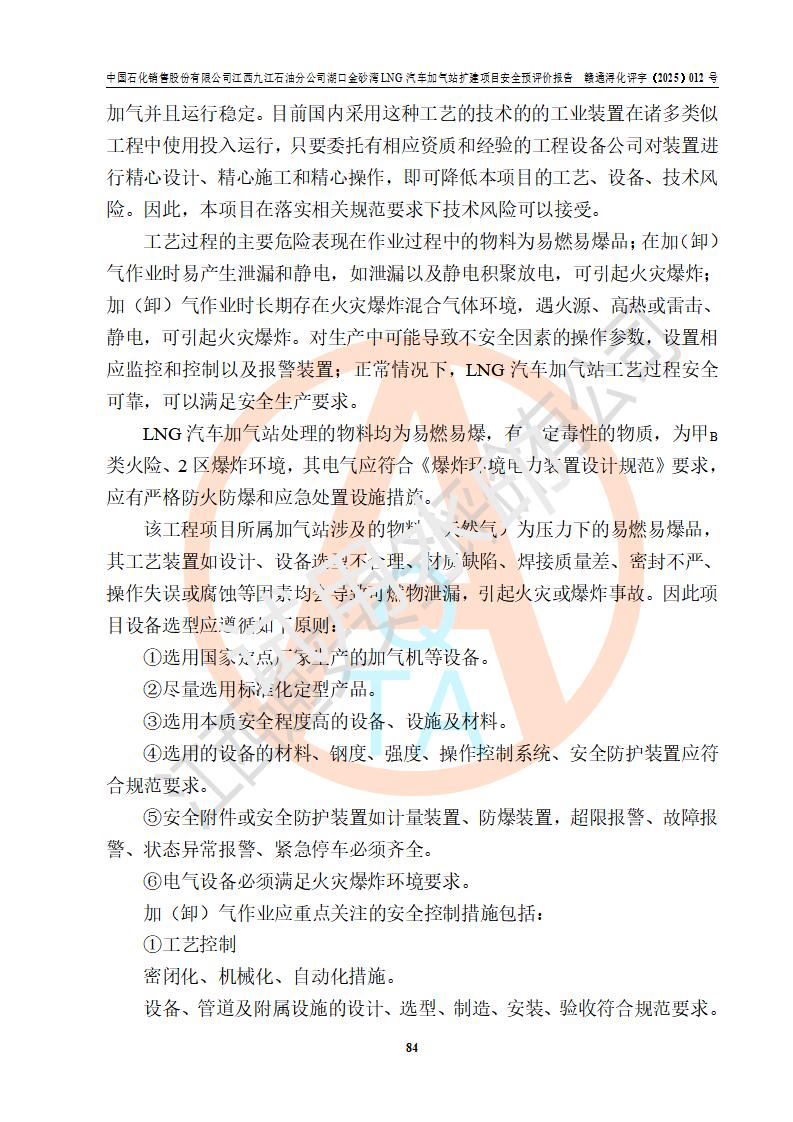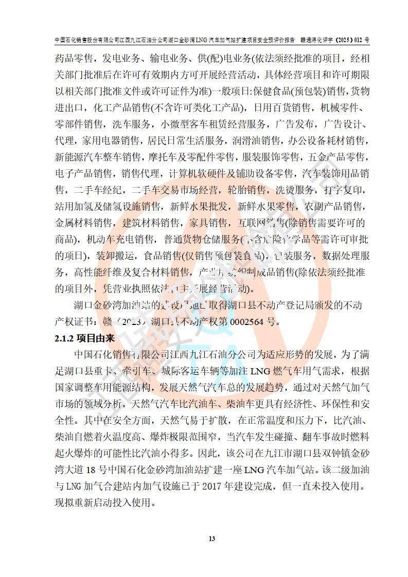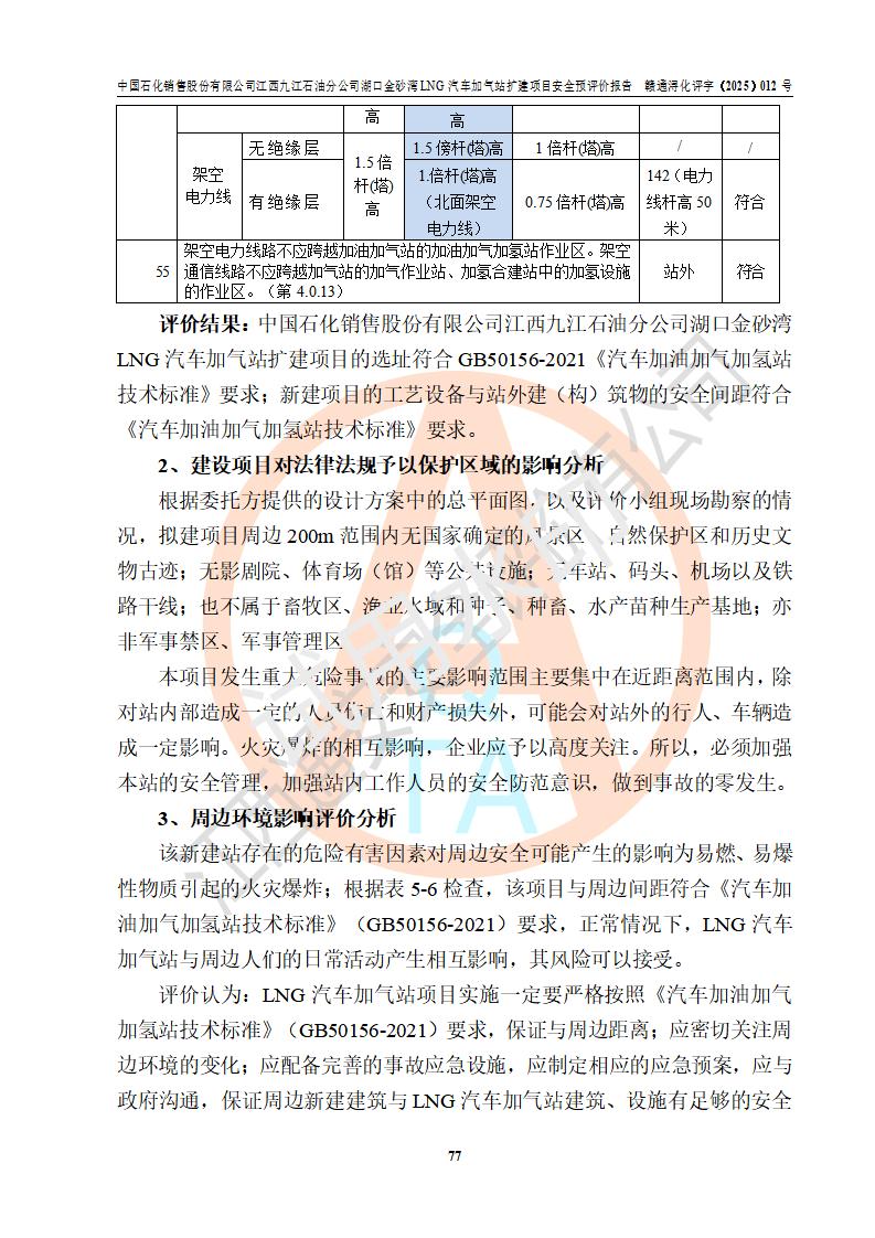 項目簡介 | 中國石化銷售股份有限公司江西九江石油分公司九江市湖口金砂灣LNG汽車加氣站成立于2024年11月12日,經(jīng)營場所為江西省九江市湖口縣金砂灣大道與發(fā)展大道交匯處(金砂灣派出所右側50米處),法定**人為杜建國,公司類型為臺、港、澳投資企業(yè)分公司。經(jīng)營范圍:許可項目:食品銷售,煙草制品零售,餐飲服務,燃氣經(jīng)營,出版物零售,道路貨物運輸(不含危險貨物),旅游業(yè)務,**經(jīng)紀業(yè)務,房地產(chǎn)開發(fā)經(jīng)營,住宿服務,藥品零售,發(fā)電業(yè)務、輸電業(yè)務、供(配)電業(yè)務(依法須經(jīng)批準的項目,經(jīng)相關部門批準后在許可**期內方可開展經(jīng)營活動,具體經(jīng)營項目和許可期限以相關部門批準文件或許可證件為準)一般項日:保健食品(預包裝)銷售,貨物進出口,化工產(chǎn)品銷售(不含許可類化工產(chǎn)品),日用百貨銷售,機械零件、零部件銷售,洗車服務,小微型客車租賃經(jīng)營服務,廣告發(fā)布,廣告設計、代理,家用電器銷售,居民日常生活服務,潤滑油銷售,辦公設備耗材銷售,新能源汽車整車銷售,摩托車及零配件零售,服裝服飾零售,五金產(chǎn)品零售,電子產(chǎn)品銷售,銷售代理,計算機軟硬件及鋪助設備零售,汽車裝飾用品銷售,二手車經(jīng)紀,二手車交易市場經(jīng)營,輪胎銷售,洗燙服務,打字復印,站用加氫及儲氫設施銷售,新鮮水果批發(fā),新鮮水果零售,農(nóng)副產(chǎn)品銷售,金屬材料銷售,建筑材料銷售,家具銷售,互聯(lián)網(wǎng)銷售(除銷售需要許可的商品),機動車充電銷售,普通貨物倉儲服務(不含危險化學品等需許可審批的項日),裝卸搬運,食品銷售(僅銷售預包裝食品),包裝服務,數(shù)據(jù)處理服務,***纖維及復合材料銷售,產(chǎn)業(yè)用紡織制成品銷售(除依法須經(jīng)批準的項目外,憑營業(yè)執(zhí)照依法自主開展經(jīng)營活動)。 為了滿足湖口縣重卡、牽引車、城際客運**等加注LNG燃氣車用氣需求,該公司根據(jù)湖口縣發(fā)展和改革委員會批復的《江西省企業(yè)投資項目備案通知書》(項目統(tǒng)一代碼為:2409-360429-04-01-657252)文件,在九江市湖口縣金砂灣大道與發(fā)展大道交匯處金砂灣加油站區(qū)內擬投資建設一座LNG汽車加氣站項目。 湖口金砂灣加油站的建設用地已取得湖口縣不動產(chǎn)登記局頒發(fā)的不動產(chǎn)權證書:贛(2023)湖口縣不動產(chǎn)權第0002564號。 擬擴建LNG汽車加氣站總用地面積為5333.73m2,總建筑面積為867.2m2,站區(qū)內加氣機擬設置為2機2槍。LNG貯氣區(qū)內設置1個60m3的LNG儲氣罐、LNG低溫泵撬1套(含雙泵、BOG空溫式加熱器),加氣能力為2×104Nm3/d。按現(xiàn)行《汽車加油加氣加氫站技術標準》對LNG加氣站的等級劃分,該LNG汽車加氣站屬三級站,與原有建成的三級加油站合建,屬二級加油與LNG加氣合建站。建成后本項目日加氣量可達2×104Nm3/日。 該二級加油與LNG加氣合建站內加氣設施已于2017年建設完成,但一直未投入使用?,F(xiàn)因公司市場發(fā)展需要,擬重新啟動投入使用。依據(jù)《中華人民共和國安全生產(chǎn)法》、《燃氣經(jīng)營許可管理辦法》、《城鎮(zhèn)燃氣管理條例》等法律和規(guī)定的要求,新建、改建、擴建危險化學品儲存裝置和設施的建設項目安全條件審查(審批、核準、備案)前,建設單位應當選擇有資質的安全評價機構對建設項目進行安全條件評價,以**工程項目的安全設施與主體工程同時設計、同時施工、同時投入使用,為**工程項目在安全生產(chǎn)及安全管理方面符合**及行業(yè)有關法律法規(guī)及標準,中國石化銷售股份有限公司江西江西九江石油分公司湖口金砂灣LNG汽車加氣站擴建項目委托江西通安安全評價有限公司承擔中國石化銷售股份有限公司江西九江石油分公司湖口金砂灣LNG汽車加氣站擴建項目的安全預評價。該企業(yè)應辦理燃氣經(jīng)營許可證。 江西通安安全評價有限公司接受委托后,成立了評價組,于2025年2月踏勘了建設地址。根據(jù)相關法律、法規(guī)和標準的規(guī)定,按照《安全評價通則》(AQ8001-2007)、《安全預評價導則》(AQ8002-2007)的要求,在資料收集、現(xiàn)場勘探和類比調查的基礎上,對項目的工程技術資料進行了認真分析。建設項目內在的危險、有害因素對建設項目周邊單位生產(chǎn)、經(jīng)營活動或者居民生活的影響以及建設項目周邊單位生產(chǎn)、經(jīng)營活動或者居民生活對建設項目的影響等,經(jīng)過定性分析與定量計算,編制完成了本建設項目安全預評價報告,為相關部門實行安全監(jiān)察、為**相關部門建設項目設立安全審查以及為企業(yè)建設項目實施“三同時”提供安全技術依據(jù)。 本次安全評價范圍:中國石化銷售股份有限公司江西九江石油分公司湖口金砂灣LNG汽車加氣站擴建項目的選址、總平面布置、主體裝置和輔助設施的安全條件,包括經(jīng)營過程中的危險和危害因素、建設項目的安全條件以及規(guī)劃設計中提出的工藝、設備設施的安全可靠性和勞動安全管理方面的組織、機構、人員、防護設施、作業(yè)環(huán)境及管理制度等。 本站中涉及加油作業(yè)、汽、柴油儲罐區(qū)、充電作業(yè)、洗車作業(yè)、站房頂光伏板區(qū)均不在此次評價范圍內,僅作一般性描述。涉及工程的環(huán)境、消防及職業(yè