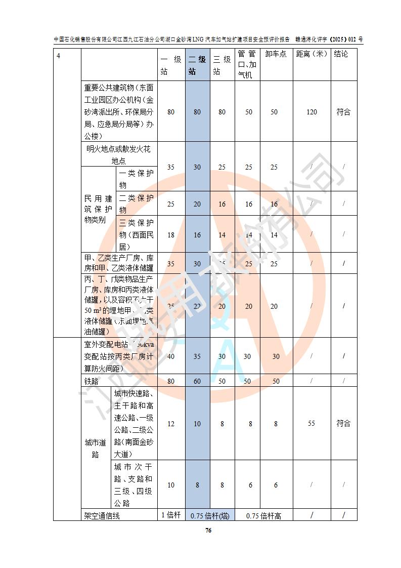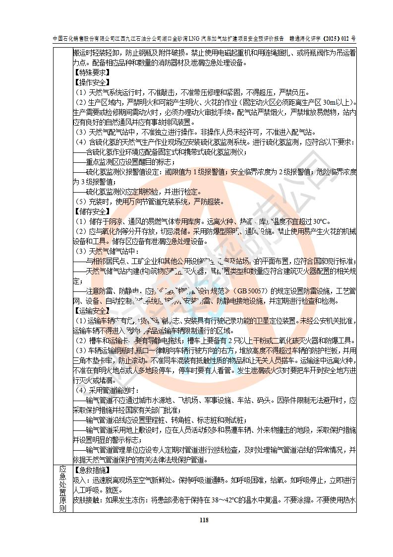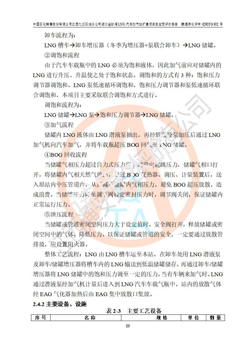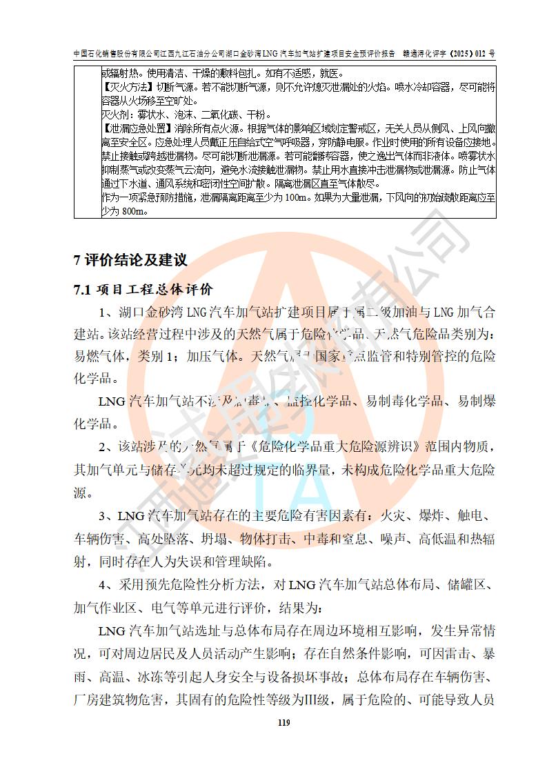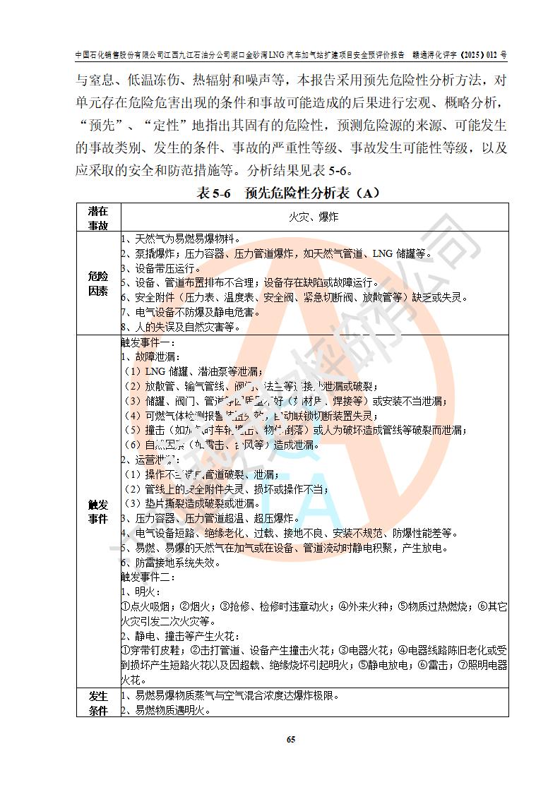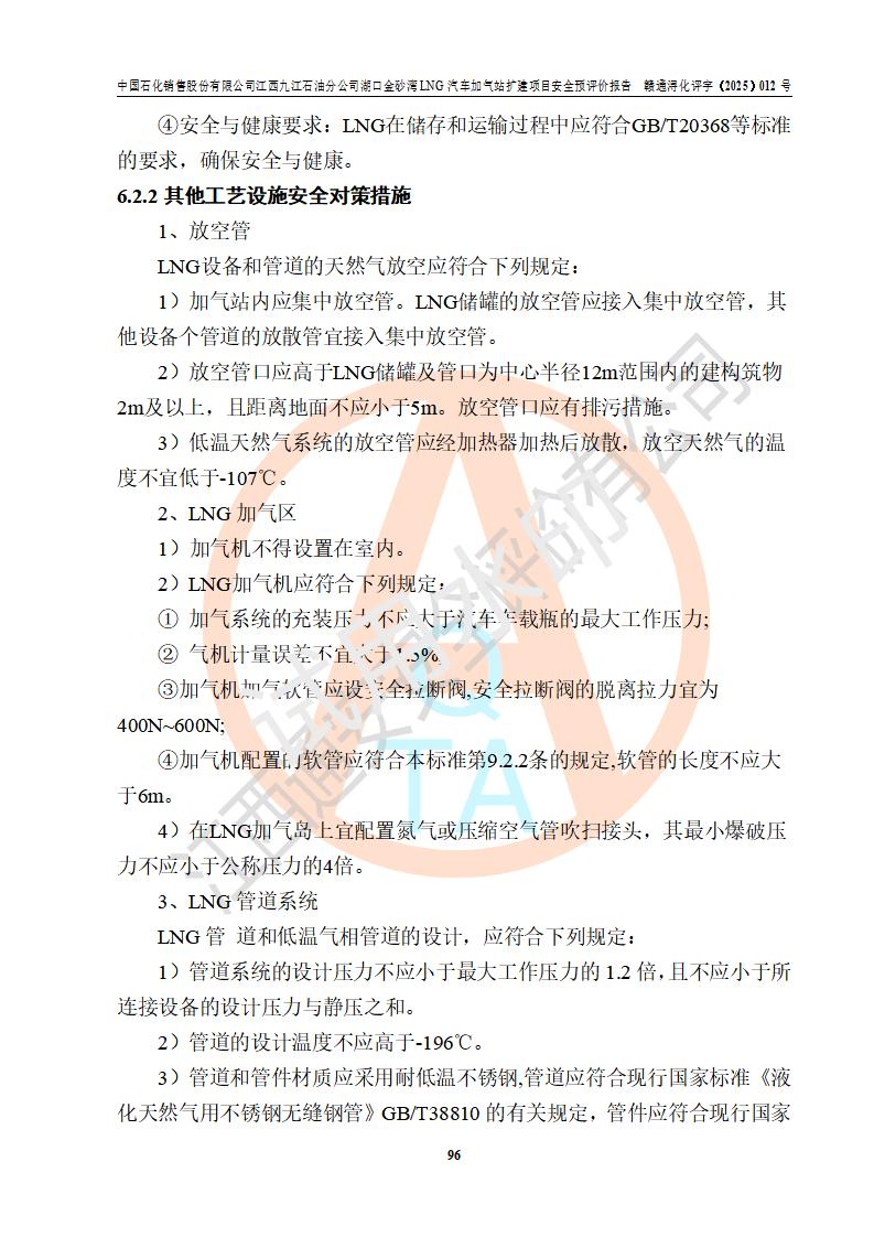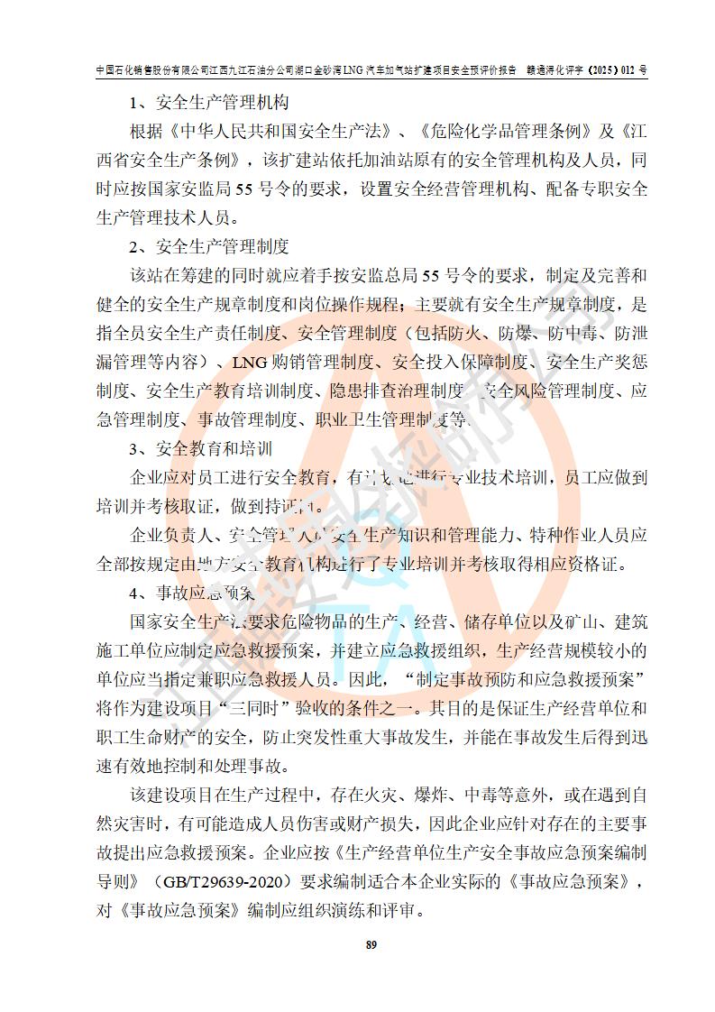 項目簡介 | 中國石化銷售股份有限公司江西九江石油分公司九江市湖口金砂灣LNG汽車加氣站成立于2024年11月12日,經(jīng)營場所為江西省九江市湖口縣金砂灣大道與發(fā)展大道交匯處(金砂灣派出所右側50米處),法定**人為杜建國,公司類型為臺、港、澳投資企業(yè)分公司。經(jīng)營范圍:許可項目:食品銷售,煙草制品零售,餐飲服務,燃氣經(jīng)營,出版物零售,道路貨物運輸(不含危險貨物),旅游業(yè)務,**經(jīng)紀業(yè)務,房地產(chǎn)開發(fā)經(jīng)營,住宿服務,藥品零售,發(fā)電業(yè)務、輸電業(yè)務、供(配)電業(yè)務(依法須經(jīng)批準的項目,經(jīng)相關部門批準后在許可**期內方可開展經(jīng)營活動,具體經(jīng)營項目和許可期限以相關部門批準文件或許可證件為準)一般項日:保健食品(預包裝)銷售,貨物進出口,化工產(chǎn)品銷售(不含許可類化工產(chǎn)品),日用百貨銷售,機械零件、零部件銷售,洗車服務,小微型客車租賃經(jīng)營服務,廣告發(fā)布,廣告設計、代理,家用電器銷售,居民日常生活服務,潤滑油銷售,辦公設備耗材銷售,新能源汽車整車銷售,摩托車及零配件零售,服裝服飾零售,五金產(chǎn)品零售,電子產(chǎn)品銷售,銷售代理,計算機軟硬件及鋪助設備零售,汽車裝飾用品銷售,二手車經(jīng)紀,二手車交易市場經(jīng)營,輪胎銷售,洗燙服務,打字復印,站用加氫及儲氫設施銷售,新鮮水果批發(fā),新鮮水果零售,農(nóng)副產(chǎn)品銷售,金屬材料銷售,建筑材料銷售,家具銷售,互聯(lián)網(wǎng)銷售(除銷售需要許可的商品),機動車充電銷售,普通貨物倉儲服務(不含危險化學品等需許可審批的項日),裝卸搬運,食品銷售(僅銷售預包裝食品),包裝服務,數(shù)據(jù)處理服務,***纖維及復合材料銷售,產(chǎn)業(yè)用紡織制成品銷售(除依法須經(jīng)批準的項目外,憑營業(yè)執(zhí)照依法自主開展經(jīng)營活動)。 為了滿足湖口縣重卡、牽引車、城際客運**等加注LNG燃氣車用氣需求,該公司根據(jù)湖口縣發(fā)展和改革委員會批復的《江西省企業(yè)投資項目備案通知書》(項目統(tǒng)一代碼為:2409-360429-04-01-657252)文件,在九江市湖口縣金砂灣大道與發(fā)展大道交匯處金砂灣加油站區(qū)內擬投資建設一座LNG汽車加氣站項目。 湖口金砂灣加油站的建設用地已取得湖口縣不動產(chǎn)登記局頒發(fā)的不動產(chǎn)權證書:贛(2023)湖口縣不動產(chǎn)權第0002564號。 擬擴建LNG汽車加氣站總用地面積為5333.73m2,總建筑面積為867.2m2,站區(qū)內加氣機擬設置為2機2槍。LNG貯氣區(qū)內設置1個60m3的LNG儲氣罐、LNG低溫泵撬1套(含雙泵、BOG空溫式加熱器),加氣能力為2×104Nm3/d。按現(xiàn)行《汽車加油加氣加氫站技術標準》對LNG加氣站的等級劃分,該LNG汽車加氣站屬三級站,與原有建成的三級加油站合建,屬二級加油與LNG加氣合建站。建成后本項目日加氣量可達2×104Nm3/日。 該二級加油與LNG加氣合建站內加氣設施已于2017年建設完成,但一直未投入使用?,F(xiàn)因公司市場發(fā)展需要,擬重新啟動投入使用。依據(jù)《中華人民共和國安全生產(chǎn)法》、《燃氣經(jīng)營許可管理辦法》、《城鎮(zhèn)燃氣管理條例》等法律和規(guī)定的要求,新建、改建、擴建危險化學品儲存裝置和設施的建設項目安全條件審查(審批、核準、備案)前,建設單位應當選擇有資質的安全評價機構對建設項目進行安全條件評價,以**工程項目的安全設施與主體工程同時設計、同時施工、同時投入使用,為**工程項目在安全生產(chǎn)及安全管理方面符合**及行業(yè)有關法律法規(guī)及標準,中國石化銷售股份有限公司江西江西九江石油分公司湖口金砂灣LNG汽車加氣站擴建項目委托江西通安安全評價有限公司承擔中國石化銷售股份有限公司江西九江石油分公司湖口金砂灣LNG汽車加氣站擴建項目的安全預評價。該企業(yè)應辦理燃氣經(jīng)營許可證。 江西通安安全評價有限公司接受委托后,成立了評價組,于2025年2月踏勘了建設地址。根據(jù)相關法律、法規(guī)和標準的規(guī)定,按照《安全評價通則》(AQ8001-2007)、《安全預評價導則》(AQ8002-2007)的要求,在資料收集、現(xiàn)場勘探和類比調查的基礎上,對項目的工程技術資料進行了認真分析。建設項目內在的危險、有害因素對建設項目周邊單位生產(chǎn)、經(jīng)營活動或者居民生活的影響以及建設項目周邊單位生產(chǎn)、經(jīng)營活動或者居民生活對建設項目的影響等,經(jīng)過定性分析與定量計算,編制完成了本建設項目安全預評價報告,為相關部門實行安全監(jiān)察、為**相關部門建設項目設立安全審查以及為企業(yè)建設項目實施“三同時”提供安全技術依據(jù)。 本次安全評價范圍:中國石化銷售股份有限公司江西九江石油分公司湖口金砂灣LNG汽車加氣站擴建項目的選址、總平面布置、主體裝置和輔助設施的安全條件,包括經(jīng)營過程中的危險和危害因素、建設項目的安全條件以及規(guī)劃設計中提出的工藝、設備設施的安全可靠性和勞動安全管理方面的組織、機構、人員、防護設施、作業(yè)環(huán)境及管理制度等。 本站中涉及加油作業(yè)、汽、柴油儲罐區(qū)、充電作業(yè)、洗車作業(yè)、站房頂光伏板區(qū)均不在此次評價范圍內,僅作一般性描述。涉及工程的環(huán)境、消防及職業(yè