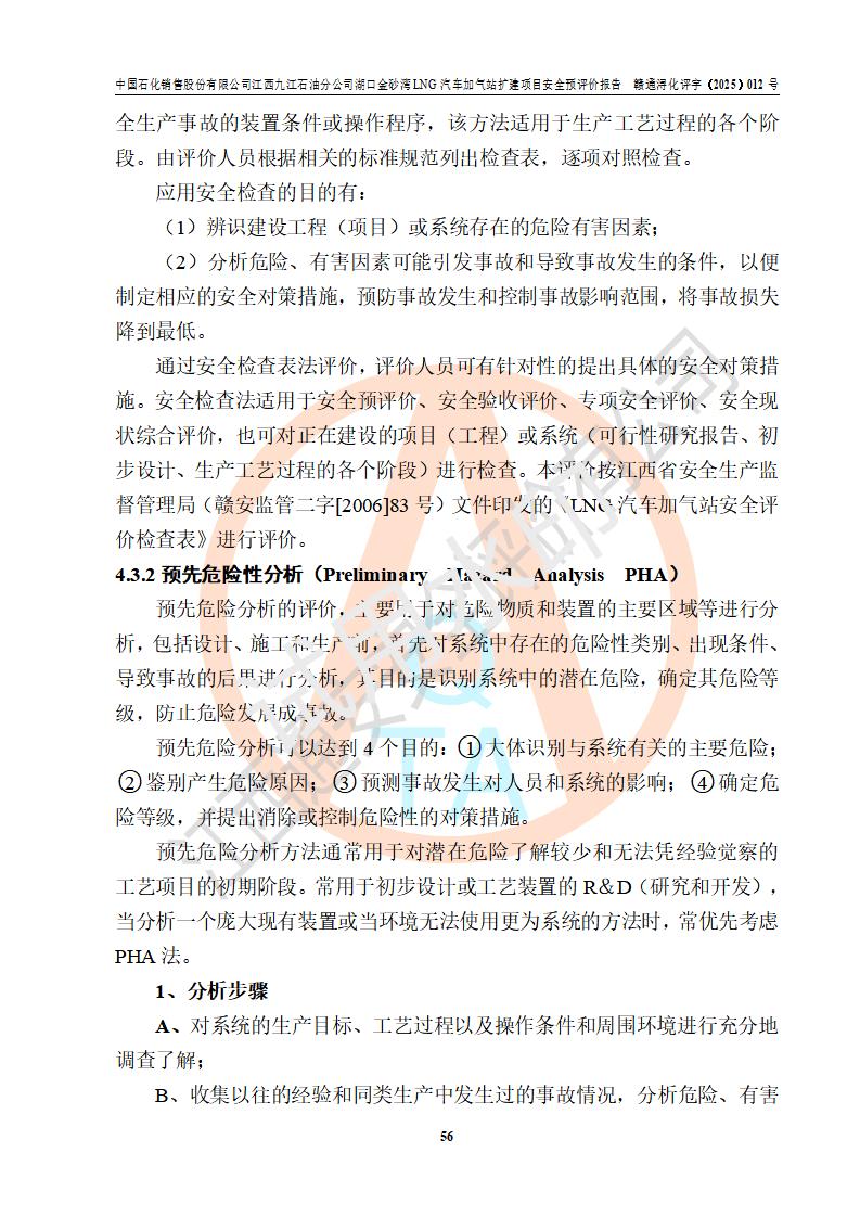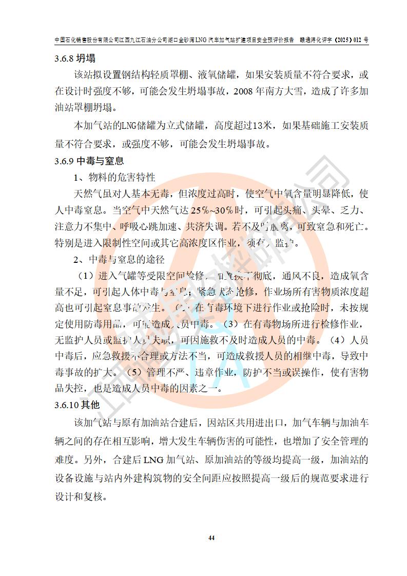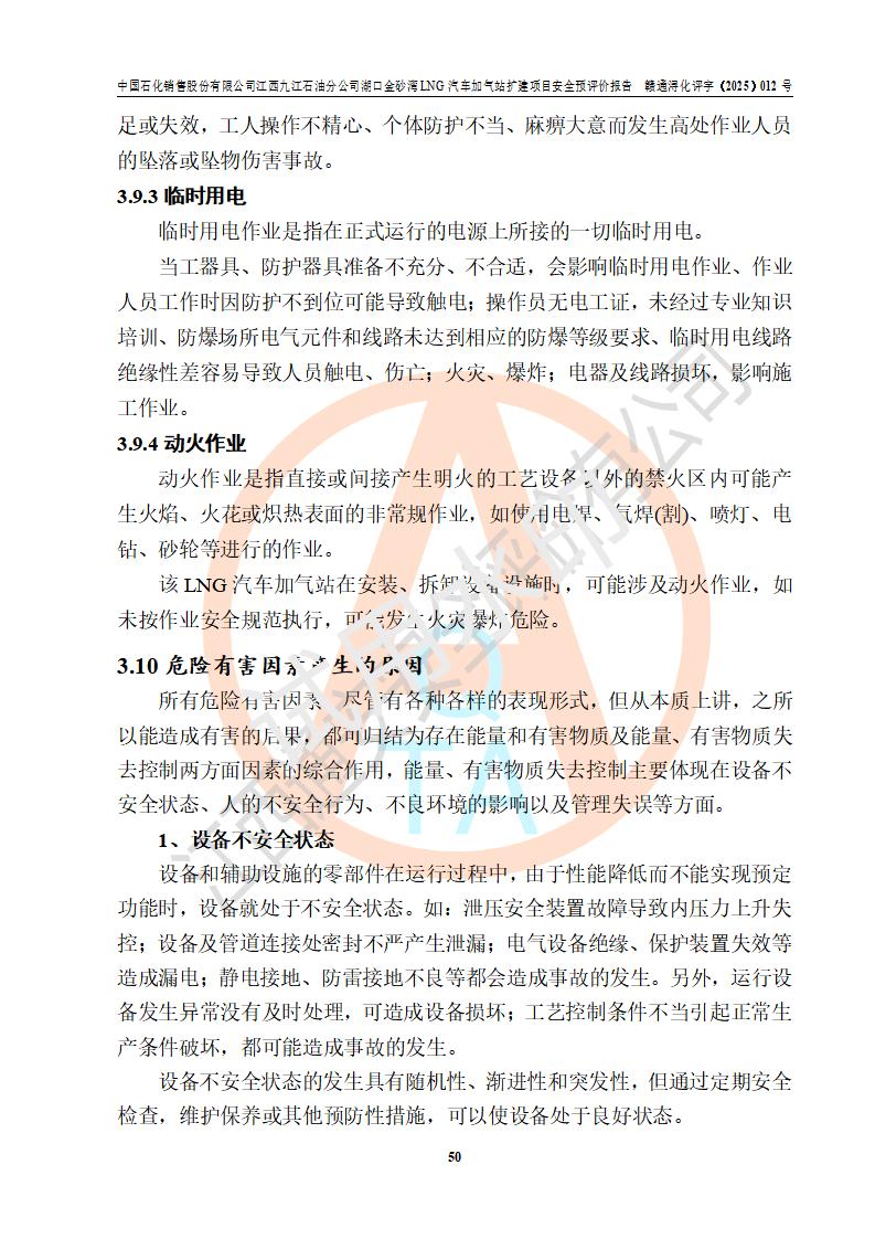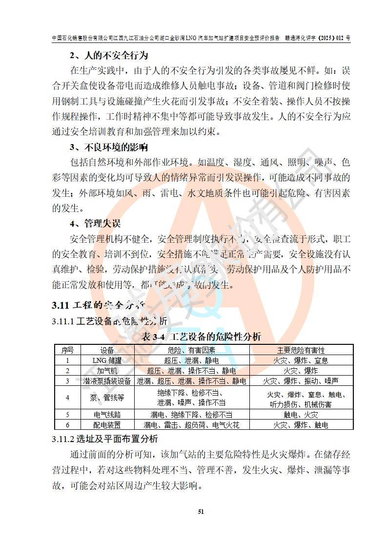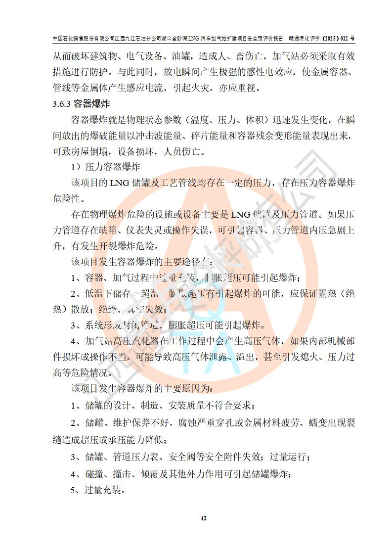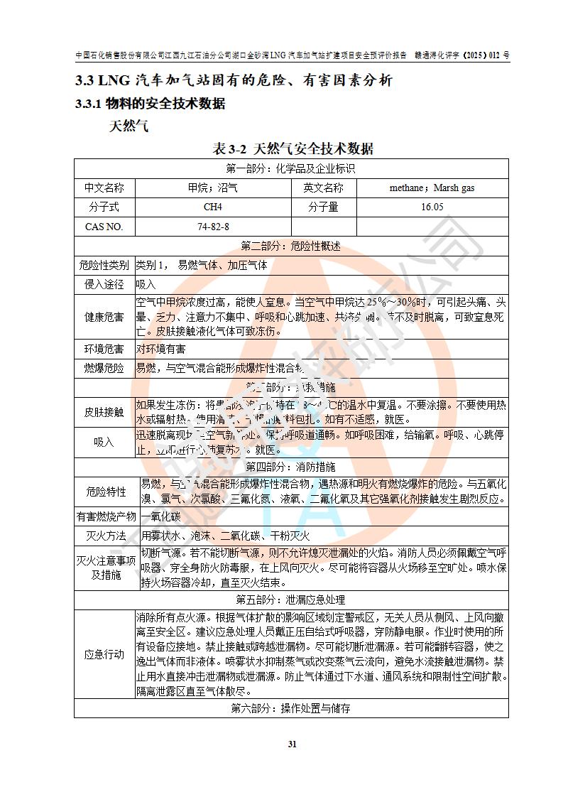 項目簡介 | 中國石化銷售股份有限公司江西九江石油分公司九江市湖口金砂灣LNG汽車加氣站成立于2024年11月12日,經(jīng)營場所為江西省九江市湖口縣金砂灣大道與發(fā)展大道交匯處(金砂灣派出所右側50米處),法定**人為杜建國,公司類型為臺、港、澳投資企業(yè)分公司。經(jīng)營范圍:許可項目:食品銷售,煙草制品零售,餐飲服務,燃氣經(jīng)營,出版物零售,道路貨物運輸(不含危險貨物),旅游業(yè)務,**經(jīng)紀業(yè)務,房地產(chǎn)開發(fā)經(jīng)營,住宿服務,藥品零售,發(fā)電業(yè)務、輸電業(yè)務、供(配)電業(yè)務(依法須經(jīng)批準的項目,經(jīng)相關部門批準后在許可**期內方可開展經(jīng)營活動,具體經(jīng)營項目和許可期限以相關部門批準文件或許可證件為準)一般項日:保健食品(預包裝)銷售,貨物進出口,化工產(chǎn)品銷售(不含許可類化工產(chǎn)品),日用百貨銷售,機械零件、零部件銷售,洗車服務,小微型客車租賃經(jīng)營服務,廣告發(fā)布,廣告設計、代理,家用電器銷售,居民日常生活服務,潤滑油銷售,辦公設備耗材銷售,新能源汽車整車銷售,摩托車及零配件零售,服裝服飾零售,五金產(chǎn)品零售,電子產(chǎn)品銷售,銷售代理,計算機軟硬件及鋪助設備零售,汽車裝飾用品銷售,二手車經(jīng)紀,二手車交易市場經(jīng)營,輪胎銷售,洗燙服務,打字復印,站用加氫及儲氫設施銷售,新鮮水果批發(fā),新鮮水果零售,農(nóng)副產(chǎn)品銷售,金屬材料銷售,建筑材料銷售,家具銷售,互聯(lián)網(wǎng)銷售(除銷售需要許可的商品),機動車充電銷售,普通貨物倉儲服務(不含危險化學品等需許可審批的項日),裝卸搬運,食品銷售(僅銷售預包裝食品),包裝服務,數(shù)據(jù)處理服務,***纖維及復合材料銷售,產(chǎn)業(yè)用紡織制成品銷售(除依法須經(jīng)批準的項目外,憑營業(yè)執(zhí)照依法自主開展經(jīng)營活動)。 為了滿足湖口縣重卡、牽引車、城際客運**等加注LNG燃氣車用氣需求,該公司根據(jù)湖口縣發(fā)展和改革委員會批復的《江西省企業(yè)投資項目備案通知書》(項目統(tǒng)一代碼為:2409-360429-04-01-657252)文件,在九江市湖口縣金砂灣大道與發(fā)展大道交匯處金砂灣加油站區(qū)內擬投資建設一座LNG汽車加氣站項目。 湖口金砂灣加油站的建設用地已取得湖口縣不動產(chǎn)登記局頒發(fā)的不動產(chǎn)權證書:贛(2023)湖口縣不動產(chǎn)權第0002564號。 擬擴建LNG汽車加氣站總用地面積為5333.73m2,總建筑面積為867.2m2,站區(qū)內加氣機擬設置為2機2槍。LNG貯氣區(qū)內設置1個60m3的LNG儲氣罐、LNG低溫泵撬1套(含雙泵、BOG空溫式加熱器),加氣能力為2×104Nm3/d。按現(xiàn)行《汽車加油加氣加氫站技術標準》對LNG加氣站的等級劃分,該LNG汽車加氣站屬三級站,與原有建成的三級加油站合建,屬二級加油與LNG加氣合建站。建成后本項目日加氣量可達2×104Nm3/日。 該二級加油與LNG加氣合建站內加氣設施已于2017年建設完成,但一直未投入使用?,F(xiàn)因公司市場發(fā)展需要,擬重新啟動投入使用。依據(jù)《中華人民共和國安全生產(chǎn)法》、《燃氣經(jīng)營許可管理辦法》、《城鎮(zhèn)燃氣管理條例》等法律和規(guī)定的要求,新建、改建、擴建危險化學品儲存裝置和設施的建設項目安全條件審查(審批、核準、備案)前,建設單位應當選擇有資質的安全評價機構對建設項目進行安全條件評價,以**工程項目的安全設施與主體工程同時設計、同時施工、同時投入使用,為**工程項目在安全生產(chǎn)及安全管理方面符合**及行業(yè)有關法律法規(guī)及標準,中國石化銷售股份有限公司江西江西九江石油分公司湖口金砂灣LNG汽車加氣站擴建項目委托江西通安安全評價有限公司承擔中國石化銷售股份有限公司江西九江石油分公司湖口金砂灣LNG汽車加氣站擴建項目的安全預評價。該企業(yè)應辦理燃氣經(jīng)營許可證。 江西通安安全評價有限公司接受委托后,成立了評價組,于2025年2月踏勘了建設地址。根據(jù)相關法律、法規(guī)和標準的規(guī)定,按照《安全評價通則》(AQ8001-2007)、《安全預評價導則》(AQ8002-2007)的要求,在資料收集、現(xiàn)場勘探和類比調查的基礎上,對項目的工程技術資料進行了認真分析。建設項目內在的危險、有害因素對建設項目周邊單位生產(chǎn)、經(jīng)營活動或者居民生活的影響以及建設項目周邊單位生產(chǎn)、經(jīng)營活動或者居民生活對建設項目的影響等,經(jīng)過定性分析與定量計算,編制完成了本建設項目安全預評價報告,為相關部門實行安全監(jiān)察、為**相關部門建設項目設立安全審查以及為企業(yè)建設項目實施“三同時”提供安全技術依據(jù)。 本次安全評價范圍:中國石化銷售股份有限公司江西九江石油分公司湖口金砂灣LNG汽車加氣站擴建項目的選址、總平面布置、主體裝置和輔助設施的安全條件,包括經(jīng)營過程中的危險和危害因素、建設項目的安全條件以及規(guī)劃設計中提出的工藝、設備設施的安全可靠性和勞動安全管理方面的組織、機構、人員、防護設施、作業(yè)環(huán)境及管理制度等。 本站中涉及加油作業(yè)、汽、柴油儲罐區(qū)、充電作業(yè)、洗車作業(yè)、站房頂光伏板區(qū)均不在此次評價范圍內,僅作一般性描述。涉及工程的環(huán)境、消防及職業(yè