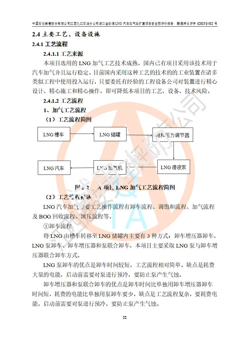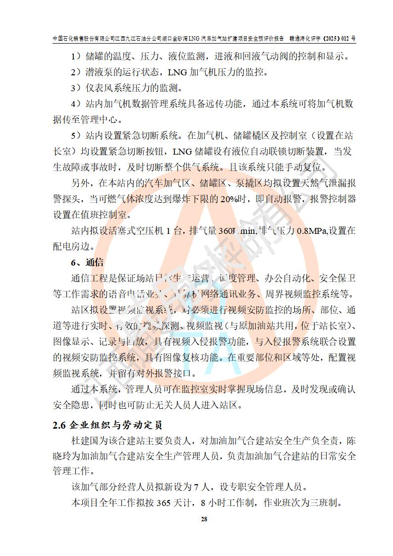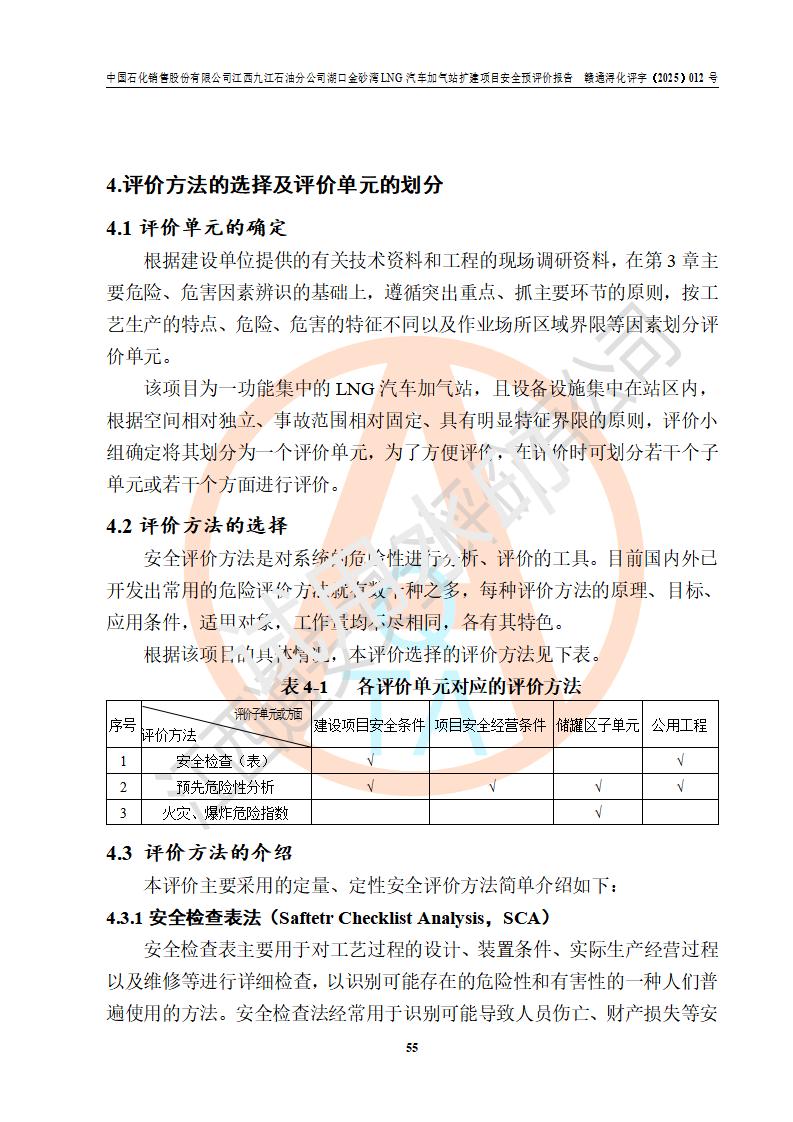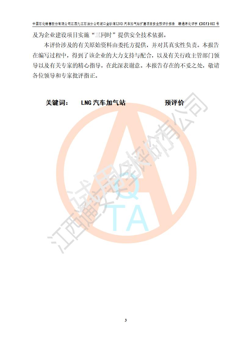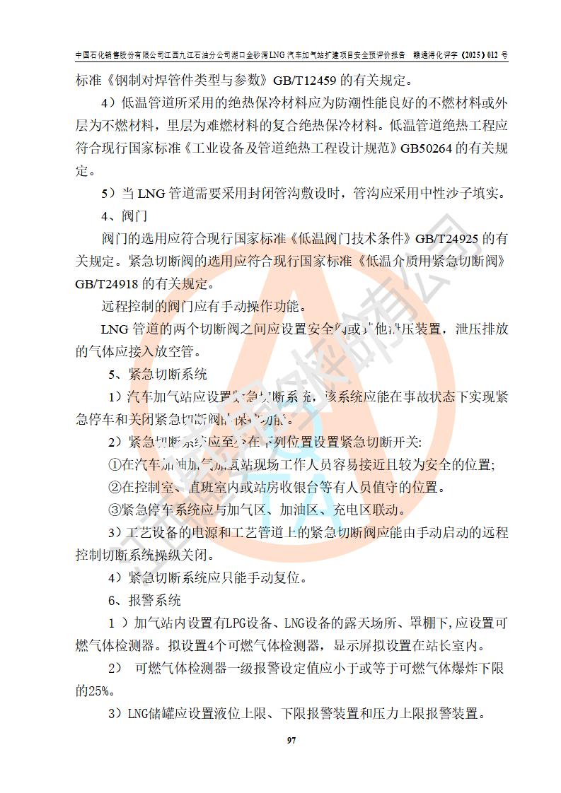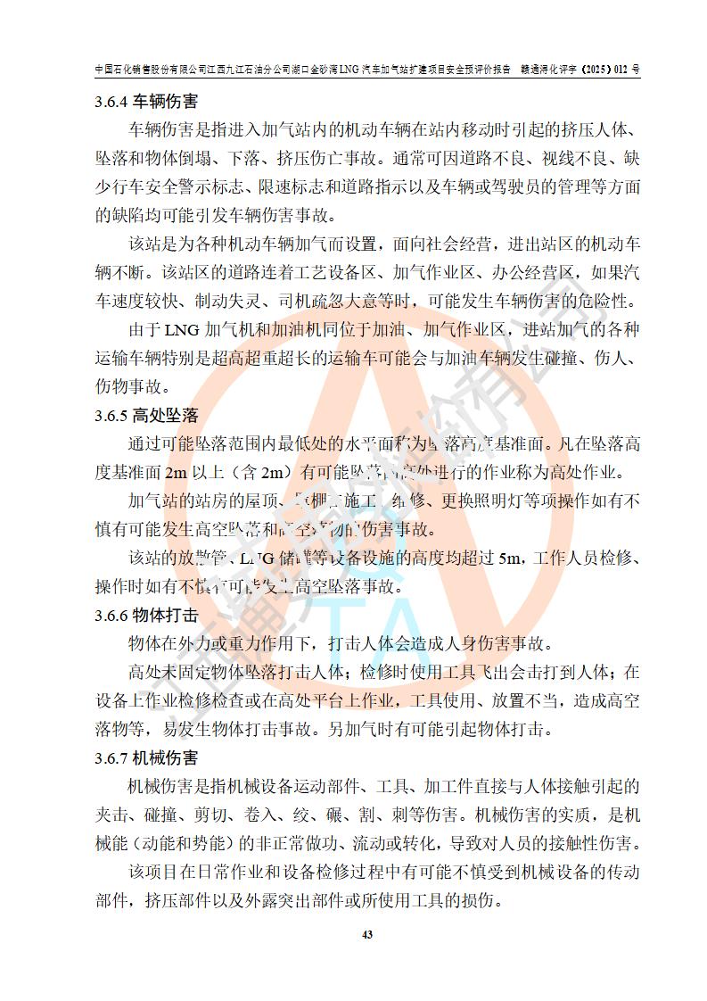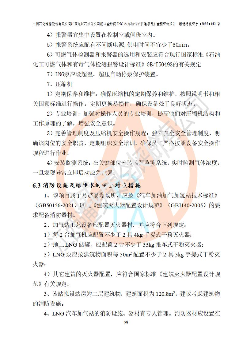 項目簡介 | 中國石化銷售股份有限公司江西九江石油分公司九江市湖口金砂灣LNG汽車加氣站成立于2024年11月12日,經(jīng)營場所為江西省九江市湖口縣金砂灣大道與發(fā)展大道交匯處(金砂灣派出所右側50米處),法定**人為杜建國,公司類型為臺、港、澳投資企業(yè)分公司。經(jīng)營范圍:許可項目:食品銷售,煙草制品零售,餐飲服務,燃氣經(jīng)營,出版物零售,道路貨物運輸(不含危險貨物),旅游業(yè)務,**經(jīng)紀業(yè)務,房地產(chǎn)開發(fā)經(jīng)營,住宿服務,藥品零售,發(fā)電業(yè)務、輸電業(yè)務、供(配)電業(yè)務(依法須經(jīng)批準的項目,經(jīng)相關部門批準后在許可**期內方可開展經(jīng)營活動,具體經(jīng)營項目和許可期限以相關部門批準文件或許可證件為準)一般項日:保健食品(預包裝)銷售,貨物進出口,化工產(chǎn)品銷售(不含許可類化工產(chǎn)品),日用百貨銷售,機械零件、零部件銷售,洗車服務,小微型客車租賃經(jīng)營服務,廣告發(fā)布,廣告設計、代理,家用電器銷售,居民日常生活服務,潤滑油銷售,辦公設備耗材銷售,新能源汽車整車銷售,摩托車及零配件零售,服裝服飾零售,五金產(chǎn)品零售,電子產(chǎn)品銷售,銷售代理,計算機軟硬件及鋪助設備零售,汽車裝飾用品銷售,二手車經(jīng)紀,二手車交易市場經(jīng)營,輪胎銷售,洗燙服務,打字復印,站用加氫及儲氫設施銷售,新鮮水果批發(fā),新鮮水果零售,農(nóng)副產(chǎn)品銷售,金屬材料銷售,建筑材料銷售,家具銷售,互聯(lián)網(wǎng)銷售(除銷售需要許可的商品),機動車充電銷售,普通貨物倉儲服務(不含危險化學品等需許可審批的項日),裝卸搬運,食品銷售(僅銷售預包裝食品),包裝服務,數(shù)據(jù)處理服務,***纖維及復合材料銷售,產(chǎn)業(yè)用紡織制成品銷售(除依法須經(jīng)批準的項目外,憑營業(yè)執(zhí)照依法自主開展經(jīng)營活動)。 為了滿足湖口縣重卡、牽引車、城際客運**等加注LNG燃氣車用氣需求,該公司根據(jù)湖口縣發(fā)展和改革委員會批復的《江西省企業(yè)投資項目備案通知書》(項目統(tǒng)一代碼為:2409-360429-04-01-657252)文件,在九江市湖口縣金砂灣大道與發(fā)展大道交匯處金砂灣加油站區(qū)內擬投資建設一座LNG汽車加氣站項目。 湖口金砂灣加油站的建設用地已取得湖口縣不動產(chǎn)登記局頒發(fā)的不動產(chǎn)權證書:贛(2023)湖口縣不動產(chǎn)權第0002564號。 擬擴建LNG汽車加氣站總用地面積為5333.73m2,總建筑面積為867.2m2,站區(qū)內加氣機擬設置為2機2槍。LNG貯氣區(qū)內設置1個60m3的LNG儲氣罐、LNG低溫泵撬1套(含雙泵、BOG空溫式加熱器),加氣能力為2×104Nm3/d。按現(xiàn)行《汽車加油加氣加氫站技術標準》對LNG加氣站的等級劃分,該LNG汽車加氣站屬三級站,與原有建成的三級加油站合建,屬二級加油與LNG加氣合建站。建成后本項目日加氣量可達2×104Nm3/日。 該二級加油與LNG加氣合建站內加氣設施已于2017年建設完成,但一直未投入使用?,F(xiàn)因公司市場發(fā)展需要,擬重新啟動投入使用。依據(jù)《中華人民共和國安全生產(chǎn)法》、《燃氣經(jīng)營許可管理辦法》、《城鎮(zhèn)燃氣管理條例》等法律和規(guī)定的要求,新建、改建、擴建危險化學品儲存裝置和設施的建設項目安全條件審查(審批、核準、備案)前,建設單位應當選擇有資質的安全評價機構對建設項目進行安全條件評價,以**工程項目的安全設施與主體工程同時設計、同時施工、同時投入使用,為**工程項目在安全生產(chǎn)及安全管理方面符合**及行業(yè)有關法律法規(guī)及標準,中國石化銷售股份有限公司江西江西九江石油分公司湖口金砂灣LNG汽車加氣站擴建項目委托江西通安安全評價有限公司承擔中國石化銷售股份有限公司江西九江石油分公司湖口金砂灣LNG汽車加氣站擴建項目的安全預評價。該企業(yè)應辦理燃氣經(jīng)營許可證。 江西通安安全評價有限公司接受委托后,成立了評價組,于2025年2月踏勘了建設地址。根據(jù)相關法律、法規(guī)和標準的規(guī)定,按照《安全評價通則》(AQ8001-2007)、《安全預評價導則》(AQ8002-2007)的要求,在資料收集、現(xiàn)場勘探和類比調查的基礎上,對項目的工程技術資料進行了認真分析。建設項目內在的危險、有害因素對建設項目周邊單位生產(chǎn)、經(jīng)營活動或者居民生活的影響以及建設項目周邊單位生產(chǎn)、經(jīng)營活動或者居民生活對建設項目的影響等,經(jīng)過定性分析與定量計算,編制完成了本建設項目安全預評價報告,為相關部門實行安全監(jiān)察、為**相關部門建設項目設立安全審查以及為企業(yè)建設項目實施“三同時”提供安全技術依據(jù)。 本次安全評價范圍:中國石化銷售股份有限公司江西九江石油分公司湖口金砂灣LNG汽車加氣站擴建項目的選址、總平面布置、主體裝置和輔助設施的安全條件,包括經(jīng)營過程中的危險和危害因素、建設項目的安全條件以及規(guī)劃設計中提出的工藝、設備設施的安全可靠性和勞動安全管理方面的組織、機構、人員、防護設施、作業(yè)環(huán)境及管理制度等。 本站中涉及加油作業(yè)、汽、柴油儲罐區(qū)、充電作業(yè)、洗車作業(yè)、站房頂光伏板區(qū)均不在此次評價范圍內,僅作一般性描述。涉及工程的環(huán)境、消防及職業(yè