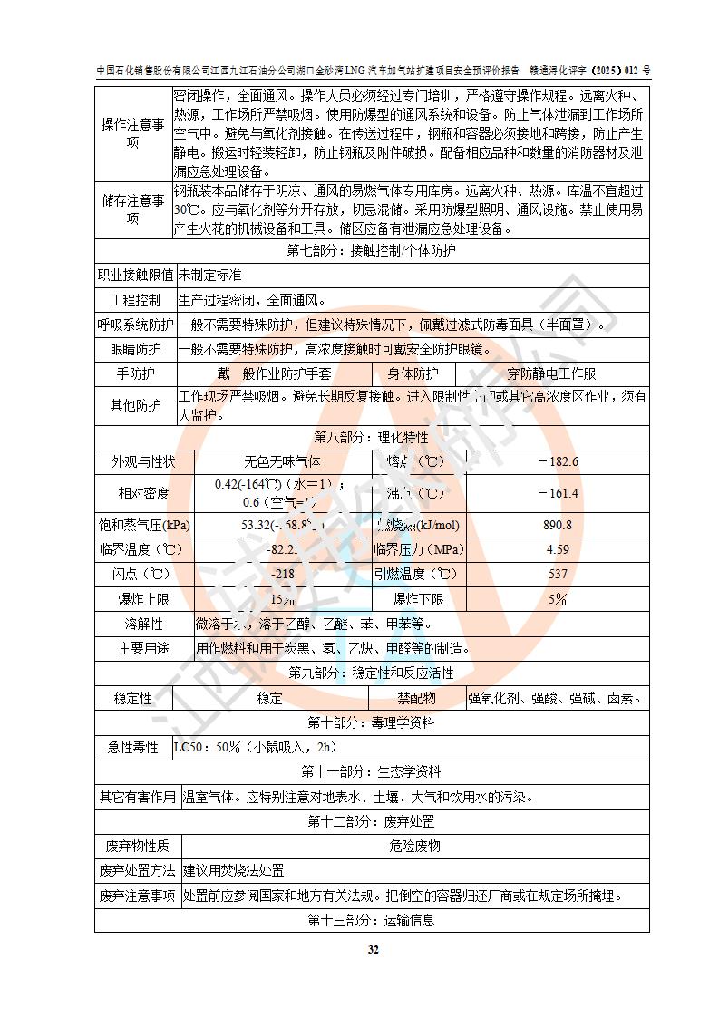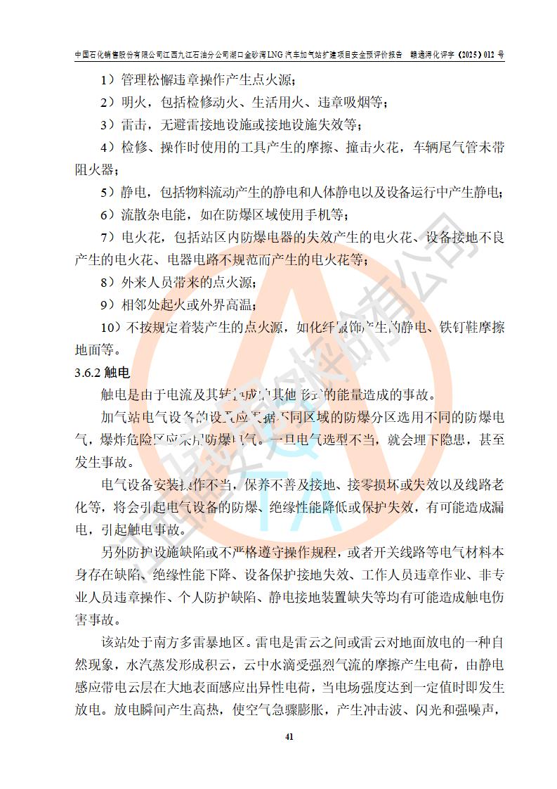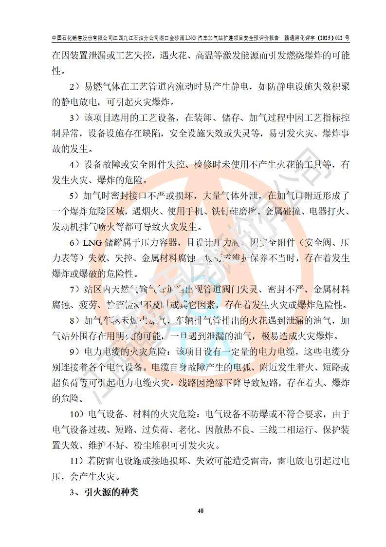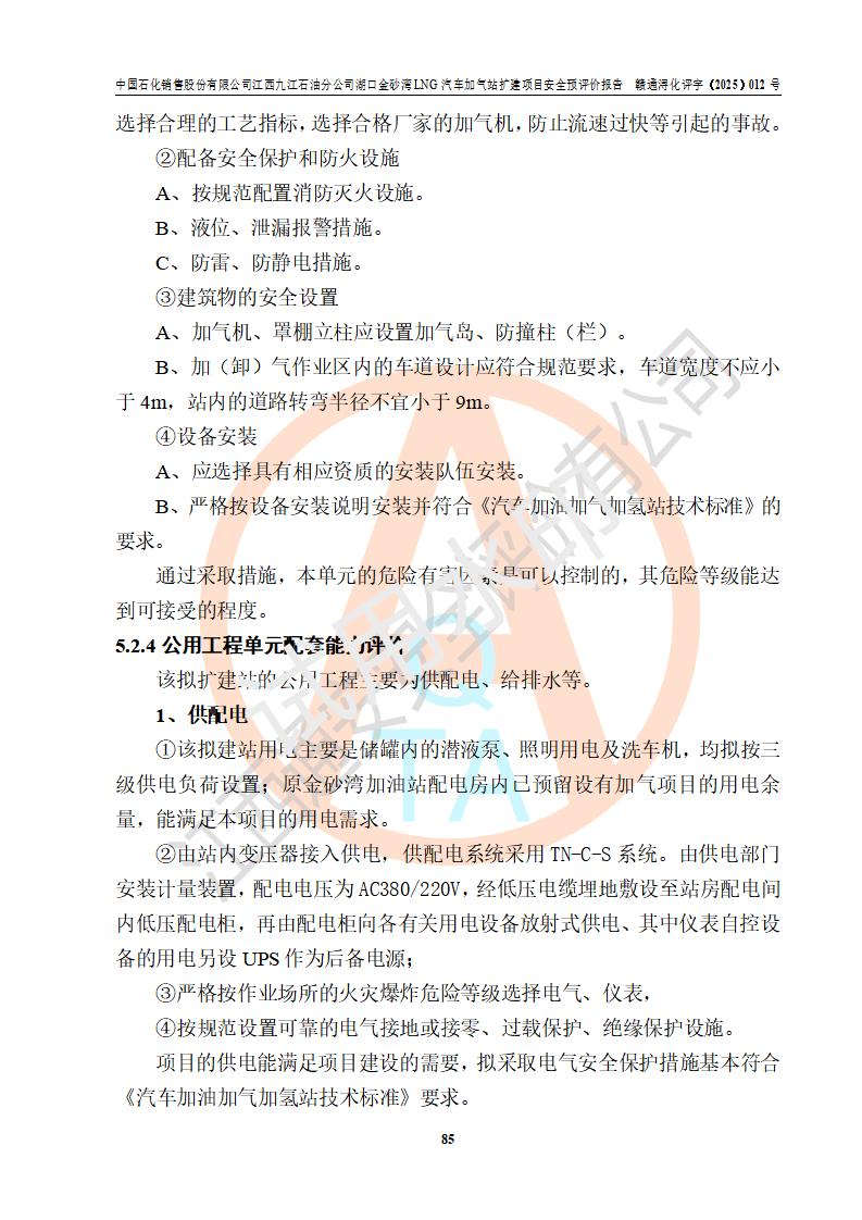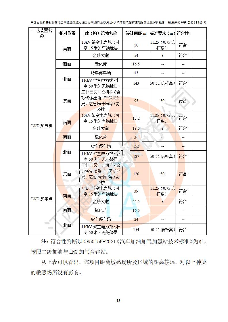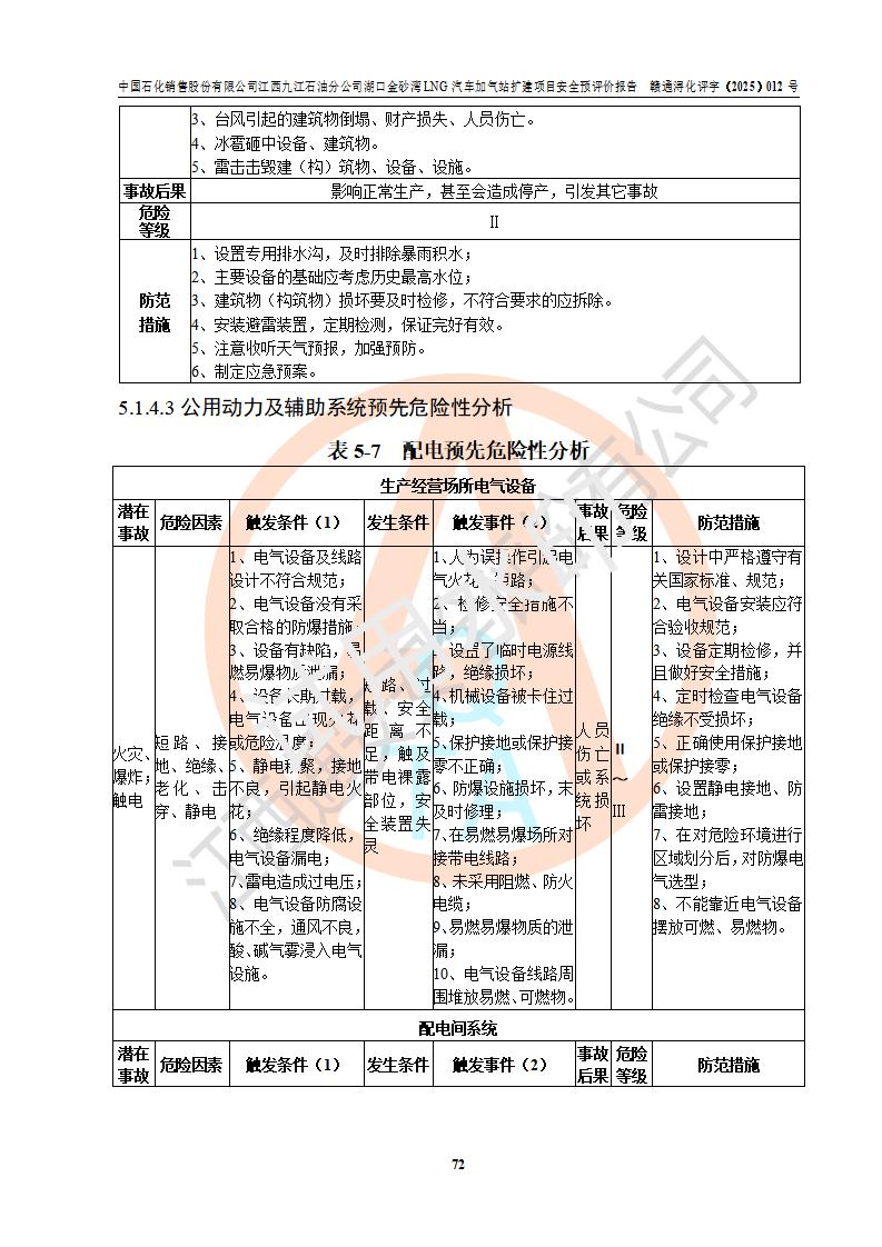 項目簡介 | 中國石化銷售股份有限公司江西九江石油分公司九江市湖口金砂灣LNG汽車加氣站成立于2024年11月12日,經(jīng)營場所為江西省九江市湖口縣金砂灣大道與發(fā)展大道交匯處(金砂灣派出所右側50米處),法定**人為杜建國,公司類型為臺、港、澳投資企業(yè)分公司。經(jīng)營范圍:許可項目:食品銷售,煙草制品零售,餐飲服務,燃氣經(jīng)營,出版物零售,道路貨物運輸(不含危險貨物),旅游業(yè)務,**經(jīng)紀業(yè)務,房地產(chǎn)開發(fā)經(jīng)營,住宿服務,藥品零售,發(fā)電業(yè)務、輸電業(yè)務、供(配)電業(yè)務(依法須經(jīng)批準的項目,經(jīng)相關部門批準后在許可**期內方可開展經(jīng)營活動,具體經(jīng)營項目和許可期限以相關部門批準文件或許可證件為準)一般項日:保健食品(預包裝)銷售,貨物進出口,化工產(chǎn)品銷售(不含許可類化工產(chǎn)品),日用百貨銷售,機械零件、零部件銷售,洗車服務,小微型客車租賃經(jīng)營服務,廣告發(fā)布,廣告設計、代理,家用電器銷售,居民日常生活服務,潤滑油銷售,辦公設備耗材銷售,新能源汽車整車銷售,摩托車及零配件零售,服裝服飾零售,五金產(chǎn)品零售,電子產(chǎn)品銷售,銷售代理,計算機軟硬件及鋪助設備零售,汽車裝飾用品銷售,二手車經(jīng)紀,二手車交易市場經(jīng)營,輪胎銷售,洗燙服務,打字復印,站用加氫及儲氫設施銷售,新鮮水果批發(fā),新鮮水果零售,農(nóng)副產(chǎn)品銷售,金屬材料銷售,建筑材料銷售,家具銷售,互聯(lián)網(wǎng)銷售(除銷售需要許可的商品),機動車充電銷售,普通貨物倉儲服務(不含危險化學品等需許可審批的項日),裝卸搬運,食品銷售(僅銷售預包裝食品),包裝服務,數(shù)據(jù)處理服務,***纖維及復合材料銷售,產(chǎn)業(yè)用紡織制成品銷售(除依法須經(jīng)批準的項目外,憑營業(yè)執(zhí)照依法自主開展經(jīng)營活動)。 為了滿足湖口縣重卡、牽引車、城際客運**等加注LNG燃氣車用氣需求,該公司根據(jù)湖口縣發(fā)展和改革委員會批復的《江西省企業(yè)投資項目備案通知書》(項目統(tǒng)一代碼為:2409-360429-04-01-657252)文件,在九江市湖口縣金砂灣大道與發(fā)展大道交匯處金砂灣加油站區(qū)內擬投資建設一座LNG汽車加氣站項目。 湖口金砂灣加油站的建設用地已取得湖口縣不動產(chǎn)登記局頒發(fā)的不動產(chǎn)權證書:贛(2023)湖口縣不動產(chǎn)權第0002564號。 擬擴建LNG汽車加氣站總用地面積為5333.73m2,總建筑面積為867.2m2,站區(qū)內加氣機擬設置為2機2槍。LNG貯氣區(qū)內設置1個60m3的LNG儲氣罐、LNG低溫泵撬1套(含雙泵、BOG空溫式加熱器),加氣能力為2×104Nm3/d。按現(xiàn)行《汽車加油加氣加氫站技術標準》對LNG加氣站的等級劃分,該LNG汽車加氣站屬三級站,與原有建成的三級加油站合建,屬二級加油與LNG加氣合建站。建成后本項目日加氣量可達2×104Nm3/日。 該二級加油與LNG加氣合建站內加氣設施已于2017年建設完成,但一直未投入使用?,F(xiàn)因公司市場發(fā)展需要,擬重新啟動投入使用。依據(jù)《中華人民共和國安全生產(chǎn)法》、《燃氣經(jīng)營許可管理辦法》、《城鎮(zhèn)燃氣管理條例》等法律和規(guī)定的要求,新建、改建、擴建危險化學品儲存裝置和設施的建設項目安全條件審查(審批、核準、備案)前,建設單位應當選擇有資質的安全評價機構對建設項目進行安全條件評價,以**工程項目的安全設施與主體工程同時設計、同時施工、同時投入使用,為**工程項目在安全生產(chǎn)及安全管理方面符合**及行業(yè)有關法律法規(guī)及標準,中國石化銷售股份有限公司江西江西九江石油分公司湖口金砂灣LNG汽車加氣站擴建項目委托江西通安安全評價有限公司承擔中國石化銷售股份有限公司江西九江石油分公司湖口金砂灣LNG汽車加氣站擴建項目的安全預評價。該企業(yè)應辦理燃氣經(jīng)營許可證。 江西通安安全評價有限公司接受委托后,成立了評價組,于2025年2月踏勘了建設地址。根據(jù)相關法律、法規(guī)和標準的規(guī)定,按照《安全評價通則》(AQ8001-2007)、《安全預評價導則》(AQ8002-2007)的要求,在資料收集、現(xiàn)場勘探和類比調查的基礎上,對項目的工程技術資料進行了認真分析。建設項目內在的危險、有害因素對建設項目周邊單位生產(chǎn)、經(jīng)營活動或者居民生活的影響以及建設項目周邊單位生產(chǎn)、經(jīng)營活動或者居民生活對建設項目的影響等,經(jīng)過定性分析與定量計算,編制完成了本建設項目安全預評價報告,為相關部門實行安全監(jiān)察、為**相關部門建設項目設立安全審查以及為企業(yè)建設項目實施“三同時”提供安全技術依據(jù)。 本次安全評價范圍:中國石化銷售股份有限公司江西九江石油分公司湖口金砂灣LNG汽車加氣站擴建項目的選址、總平面布置、主體裝置和輔助設施的安全條件,包括經(jīng)營過程中的危險和危害因素、建設項目的安全條件以及規(guī)劃設計中提出的工藝、設備設施的安全可靠性和勞動安全管理方面的組織、機構、人員、防護設施、作業(yè)環(huán)境及管理制度等。 本站中涉及加油作業(yè)、汽、柴油儲罐區(qū)、充電作業(yè)、洗車作業(yè)、站房頂光伏板區(qū)均不在此次評價范圍內,僅作一般性描述。涉及工程的環(huán)境、消防及職業(yè