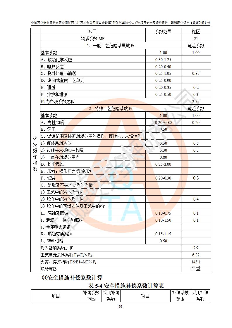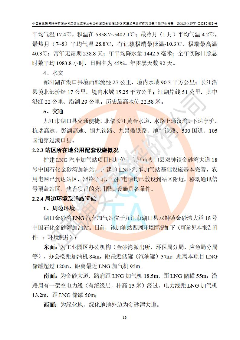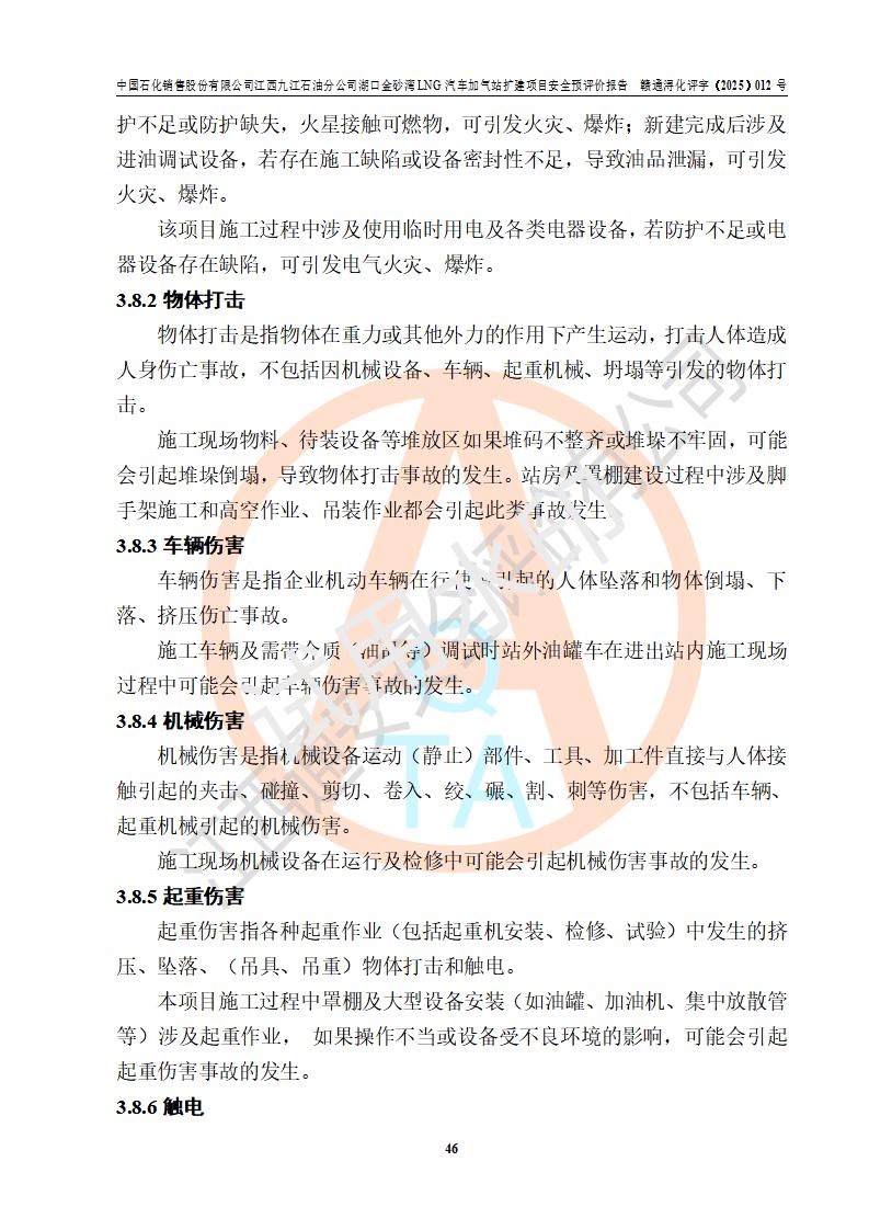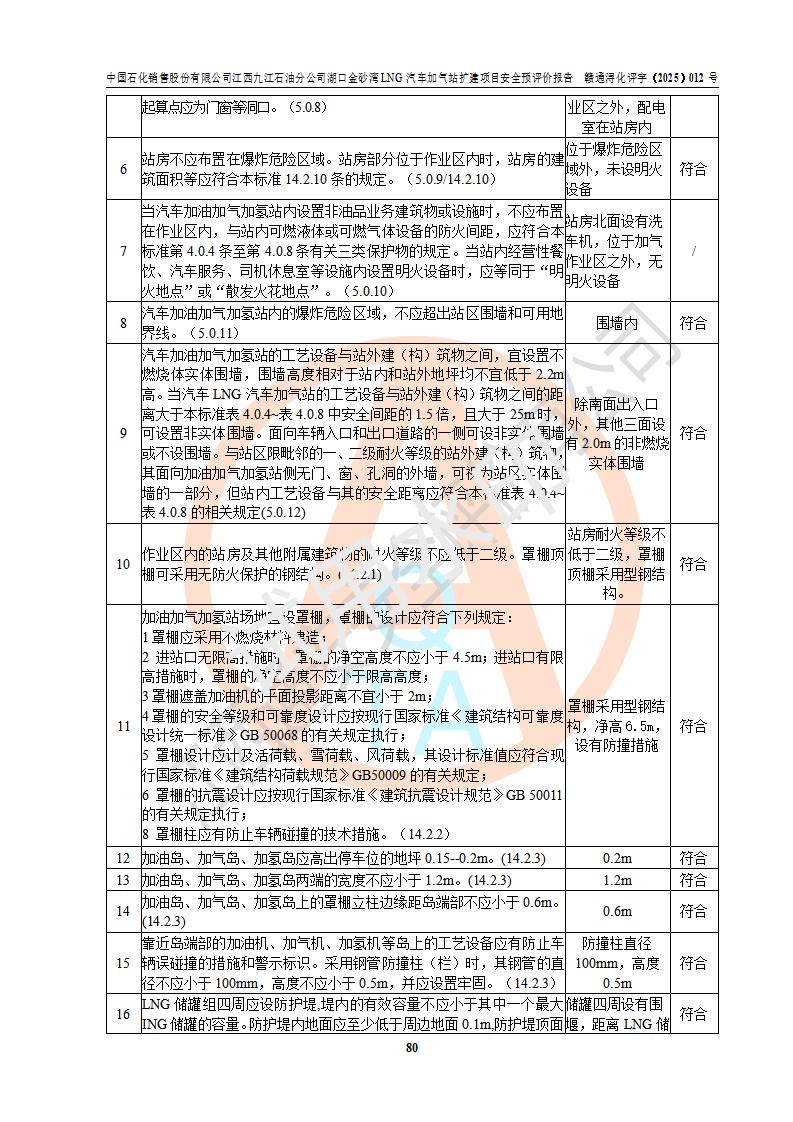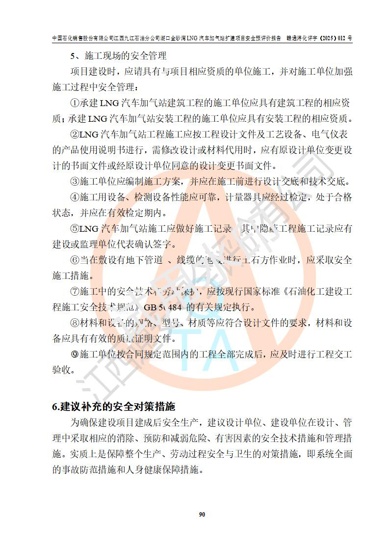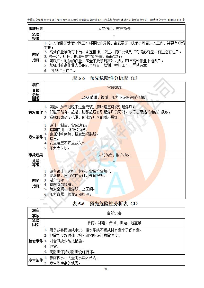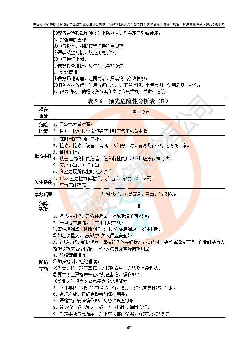 項目簡介 | 中國石化銷售股份有限公司江西九江石油分公司九江市湖口金砂灣LNG汽車加氣站成立于2024年11月12日,經(jīng)營場所為江西省九江市湖口縣金砂灣大道與發(fā)展大道交匯處(金砂灣派出所右側50米處),法定**人為杜建國,公司類型為臺、港、澳投資企業(yè)分公司。經(jīng)營范圍:許可項目:食品銷售,煙草制品零售,餐飲服務,燃氣經(jīng)營,出版物零售,道路貨物運輸(不含危險貨物),旅游業(yè)務,**經(jīng)紀業(yè)務,房地產(chǎn)開發(fā)經(jīng)營,住宿服務,藥品零售,發(fā)電業(yè)務、輸電業(yè)務、供(配)電業(yè)務(依法須經(jīng)批準的項目,經(jīng)相關部門批準后在許可**期內方可開展經(jīng)營活動,具體經(jīng)營項目和許可期限以相關部門批準文件或許可證件為準)一般項日:保健食品(預包裝)銷售,貨物進出口,化工產(chǎn)品銷售(不含許可類化工產(chǎn)品),日用百貨銷售,機械零件、零部件銷售,洗車服務,小微型客車租賃經(jīng)營服務,廣告發(fā)布,廣告設計、代理,家用電器銷售,居民日常生活服務,潤滑油銷售,辦公設備耗材銷售,新能源汽車整車銷售,摩托車及零配件零售,服裝服飾零售,五金產(chǎn)品零售,電子產(chǎn)品銷售,銷售代理,計算機軟硬件及鋪助設備零售,汽車裝飾用品銷售,二手車經(jīng)紀,二手車交易市場經(jīng)營,輪胎銷售,洗燙服務,打字復印,站用加氫及儲氫設施銷售,新鮮水果批發(fā),新鮮水果零售,農(nóng)副產(chǎn)品銷售,金屬材料銷售,建筑材料銷售,家具銷售,互聯(lián)網(wǎng)銷售(除銷售需要許可的商品),機動車充電銷售,普通貨物倉儲服務(不含危險化學品等需許可審批的項日),裝卸搬運,食品銷售(僅銷售預包裝食品),包裝服務,數(shù)據(jù)處理服務,***纖維及復合材料銷售,產(chǎn)業(yè)用紡織制成品銷售(除依法須經(jīng)批準的項目外,憑營業(yè)執(zhí)照依法自主開展經(jīng)營活動)。 為了滿足湖口縣重卡、牽引車、城際客運**等加注LNG燃氣車用氣需求,該公司根據(jù)湖口縣發(fā)展和改革委員會批復的《江西省企業(yè)投資項目備案通知書》(項目統(tǒng)一代碼為:2409-360429-04-01-657252)文件,在九江市湖口縣金砂灣大道與發(fā)展大道交匯處金砂灣加油站區(qū)內擬投資建設一座LNG汽車加氣站項目。 湖口金砂灣加油站的建設用地已取得湖口縣不動產(chǎn)登記局頒發(fā)的不動產(chǎn)權證書:贛(2023)湖口縣不動產(chǎn)權第0002564號。 擬擴建LNG汽車加氣站總用地面積為5333.73m2,總建筑面積為867.2m2,站區(qū)內加氣機擬設置為2機2槍。LNG貯氣區(qū)內設置1個60m3的LNG儲氣罐、LNG低溫泵撬1套(含雙泵、BOG空溫式加熱器),加氣能力為2×104Nm3/d。按現(xiàn)行《汽車加油加氣加氫站技術標準》對LNG加氣站的等級劃分,該LNG汽車加氣站屬三級站,與原有建成的三級加油站合建,屬二級加油與LNG加氣合建站。建成后本項目日加氣量可達2×104Nm3/日。 該二級加油與LNG加氣合建站內加氣設施已于2017年建設完成,但一直未投入使用?,F(xiàn)因公司市場發(fā)展需要,擬重新啟動投入使用。依據(jù)《中華人民共和國安全生產(chǎn)法》、《燃氣經(jīng)營許可管理辦法》、《城鎮(zhèn)燃氣管理條例》等法律和規(guī)定的要求,新建、改建、擴建危險化學品儲存裝置和設施的建設項目安全條件審查(審批、核準、備案)前,建設單位應當選擇有資質的安全評價機構對建設項目進行安全條件評價,以**工程項目的安全設施與主體工程同時設計、同時施工、同時投入使用,為**工程項目在安全生產(chǎn)及安全管理方面符合**及行業(yè)有關法律法規(guī)及標準,中國石化銷售股份有限公司江西江西九江石油分公司湖口金砂灣LNG汽車加氣站擴建項目委托江西通安安全評價有限公司承擔中國石化銷售股份有限公司江西九江石油分公司湖口金砂灣LNG汽車加氣站擴建項目的安全預評價。該企業(yè)應辦理燃氣經(jīng)營許可證。 江西通安安全評價有限公司接受委托后,成立了評價組,于2025年2月踏勘了建設地址。根據(jù)相關法律、法規(guī)和標準的規(guī)定,按照《安全評價通則》(AQ8001-2007)、《安全預評價導則》(AQ8002-2007)的要求,在資料收集、現(xiàn)場勘探和類比調查的基礎上,對項目的工程技術資料進行了認真分析。建設項目內在的危險、有害因素對建設項目周邊單位生產(chǎn)、經(jīng)營活動或者居民生活的影響以及建設項目周邊單位生產(chǎn)、經(jīng)營活動或者居民生活對建設項目的影響等,經(jīng)過定性分析與定量計算,編制完成了本建設項目安全預評價報告,為相關部門實行安全監(jiān)察、為**相關部門建設項目設立安全審查以及為企業(yè)建設項目實施“三同時”提供安全技術依據(jù)。 本次安全評價范圍:中國石化銷售股份有限公司江西九江石油分公司湖口金砂灣LNG汽車加氣站擴建項目的選址、總平面布置、主體裝置和輔助設施的安全條件,包括經(jīng)營過程中的危險和危害因素、建設項目的安全條件以及規(guī)劃設計中提出的工藝、設備設施的安全可靠性和勞動安全管理方面的組織、機構、人員、防護設施、作業(yè)環(huán)境及管理制度等。 本站中涉及加油作業(yè)、汽、柴油儲罐區(qū)、充電作業(yè)、洗車作業(yè)、站房頂光伏板區(qū)均不在此次評價范圍內,僅作一般性描述。涉及工程的環(huán)境、消防及職業(yè