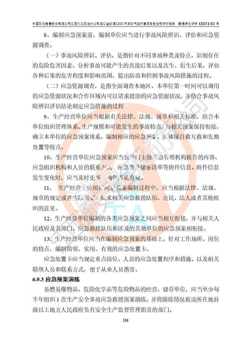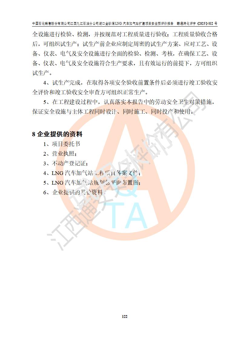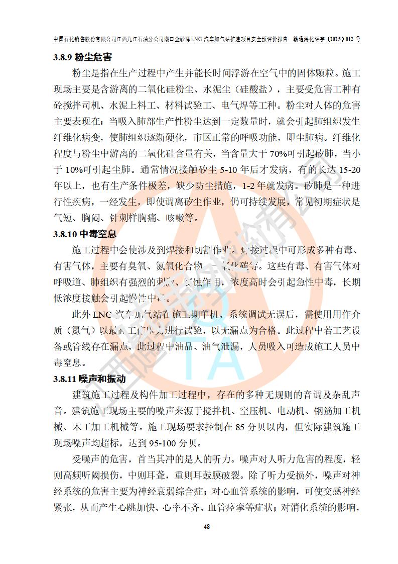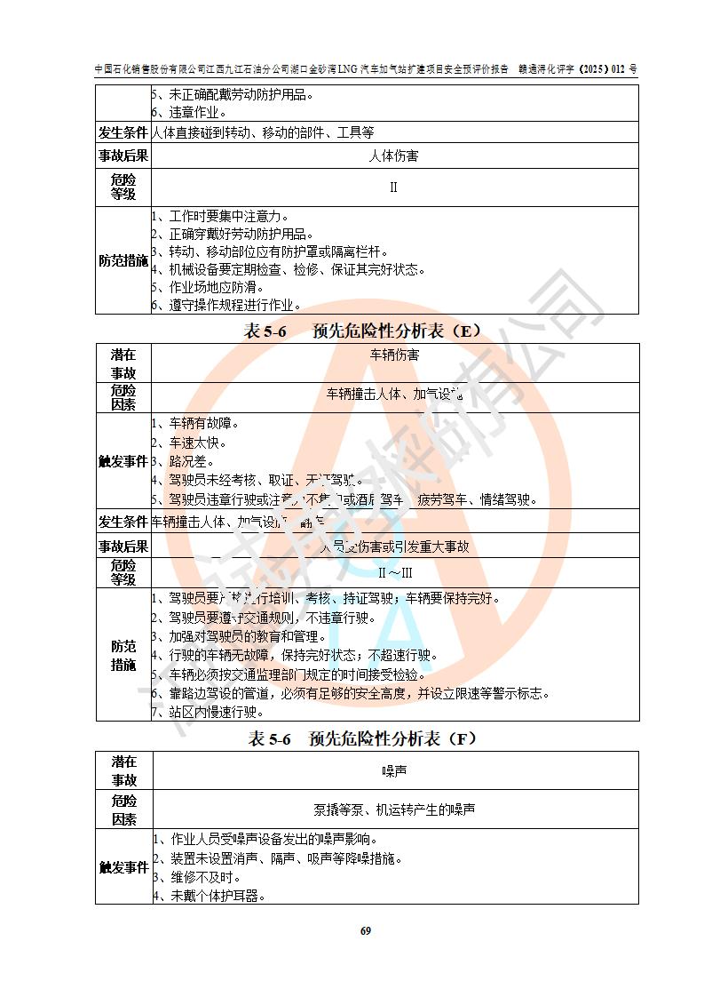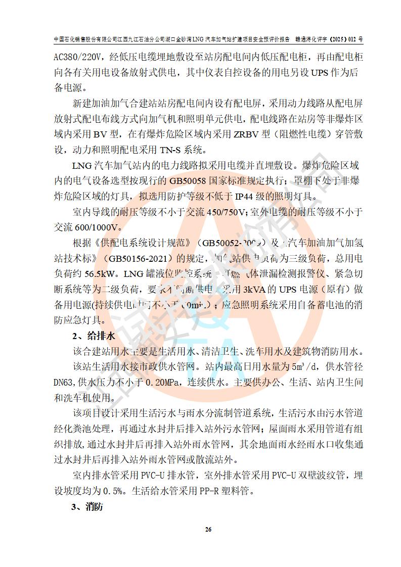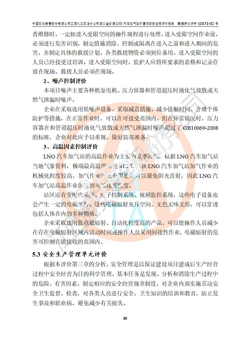項目簡介 | 中國石化銷售股份有限公司江西九江石油分公司九江市湖口金砂灣LNG汽車加氣站成立于2024年11月12日,經(jīng)營場所為江西省九江市湖口縣金砂灣大道與發(fā)展大道交匯處(金砂灣派出所右側50米處),法定**人為杜建國,公司類型為臺、港、澳投資企業(yè)分公司。經(jīng)營范圍:許可項目:食品銷售,煙草制品零售,餐飲服務,燃氣經(jīng)營,出版物零售,道路貨物運輸(不含危險貨物),旅游業(yè)務,**經(jīng)紀業(yè)務,房地產(chǎn)開發(fā)經(jīng)營,住宿服務,藥品零售,發(fā)電業(yè)務、輸電業(yè)務、供(配)電業(yè)務(依法須經(jīng)批準的項目,經(jīng)相關部門批準后在許可**期內方可開展經(jīng)營活動,具體經(jīng)營項目和許可期限以相關部門批準文件或許可證件為準)一般項日:保健食品(預包裝)銷售,貨物進出口,化工產(chǎn)品銷售(不含許可類化工產(chǎn)品),日用百貨銷售,機械零件、零部件銷售,洗車服務,小微型客車租賃經(jīng)營服務,廣告發(fā)布,廣告設計、代理,家用電器銷售,居民日常生活服務,潤滑油銷售,辦公設備耗材銷售,新能源汽車整車銷售,摩托車及零配件零售,服裝服飾零售,五金產(chǎn)品零售,電子產(chǎn)品銷售,銷售代理,計算機軟硬件及鋪助設備零售,汽車裝飾用品銷售,二手車經(jīng)紀,二手車交易市場經(jīng)營,輪胎銷售,洗燙服務,打字復印,站用加氫及儲氫設施銷售,新鮮水果批發(fā),新鮮水果零售,農(nóng)副產(chǎn)品銷售,金屬材料銷售,建筑材料銷售,家具銷售,互聯(lián)網(wǎng)銷售(除銷售需要許可的商品),機動車充電銷售,普通貨物倉儲服務(不含危險化學品等需許可審批的項日),裝卸搬運,食品銷售(僅銷售預包裝食品),包裝服務,數(shù)據(jù)處理服務,***纖維及復合材料銷售,產(chǎn)業(yè)用紡織制成品銷售(除依法須經(jīng)批準的項目外,憑營業(yè)執(zhí)照依法自主開展經(jīng)營活動)。 為了滿足湖口縣重卡、牽引車、城際客運**等加注LNG燃氣車用氣需求,該公司根據(jù)湖口縣發(fā)展和改革委員會批復的《江西省企業(yè)投資項目備案通知書》(項目統(tǒng)一代碼為:2409-360429-04-01-657252)文件,在九江市湖口縣金砂灣大道與發(fā)展大道交匯處金砂灣加油站區(qū)內擬投資建設一座LNG汽車加氣站項目。 湖口金砂灣加油站的建設用地已取得湖口縣不動產(chǎn)登記局頒發(fā)的不動產(chǎn)權證書:贛(2023)湖口縣不動產(chǎn)權第0002564號。 擬擴建LNG汽車加氣站總用地面積為5333.73m2,總建筑面積為867.2m2,站區(qū)內加氣機擬設置為2機2槍。LNG貯氣區(qū)內設置1個60m3的LNG儲氣罐、LNG低溫泵撬1套(含雙泵、BOG空溫式加熱器),加氣能力為2×104Nm3/d。按現(xiàn)行《汽車加油加氣加氫站技術標準》對LNG加氣站的等級劃分,該LNG汽車加氣站屬三級站,與原有建成的三級加油站合建,屬二級加油與LNG加氣合建站。建成后本項目日加氣量可達2×104Nm3/日。 該二級加油與LNG加氣合建站內加氣設施已于2017年建設完成,但一直未投入使用?,F(xiàn)因公司市場發(fā)展需要,擬重新啟動投入使用。依據(jù)《中華人民共和國安全生產(chǎn)法》、《燃氣經(jīng)營許可管理辦法》、《城鎮(zhèn)燃氣管理條例》等法律和規(guī)定的要求,新建、改建、擴建危險化學品儲存裝置和設施的建設項目安全條件審查(審批、核準、備案)前,建設單位應當選擇有資質的安全評價機構對建設項目進行安全條件評價,以**工程項目的安全設施與主體工程同時設計、同時施工、同時投入使用,為**工程項目在安全生產(chǎn)及安全管理方面符合**及行業(yè)有關法律法規(guī)及標準,中國石化銷售股份有限公司江西江西九江石油分公司湖口金砂灣LNG汽車加氣站擴建項目委托江西通安安全評價有限公司承擔中國石化銷售股份有限公司江西九江石油分公司湖口金砂灣LNG汽車加氣站擴建項目的安全預評價。該企業(yè)應辦理燃氣經(jīng)營許可證。 江西通安安全評價有限公司接受委托后,成立了評價組,于2025年2月踏勘了建設地址。根據(jù)相關法律、法規(guī)和標準的規(guī)定,按照《安全評價通則》(AQ8001-2007)、《安全預評價導則》(AQ8002-2007)的要求,在資料收集、現(xiàn)場勘探和類比調查的基礎上,對項目的工程技術資料進行了認真分析。建設項目內在的危險、有害因素對建設項目周邊單位生產(chǎn)、經(jīng)營活動或者居民生活的影響以及建設項目周邊單位生產(chǎn)、經(jīng)營活動或者居民生活對建設項目的影響等,經(jīng)過定性分析與定量計算,編制完成了本建設項目安全預評價報告,為相關部門實行安全監(jiān)察、為**相關部門建設項目設立安全審查以及為企業(yè)建設項目實施“三同時”提供安全技術依據(jù)。 本次安全評價范圍:中國石化銷售股份有限公司江西九江石油分公司湖口金砂灣LNG汽車加氣站擴建項目的選址、總平面布置、主體裝置和輔助設施的安全條件,包括經(jīng)營過程中的危險和危害因素、建設項目的安全條件以及規(guī)劃設計中提出的工藝、設備設施的安全可靠性和勞動安全管理方面的組織、機構、人員、防護設施、作業(yè)環(huán)境及管理制度等。 本站中涉及加油作業(yè)、汽、柴油儲罐區(qū)、充電作業(yè)、洗車作業(yè)、站房頂光伏板區(qū)均不在此次評價范圍內,僅作一般性描述。涉及工程的環(huán)境、消防及職業(yè