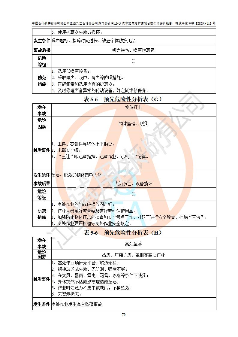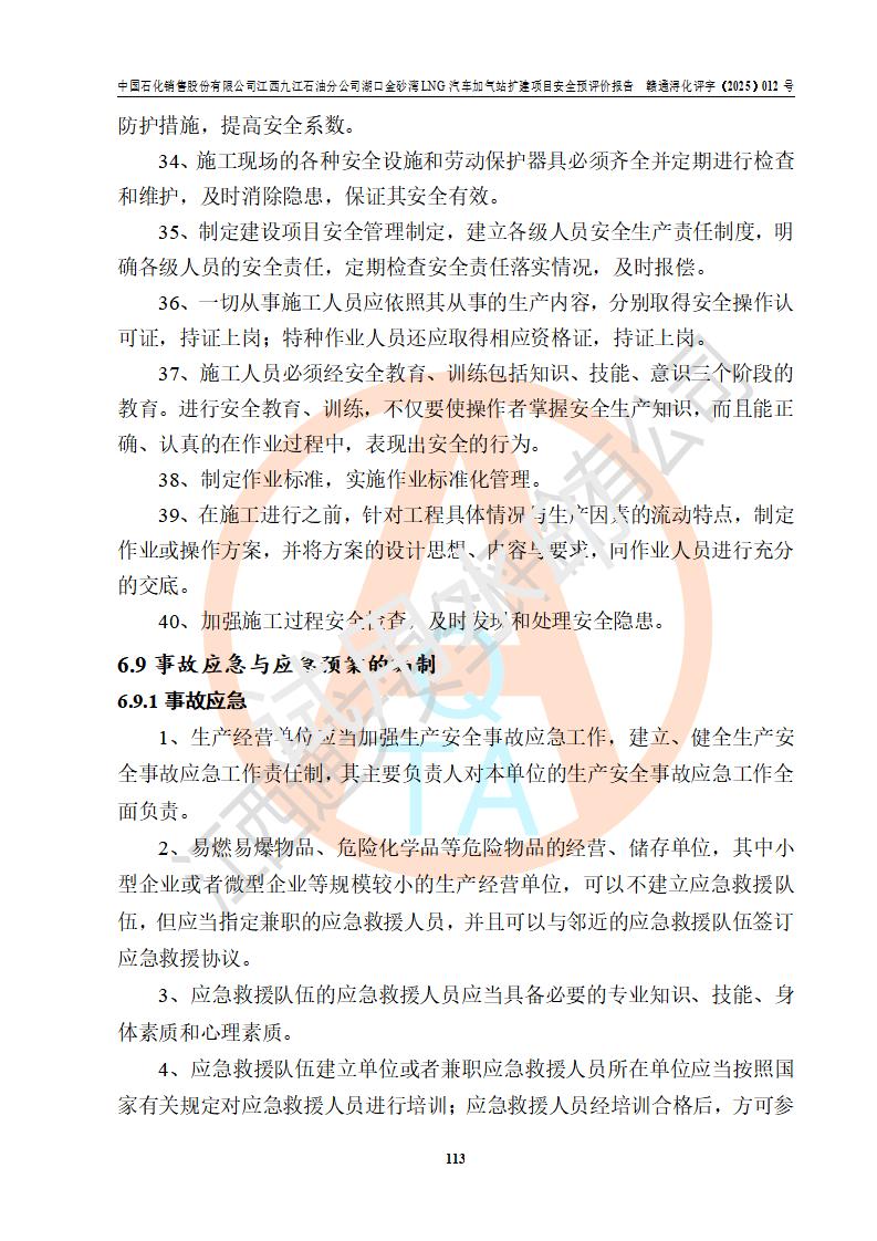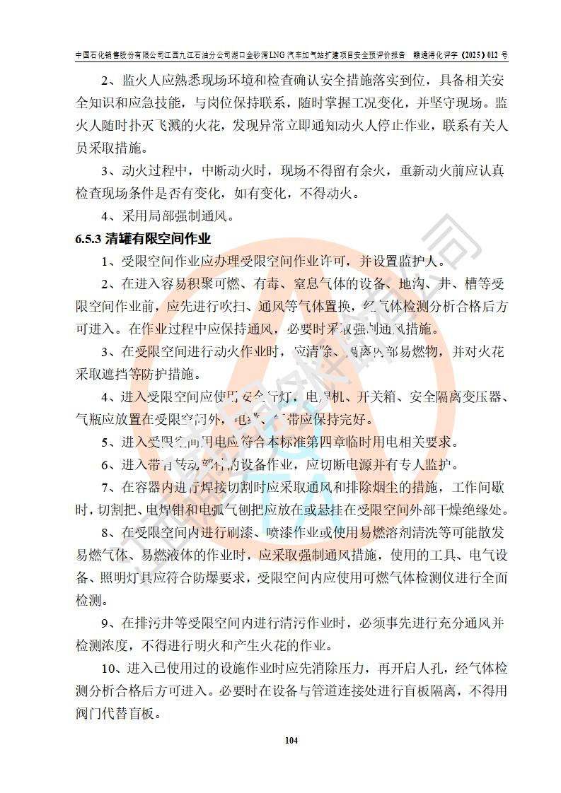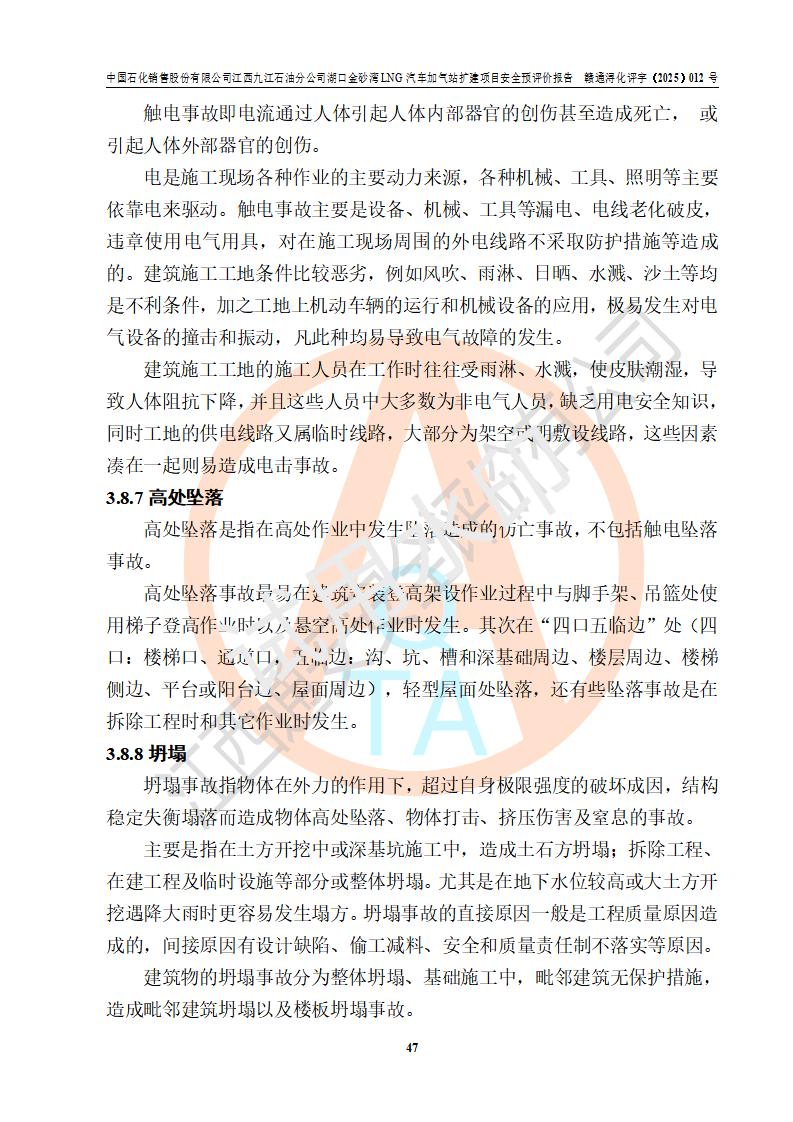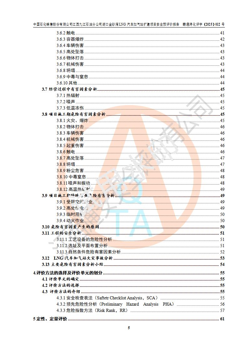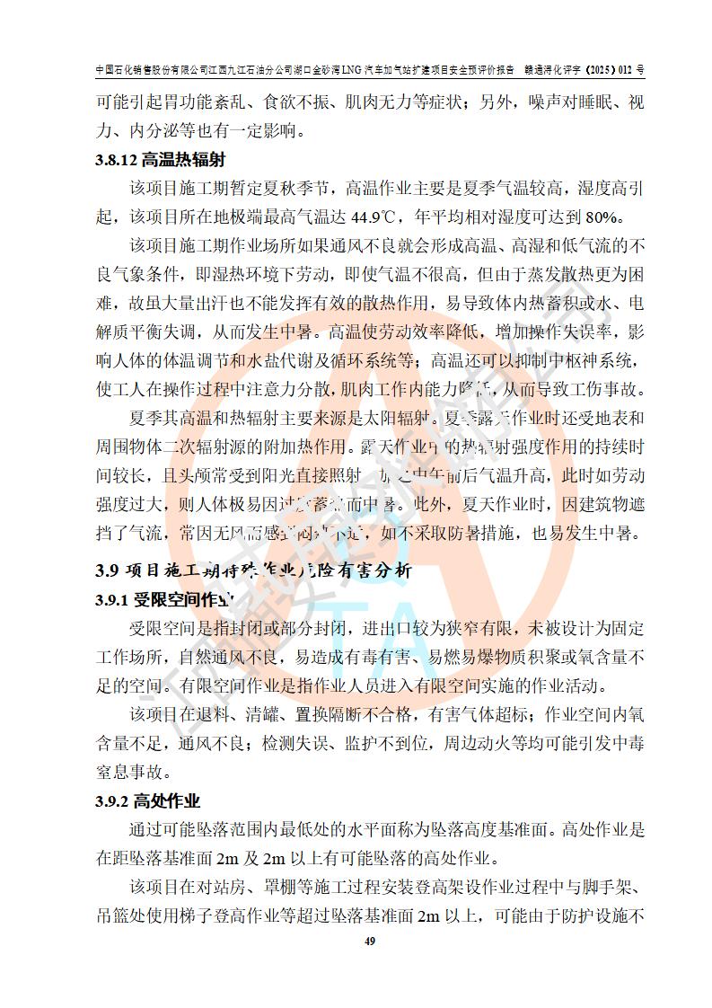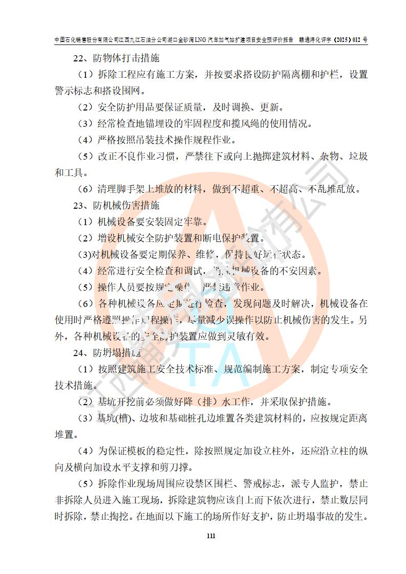 項目簡介 | 中國石化銷售股份有限公司江西九江石油分公司九江市湖口金砂灣LNG汽車加氣站成立于2024年11月12日,經(jīng)營場所為江西省九江市湖口縣金砂灣大道與發(fā)展大道交匯處(金砂灣派出所右側50米處),法定**人為杜建國,公司類型為臺、港、澳投資企業(yè)分公司。經(jīng)營范圍:許可項目:食品銷售,煙草制品零售,餐飲服務,燃氣經(jīng)營,出版物零售,道路貨物運輸(不含危險貨物),旅游業(yè)務,**經(jīng)紀業(yè)務,房地產(chǎn)開發(fā)經(jīng)營,住宿服務,藥品零售,發(fā)電業(yè)務、輸電業(yè)務、供(配)電業(yè)務(依法須經(jīng)批準的項目,經(jīng)相關部門批準后在許可**期內方可開展經(jīng)營活動,具體經(jīng)營項目和許可期限以相關部門批準文件或許可證件為準)一般項日:保健食品(預包裝)銷售,貨物進出口,化工產(chǎn)品銷售(不含許可類化工產(chǎn)品),日用百貨銷售,機械零件、零部件銷售,洗車服務,小微型客車租賃經(jīng)營服務,廣告發(fā)布,廣告設計、代理,家用電器銷售,居民日常生活服務,潤滑油銷售,辦公設備耗材銷售,新能源汽車整車銷售,摩托車及零配件零售,服裝服飾零售,五金產(chǎn)品零售,電子產(chǎn)品銷售,銷售代理,計算機軟硬件及鋪助設備零售,汽車裝飾用品銷售,二手車經(jīng)紀,二手車交易市場經(jīng)營,輪胎銷售,洗燙服務,打字復印,站用加氫及儲氫設施銷售,新鮮水果批發(fā),新鮮水果零售,農(nóng)副產(chǎn)品銷售,金屬材料銷售,建筑材料銷售,家具銷售,互聯(lián)網(wǎng)銷售(除銷售需要許可的商品),機動車充電銷售,普通貨物倉儲服務(不含危險化學品等需許可審批的項日),裝卸搬運,食品銷售(僅銷售預包裝食品),包裝服務,數(shù)據(jù)處理服務,***纖維及復合材料銷售,產(chǎn)業(yè)用紡織制成品銷售(除依法須經(jīng)批準的項目外,憑營業(yè)執(zhí)照依法自主開展經(jīng)營活動)。 為了滿足湖口縣重卡、牽引車、城際客運**等加注LNG燃氣車用氣需求,該公司根據(jù)湖口縣發(fā)展和改革委員會批復的《江西省企業(yè)投資項目備案通知書》(項目統(tǒng)一代碼為:2409-360429-04-01-657252)文件,在九江市湖口縣金砂灣大道與發(fā)展大道交匯處金砂灣加油站區(qū)內擬投資建設一座LNG汽車加氣站項目。 湖口金砂灣加油站的建設用地已取得湖口縣不動產(chǎn)登記局頒發(fā)的不動產(chǎn)權證書:贛(2023)湖口縣不動產(chǎn)權第0002564號。 擬擴建LNG汽車加氣站總用地面積為5333.73m2,總建筑面積為867.2m2,站區(qū)內加氣機擬設置為2機2槍。LNG貯氣區(qū)內設置1個60m3的LNG儲氣罐、LNG低溫泵撬1套(含雙泵、BOG空溫式加熱器),加氣能力為2×104Nm3/d。按現(xiàn)行《汽車加油加氣加氫站技術標準》對LNG加氣站的等級劃分,該LNG汽車加氣站屬三級站,與原有建成的三級加油站合建,屬二級加油與LNG加氣合建站。建成后本項目日加氣量可達2×104Nm3/日。 該二級加油與LNG加氣合建站內加氣設施已于2017年建設完成,但一直未投入使用?,F(xiàn)因公司市場發(fā)展需要,擬重新啟動投入使用。依據(jù)《中華人民共和國安全生產(chǎn)法》、《燃氣經(jīng)營許可管理辦法》、《城鎮(zhèn)燃氣管理條例》等法律和規(guī)定的要求,新建、改建、擴建危險化學品儲存裝置和設施的建設項目安全條件審查(審批、核準、備案)前,建設單位應當選擇有資質的安全評價機構對建設項目進行安全條件評價,以**工程項目的安全設施與主體工程同時設計、同時施工、同時投入使用,為**工程項目在安全生產(chǎn)及安全管理方面符合**及行業(yè)有關法律法規(guī)及標準,中國石化銷售股份有限公司江西江西九江石油分公司湖口金砂灣LNG汽車加氣站擴建項目委托江西通安安全評價有限公司承擔中國石化銷售股份有限公司江西九江石油分公司湖口金砂灣LNG汽車加氣站擴建項目的安全預評價。該企業(yè)應辦理燃氣經(jīng)營許可證。 江西通安安全評價有限公司接受委托后,成立了評價組,于2025年2月踏勘了建設地址。根據(jù)相關法律、法規(guī)和標準的規(guī)定,按照《安全評價通則》(AQ8001-2007)、《安全預評價導則》(AQ8002-2007)的要求,在資料收集、現(xiàn)場勘探和類比調查的基礎上,對項目的工程技術資料進行了認真分析。建設項目內在的危險、有害因素對建設項目周邊單位生產(chǎn)、經(jīng)營活動或者居民生活的影響以及建設項目周邊單位生產(chǎn)、經(jīng)營活動或者居民生活對建設項目的影響等,經(jīng)過定性分析與定量計算,編制完成了本建設項目安全預評價報告,為相關部門實行安全監(jiān)察、為**相關部門建設項目設立安全審查以及為企業(yè)建設項目實施“三同時”提供安全技術依據(jù)。 本次安全評價范圍:中國石化銷售股份有限公司江西九江石油分公司湖口金砂灣LNG汽車加氣站擴建項目的選址、總平面布置、主體裝置和輔助設施的安全條件,包括經(jīng)營過程中的危險和危害因素、建設項目的安全條件以及規(guī)劃設計中提出的工藝、設備設施的安全可靠性和勞動安全管理方面的組織、機構、人員、防護設施、作業(yè)環(huán)境及管理制度等。 本站中涉及加油作業(yè)、汽、柴油儲罐區(qū)、充電作業(yè)、洗車作業(yè)、站房頂光伏板區(qū)均不在此次評價范圍內,僅作一般性描述。涉及工程的環(huán)境、消防及職業(yè