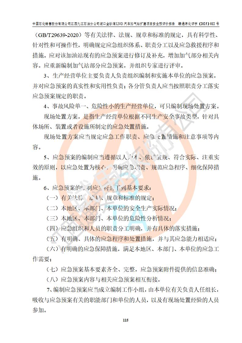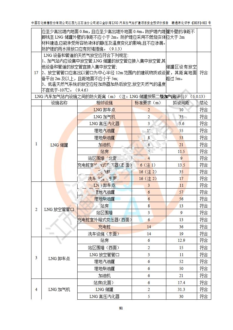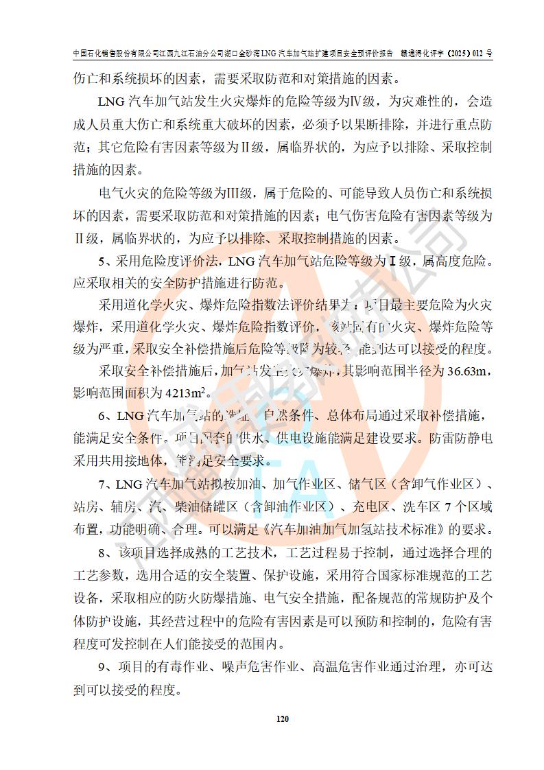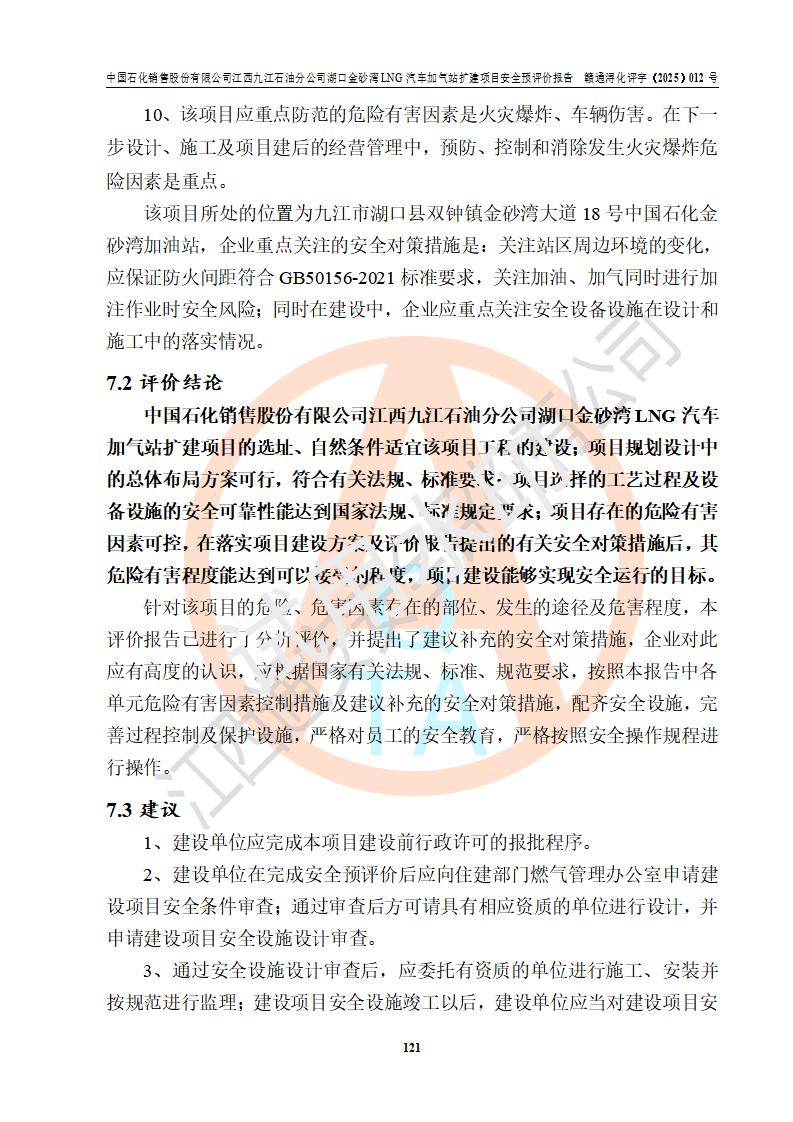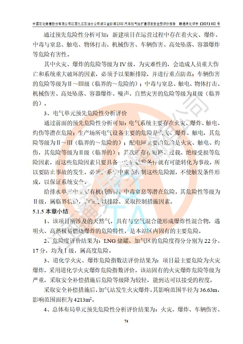 評價結論 | 綜上所述:中國石化銷售股份有限公司江西九江石油分公司湖口金砂灣LNG汽車加氣站擴建項目的選址、自然條件適宜該項目工程的建設;項目規(guī)劃設計中的總體布局方案可行,符合有關法規(guī)、標準要求;項目選擇的工藝過程及設備設施的安全可靠性能達到**法規(guī)、標準規(guī)定要求;項目存在的危險有害因素可控,在落實項目建設方案及評價報告提出的有關安全對策措施后,其危險有害程度能達到可以接受的程度,項目建設能夠實現(xiàn)安全運行的目標。 | ||||||