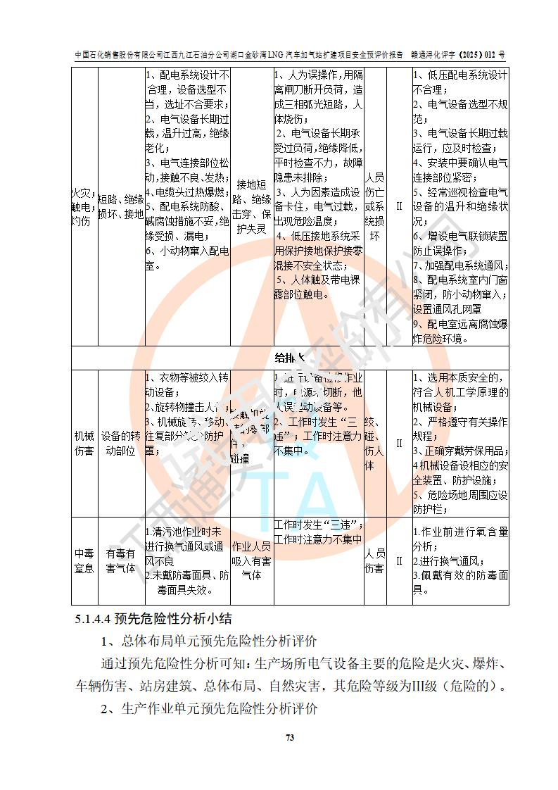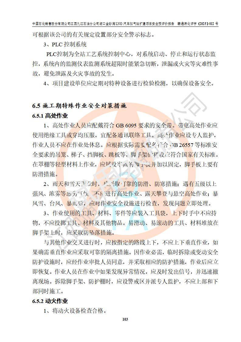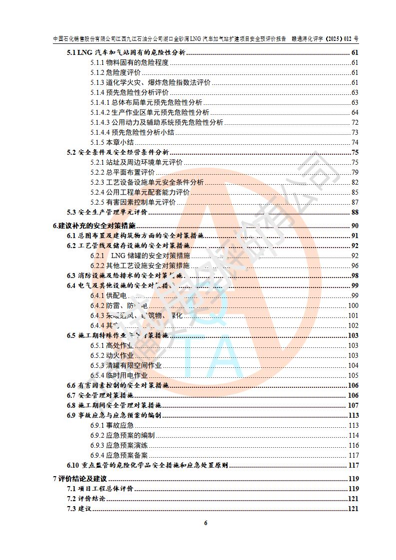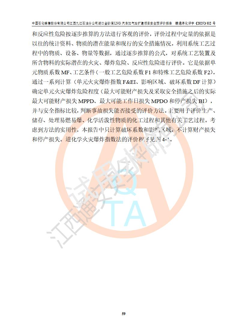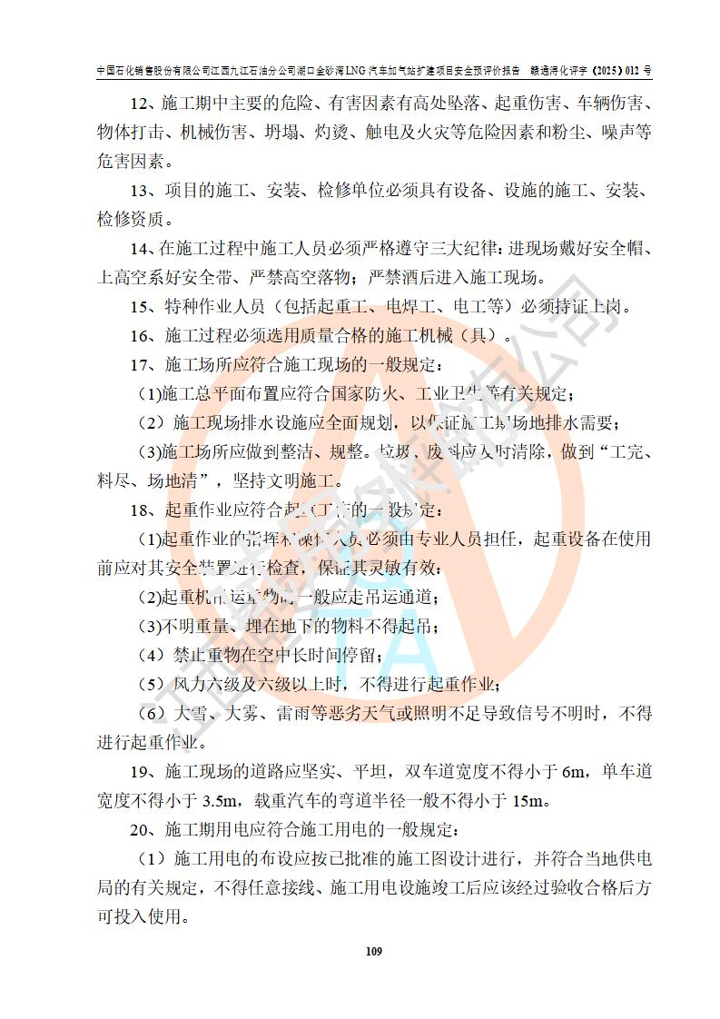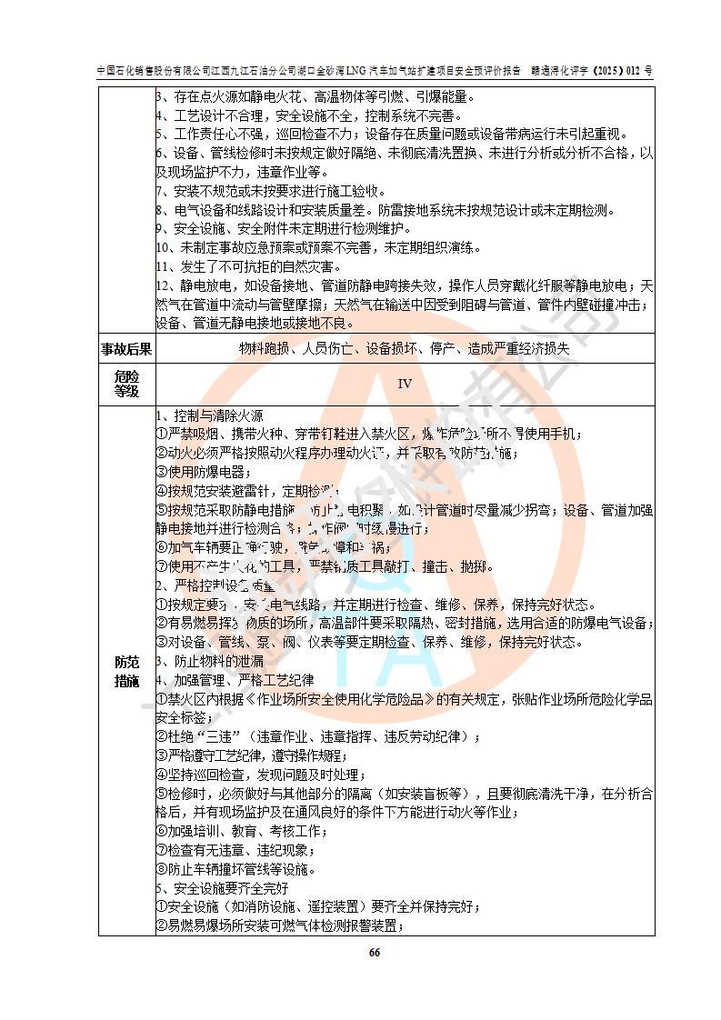 評價結論 | 綜上所述:中國石化銷售股份有限公司江西九江石油分公司湖口金砂灣LNG汽車加氣站擴建項目的選址、自然條件適宜該項目工程的建設;項目規(guī)劃設計中的總體布局方案可行,符合有關法規(guī)、標準要求;項目選擇的工藝過程及設備設施的安全可靠性能達到**法規(guī)、標準規(guī)定要求;項目存在的危險有害因素可控,在落實項目建設方案及評價報告提出的有關安全對策措施后,其危險有害程度能達到可以接受的程度,項目建設能夠實現(xiàn)安全運行的目標。 | ||||||