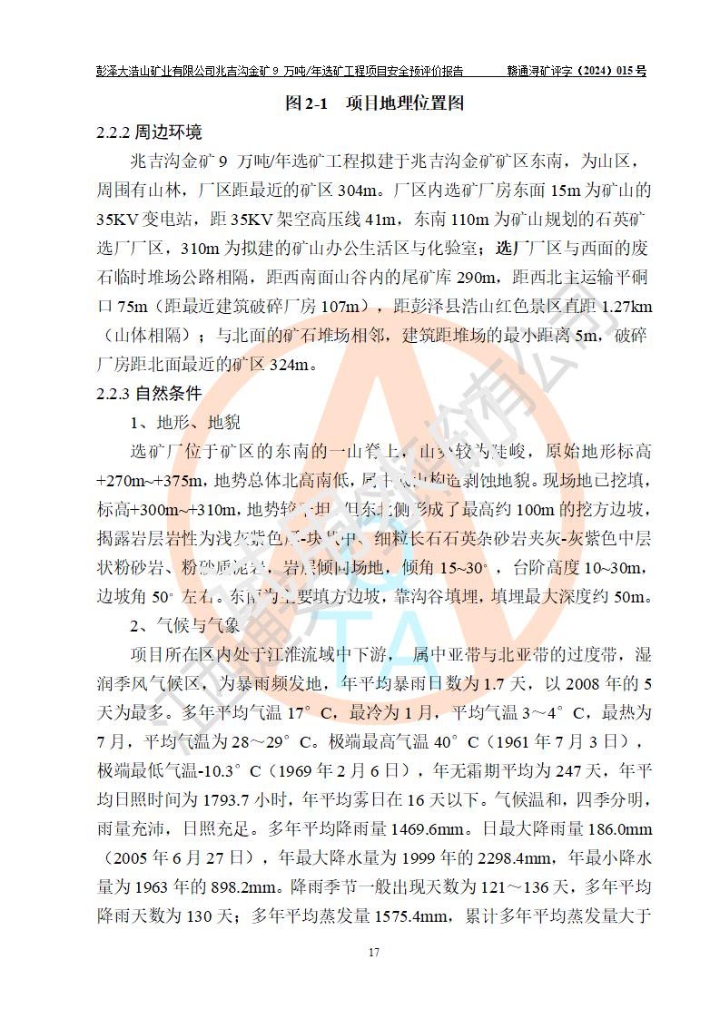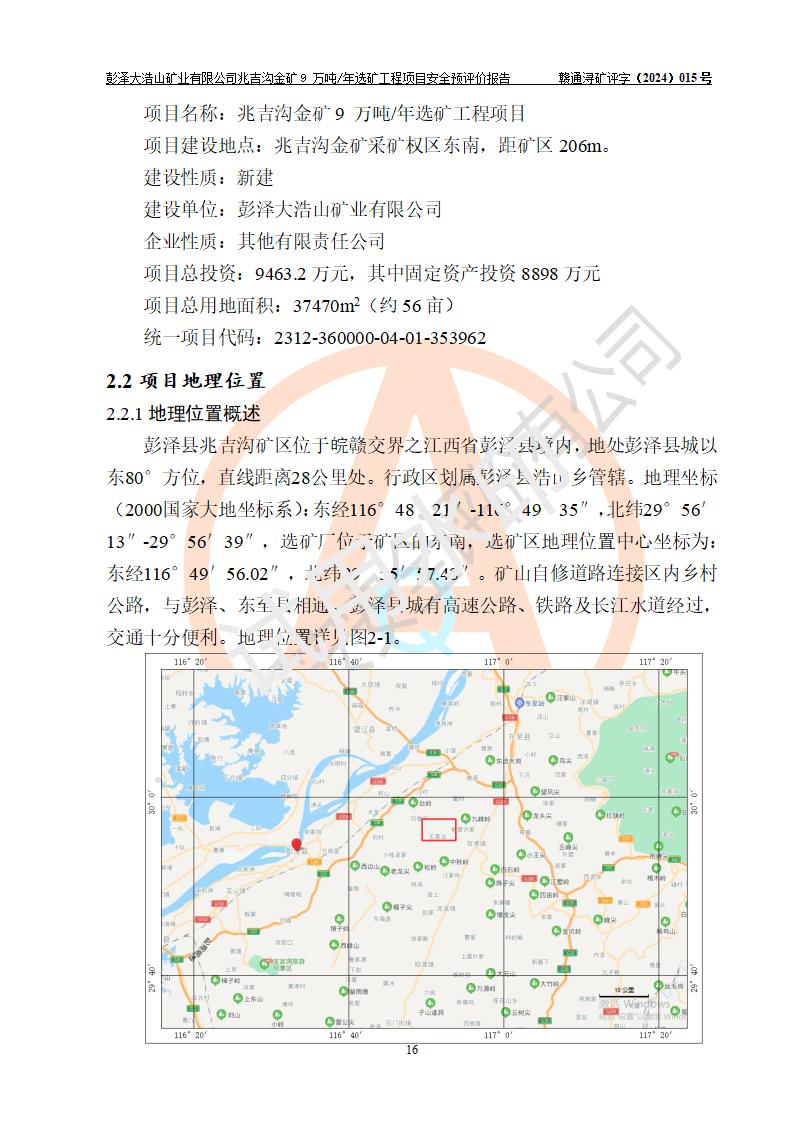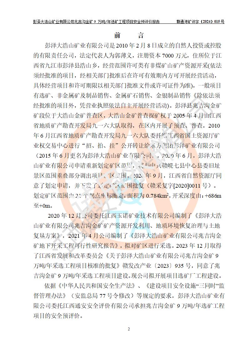 項(xiàng)目簡(jiǎn)介 | 彭澤大浩山礦業(yè)有限公司是2010年2月8日成立的自然人投資或控股的有限責(zé)任公司,法定**人為郭薄義,注冊(cè)資本7000萬(wàn)元,住所位于江西省九江市彭澤縣浩山鄉(xiāng),經(jīng)營(yíng)范圍許可類有非煤礦山礦產(chǎn)資源開(kāi)采(依法須經(jīng)批準(zhǔn)的項(xiàng)目,經(jīng)相關(guān)部門批準(zhǔn)后在許可**期內(nèi)方可開(kāi)展經(jīng)營(yíng)活動(dòng),具體經(jīng)營(yíng)項(xiàng)目和許可期限以相關(guān)部門批準(zhǔn)文件或許可證件為準(zhǔn)),一般項(xiàng)目有選礦、非金屬礦及制品銷售、金屬礦石銷售、金銀制品銷售《除依法須經(jīng)批準(zhǔn)的項(xiàng)目外,憑營(yíng)業(yè)執(zhí)照依法自主開(kāi)展經(jīng)營(yíng)活動(dòng))。彭澤縣兆吉溝金礦礦段位于大浩山金礦普查區(qū),大浩山金礦普查探礦權(quán)于2005年4月由江西省地質(zhì)礦產(chǎn)勘查開(kāi)發(fā)局九一六大隊(duì)取得,在區(qū)內(nèi)開(kāi)展了預(yù)查、普查。2010年6月江西省地質(zhì)礦產(chǎn)勘查開(kāi)發(fā)局九一六大隊(duì)委托原江西省國(guó)土資源廳礦業(yè)權(quán)交易中心進(jìn)行“招、拍、掛”公開(kāi)**給東方集團(tuán)彭澤礦業(yè)有限公司(2015年6月更名為彭澤大浩山礦業(yè)有限公司)。2020年6月,彭澤大浩山礦業(yè)有限公司申請(qǐng)重新劃定礦區(qū)范圍,將與**贛皖七縣中心縣委舊址景區(qū)范圍重疊部分調(diào)出項(xiàng)目礦區(qū)范圍。2020年9月,江西省自然資源廳同意了劃定申請(qǐng),并下發(fā)了劃定礦區(qū)范圍批復(fù)(贛采復(fù)字[2020]0011號(hào))。劃定礦區(qū)范圍由21個(gè)拐點(diǎn)坐標(biāo)圈定,面積為0.784km2,開(kāi)采深度由:+686m至+0m。 2021年4月公司編制了《彭澤大浩山礦業(yè)有限公司兆吉溝金礦地下開(kāi)采工程可行性研究報(bào)告》,擬對(duì)礦區(qū)進(jìn)行采選。2023年12月取得了江西省發(fā)展和改革委員會(huì)《關(guān)于彭澤大浩山礦業(yè)有限公司兆吉溝金礦9萬(wàn)噸/年采選工程項(xiàng)目核準(zhǔn)的批復(fù)》贛發(fā)改產(chǎn)業(yè)〔2023〕935號(hào),同意了兆吉溝金礦9萬(wàn)噸/年采選工程項(xiàng)目建設(shè)。現(xiàn)公司擬開(kāi)展項(xiàng)目選礦廠工程建設(shè)。 | |||||