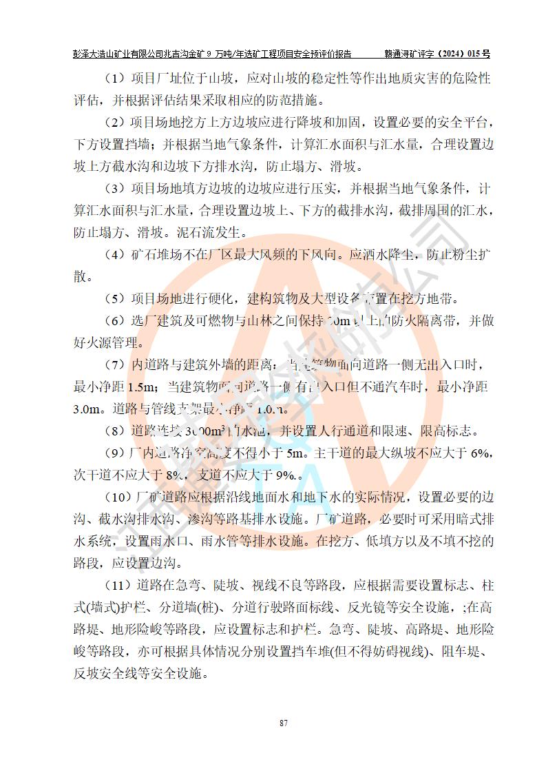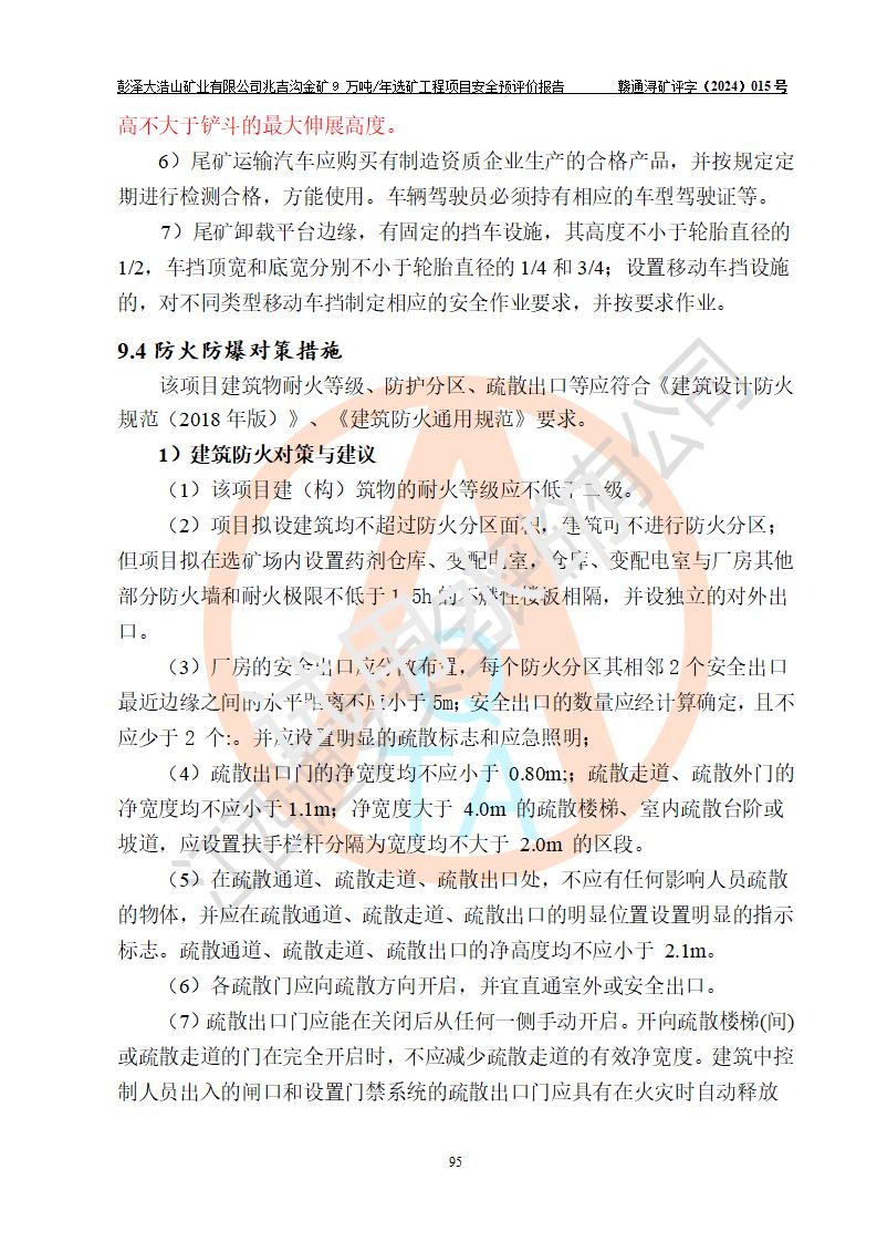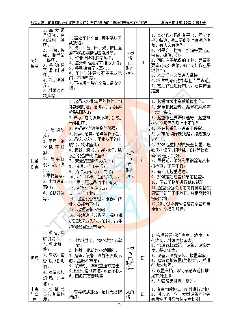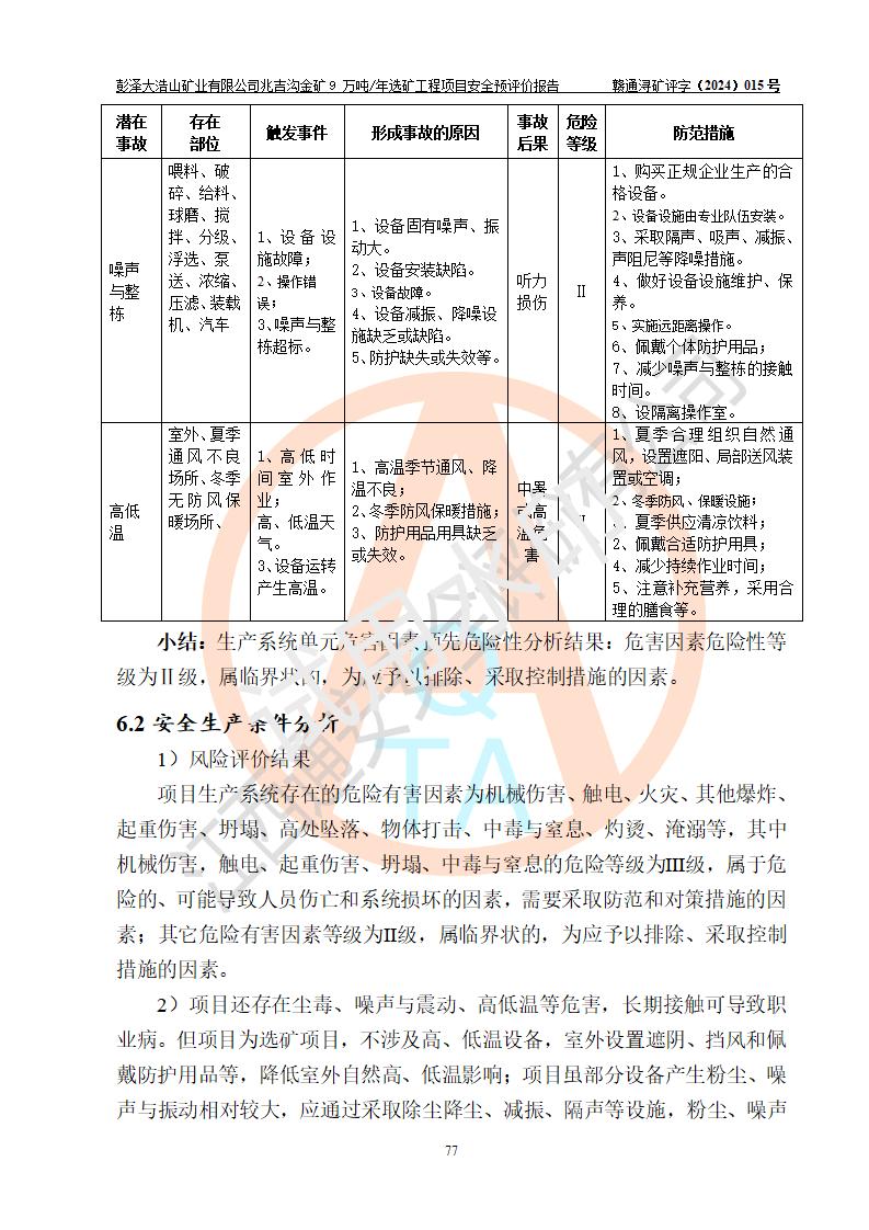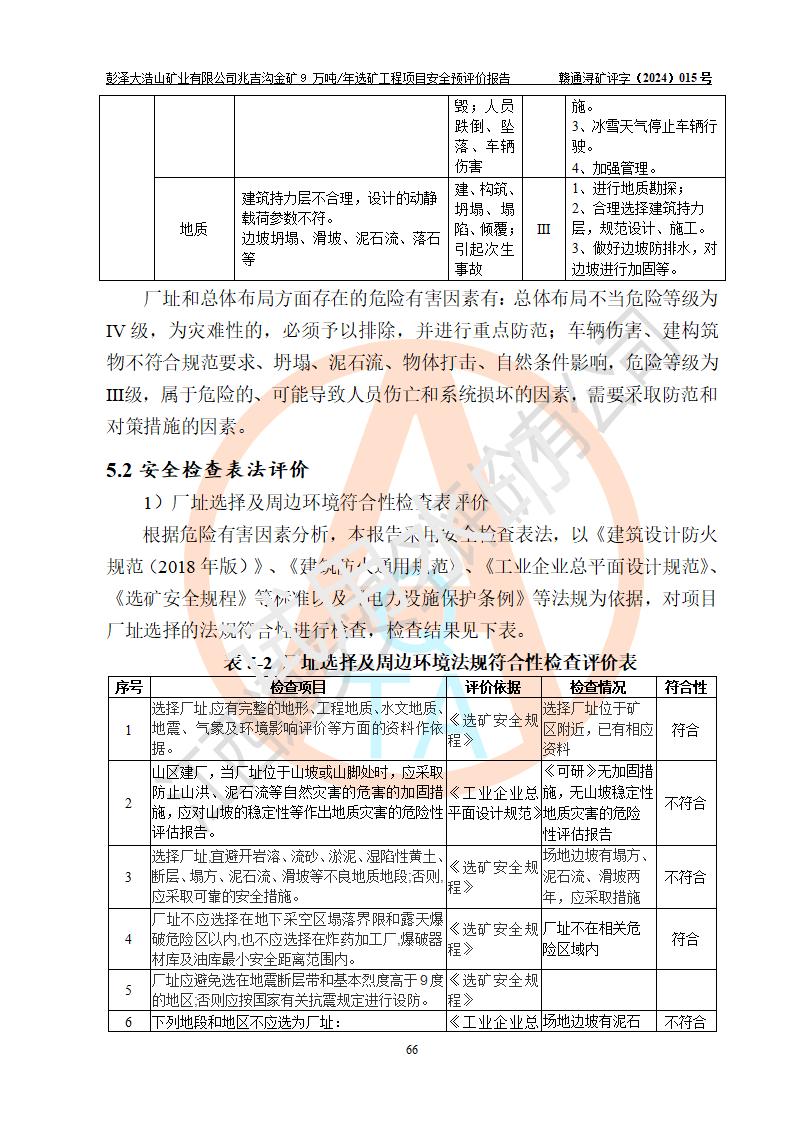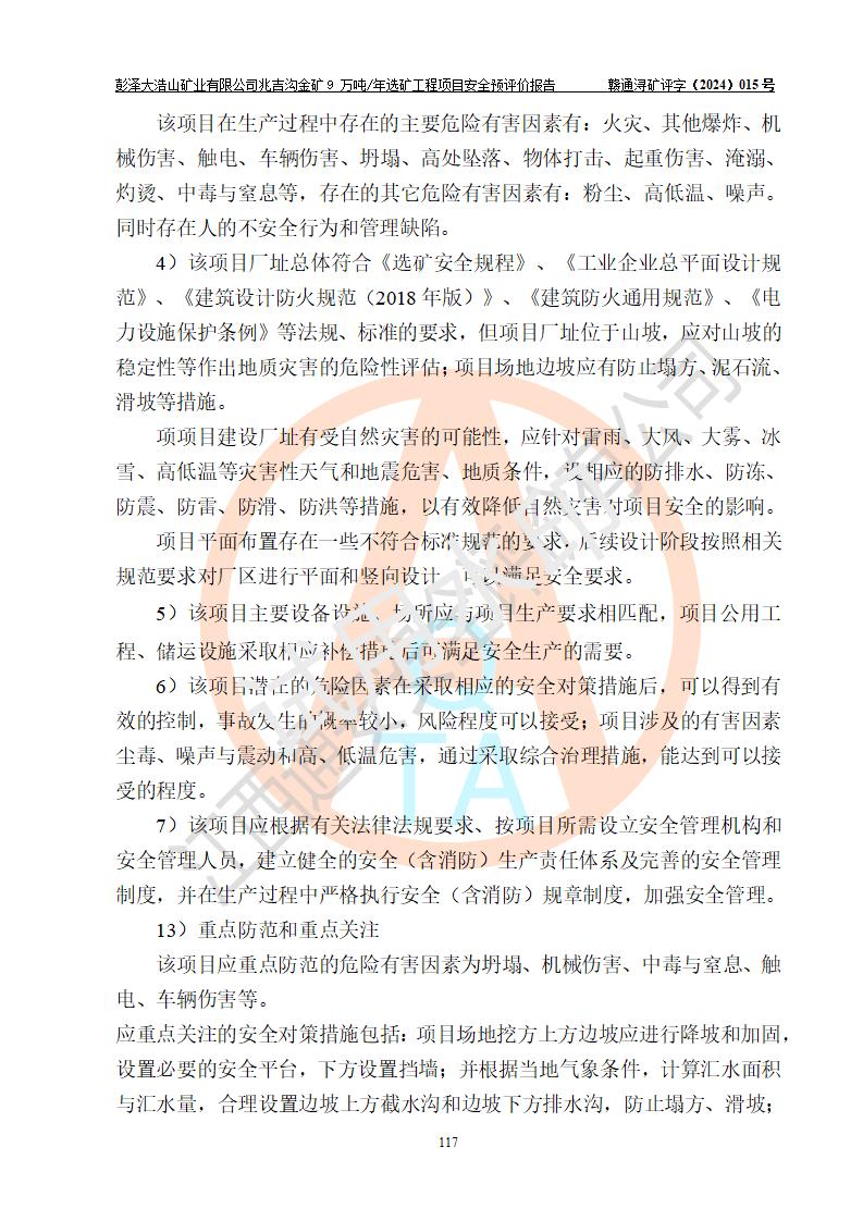 評(píng)價(jià)結(jié)論 | 總體結(jié)論:彭澤大浩山礦業(yè)有限公司兆吉溝金礦9 萬(wàn)噸/年選礦工程項(xiàng)目的廠址、總平面布置和擬設(shè)置的場(chǎng)所及設(shè)備設(shè)施的安全可靠性能達(dá)到**法規(guī)、標(biāo)準(zhǔn)規(guī)定要求;項(xiàng)目存在的危險(xiǎn)有害因素可控,在落實(shí)本評(píng)價(jià)報(bào)告提出的有關(guān)安全對(duì)策措施后,其危險(xiǎn)有害程度能達(dá)到可以接受的程度,項(xiàng)目建設(shè)能夠?qū)崿F(xiàn)安全運(yùn)行的目標(biāo)。 | |||||