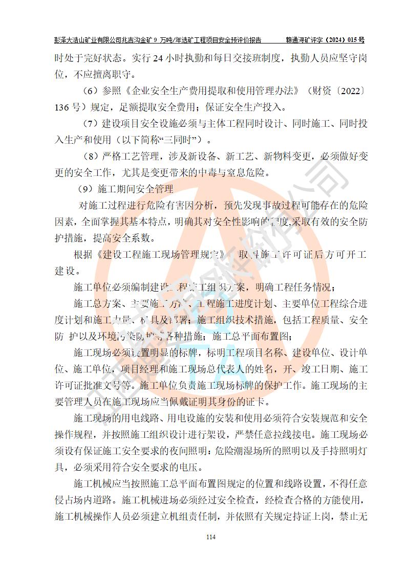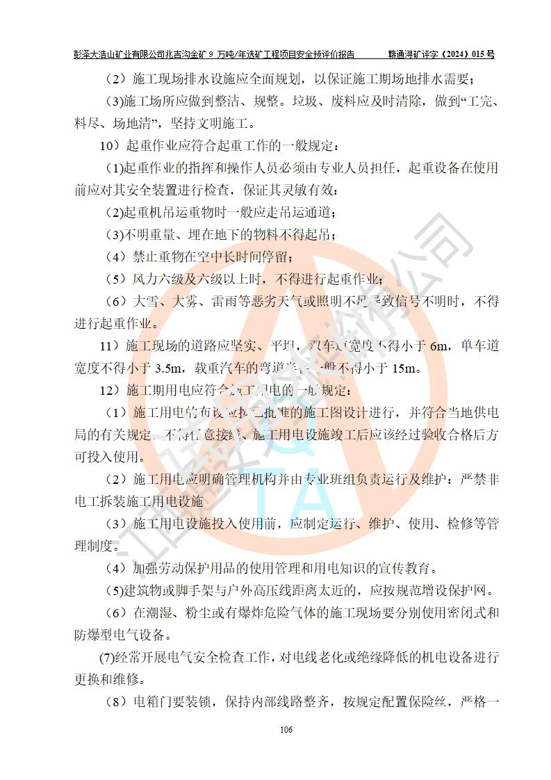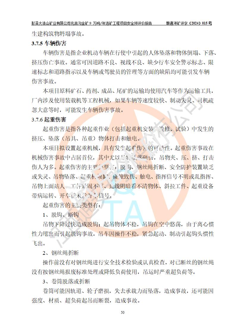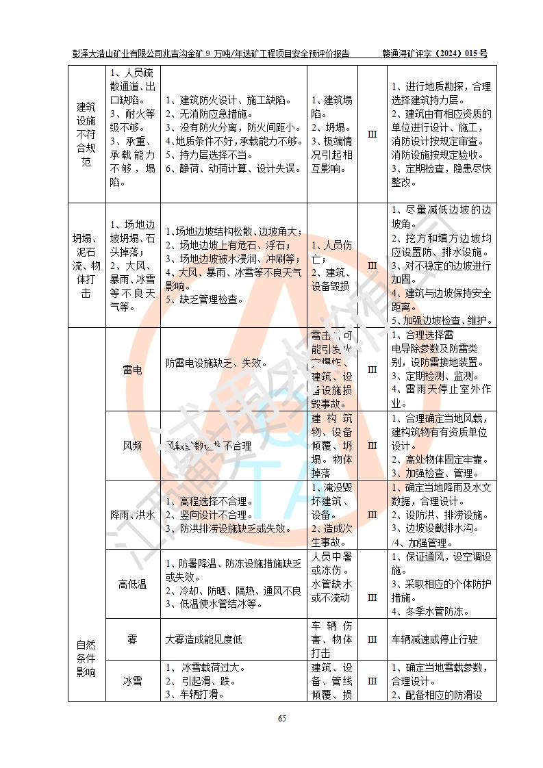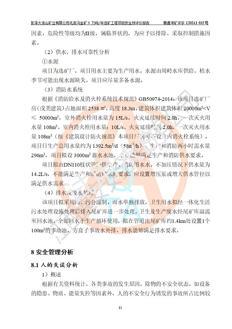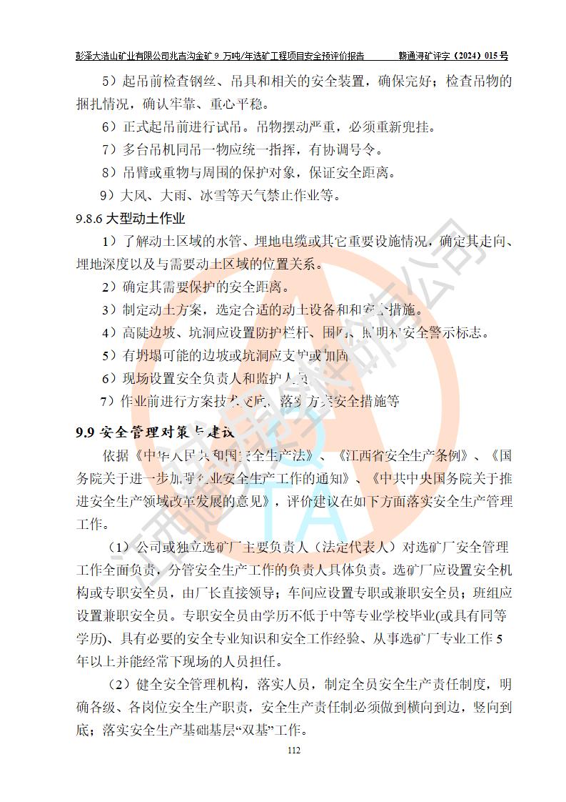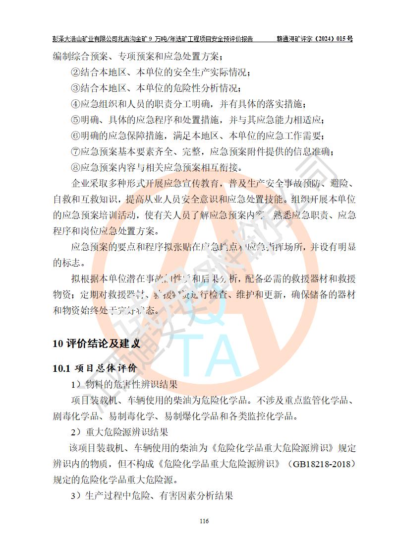 評(píng)價(jià)結(jié)論 | 總體結(jié)論:彭澤大浩山礦業(yè)有限公司兆吉溝金礦9 萬(wàn)噸/年選礦工程項(xiàng)目的廠址、總平面布置和擬設(shè)置的場(chǎng)所及設(shè)備設(shè)施的安全可靠性能達(dá)到**法規(guī)、標(biāo)準(zhǔn)規(guī)定要求;項(xiàng)目存在的危險(xiǎn)有害因素可控,在落實(shí)本評(píng)價(jià)報(bào)告提出的有關(guān)安全對(duì)策措施后,其危險(xiǎn)有害程度能達(dá)到可以接受的程度,項(xiàng)目建設(shè)能夠?qū)崿F(xiàn)安全運(yùn)行的目標(biāo)。 | |||||