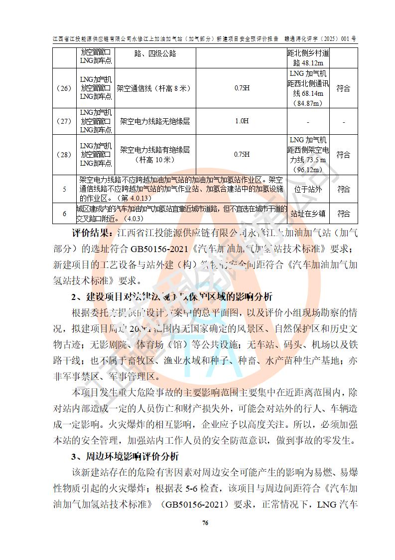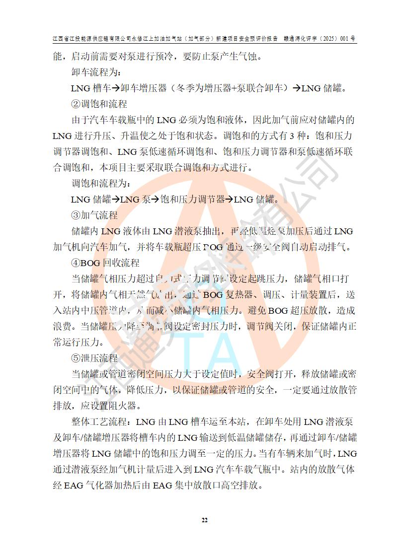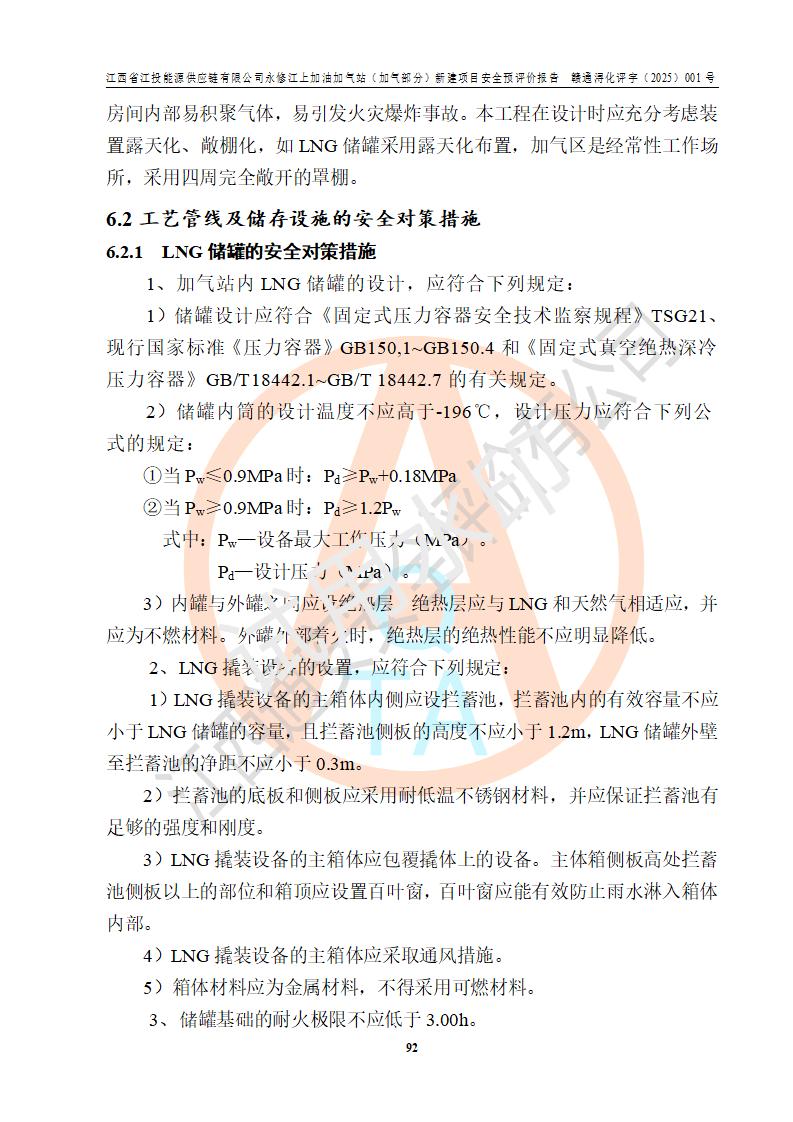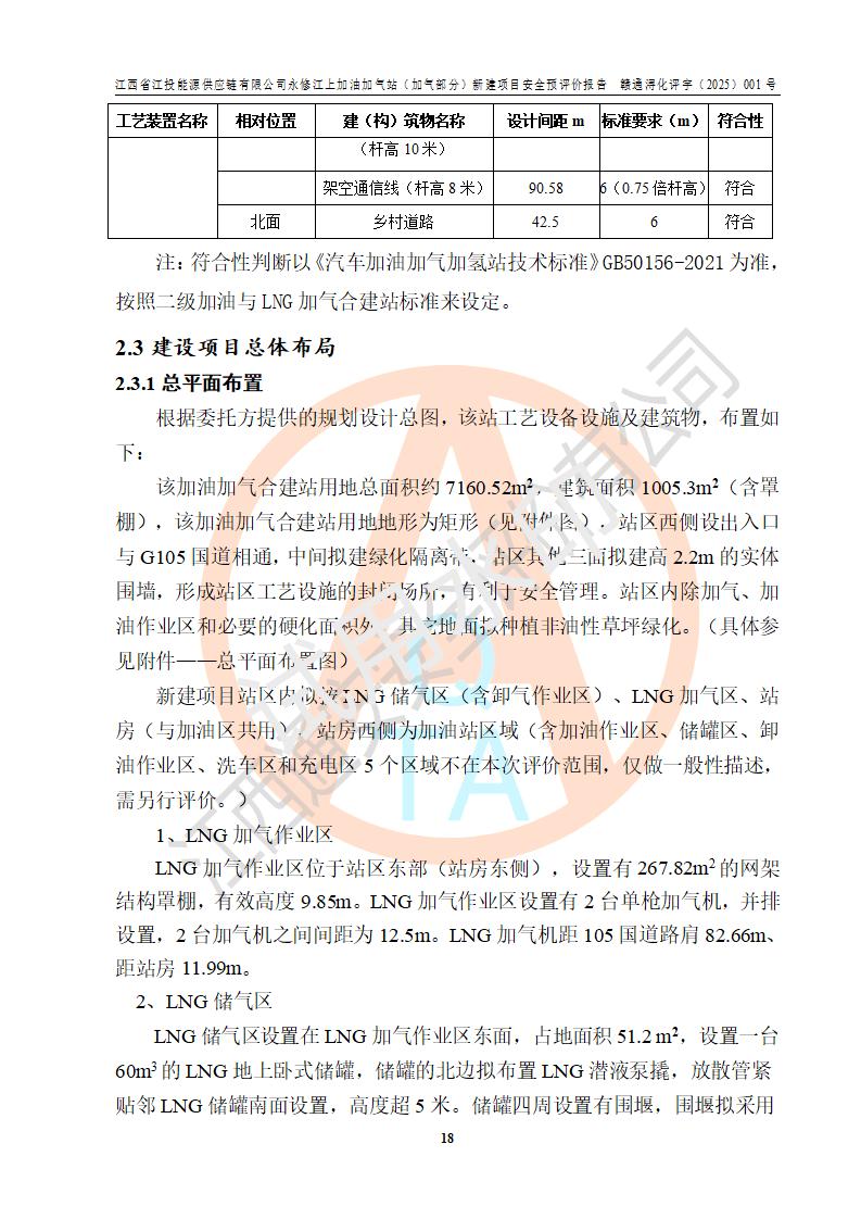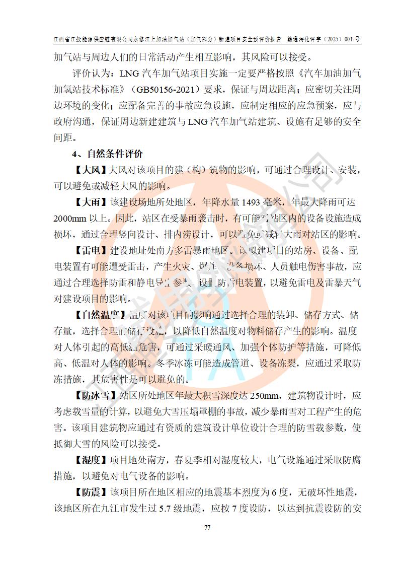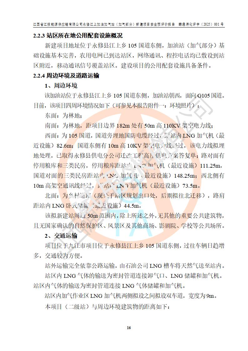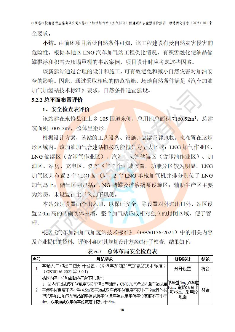 項(xiàng)目簡介 | 江西省江投能源供應(yīng)鏈有限公司是一家專門從事成品油經(jīng)營的有限責(zé)任公司(非自然人投資或控股的法人獨(dú)資),住所在江西省南昌市經(jīng)濟(jì)技術(shù)開發(fā)區(qū)雙港大道中聯(lián)村;現(xiàn)企業(yè)擬投資建設(shè)江西省江投能源供應(yīng)鏈有限公司永修江上加油加氣站新建項(xiàng)目,項(xiàng)目擬建地址在永修縣江上鄉(xiāng)105國道東側(cè),新建項(xiàng)目已取得九江市商務(wù)局網(wǎng)點(diǎn)規(guī)劃確認(rèn)的通知,同時(shí)已取得永修縣行政審批局簽發(fā)的《江西省企業(yè)投資項(xiàng)目備案通知書》,項(xiàng)目統(tǒng)一代碼為2410-360425-04-01-430117,該項(xiàng)目的建設(shè)用地已取得永修縣自然資源局頒發(fā)的不動(dòng)產(chǎn)權(quán)證書:贛(2024)永修縣不動(dòng)產(chǎn)權(quán)第0010955號(hào)。 該項(xiàng)目新建LNG加氣站擬與加油站合并建設(shè),加油站部分不在本次評(píng)價(jià)范圍,僅做一般性描述;該項(xiàng)目站房東側(cè)為加氣站罩棚,西側(cè)為加油站罩棚,加氣站罩棚東側(cè)擬設(shè)置LNG撬裝設(shè)備1臺(tái),加油站罐區(qū)擬設(shè)置在站區(qū)東南角,站區(qū)北側(cè)擬設(shè)置停車位,西部2個(gè)停車位擬設(shè)置1臺(tái)**充電樁(2槍),站區(qū)西北角擬設(shè)置一處預(yù)留自動(dòng)洗車機(jī)位置。 該項(xiàng)目新建加油站總用地面積為7160.52m2,屬于加油與LNG加氣合建站。站內(nèi)擬設(shè)60m3LNG臥式儲(chǔ)罐1臺(tái),2臺(tái)LNG單槍加氣機(jī),LNG低溫泵撬1套(2臺(tái)LNG潛液泵、1臺(tái)增壓器、1臺(tái)EAG氣化器),加氣能力為2×104Nm3/d。站內(nèi)加油部分?jǐn)M設(shè)2臺(tái)雙槍潛油泵加油機(jī)、2臺(tái)4槍潛油泵加油機(jī)及配套的工藝管線,擬設(shè)SF油品儲(chǔ)罐4臺(tái),其中30m3的0#柴油儲(chǔ)罐2臺(tái)、30m3的92#汽油儲(chǔ)罐1臺(tái)、30m3的95#汽油儲(chǔ)罐1臺(tái),油罐總?cè)莘e為120m3(折算成汽油容積為90m3),按現(xiàn)行的《汽車加油加氣加氫站技術(shù)標(biāo)準(zhǔn)》表3.0.16的規(guī)定劃分,該站屬二級(jí)加油與LNG加氣合建站。 依據(jù)《中華人民共和國安全生產(chǎn)法》、《燃?xì)饨?jīng)營許可管理辦法》、《城鎮(zhèn)燃?xì)夤芾項(xiàng)l例》等法律和規(guī)定的要求,新建、改建、擴(kuò)建危險(xiǎn)化學(xué)品儲(chǔ)存裝置和設(shè)施的建設(shè)項(xiàng)目安全條件審查(審批、核準(zhǔn)、備案)前,建設(shè)單位應(yīng)當(dāng)選擇有資質(zhì)的安全評(píng)價(jià)機(jī)構(gòu)對(duì)建設(shè)項(xiàng)目進(jìn)行安全條件評(píng)價(jià),以**工程項(xiàng)目的安全設(shè)施與主體工程同時(shí)設(shè)計(jì)、同時(shí)施工、同時(shí)投入使用,為**工程項(xiàng)目在安全生產(chǎn)及安全管理方面符合**及行業(yè)有關(guān)法律法規(guī)及標(biāo)準(zhǔn),江西省江投能源供應(yīng)鏈有限公司委托江西通安安全評(píng)價(jià)有限公司承擔(dān)江西省江投能源供應(yīng)鏈有限公司永修江上加油加氣站(加氣部分)新建項(xiàng)目的安全預(yù)評(píng)價(jià)。依據(jù)**的相關(guān)法律、法規(guī)及標(biāo)準(zhǔn),該企業(yè)應(yīng)辦理燃?xì)饨?jīng)營許可證。 江西通安安全評(píng)價(jià)有限公司接受委托后,成立了評(píng)價(jià)組,于2025年2月踏勘了建設(shè)地址。根據(jù)相關(guān)法律、法規(guī)和標(biāo)準(zhǔn)的規(guī)定,按照《安全評(píng)價(jià)通則》(AQ8001-2007)、《安全預(yù)評(píng)價(jià)導(dǎo)則》(AQ8002-2007)的要求,在資料收集、現(xiàn)場勘探和類比調(diào)查的基礎(chǔ)上,對(duì)項(xiàng)目的工程技術(shù)資料進(jìn)行了認(rèn)真分析。建設(shè)項(xiàng)目內(nèi)在的危險(xiǎn)、有害因素對(duì)建設(shè)項(xiàng)目周邊單位生產(chǎn)、經(jīng)營活動(dòng)或者居民生活的影響以及建設(shè)項(xiàng)目周邊單位生產(chǎn)、經(jīng)營活動(dòng)或者居民生活對(duì)建設(shè)項(xiàng)目的影響等,經(jīng)過定性分析與定量計(jì)算,編制完成了本建設(shè)項(xiàng)目安全預(yù)評(píng)價(jià)報(bào)告,為相關(guān)部門實(shí)行安全監(jiān)察、為**相關(guān)部門建設(shè)項(xiàng)目設(shè)立安全審查以及為企業(yè)建設(shè)項(xiàng)目實(shí)施“三同時(shí)”提供安全技術(shù)依據(jù)。 本次安全評(píng)價(jià)范圍:江西省江投能源供應(yīng)鏈有限公司永修江上加油加氣站(加氣部分)新建項(xiàng)目的選址、總平面布置、主體裝置和輔助設(shè)施的安全條件,包括經(jīng)營過程中的危險(xiǎn)和危害因素、建設(shè)項(xiàng)目的安全條件以及規(guī)劃設(shè)計(jì)中提出的工藝、設(shè)備設(shè)施的安全可靠性和勞動(dòng)安全管理方面的組織、機(jī)構(gòu)、人員、防護(hù)設(shè)施、作業(yè)環(huán)境及管理制度等。 該項(xiàng)目新建LNG加氣站擬與加油站合并建設(shè),加油站油罐區(qū)、加油區(qū)、充電樁、洗車機(jī)部分不在本次評(píng)價(jià)范圍,僅進(jìn)行加油站對(duì)LNG加氣站的影響進(jìn)行評(píng)價(jià),僅作一般性描述。該新建項(xiàng)目的公用工程、自控系統(tǒng)共用,涉及工程的環(huán)境、消防及職業(yè)衛(wèi)生等問題則應(yīng)執(zhí)行**的有關(guān)規(guī)定及相關(guān)標(biāo)準(zhǔn)。 | ||||||