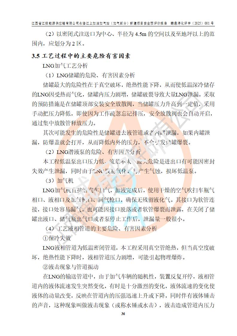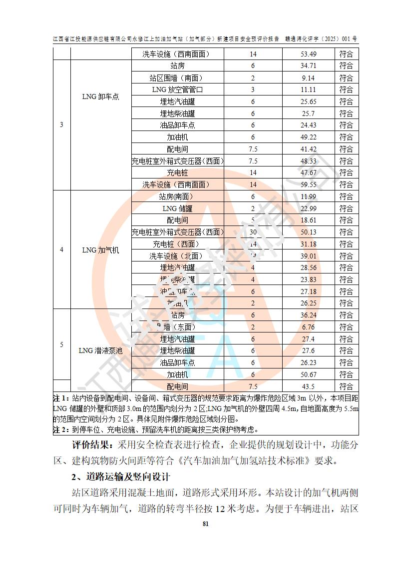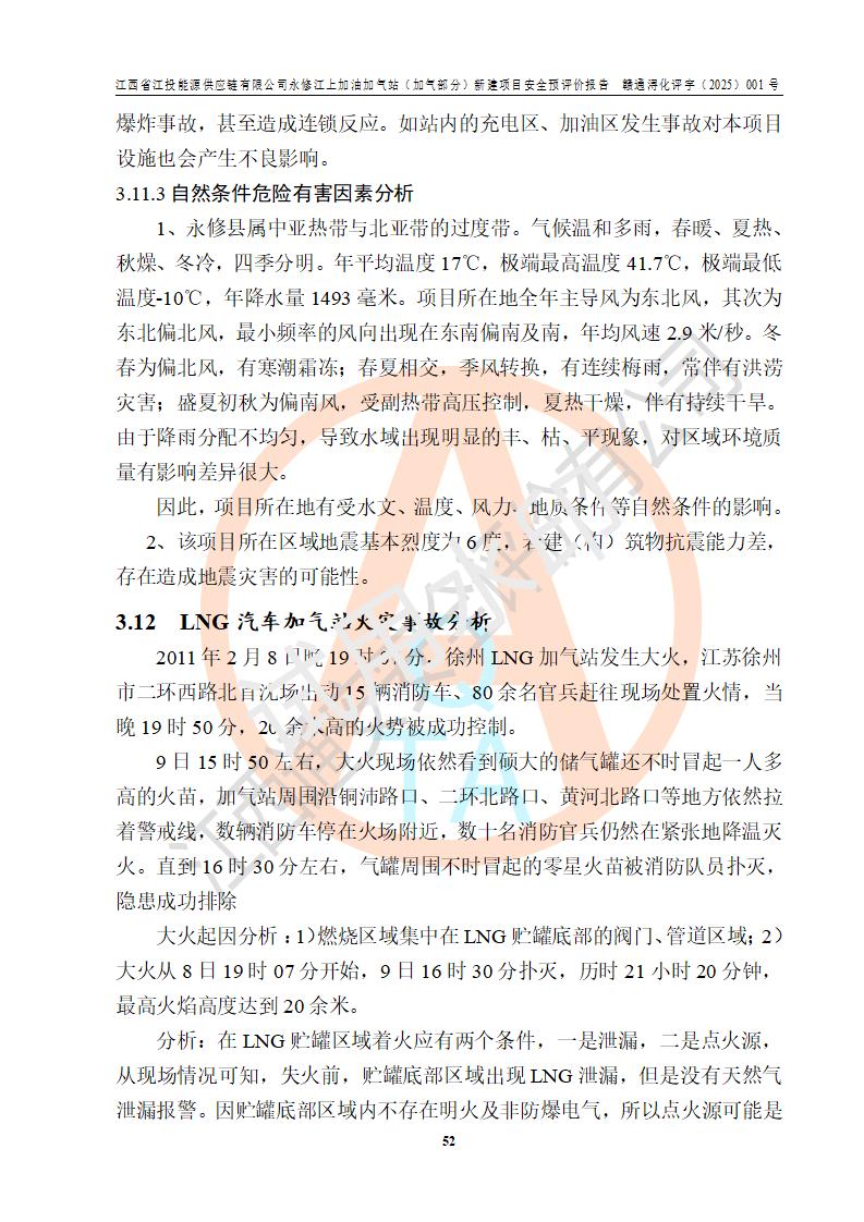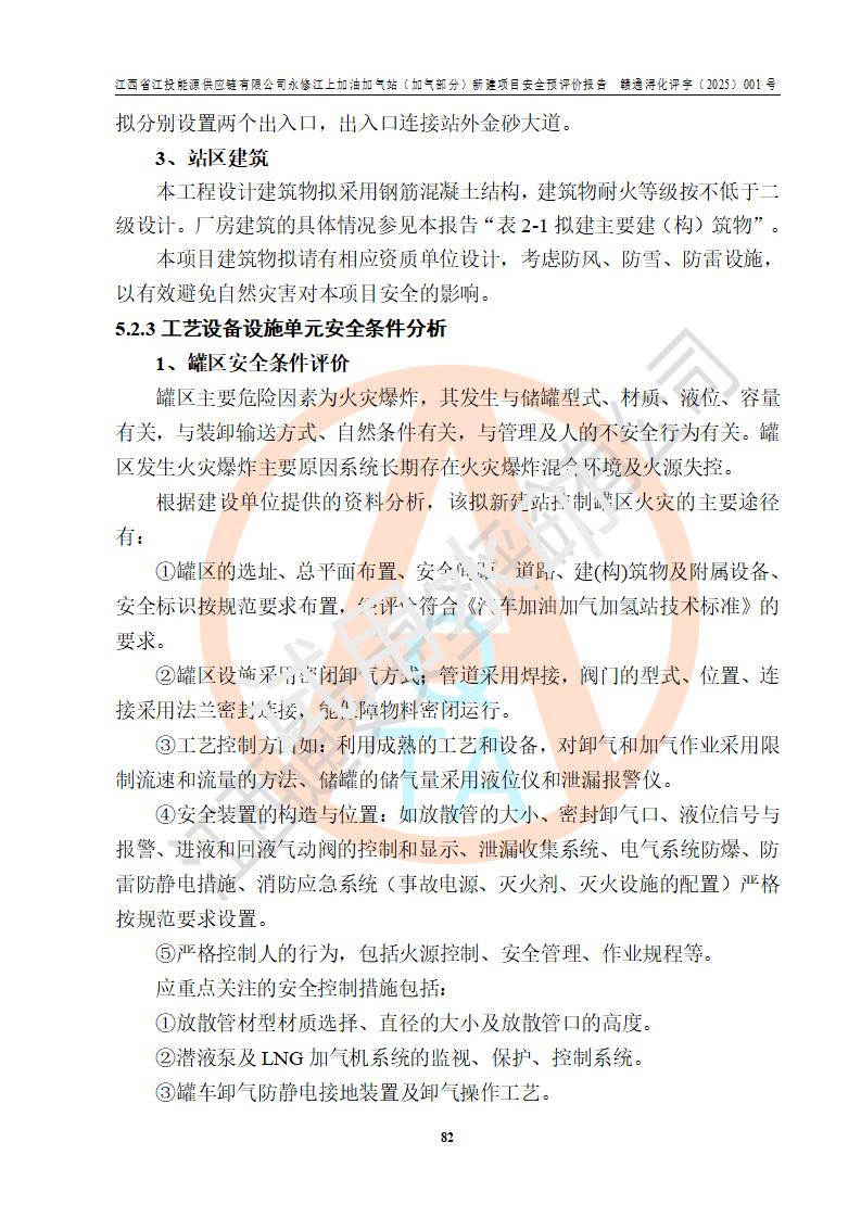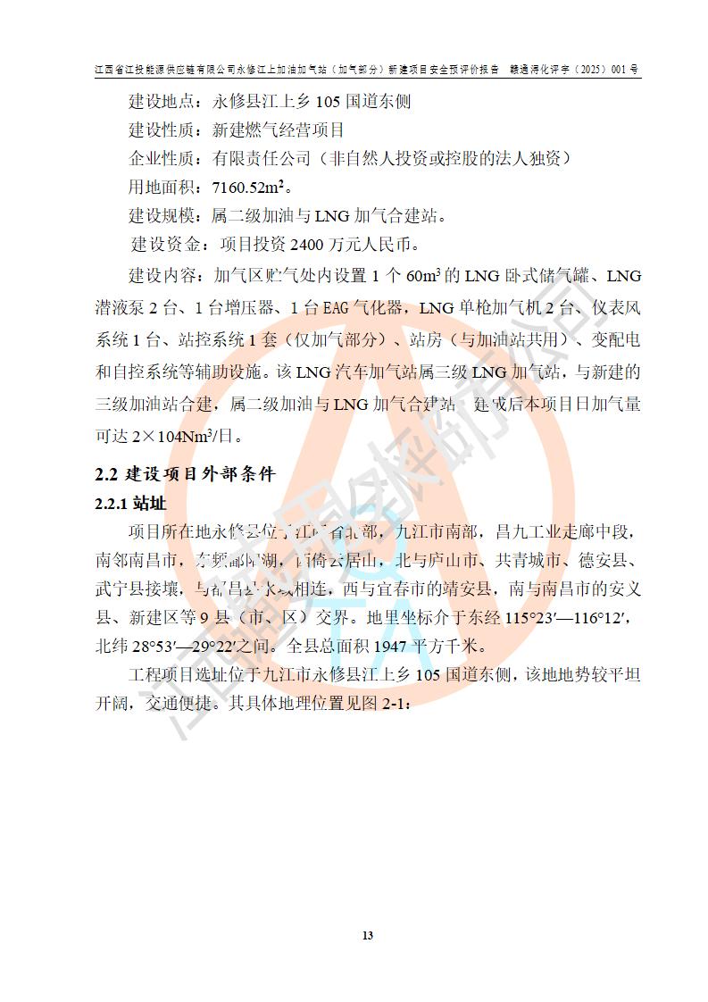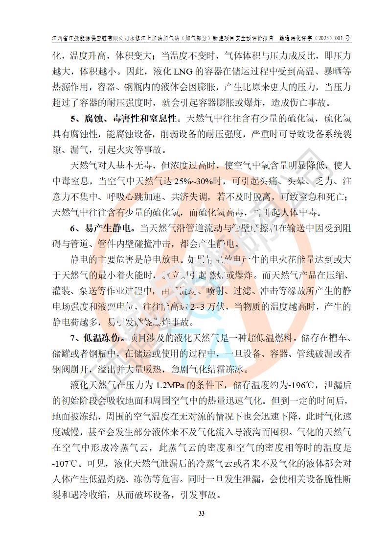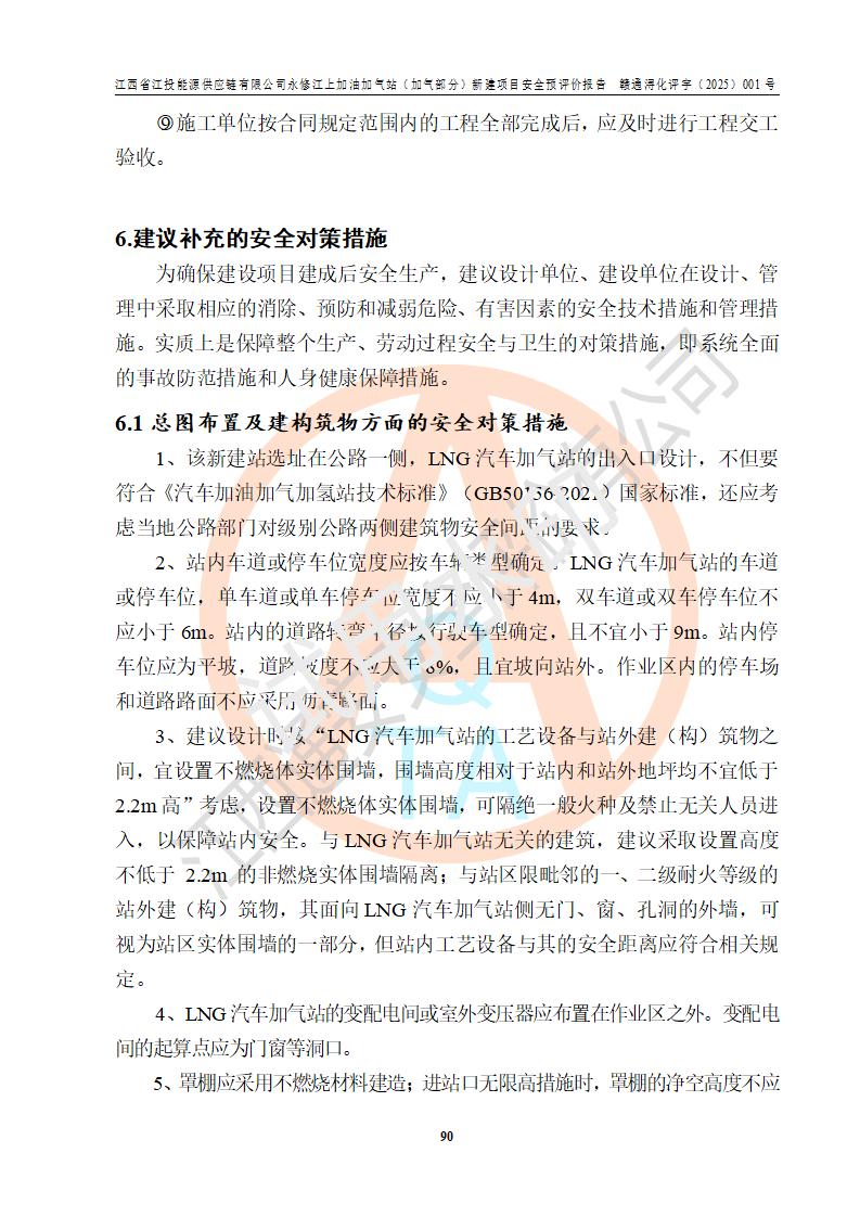 項(xiàng)目簡介 | 江西省江投能源供應(yīng)鏈有限公司是一家專門從事成品油經(jīng)營的有限責(zé)任公司(非自然人投資或控股的法人獨(dú)資),住所在江西省南昌市經(jīng)濟(jì)技術(shù)開發(fā)區(qū)雙港大道中聯(lián)村;現(xiàn)企業(yè)擬投資建設(shè)江西省江投能源供應(yīng)鏈有限公司永修江上加油加氣站新建項(xiàng)目,項(xiàng)目擬建地址在永修縣江上鄉(xiāng)105國道東側(cè),新建項(xiàng)目已取得九江市商務(wù)局網(wǎng)點(diǎn)規(guī)劃確認(rèn)的通知,同時(shí)已取得永修縣行政審批局簽發(fā)的《江西省企業(yè)投資項(xiàng)目備案通知書》,項(xiàng)目統(tǒng)一代碼為2410-360425-04-01-430117,該項(xiàng)目的建設(shè)用地已取得永修縣自然資源局頒發(fā)的不動(dòng)產(chǎn)權(quán)證書:贛(2024)永修縣不動(dòng)產(chǎn)權(quán)第0010955號(hào)。 該項(xiàng)目新建LNG加氣站擬與加油站合并建設(shè),加油站部分不在本次評(píng)價(jià)范圍,僅做一般性描述;該項(xiàng)目站房東側(cè)為加氣站罩棚,西側(cè)為加油站罩棚,加氣站罩棚東側(cè)擬設(shè)置LNG撬裝設(shè)備1臺(tái),加油站罐區(qū)擬設(shè)置在站區(qū)東南角,站區(qū)北側(cè)擬設(shè)置停車位,西部2個(gè)停車位擬設(shè)置1臺(tái)**充電樁(2槍),站區(qū)西北角擬設(shè)置一處預(yù)留自動(dòng)洗車機(jī)位置。 該項(xiàng)目新建加油站總用地面積為7160.52m2,屬于加油與LNG加氣合建站。站內(nèi)擬設(shè)60m3LNG臥式儲(chǔ)罐1臺(tái),2臺(tái)LNG單槍加氣機(jī),LNG低溫泵撬1套(2臺(tái)LNG潛液泵、1臺(tái)增壓器、1臺(tái)EAG氣化器),加氣能力為2×104Nm3/d。站內(nèi)加油部分?jǐn)M設(shè)2臺(tái)雙槍潛油泵加油機(jī)、2臺(tái)4槍潛油泵加油機(jī)及配套的工藝管線,擬設(shè)SF油品儲(chǔ)罐4臺(tái),其中30m3的0#柴油儲(chǔ)罐2臺(tái)、30m3的92#汽油儲(chǔ)罐1臺(tái)、30m3的95#汽油儲(chǔ)罐1臺(tái),油罐總?cè)莘e為120m3(折算成汽油容積為90m3),按現(xiàn)行的《汽車加油加氣加氫站技術(shù)標(biāo)準(zhǔn)》表3.0.16的規(guī)定劃分,該站屬二級(jí)加油與LNG加氣合建站。 依據(jù)《中華人民共和國安全生產(chǎn)法》、《燃?xì)饨?jīng)營許可管理辦法》、《城鎮(zhèn)燃?xì)夤芾項(xiàng)l例》等法律和規(guī)定的要求,新建、改建、擴(kuò)建危險(xiǎn)化學(xué)品儲(chǔ)存裝置和設(shè)施的建設(shè)項(xiàng)目安全條件審查(審批、核準(zhǔn)、備案)前,建設(shè)單位應(yīng)當(dāng)選擇有資質(zhì)的安全評(píng)價(jià)機(jī)構(gòu)對(duì)建設(shè)項(xiàng)目進(jìn)行安全條件評(píng)價(jià),以**工程項(xiàng)目的安全設(shè)施與主體工程同時(shí)設(shè)計(jì)、同時(shí)施工、同時(shí)投入使用,為**工程項(xiàng)目在安全生產(chǎn)及安全管理方面符合**及行業(yè)有關(guān)法律法規(guī)及標(biāo)準(zhǔn),江西省江投能源供應(yīng)鏈有限公司委托江西通安安全評(píng)價(jià)有限公司承擔(dān)江西省江投能源供應(yīng)鏈有限公司永修江上加油加氣站(加氣部分)新建項(xiàng)目的安全預(yù)評(píng)價(jià)。依據(jù)**的相關(guān)法律、法規(guī)及標(biāo)準(zhǔn),該企業(yè)應(yīng)辦理燃?xì)饨?jīng)營許可證。 江西通安安全評(píng)價(jià)有限公司接受委托后,成立了評(píng)價(jià)組,于2025年2月踏勘了建設(shè)地址。根據(jù)相關(guān)法律、法規(guī)和標(biāo)準(zhǔn)的規(guī)定,按照《安全評(píng)價(jià)通則》(AQ8001-2007)、《安全預(yù)評(píng)價(jià)導(dǎo)則》(AQ8002-2007)的要求,在資料收集、現(xiàn)場勘探和類比調(diào)查的基礎(chǔ)上,對(duì)項(xiàng)目的工程技術(shù)資料進(jìn)行了認(rèn)真分析。建設(shè)項(xiàng)目內(nèi)在的危險(xiǎn)、有害因素對(duì)建設(shè)項(xiàng)目周邊單位生產(chǎn)、經(jīng)營活動(dòng)或者居民生活的影響以及建設(shè)項(xiàng)目周邊單位生產(chǎn)、經(jīng)營活動(dòng)或者居民生活對(duì)建設(shè)項(xiàng)目的影響等,經(jīng)過定性分析與定量計(jì)算,編制完成了本建設(shè)項(xiàng)目安全預(yù)評(píng)價(jià)報(bào)告,為相關(guān)部門實(shí)行安全監(jiān)察、為**相關(guān)部門建設(shè)項(xiàng)目設(shè)立安全審查以及為企業(yè)建設(shè)項(xiàng)目實(shí)施“三同時(shí)”提供安全技術(shù)依據(jù)。 本次安全評(píng)價(jià)范圍:江西省江投能源供應(yīng)鏈有限公司永修江上加油加氣站(加氣部分)新建項(xiàng)目的選址、總平面布置、主體裝置和輔助設(shè)施的安全條件,包括經(jīng)營過程中的危險(xiǎn)和危害因素、建設(shè)項(xiàng)目的安全條件以及規(guī)劃設(shè)計(jì)中提出的工藝、設(shè)備設(shè)施的安全可靠性和勞動(dòng)安全管理方面的組織、機(jī)構(gòu)、人員、防護(hù)設(shè)施、作業(yè)環(huán)境及管理制度等。 該項(xiàng)目新建LNG加氣站擬與加油站合并建設(shè),加油站油罐區(qū)、加油區(qū)、充電樁、洗車機(jī)部分不在本次評(píng)價(jià)范圍,僅進(jìn)行加油站對(duì)LNG加氣站的影響進(jìn)行評(píng)價(jià),僅作一般性描述。該新建項(xiàng)目的公用工程、自控系統(tǒng)共用,涉及工程的環(huán)境、消防及職業(yè)衛(wèi)生等問題則應(yīng)執(zhí)行**的有關(guān)規(guī)定及相關(guān)標(biāo)準(zhǔn)。 | ||||||