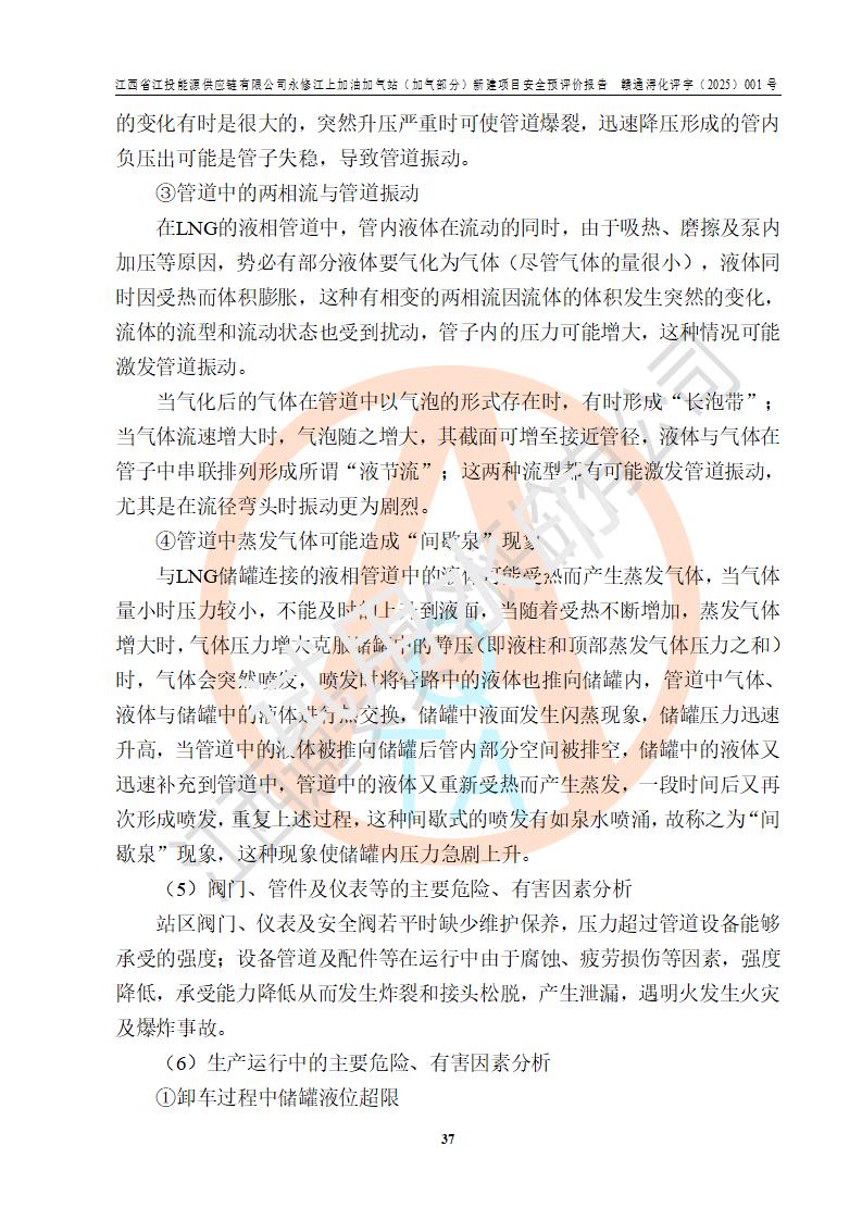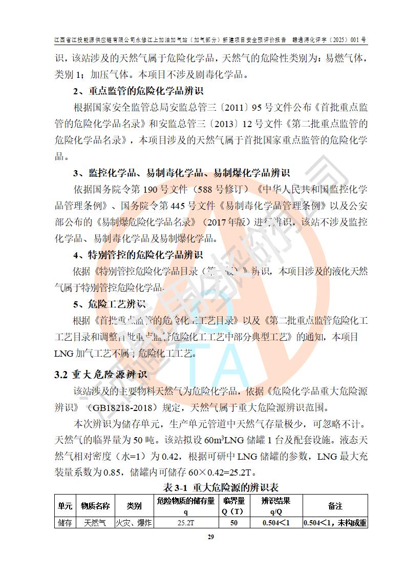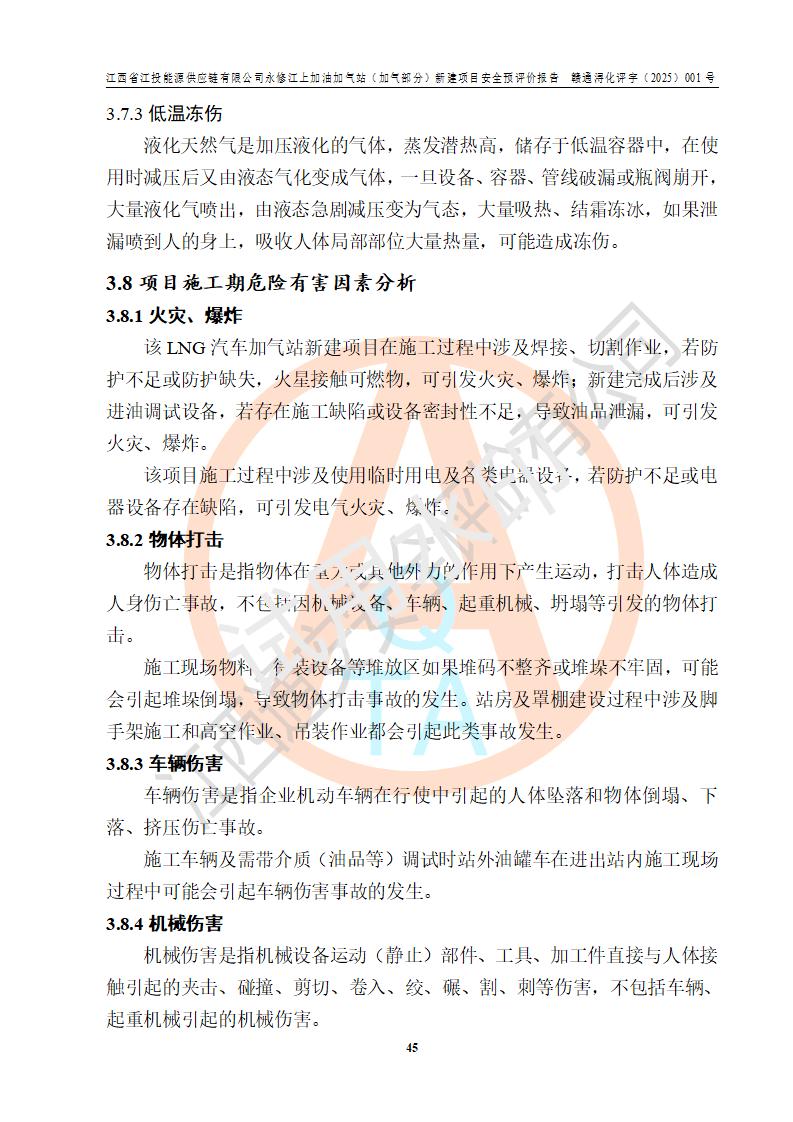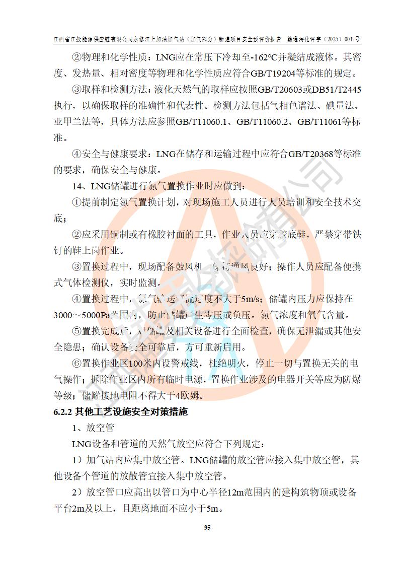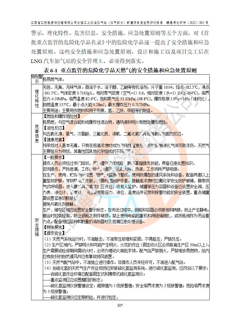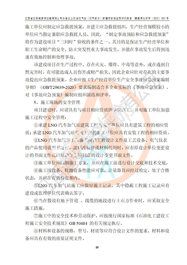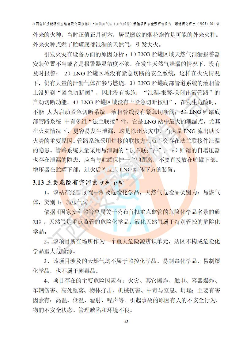 項(xiàng)目簡介 | 江西省江投能源供應(yīng)鏈有限公司是一家專門從事成品油經(jīng)營的有限責(zé)任公司(非自然人投資或控股的法人獨(dú)資),住所在江西省南昌市經(jīng)濟(jì)技術(shù)開發(fā)區(qū)雙港大道中聯(lián)村;現(xiàn)企業(yè)擬投資建設(shè)江西省江投能源供應(yīng)鏈有限公司永修江上加油加氣站新建項(xiàng)目,項(xiàng)目擬建地址在永修縣江上鄉(xiāng)105國道東側(cè),新建項(xiàng)目已取得九江市商務(wù)局網(wǎng)點(diǎn)規(guī)劃確認(rèn)的通知,同時(shí)已取得永修縣行政審批局簽發(fā)的《江西省企業(yè)投資項(xiàng)目備案通知書》,項(xiàng)目統(tǒng)一代碼為2410-360425-04-01-430117,該項(xiàng)目的建設(shè)用地已取得永修縣自然資源局頒發(fā)的不動(dòng)產(chǎn)權(quán)證書:贛(2024)永修縣不動(dòng)產(chǎn)權(quán)第0010955號(hào)。 該項(xiàng)目新建LNG加氣站擬與加油站合并建設(shè),加油站部分不在本次評(píng)價(jià)范圍,僅做一般性描述;該項(xiàng)目站房東側(cè)為加氣站罩棚,西側(cè)為加油站罩棚,加氣站罩棚東側(cè)擬設(shè)置LNG撬裝設(shè)備1臺(tái),加油站罐區(qū)擬設(shè)置在站區(qū)東南角,站區(qū)北側(cè)擬設(shè)置停車位,西部2個(gè)停車位擬設(shè)置1臺(tái)**充電樁(2槍),站區(qū)西北角擬設(shè)置一處預(yù)留自動(dòng)洗車機(jī)位置。 該項(xiàng)目新建加油站總用地面積為7160.52m2,屬于加油與LNG加氣合建站。站內(nèi)擬設(shè)60m3LNG臥式儲(chǔ)罐1臺(tái),2臺(tái)LNG單槍加氣機(jī),LNG低溫泵撬1套(2臺(tái)LNG潛液泵、1臺(tái)增壓器、1臺(tái)EAG氣化器),加氣能力為2×104Nm3/d。站內(nèi)加油部分?jǐn)M設(shè)2臺(tái)雙槍潛油泵加油機(jī)、2臺(tái)4槍潛油泵加油機(jī)及配套的工藝管線,擬設(shè)SF油品儲(chǔ)罐4臺(tái),其中30m3的0#柴油儲(chǔ)罐2臺(tái)、30m3的92#汽油儲(chǔ)罐1臺(tái)、30m3的95#汽油儲(chǔ)罐1臺(tái),油罐總?cè)莘e為120m3(折算成汽油容積為90m3),按現(xiàn)行的《汽車加油加氣加氫站技術(shù)標(biāo)準(zhǔn)》表3.0.16的規(guī)定劃分,該站屬二級(jí)加油與LNG加氣合建站。 依據(jù)《中華人民共和國安全生產(chǎn)法》、《燃?xì)饨?jīng)營許可管理辦法》、《城鎮(zhèn)燃?xì)夤芾項(xiàng)l例》等法律和規(guī)定的要求,新建、改建、擴(kuò)建危險(xiǎn)化學(xué)品儲(chǔ)存裝置和設(shè)施的建設(shè)項(xiàng)目安全條件審查(審批、核準(zhǔn)、備案)前,建設(shè)單位應(yīng)當(dāng)選擇有資質(zhì)的安全評(píng)價(jià)機(jī)構(gòu)對(duì)建設(shè)項(xiàng)目進(jìn)行安全條件評(píng)價(jià),以**工程項(xiàng)目的安全設(shè)施與主體工程同時(shí)設(shè)計(jì)、同時(shí)施工、同時(shí)投入使用,為**工程項(xiàng)目在安全生產(chǎn)及安全管理方面符合**及行業(yè)有關(guān)法律法規(guī)及標(biāo)準(zhǔn),江西省江投能源供應(yīng)鏈有限公司委托江西通安安全評(píng)價(jià)有限公司承擔(dān)江西省江投能源供應(yīng)鏈有限公司永修江上加油加氣站(加氣部分)新建項(xiàng)目的安全預(yù)評(píng)價(jià)。依據(jù)**的相關(guān)法律、法規(guī)及標(biāo)準(zhǔn),該企業(yè)應(yīng)辦理燃?xì)饨?jīng)營許可證。 江西通安安全評(píng)價(jià)有限公司接受委托后,成立了評(píng)價(jià)組,于2025年2月踏勘了建設(shè)地址。根據(jù)相關(guān)法律、法規(guī)和標(biāo)準(zhǔn)的規(guī)定,按照《安全評(píng)價(jià)通則》(AQ8001-2007)、《安全預(yù)評(píng)價(jià)導(dǎo)則》(AQ8002-2007)的要求,在資料收集、現(xiàn)場勘探和類比調(diào)查的基礎(chǔ)上,對(duì)項(xiàng)目的工程技術(shù)資料進(jìn)行了認(rèn)真分析。建設(shè)項(xiàng)目內(nèi)在的危險(xiǎn)、有害因素對(duì)建設(shè)項(xiàng)目周邊單位生產(chǎn)、經(jīng)營活動(dòng)或者居民生活的影響以及建設(shè)項(xiàng)目周邊單位生產(chǎn)、經(jīng)營活動(dòng)或者居民生活對(duì)建設(shè)項(xiàng)目的影響等,經(jīng)過定性分析與定量計(jì)算,編制完成了本建設(shè)項(xiàng)目安全預(yù)評(píng)價(jià)報(bào)告,為相關(guān)部門實(shí)行安全監(jiān)察、為**相關(guān)部門建設(shè)項(xiàng)目設(shè)立安全審查以及為企業(yè)建設(shè)項(xiàng)目實(shí)施“三同時(shí)”提供安全技術(shù)依據(jù)。 本次安全評(píng)價(jià)范圍:江西省江投能源供應(yīng)鏈有限公司永修江上加油加氣站(加氣部分)新建項(xiàng)目的選址、總平面布置、主體裝置和輔助設(shè)施的安全條件,包括經(jīng)營過程中的危險(xiǎn)和危害因素、建設(shè)項(xiàng)目的安全條件以及規(guī)劃設(shè)計(jì)中提出的工藝、設(shè)備設(shè)施的安全可靠性和勞動(dòng)安全管理方面的組織、機(jī)構(gòu)、人員、防護(hù)設(shè)施、作業(yè)環(huán)境及管理制度等。 該項(xiàng)目新建LNG加氣站擬與加油站合并建設(shè),加油站油罐區(qū)、加油區(qū)、充電樁、洗車機(jī)部分不在本次評(píng)價(jià)范圍,僅進(jìn)行加油站對(duì)LNG加氣站的影響進(jìn)行評(píng)價(jià),僅作一般性描述。該新建項(xiàng)目的公用工程、自控系統(tǒng)共用,涉及工程的環(huán)境、消防及職業(yè)衛(wèi)生等問題則應(yīng)執(zhí)行**的有關(guān)規(guī)定及相關(guān)標(biāo)準(zhǔn)。 | ||||||