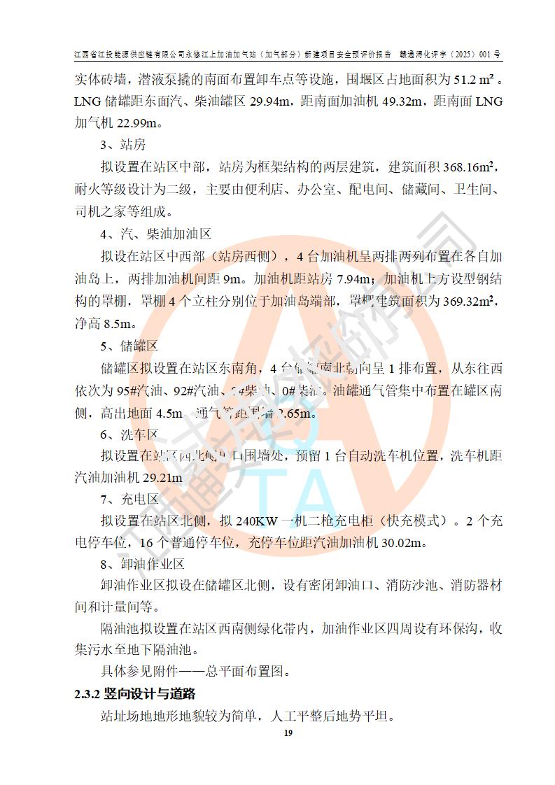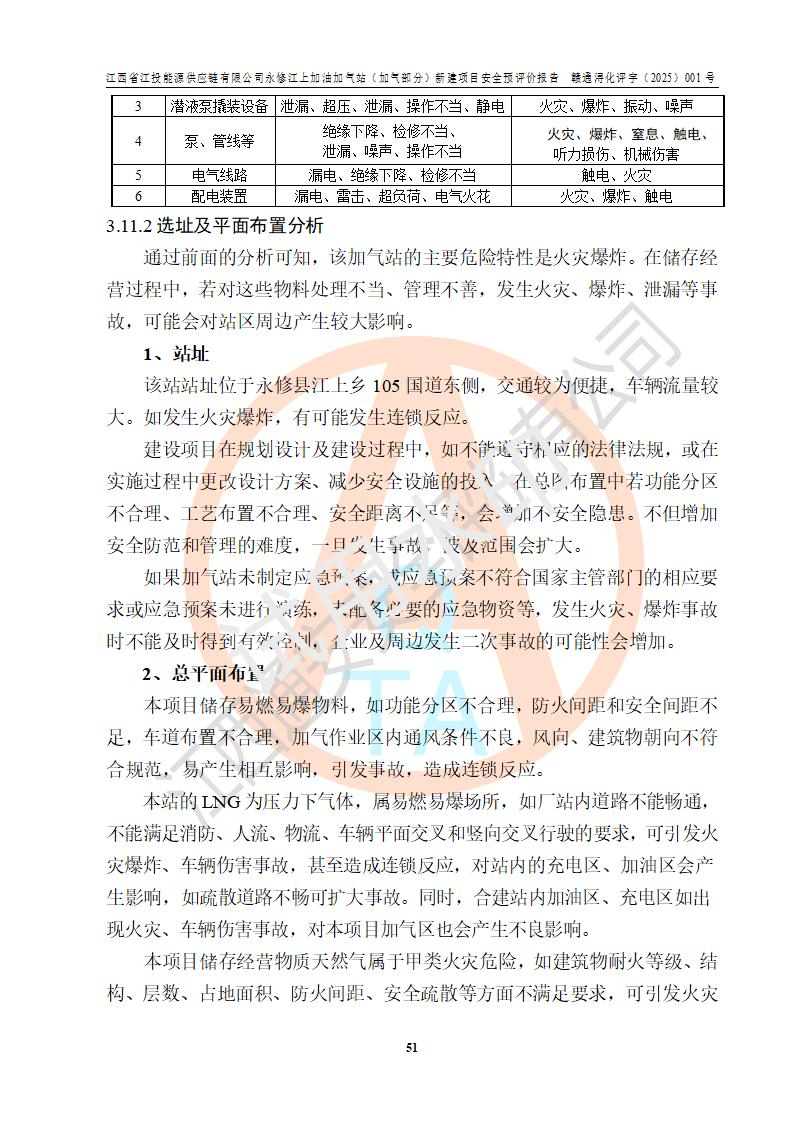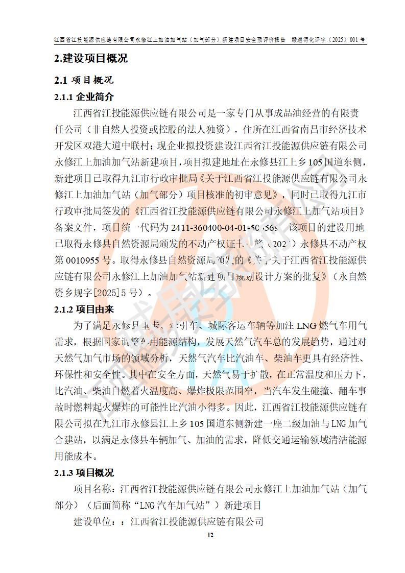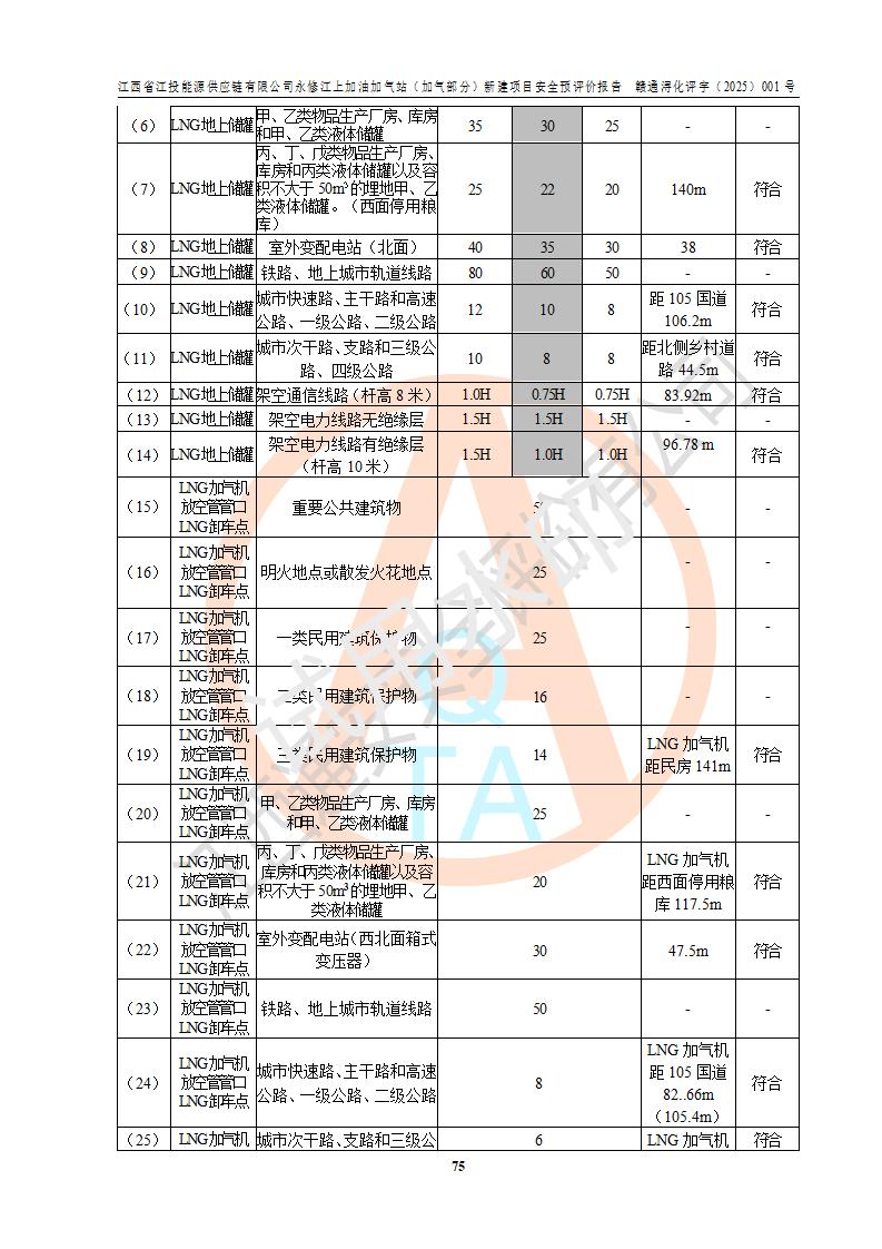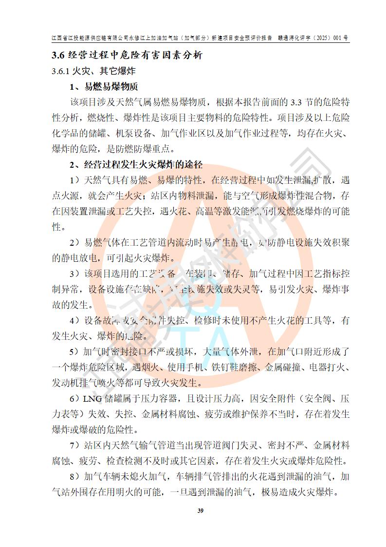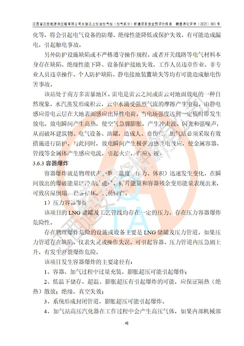 項(xiàng)目簡介 | 江西省江投能源供應(yīng)鏈有限公司是一家專門從事成品油經(jīng)營的有限責(zé)任公司(非自然人投資或控股的法人獨(dú)資),住所在江西省南昌市經(jīng)濟(jì)技術(shù)開發(fā)區(qū)雙港大道中聯(lián)村;現(xiàn)企業(yè)擬投資建設(shè)江西省江投能源供應(yīng)鏈有限公司永修江上加油加氣站新建項(xiàng)目,項(xiàng)目擬建地址在永修縣江上鄉(xiāng)105國道東側(cè),新建項(xiàng)目已取得九江市商務(wù)局網(wǎng)點(diǎn)規(guī)劃確認(rèn)的通知,同時(shí)已取得永修縣行政審批局簽發(fā)的《江西省企業(yè)投資項(xiàng)目備案通知書》,項(xiàng)目統(tǒng)一代碼為2410-360425-04-01-430117,該項(xiàng)目的建設(shè)用地已取得永修縣自然資源局頒發(fā)的不動(dòng)產(chǎn)權(quán)證書:贛(2024)永修縣不動(dòng)產(chǎn)權(quán)第0010955號(hào)。 該項(xiàng)目新建LNG加氣站擬與加油站合并建設(shè),加油站部分不在本次評(píng)價(jià)范圍,僅做一般性描述;該項(xiàng)目站房東側(cè)為加氣站罩棚,西側(cè)為加油站罩棚,加氣站罩棚東側(cè)擬設(shè)置LNG撬裝設(shè)備1臺(tái),加油站罐區(qū)擬設(shè)置在站區(qū)東南角,站區(qū)北側(cè)擬設(shè)置停車位,西部2個(gè)停車位擬設(shè)置1臺(tái)**充電樁(2槍),站區(qū)西北角擬設(shè)置一處預(yù)留自動(dòng)洗車機(jī)位置。 該項(xiàng)目新建加油站總用地面積為7160.52m2,屬于加油與LNG加氣合建站。站內(nèi)擬設(shè)60m3LNG臥式儲(chǔ)罐1臺(tái),2臺(tái)LNG單槍加氣機(jī),LNG低溫泵撬1套(2臺(tái)LNG潛液泵、1臺(tái)增壓器、1臺(tái)EAG氣化器),加氣能力為2×104Nm3/d。站內(nèi)加油部分?jǐn)M設(shè)2臺(tái)雙槍潛油泵加油機(jī)、2臺(tái)4槍潛油泵加油機(jī)及配套的工藝管線,擬設(shè)SF油品儲(chǔ)罐4臺(tái),其中30m3的0#柴油儲(chǔ)罐2臺(tái)、30m3的92#汽油儲(chǔ)罐1臺(tái)、30m3的95#汽油儲(chǔ)罐1臺(tái),油罐總?cè)莘e為120m3(折算成汽油容積為90m3),按現(xiàn)行的《汽車加油加氣加氫站技術(shù)標(biāo)準(zhǔn)》表3.0.16的規(guī)定劃分,該站屬二級(jí)加油與LNG加氣合建站。 依據(jù)《中華人民共和國安全生產(chǎn)法》、《燃?xì)饨?jīng)營許可管理辦法》、《城鎮(zhèn)燃?xì)夤芾項(xiàng)l例》等法律和規(guī)定的要求,新建、改建、擴(kuò)建危險(xiǎn)化學(xué)品儲(chǔ)存裝置和設(shè)施的建設(shè)項(xiàng)目安全條件審查(審批、核準(zhǔn)、備案)前,建設(shè)單位應(yīng)當(dāng)選擇有資質(zhì)的安全評(píng)價(jià)機(jī)構(gòu)對(duì)建設(shè)項(xiàng)目進(jìn)行安全條件評(píng)價(jià),以**工程項(xiàng)目的安全設(shè)施與主體工程同時(shí)設(shè)計(jì)、同時(shí)施工、同時(shí)投入使用,為**工程項(xiàng)目在安全生產(chǎn)及安全管理方面符合**及行業(yè)有關(guān)法律法規(guī)及標(biāo)準(zhǔn),江西省江投能源供應(yīng)鏈有限公司委托江西通安安全評(píng)價(jià)有限公司承擔(dān)江西省江投能源供應(yīng)鏈有限公司永修江上加油加氣站(加氣部分)新建項(xiàng)目的安全預(yù)評(píng)價(jià)。依據(jù)**的相關(guān)法律、法規(guī)及標(biāo)準(zhǔn),該企業(yè)應(yīng)辦理燃?xì)饨?jīng)營許可證。 江西通安安全評(píng)價(jià)有限公司接受委托后,成立了評(píng)價(jià)組,于2025年2月踏勘了建設(shè)地址。根據(jù)相關(guān)法律、法規(guī)和標(biāo)準(zhǔn)的規(guī)定,按照《安全評(píng)價(jià)通則》(AQ8001-2007)、《安全預(yù)評(píng)價(jià)導(dǎo)則》(AQ8002-2007)的要求,在資料收集、現(xiàn)場勘探和類比調(diào)查的基礎(chǔ)上,對(duì)項(xiàng)目的工程技術(shù)資料進(jìn)行了認(rèn)真分析。建設(shè)項(xiàng)目內(nèi)在的危險(xiǎn)、有害因素對(duì)建設(shè)項(xiàng)目周邊單位生產(chǎn)、經(jīng)營活動(dòng)或者居民生活的影響以及建設(shè)項(xiàng)目周邊單位生產(chǎn)、經(jīng)營活動(dòng)或者居民生活對(duì)建設(shè)項(xiàng)目的影響等,經(jīng)過定性分析與定量計(jì)算,編制完成了本建設(shè)項(xiàng)目安全預(yù)評(píng)價(jià)報(bào)告,為相關(guān)部門實(shí)行安全監(jiān)察、為**相關(guān)部門建設(shè)項(xiàng)目設(shè)立安全審查以及為企業(yè)建設(shè)項(xiàng)目實(shí)施“三同時(shí)”提供安全技術(shù)依據(jù)。 本次安全評(píng)價(jià)范圍:江西省江投能源供應(yīng)鏈有限公司永修江上加油加氣站(加氣部分)新建項(xiàng)目的選址、總平面布置、主體裝置和輔助設(shè)施的安全條件,包括經(jīng)營過程中的危險(xiǎn)和危害因素、建設(shè)項(xiàng)目的安全條件以及規(guī)劃設(shè)計(jì)中提出的工藝、設(shè)備設(shè)施的安全可靠性和勞動(dòng)安全管理方面的組織、機(jī)構(gòu)、人員、防護(hù)設(shè)施、作業(yè)環(huán)境及管理制度等。 該項(xiàng)目新建LNG加氣站擬與加油站合并建設(shè),加油站油罐區(qū)、加油區(qū)、充電樁、洗車機(jī)部分不在本次評(píng)價(jià)范圍,僅進(jìn)行加油站對(duì)LNG加氣站的影響進(jìn)行評(píng)價(jià),僅作一般性描述。該新建項(xiàng)目的公用工程、自控系統(tǒng)共用,涉及工程的環(huán)境、消防及職業(yè)衛(wèi)生等問題則應(yīng)執(zhí)行**的有關(guān)規(guī)定及相關(guān)標(biāo)準(zhǔn)。 | ||||||