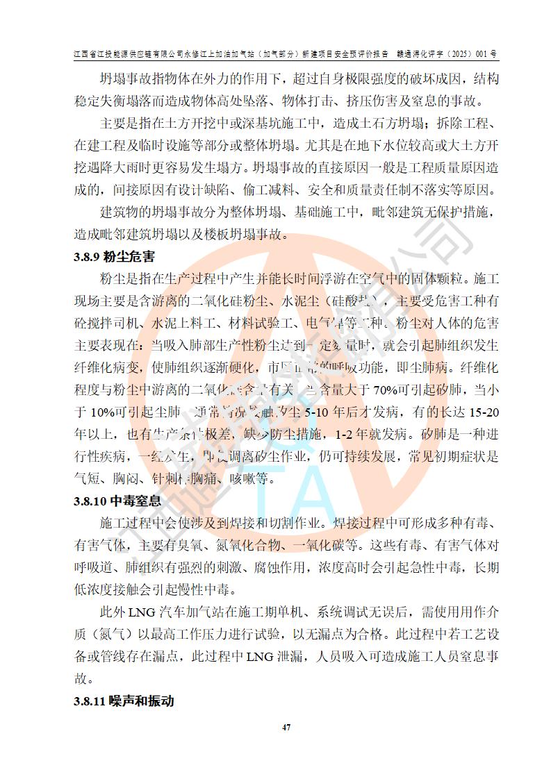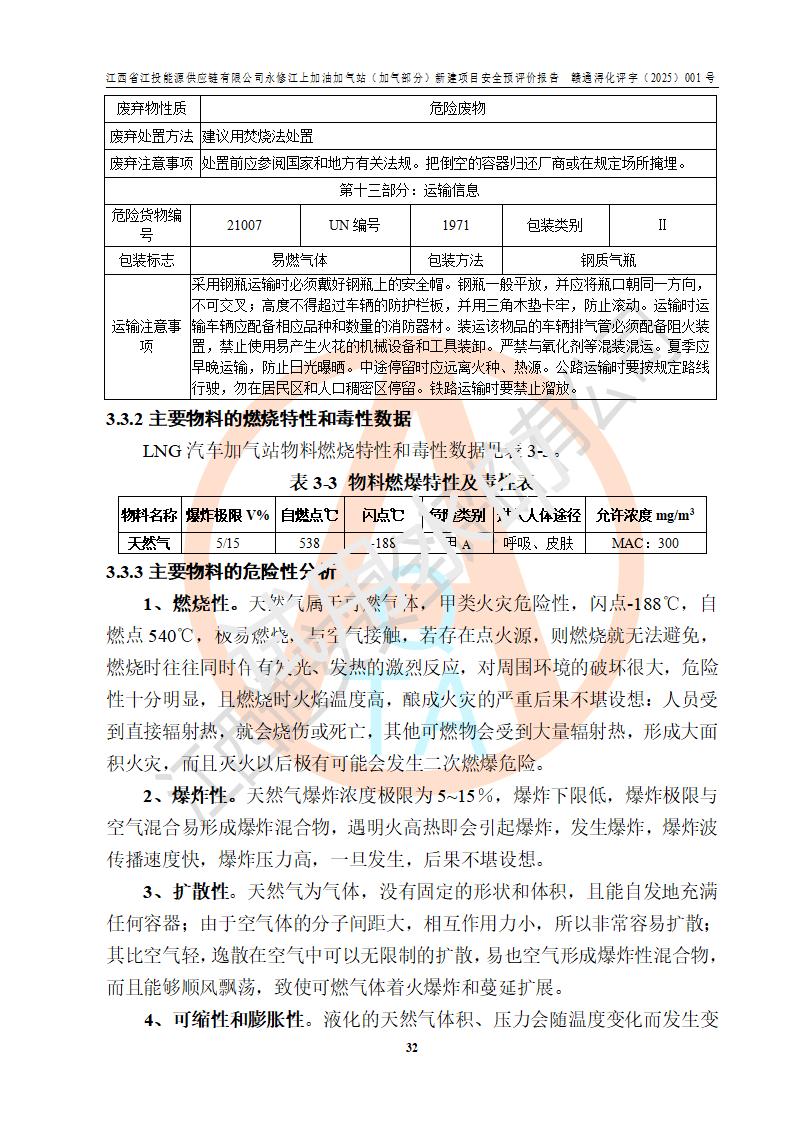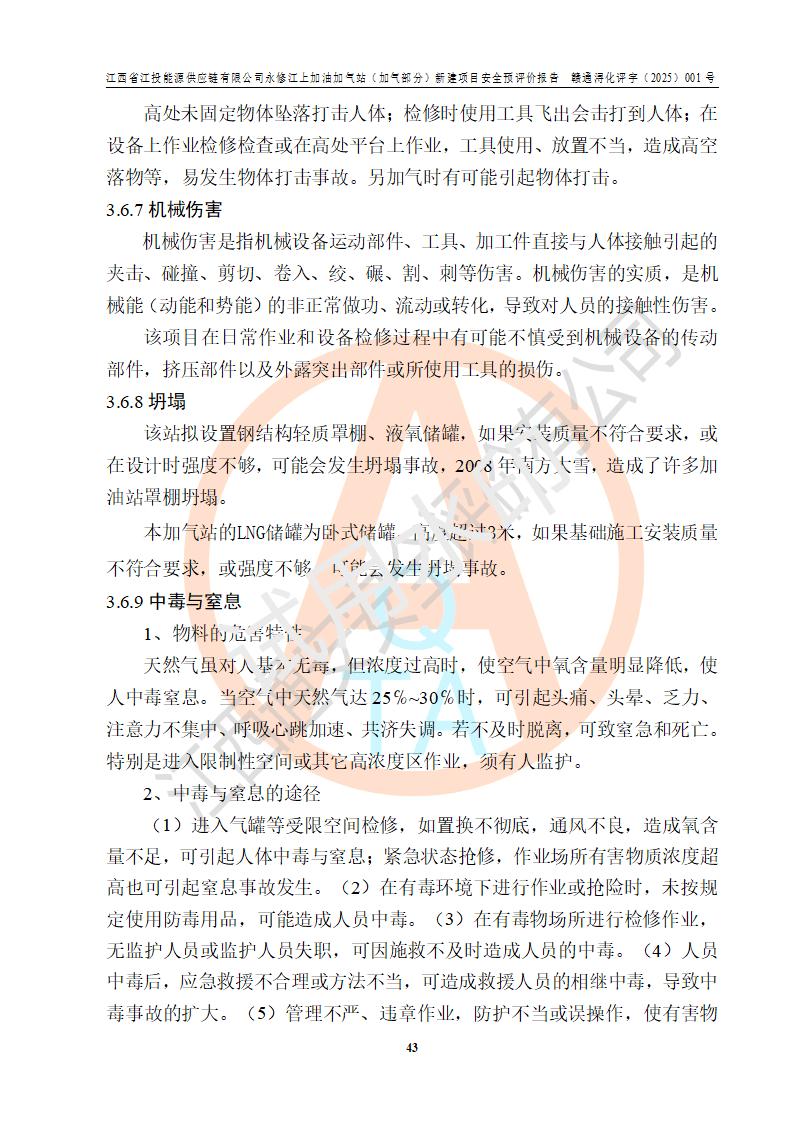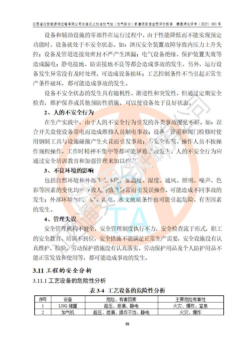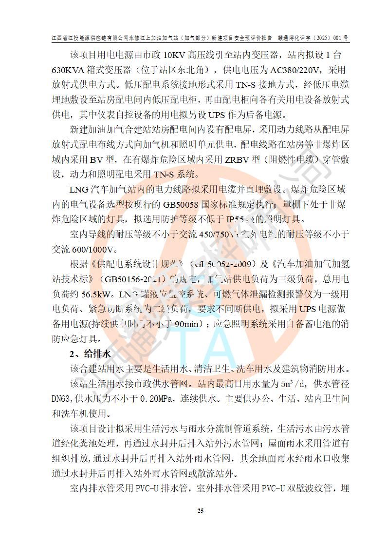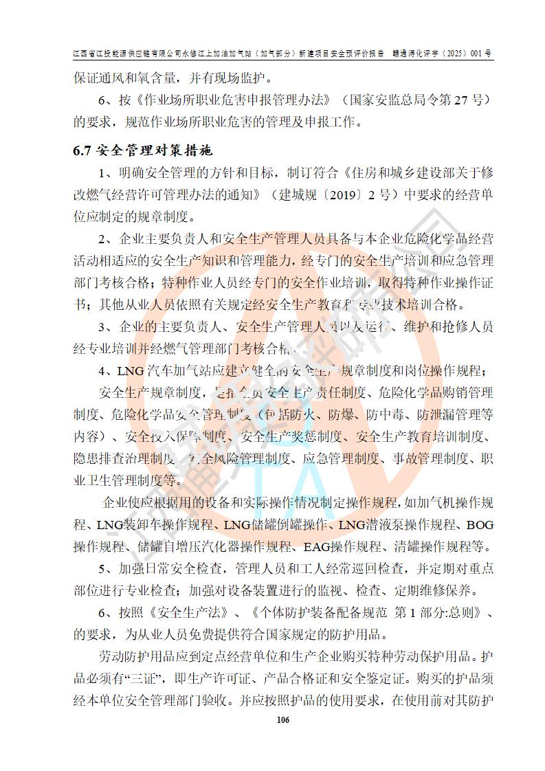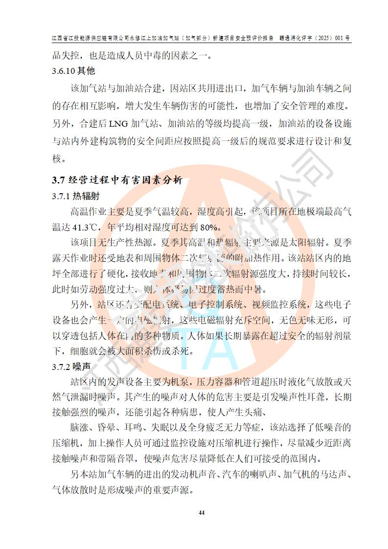 項(xiàng)目簡介 | 江西省江投能源供應(yīng)鏈有限公司是一家專門從事成品油經(jīng)營的有限責(zé)任公司(非自然人投資或控股的法人獨(dú)資),住所在江西省南昌市經(jīng)濟(jì)技術(shù)開發(fā)區(qū)雙港大道中聯(lián)村;現(xiàn)企業(yè)擬投資建設(shè)江西省江投能源供應(yīng)鏈有限公司永修江上加油加氣站新建項(xiàng)目,項(xiàng)目擬建地址在永修縣江上鄉(xiāng)105國道東側(cè),新建項(xiàng)目已取得九江市商務(wù)局網(wǎng)點(diǎn)規(guī)劃確認(rèn)的通知,同時(shí)已取得永修縣行政審批局簽發(fā)的《江西省企業(yè)投資項(xiàng)目備案通知書》,項(xiàng)目統(tǒng)一代碼為2410-360425-04-01-430117,該項(xiàng)目的建設(shè)用地已取得永修縣自然資源局頒發(fā)的不動(dòng)產(chǎn)權(quán)證書:贛(2024)永修縣不動(dòng)產(chǎn)權(quán)第0010955號(hào)。 該項(xiàng)目新建LNG加氣站擬與加油站合并建設(shè),加油站部分不在本次評(píng)價(jià)范圍,僅做一般性描述;該項(xiàng)目站房東側(cè)為加氣站罩棚,西側(cè)為加油站罩棚,加氣站罩棚東側(cè)擬設(shè)置LNG撬裝設(shè)備1臺(tái),加油站罐區(qū)擬設(shè)置在站區(qū)東南角,站區(qū)北側(cè)擬設(shè)置停車位,西部2個(gè)停車位擬設(shè)置1臺(tái)**充電樁(2槍),站區(qū)西北角擬設(shè)置一處預(yù)留自動(dòng)洗車機(jī)位置。 該項(xiàng)目新建加油站總用地面積為7160.52m2,屬于加油與LNG加氣合建站。站內(nèi)擬設(shè)60m3LNG臥式儲(chǔ)罐1臺(tái),2臺(tái)LNG單槍加氣機(jī),LNG低溫泵撬1套(2臺(tái)LNG潛液泵、1臺(tái)增壓器、1臺(tái)EAG氣化器),加氣能力為2×104Nm3/d。站內(nèi)加油部分?jǐn)M設(shè)2臺(tái)雙槍潛油泵加油機(jī)、2臺(tái)4槍潛油泵加油機(jī)及配套的工藝管線,擬設(shè)SF油品儲(chǔ)罐4臺(tái),其中30m3的0#柴油儲(chǔ)罐2臺(tái)、30m3的92#汽油儲(chǔ)罐1臺(tái)、30m3的95#汽油儲(chǔ)罐1臺(tái),油罐總?cè)莘e為120m3(折算成汽油容積為90m3),按現(xiàn)行的《汽車加油加氣加氫站技術(shù)標(biāo)準(zhǔn)》表3.0.16的規(guī)定劃分,該站屬二級(jí)加油與LNG加氣合建站。 依據(jù)《中華人民共和國安全生產(chǎn)法》、《燃?xì)饨?jīng)營許可管理辦法》、《城鎮(zhèn)燃?xì)夤芾項(xiàng)l例》等法律和規(guī)定的要求,新建、改建、擴(kuò)建危險(xiǎn)化學(xué)品儲(chǔ)存裝置和設(shè)施的建設(shè)項(xiàng)目安全條件審查(審批、核準(zhǔn)、備案)前,建設(shè)單位應(yīng)當(dāng)選擇有資質(zhì)的安全評(píng)價(jià)機(jī)構(gòu)對(duì)建設(shè)項(xiàng)目進(jìn)行安全條件評(píng)價(jià),以**工程項(xiàng)目的安全設(shè)施與主體工程同時(shí)設(shè)計(jì)、同時(shí)施工、同時(shí)投入使用,為**工程項(xiàng)目在安全生產(chǎn)及安全管理方面符合**及行業(yè)有關(guān)法律法規(guī)及標(biāo)準(zhǔn),江西省江投能源供應(yīng)鏈有限公司委托江西通安安全評(píng)價(jià)有限公司承擔(dān)江西省江投能源供應(yīng)鏈有限公司永修江上加油加氣站(加氣部分)新建項(xiàng)目的安全預(yù)評(píng)價(jià)。依據(jù)**的相關(guān)法律、法規(guī)及標(biāo)準(zhǔn),該企業(yè)應(yīng)辦理燃?xì)饨?jīng)營許可證。 江西通安安全評(píng)價(jià)有限公司接受委托后,成立了評(píng)價(jià)組,于2025年2月踏勘了建設(shè)地址。根據(jù)相關(guān)法律、法規(guī)和標(biāo)準(zhǔn)的規(guī)定,按照《安全評(píng)價(jià)通則》(AQ8001-2007)、《安全預(yù)評(píng)價(jià)導(dǎo)則》(AQ8002-2007)的要求,在資料收集、現(xiàn)場勘探和類比調(diào)查的基礎(chǔ)上,對(duì)項(xiàng)目的工程技術(shù)資料進(jìn)行了認(rèn)真分析。建設(shè)項(xiàng)目內(nèi)在的危險(xiǎn)、有害因素對(duì)建設(shè)項(xiàng)目周邊單位生產(chǎn)、經(jīng)營活動(dòng)或者居民生活的影響以及建設(shè)項(xiàng)目周邊單位生產(chǎn)、經(jīng)營活動(dòng)或者居民生活對(duì)建設(shè)項(xiàng)目的影響等,經(jīng)過定性分析與定量計(jì)算,編制完成了本建設(shè)項(xiàng)目安全預(yù)評(píng)價(jià)報(bào)告,為相關(guān)部門實(shí)行安全監(jiān)察、為**相關(guān)部門建設(shè)項(xiàng)目設(shè)立安全審查以及為企業(yè)建設(shè)項(xiàng)目實(shí)施“三同時(shí)”提供安全技術(shù)依據(jù)。 本次安全評(píng)價(jià)范圍:江西省江投能源供應(yīng)鏈有限公司永修江上加油加氣站(加氣部分)新建項(xiàng)目的選址、總平面布置、主體裝置和輔助設(shè)施的安全條件,包括經(jīng)營過程中的危險(xiǎn)和危害因素、建設(shè)項(xiàng)目的安全條件以及規(guī)劃設(shè)計(jì)中提出的工藝、設(shè)備設(shè)施的安全可靠性和勞動(dòng)安全管理方面的組織、機(jī)構(gòu)、人員、防護(hù)設(shè)施、作業(yè)環(huán)境及管理制度等。 該項(xiàng)目新建LNG加氣站擬與加油站合并建設(shè),加油站油罐區(qū)、加油區(qū)、充電樁、洗車機(jī)部分不在本次評(píng)價(jià)范圍,僅進(jìn)行加油站對(duì)LNG加氣站的影響進(jìn)行評(píng)價(jià),僅作一般性描述。該新建項(xiàng)目的公用工程、自控系統(tǒng)共用,涉及工程的環(huán)境、消防及職業(yè)衛(wèi)生等問題則應(yīng)執(zhí)行**的有關(guān)規(guī)定及相關(guān)標(biāo)準(zhǔn)。 | ||||||