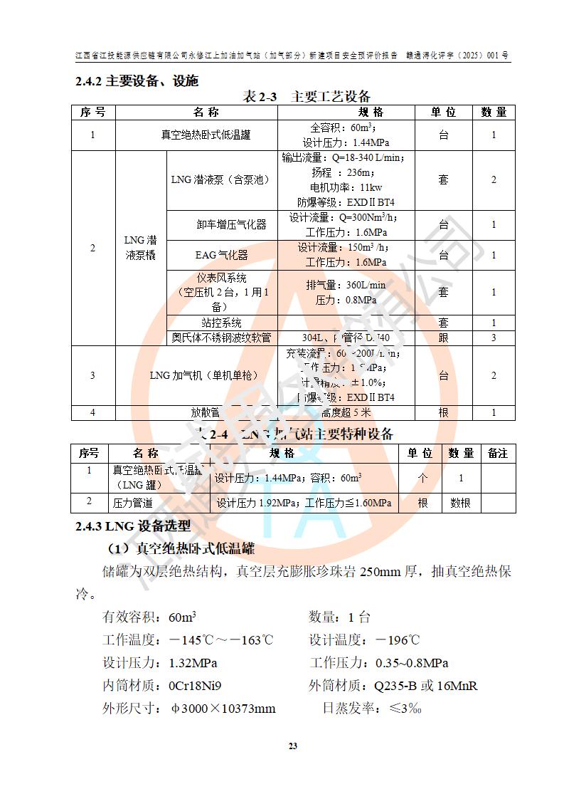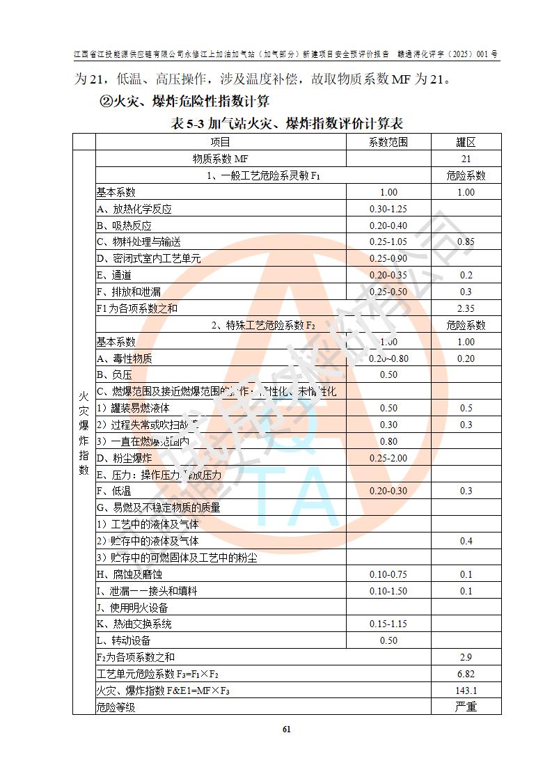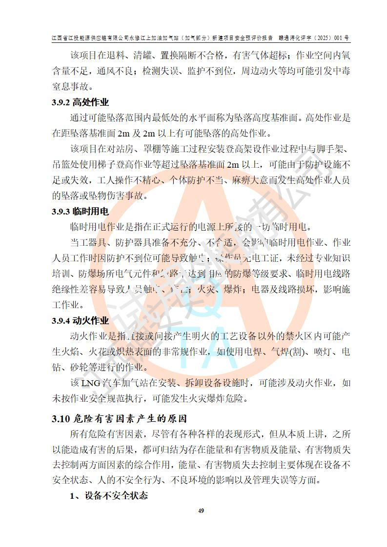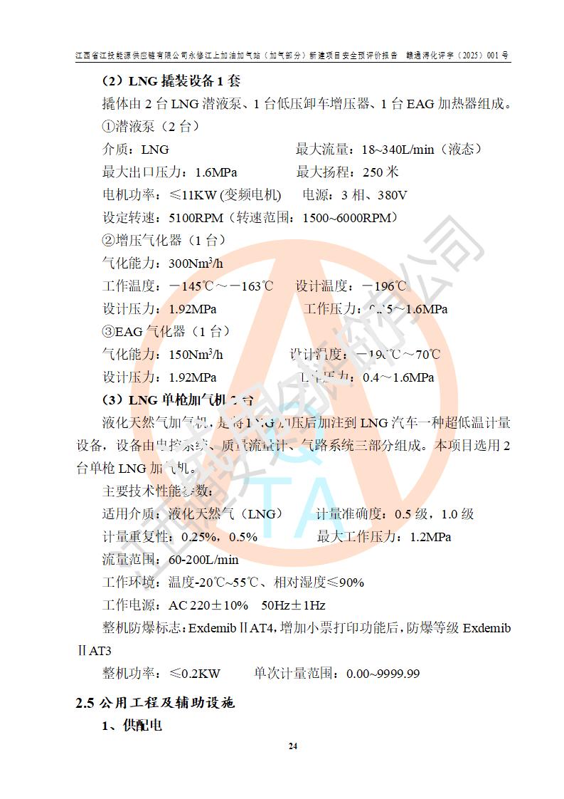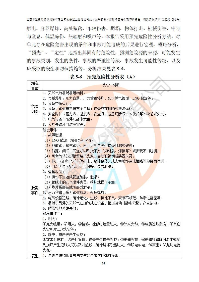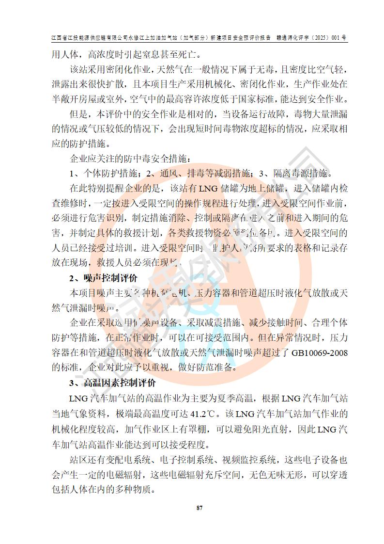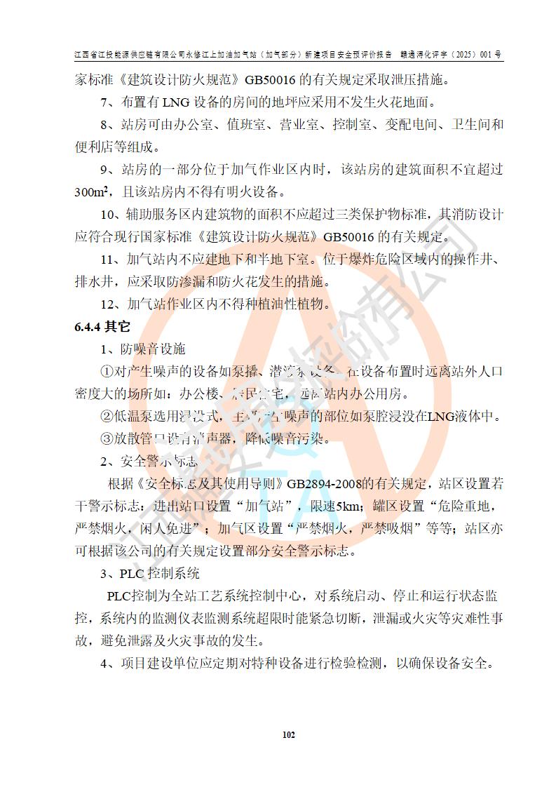 項(xiàng)目簡介 | 江西省江投能源供應(yīng)鏈有限公司是一家專門從事成品油經(jīng)營的有限責(zé)任公司(非自然人投資或控股的法人獨(dú)資),住所在江西省南昌市經(jīng)濟(jì)技術(shù)開發(fā)區(qū)雙港大道中聯(lián)村;現(xiàn)企業(yè)擬投資建設(shè)江西省江投能源供應(yīng)鏈有限公司永修江上加油加氣站新建項(xiàng)目,項(xiàng)目擬建地址在永修縣江上鄉(xiāng)105國道東側(cè),新建項(xiàng)目已取得九江市商務(wù)局網(wǎng)點(diǎn)規(guī)劃確認(rèn)的通知,同時(shí)已取得永修縣行政審批局簽發(fā)的《江西省企業(yè)投資項(xiàng)目備案通知書》,項(xiàng)目統(tǒng)一代碼為2410-360425-04-01-430117,該項(xiàng)目的建設(shè)用地已取得永修縣自然資源局頒發(fā)的不動(dòng)產(chǎn)權(quán)證書:贛(2024)永修縣不動(dòng)產(chǎn)權(quán)第0010955號(hào)。 該項(xiàng)目新建LNG加氣站擬與加油站合并建設(shè),加油站部分不在本次評(píng)價(jià)范圍,僅做一般性描述;該項(xiàng)目站房東側(cè)為加氣站罩棚,西側(cè)為加油站罩棚,加氣站罩棚東側(cè)擬設(shè)置LNG撬裝設(shè)備1臺(tái),加油站罐區(qū)擬設(shè)置在站區(qū)東南角,站區(qū)北側(cè)擬設(shè)置停車位,西部2個(gè)停車位擬設(shè)置1臺(tái)**充電樁(2槍),站區(qū)西北角擬設(shè)置一處預(yù)留自動(dòng)洗車機(jī)位置。 該項(xiàng)目新建加油站總用地面積為7160.52m2,屬于加油與LNG加氣合建站。站內(nèi)擬設(shè)60m3LNG臥式儲(chǔ)罐1臺(tái),2臺(tái)LNG單槍加氣機(jī),LNG低溫泵撬1套(2臺(tái)LNG潛液泵、1臺(tái)增壓器、1臺(tái)EAG氣化器),加氣能力為2×104Nm3/d。站內(nèi)加油部分?jǐn)M設(shè)2臺(tái)雙槍潛油泵加油機(jī)、2臺(tái)4槍潛油泵加油機(jī)及配套的工藝管線,擬設(shè)SF油品儲(chǔ)罐4臺(tái),其中30m3的0#柴油儲(chǔ)罐2臺(tái)、30m3的92#汽油儲(chǔ)罐1臺(tái)、30m3的95#汽油儲(chǔ)罐1臺(tái),油罐總?cè)莘e為120m3(折算成汽油容積為90m3),按現(xiàn)行的《汽車加油加氣加氫站技術(shù)標(biāo)準(zhǔn)》表3.0.16的規(guī)定劃分,該站屬二級(jí)加油與LNG加氣合建站。 依據(jù)《中華人民共和國安全生產(chǎn)法》、《燃?xì)饨?jīng)營許可管理辦法》、《城鎮(zhèn)燃?xì)夤芾項(xiàng)l例》等法律和規(guī)定的要求,新建、改建、擴(kuò)建危險(xiǎn)化學(xué)品儲(chǔ)存裝置和設(shè)施的建設(shè)項(xiàng)目安全條件審查(審批、核準(zhǔn)、備案)前,建設(shè)單位應(yīng)當(dāng)選擇有資質(zhì)的安全評(píng)價(jià)機(jī)構(gòu)對(duì)建設(shè)項(xiàng)目進(jìn)行安全條件評(píng)價(jià),以**工程項(xiàng)目的安全設(shè)施與主體工程同時(shí)設(shè)計(jì)、同時(shí)施工、同時(shí)投入使用,為**工程項(xiàng)目在安全生產(chǎn)及安全管理方面符合**及行業(yè)有關(guān)法律法規(guī)及標(biāo)準(zhǔn),江西省江投能源供應(yīng)鏈有限公司委托江西通安安全評(píng)價(jià)有限公司承擔(dān)江西省江投能源供應(yīng)鏈有限公司永修江上加油加氣站(加氣部分)新建項(xiàng)目的安全預(yù)評(píng)價(jià)。依據(jù)**的相關(guān)法律、法規(guī)及標(biāo)準(zhǔn),該企業(yè)應(yīng)辦理燃?xì)饨?jīng)營許可證。 江西通安安全評(píng)價(jià)有限公司接受委托后,成立了評(píng)價(jià)組,于2025年2月踏勘了建設(shè)地址。根據(jù)相關(guān)法律、法規(guī)和標(biāo)準(zhǔn)的規(guī)定,按照《安全評(píng)價(jià)通則》(AQ8001-2007)、《安全預(yù)評(píng)價(jià)導(dǎo)則》(AQ8002-2007)的要求,在資料收集、現(xiàn)場勘探和類比調(diào)查的基礎(chǔ)上,對(duì)項(xiàng)目的工程技術(shù)資料進(jìn)行了認(rèn)真分析。建設(shè)項(xiàng)目內(nèi)在的危險(xiǎn)、有害因素對(duì)建設(shè)項(xiàng)目周邊單位生產(chǎn)、經(jīng)營活動(dòng)或者居民生活的影響以及建設(shè)項(xiàng)目周邊單位生產(chǎn)、經(jīng)營活動(dòng)或者居民生活對(duì)建設(shè)項(xiàng)目的影響等,經(jīng)過定性分析與定量計(jì)算,編制完成了本建設(shè)項(xiàng)目安全預(yù)評(píng)價(jià)報(bào)告,為相關(guān)部門實(shí)行安全監(jiān)察、為**相關(guān)部門建設(shè)項(xiàng)目設(shè)立安全審查以及為企業(yè)建設(shè)項(xiàng)目實(shí)施“三同時(shí)”提供安全技術(shù)依據(jù)。 本次安全評(píng)價(jià)范圍:江西省江投能源供應(yīng)鏈有限公司永修江上加油加氣站(加氣部分)新建項(xiàng)目的選址、總平面布置、主體裝置和輔助設(shè)施的安全條件,包括經(jīng)營過程中的危險(xiǎn)和危害因素、建設(shè)項(xiàng)目的安全條件以及規(guī)劃設(shè)計(jì)中提出的工藝、設(shè)備設(shè)施的安全可靠性和勞動(dòng)安全管理方面的組織、機(jī)構(gòu)、人員、防護(hù)設(shè)施、作業(yè)環(huán)境及管理制度等。 該項(xiàng)目新建LNG加氣站擬與加油站合并建設(shè),加油站油罐區(qū)、加油區(qū)、充電樁、洗車機(jī)部分不在本次評(píng)價(jià)范圍,僅進(jìn)行加油站對(duì)LNG加氣站的影響進(jìn)行評(píng)價(jià),僅作一般性描述。該新建項(xiàng)目的公用工程、自控系統(tǒng)共用,涉及工程的環(huán)境、消防及職業(yè)衛(wèi)生等問題則應(yīng)執(zhí)行**的有關(guān)規(guī)定及相關(guān)標(biāo)準(zhǔn)。 | ||||||