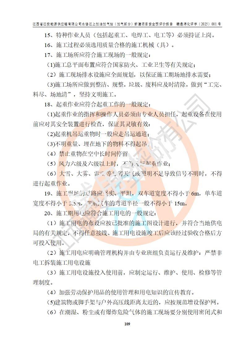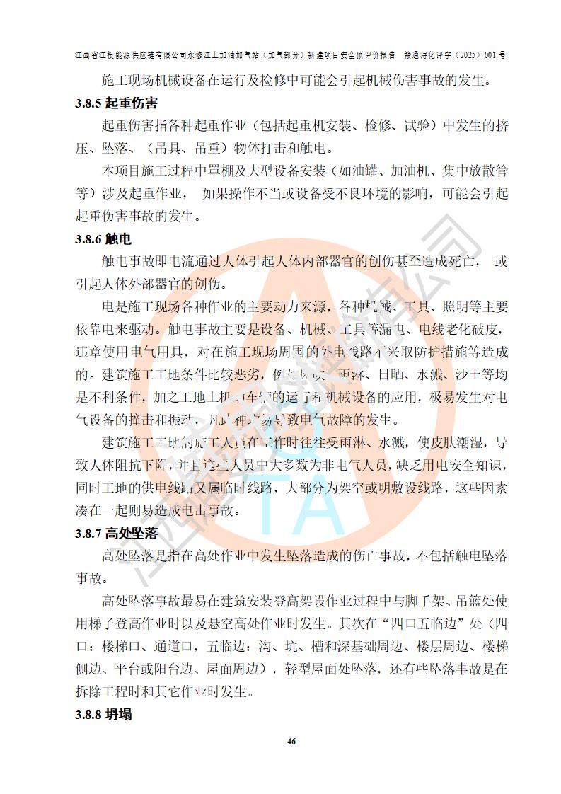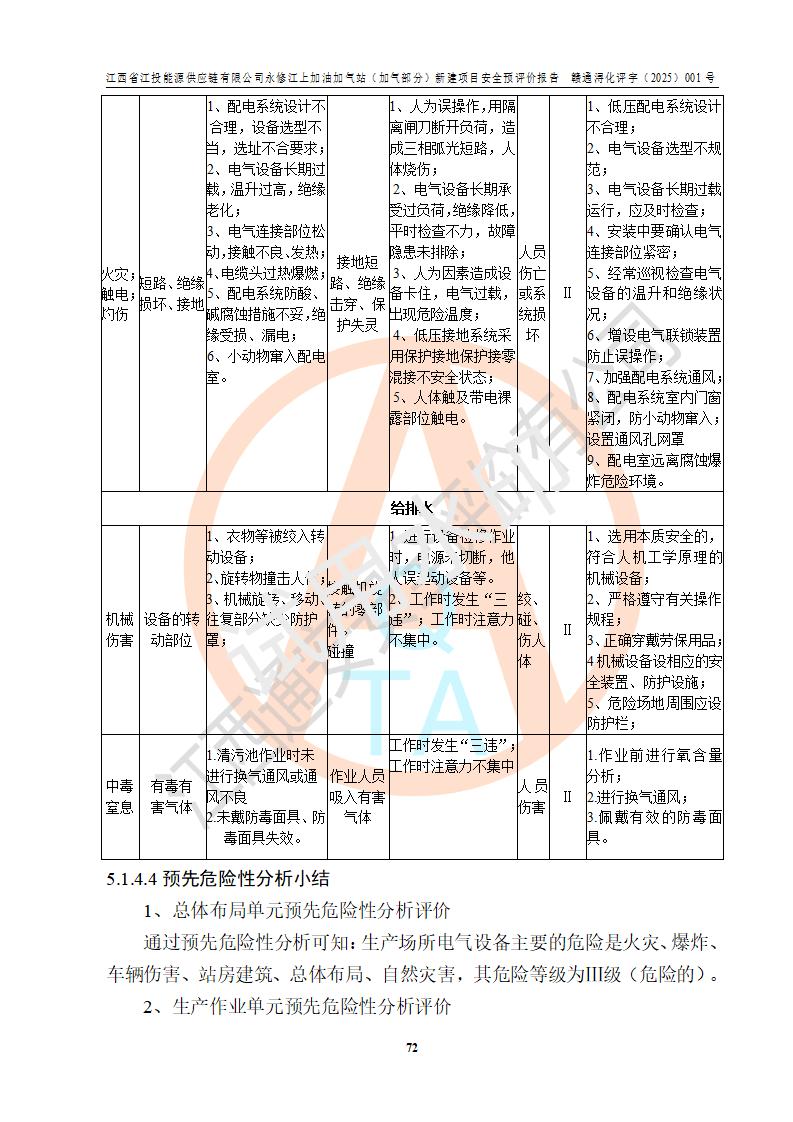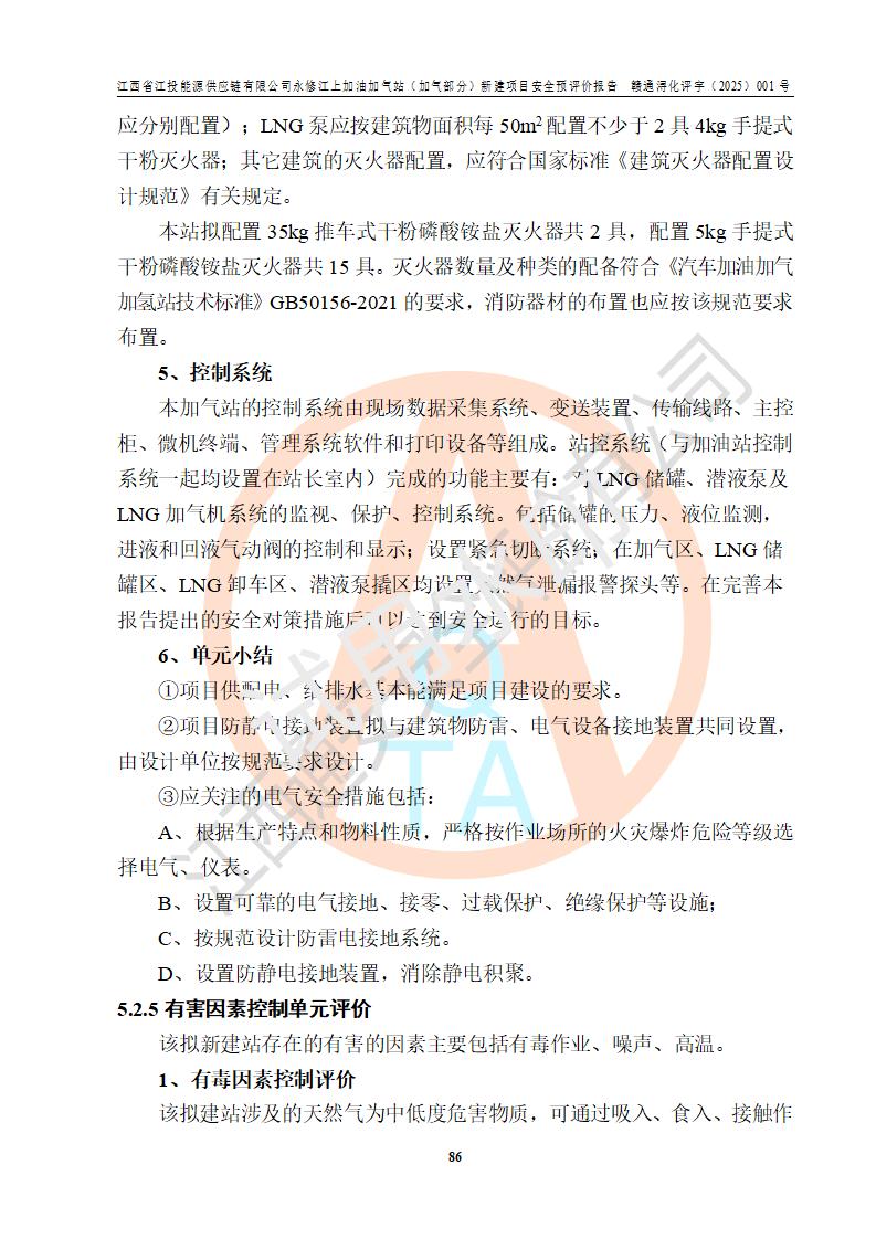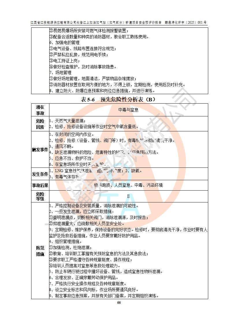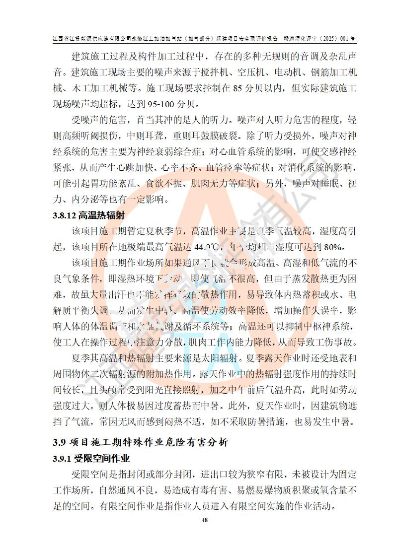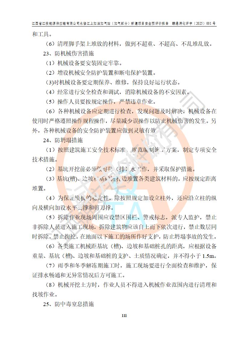 項(xiàng)目簡介 | 江西省江投能源供應(yīng)鏈有限公司是一家專門從事成品油經(jīng)營的有限責(zé)任公司(非自然人投資或控股的法人獨(dú)資),住所在江西省南昌市經(jīng)濟(jì)技術(shù)開發(fā)區(qū)雙港大道中聯(lián)村;現(xiàn)企業(yè)擬投資建設(shè)江西省江投能源供應(yīng)鏈有限公司永修江上加油加氣站新建項(xiàng)目,項(xiàng)目擬建地址在永修縣江上鄉(xiāng)105國道東側(cè),新建項(xiàng)目已取得九江市商務(wù)局網(wǎng)點(diǎn)規(guī)劃確認(rèn)的通知,同時(shí)已取得永修縣行政審批局簽發(fā)的《江西省企業(yè)投資項(xiàng)目備案通知書》,項(xiàng)目統(tǒng)一代碼為2410-360425-04-01-430117,該項(xiàng)目的建設(shè)用地已取得永修縣自然資源局頒發(fā)的不動(dòng)產(chǎn)權(quán)證書:贛(2024)永修縣不動(dòng)產(chǎn)權(quán)第0010955號(hào)。 該項(xiàng)目新建LNG加氣站擬與加油站合并建設(shè),加油站部分不在本次評(píng)價(jià)范圍,僅做一般性描述;該項(xiàng)目站房東側(cè)為加氣站罩棚,西側(cè)為加油站罩棚,加氣站罩棚東側(cè)擬設(shè)置LNG撬裝設(shè)備1臺(tái),加油站罐區(qū)擬設(shè)置在站區(qū)東南角,站區(qū)北側(cè)擬設(shè)置停車位,西部2個(gè)停車位擬設(shè)置1臺(tái)**充電樁(2槍),站區(qū)西北角擬設(shè)置一處預(yù)留自動(dòng)洗車機(jī)位置。 該項(xiàng)目新建加油站總用地面積為7160.52m2,屬于加油與LNG加氣合建站。站內(nèi)擬設(shè)60m3LNG臥式儲(chǔ)罐1臺(tái),2臺(tái)LNG單槍加氣機(jī),LNG低溫泵撬1套(2臺(tái)LNG潛液泵、1臺(tái)增壓器、1臺(tái)EAG氣化器),加氣能力為2×104Nm3/d。站內(nèi)加油部分?jǐn)M設(shè)2臺(tái)雙槍潛油泵加油機(jī)、2臺(tái)4槍潛油泵加油機(jī)及配套的工藝管線,擬設(shè)SF油品儲(chǔ)罐4臺(tái),其中30m3的0#柴油儲(chǔ)罐2臺(tái)、30m3的92#汽油儲(chǔ)罐1臺(tái)、30m3的95#汽油儲(chǔ)罐1臺(tái),油罐總?cè)莘e為120m3(折算成汽油容積為90m3),按現(xiàn)行的《汽車加油加氣加氫站技術(shù)標(biāo)準(zhǔn)》表3.0.16的規(guī)定劃分,該站屬二級(jí)加油與LNG加氣合建站。 依據(jù)《中華人民共和國安全生產(chǎn)法》、《燃?xì)饨?jīng)營許可管理辦法》、《城鎮(zhèn)燃?xì)夤芾項(xiàng)l例》等法律和規(guī)定的要求,新建、改建、擴(kuò)建危險(xiǎn)化學(xué)品儲(chǔ)存裝置和設(shè)施的建設(shè)項(xiàng)目安全條件審查(審批、核準(zhǔn)、備案)前,建設(shè)單位應(yīng)當(dāng)選擇有資質(zhì)的安全評(píng)價(jià)機(jī)構(gòu)對(duì)建設(shè)項(xiàng)目進(jìn)行安全條件評(píng)價(jià),以**工程項(xiàng)目的安全設(shè)施與主體工程同時(shí)設(shè)計(jì)、同時(shí)施工、同時(shí)投入使用,為**工程項(xiàng)目在安全生產(chǎn)及安全管理方面符合**及行業(yè)有關(guān)法律法規(guī)及標(biāo)準(zhǔn),江西省江投能源供應(yīng)鏈有限公司委托江西通安安全評(píng)價(jià)有限公司承擔(dān)江西省江投能源供應(yīng)鏈有限公司永修江上加油加氣站(加氣部分)新建項(xiàng)目的安全預(yù)評(píng)價(jià)。依據(jù)**的相關(guān)法律、法規(guī)及標(biāo)準(zhǔn),該企業(yè)應(yīng)辦理燃?xì)饨?jīng)營許可證。 江西通安安全評(píng)價(jià)有限公司接受委托后,成立了評(píng)價(jià)組,于2025年2月踏勘了建設(shè)地址。根據(jù)相關(guān)法律、法規(guī)和標(biāo)準(zhǔn)的規(guī)定,按照《安全評(píng)價(jià)通則》(AQ8001-2007)、《安全預(yù)評(píng)價(jià)導(dǎo)則》(AQ8002-2007)的要求,在資料收集、現(xiàn)場勘探和類比調(diào)查的基礎(chǔ)上,對(duì)項(xiàng)目的工程技術(shù)資料進(jìn)行了認(rèn)真分析。建設(shè)項(xiàng)目內(nèi)在的危險(xiǎn)、有害因素對(duì)建設(shè)項(xiàng)目周邊單位生產(chǎn)、經(jīng)營活動(dòng)或者居民生活的影響以及建設(shè)項(xiàng)目周邊單位生產(chǎn)、經(jīng)營活動(dòng)或者居民生活對(duì)建設(shè)項(xiàng)目的影響等,經(jīng)過定性分析與定量計(jì)算,編制完成了本建設(shè)項(xiàng)目安全預(yù)評(píng)價(jià)報(bào)告,為相關(guān)部門實(shí)行安全監(jiān)察、為**相關(guān)部門建設(shè)項(xiàng)目設(shè)立安全審查以及為企業(yè)建設(shè)項(xiàng)目實(shí)施“三同時(shí)”提供安全技術(shù)依據(jù)。 本次安全評(píng)價(jià)范圍:江西省江投能源供應(yīng)鏈有限公司永修江上加油加氣站(加氣部分)新建項(xiàng)目的選址、總平面布置、主體裝置和輔助設(shè)施的安全條件,包括經(jīng)營過程中的危險(xiǎn)和危害因素、建設(shè)項(xiàng)目的安全條件以及規(guī)劃設(shè)計(jì)中提出的工藝、設(shè)備設(shè)施的安全可靠性和勞動(dòng)安全管理方面的組織、機(jī)構(gòu)、人員、防護(hù)設(shè)施、作業(yè)環(huán)境及管理制度等。 該項(xiàng)目新建LNG加氣站擬與加油站合并建設(shè),加油站油罐區(qū)、加油區(qū)、充電樁、洗車機(jī)部分不在本次評(píng)價(jià)范圍,僅進(jìn)行加油站對(duì)LNG加氣站的影響進(jìn)行評(píng)價(jià),僅作一般性描述。該新建項(xiàng)目的公用工程、自控系統(tǒng)共用,涉及工程的環(huán)境、消防及職業(yè)衛(wèi)生等問題則應(yīng)執(zhí)行**的有關(guān)規(guī)定及相關(guān)標(biāo)準(zhǔn)。 | ||||||