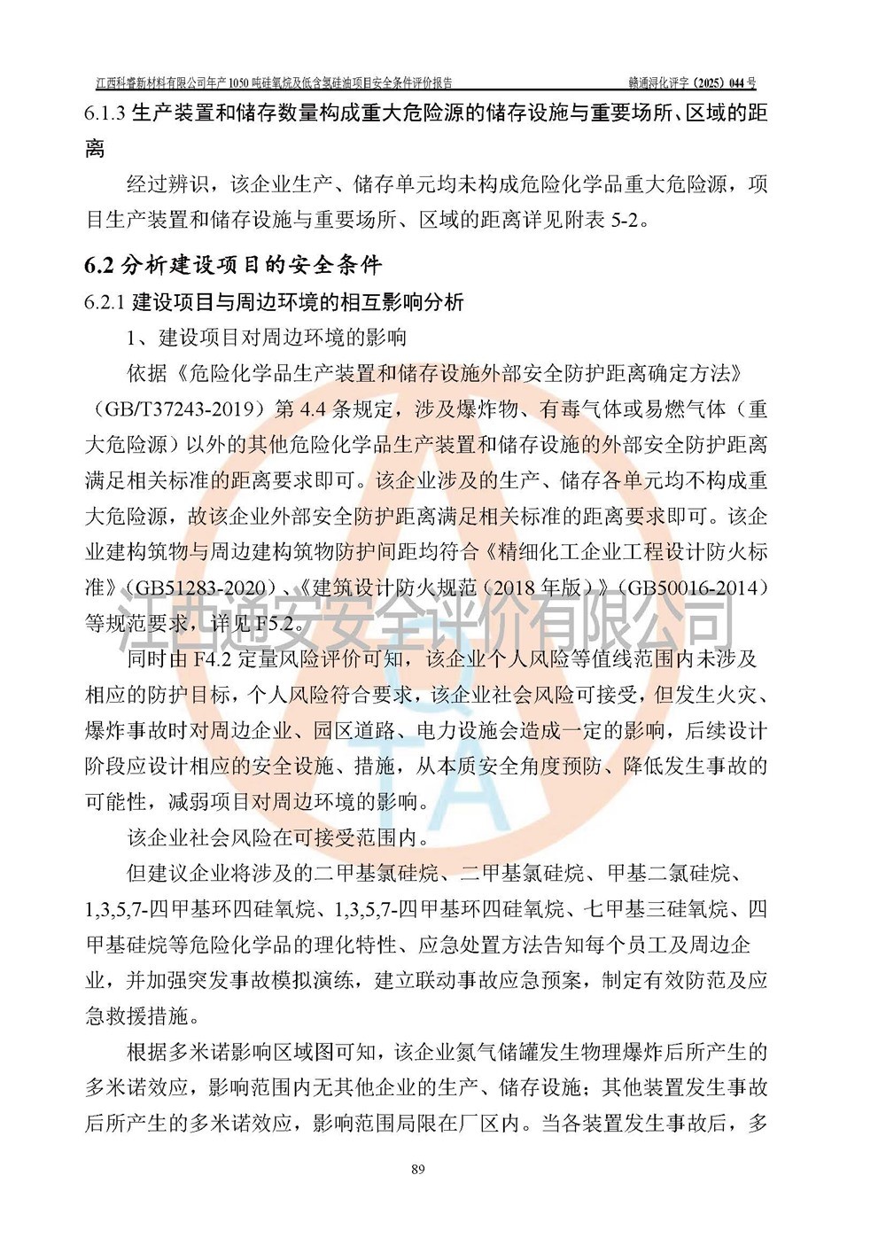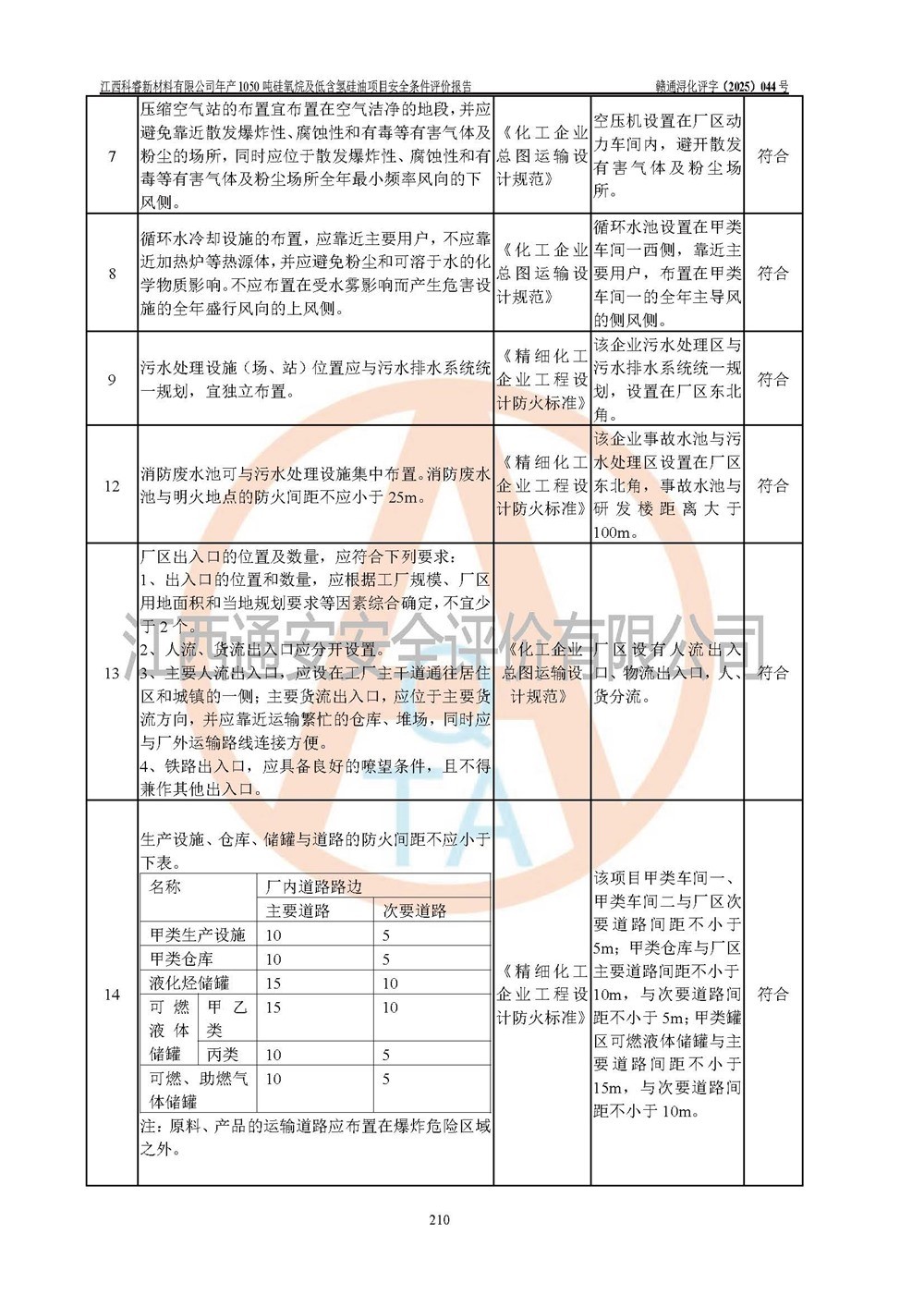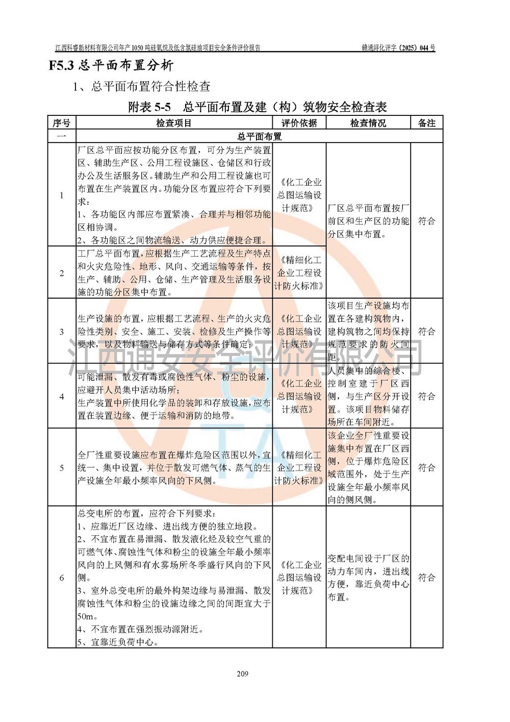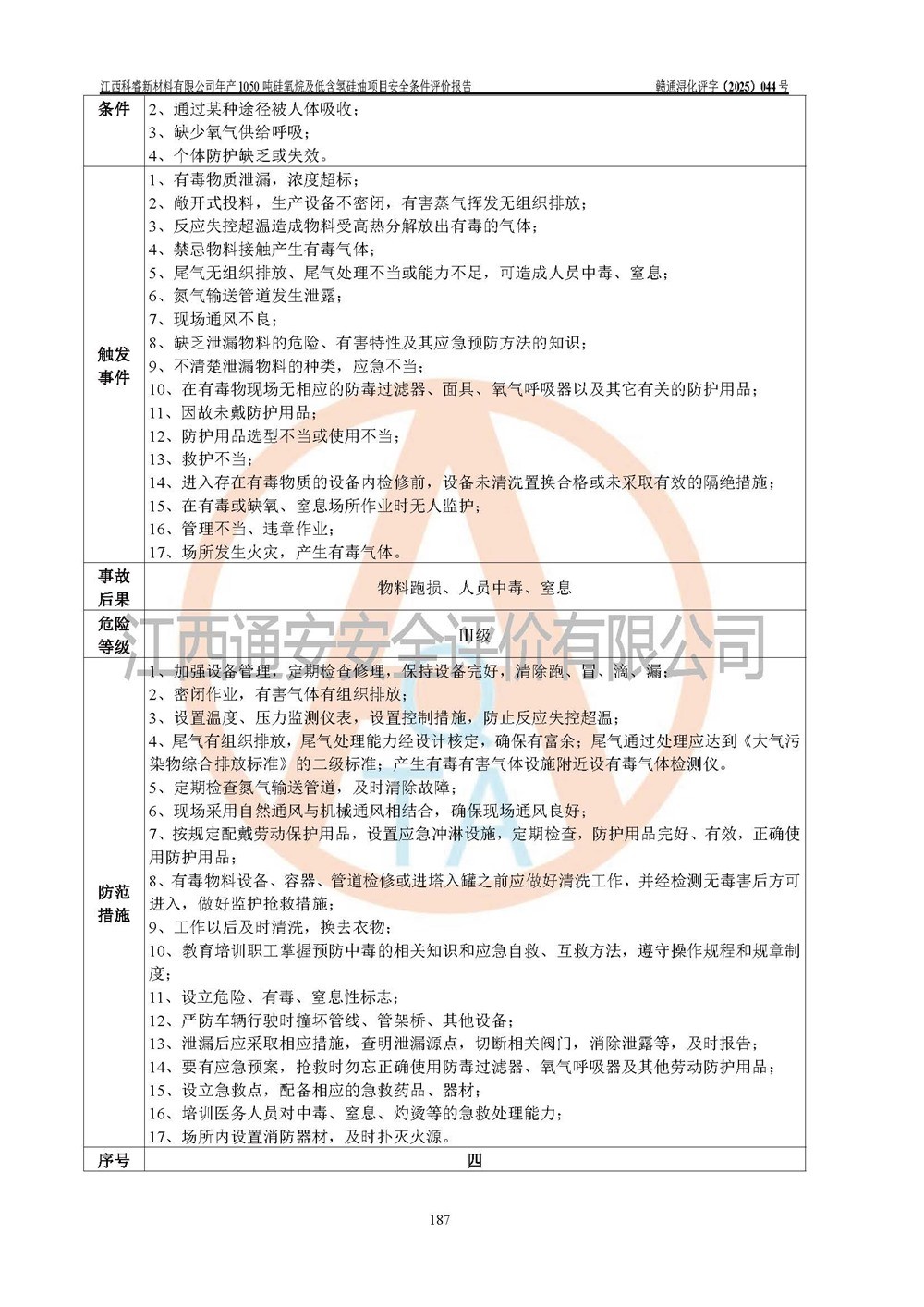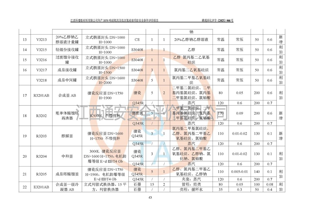 評(píng)價(jià)結(jié)論 | 江西科睿新材料有限公司年產(chǎn)1050噸硅氧烷及低含氫硅油項(xiàng)目的周邊環(huán)境、總體布局、自然環(huán)境能滿足建設(shè)安全條件;項(xiàng)目選擇的工藝過程及設(shè)備設(shè)施的安全可靠性能達(dá)到**法規(guī)、標(biāo)準(zhǔn)規(guī)定要求;項(xiàng)目存在的危險(xiǎn)有害因素可控,在落實(shí)本評(píng)價(jià)報(bào)告提出的有關(guān)安全對(duì)策措施后,其危險(xiǎn)有害程度能達(dá)到可以接受的程度,項(xiàng)目建設(shè)能夠?qū)崿F(xiàn)安全運(yùn)行的目標(biāo)。 | |||||