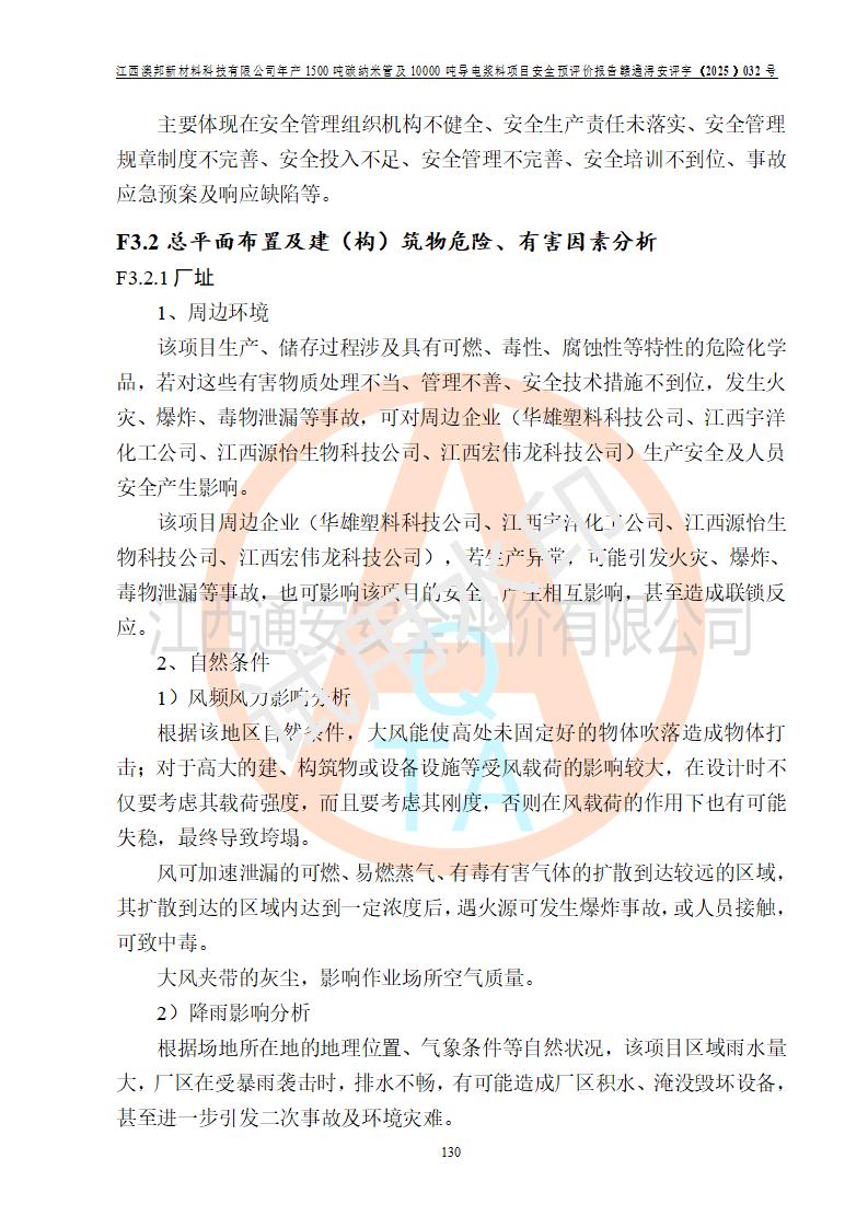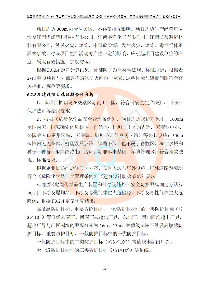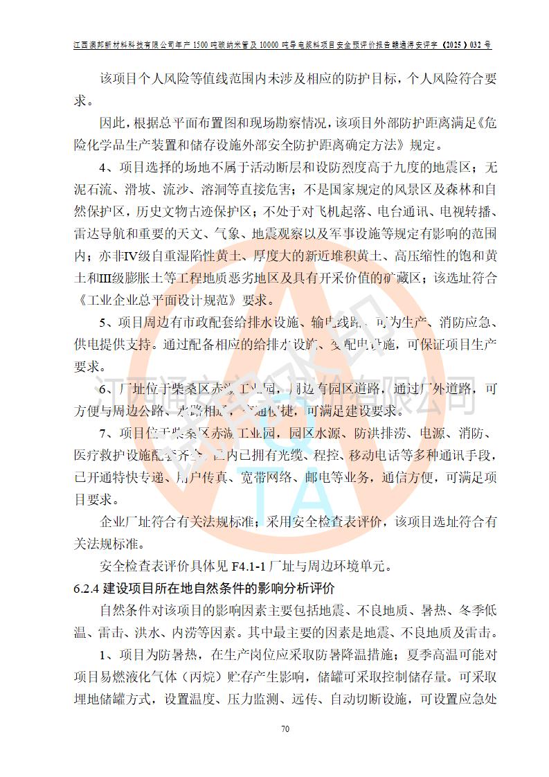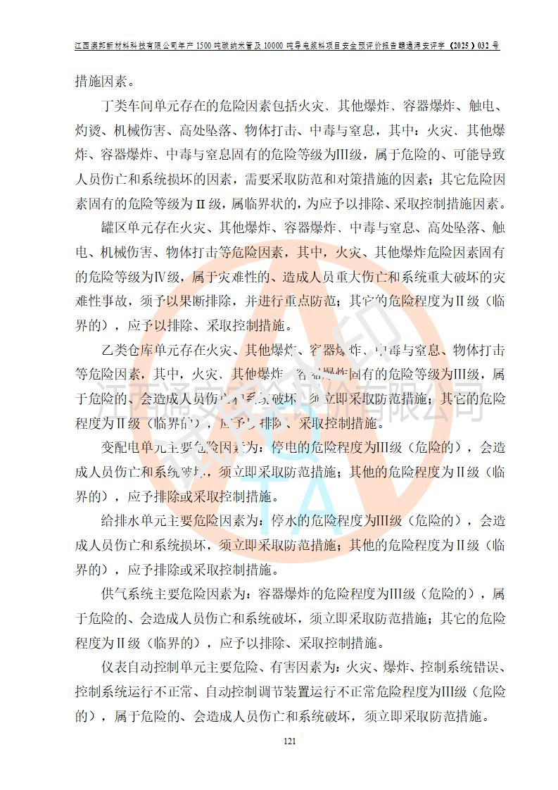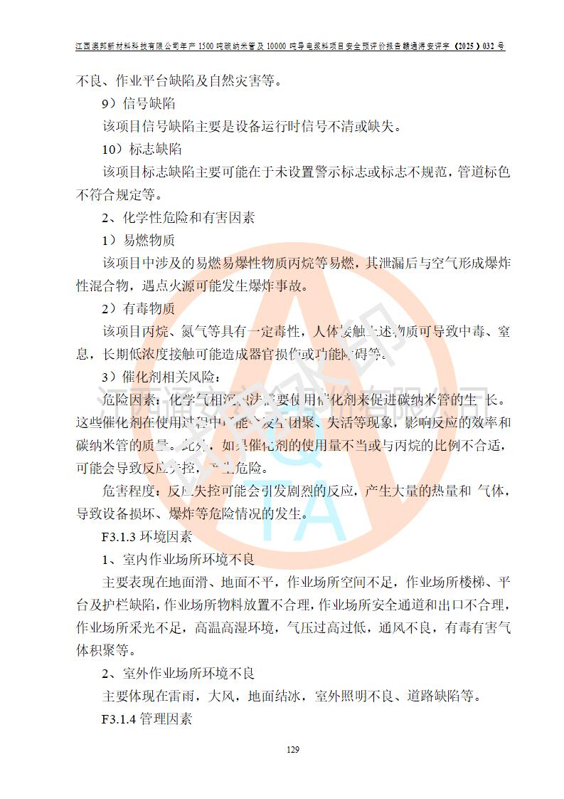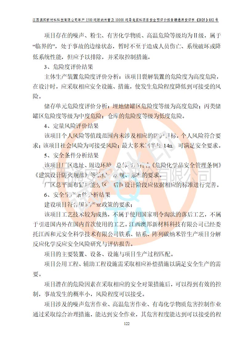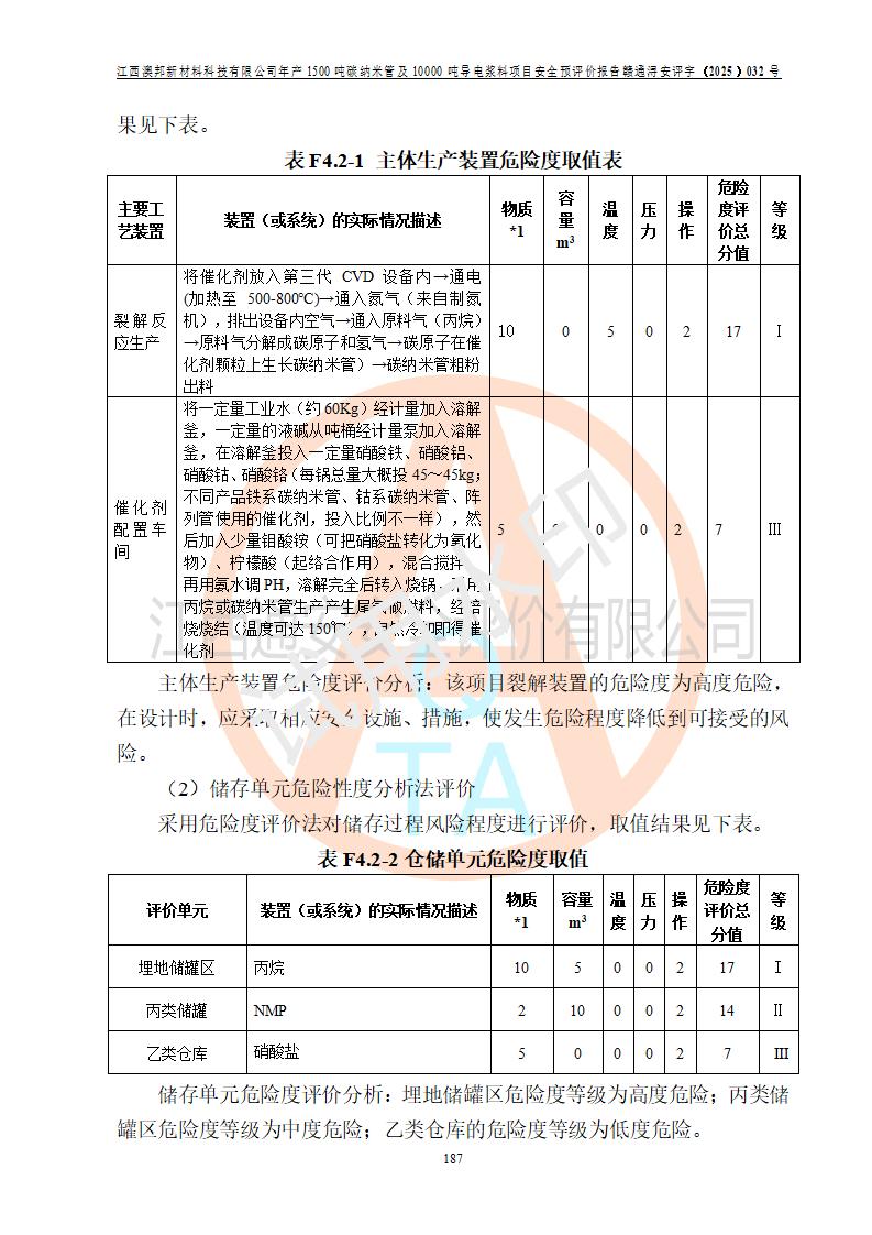 評(píng)價(jià)結(jié)論 | 江西澳邦新材料科技有限公司年產(chǎn) 1500 噸碳納米管及10000噸導(dǎo)電漿料項(xiàng)目的選址、總體布局、周邊環(huán)境、自然環(huán)境能滿足建設(shè)安全條件;項(xiàng)目選擇的工藝過程及設(shè)備設(shè)施的安全可靠性能達(dá)到**法規(guī)、標(biāo)準(zhǔn)規(guī)定要求。 項(xiàng)目存在的危險(xiǎn)有害因素可控,在落實(shí)本評(píng)價(jià)報(bào)告提出的有關(guān)安全對(duì)策措施后,其危險(xiǎn)有害程度能達(dá)到可以接受的程度,項(xiàng)目建設(shè)能夠?qū)崿F(xiàn)安全運(yùn)行的目標(biāo)。 | |||||