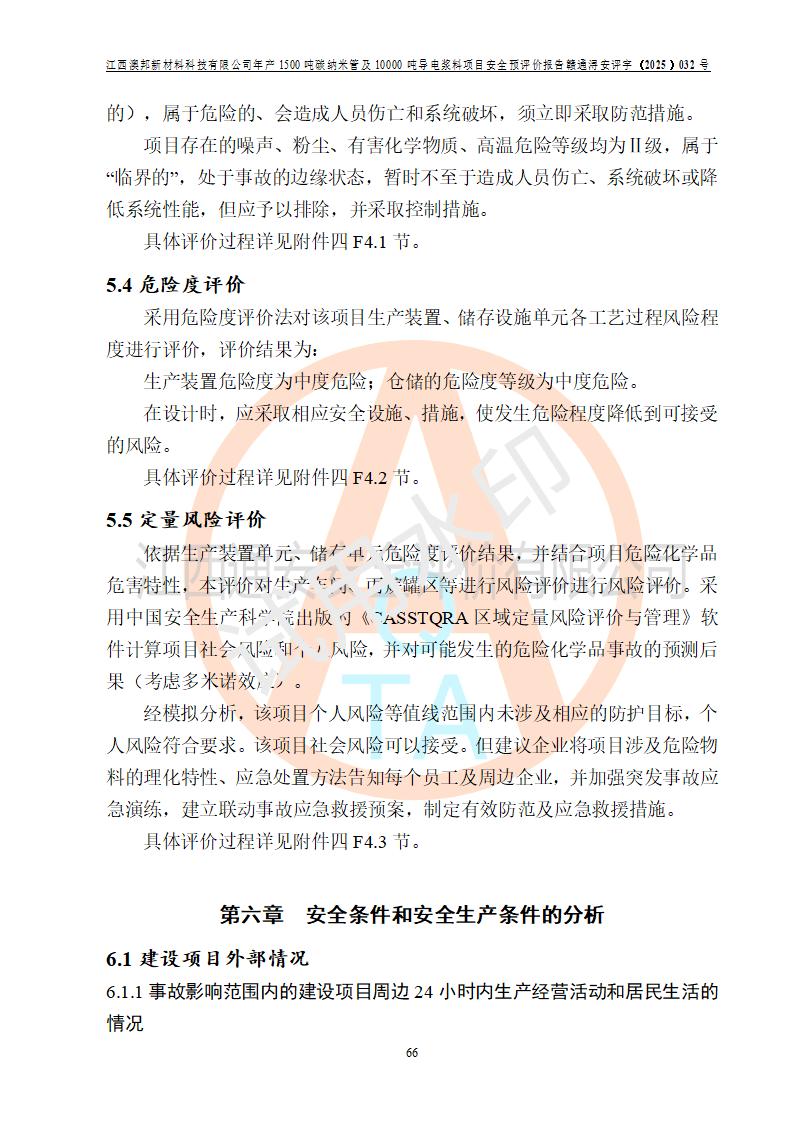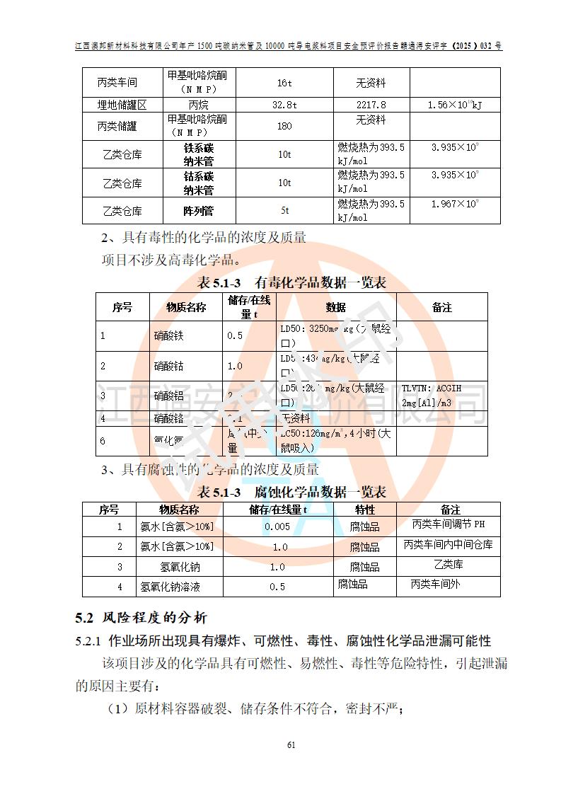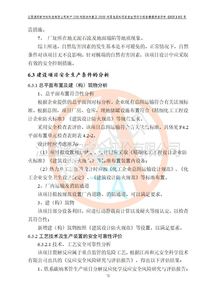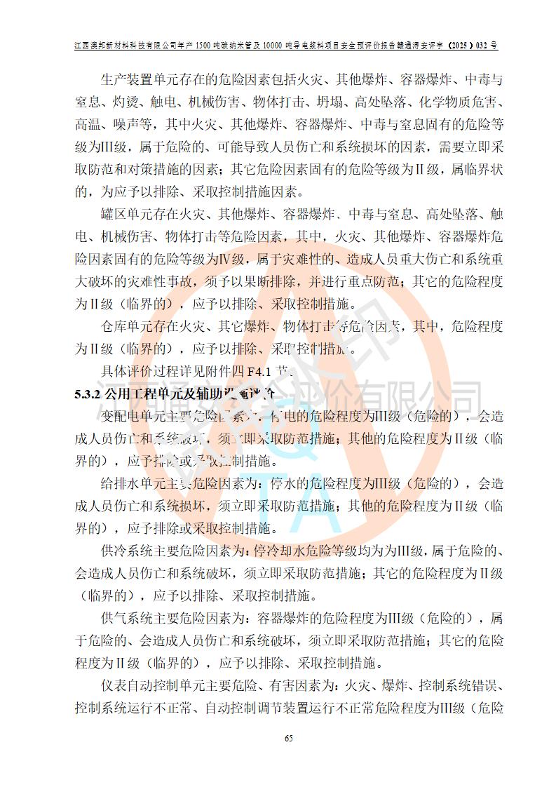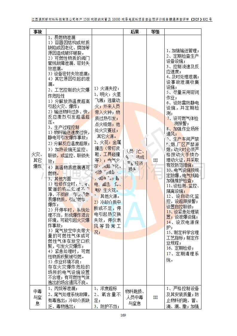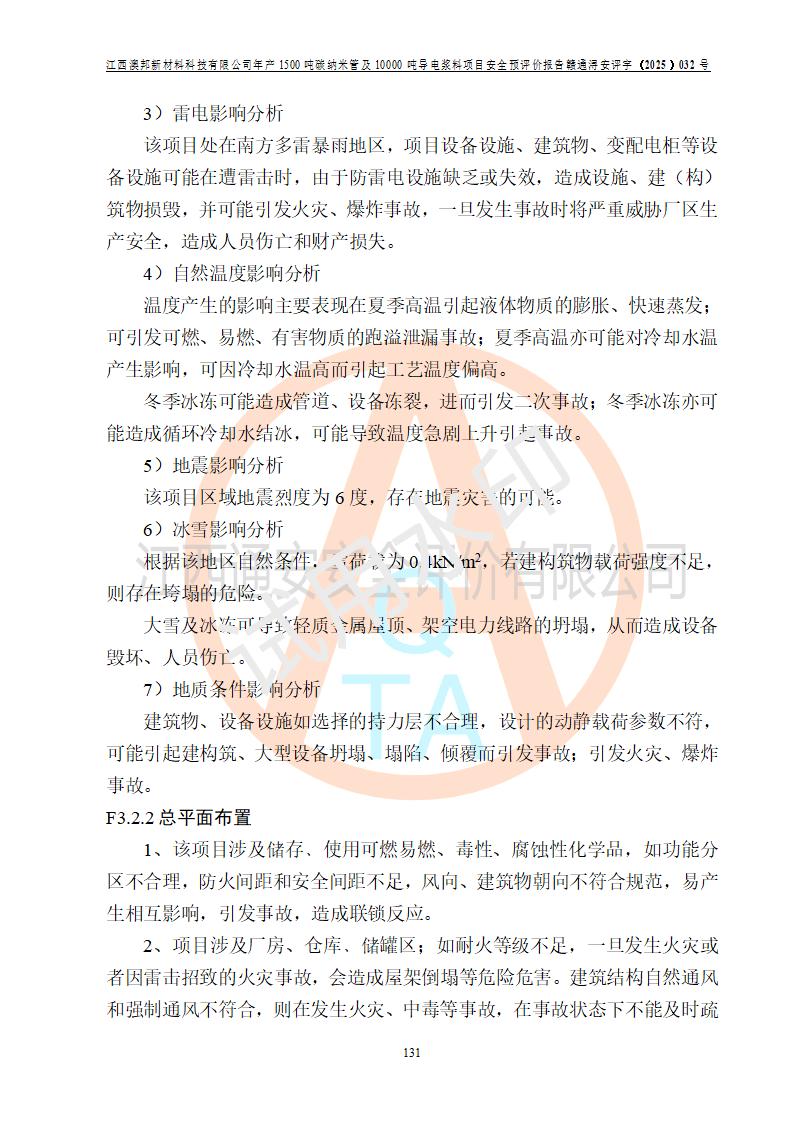 評(píng)價(jià)結(jié)論 | 江西澳邦新材料科技有限公司年產(chǎn) 1500 噸碳納米管及10000噸導(dǎo)電漿料項(xiàng)目的選址、總體布局、周邊環(huán)境、自然環(huán)境能滿足建設(shè)安全條件;項(xiàng)目選擇的工藝過程及設(shè)備設(shè)施的安全可靠性能達(dá)到**法規(guī)、標(biāo)準(zhǔn)規(guī)定要求。 項(xiàng)目存在的危險(xiǎn)有害因素可控,在落實(shí)本評(píng)價(jià)報(bào)告提出的有關(guān)安全對(duì)策措施后,其危險(xiǎn)有害程度能達(dá)到可以接受的程度,項(xiàng)目建設(shè)能夠?qū)崿F(xiàn)安全運(yùn)行的目標(biāo)。 | |||||