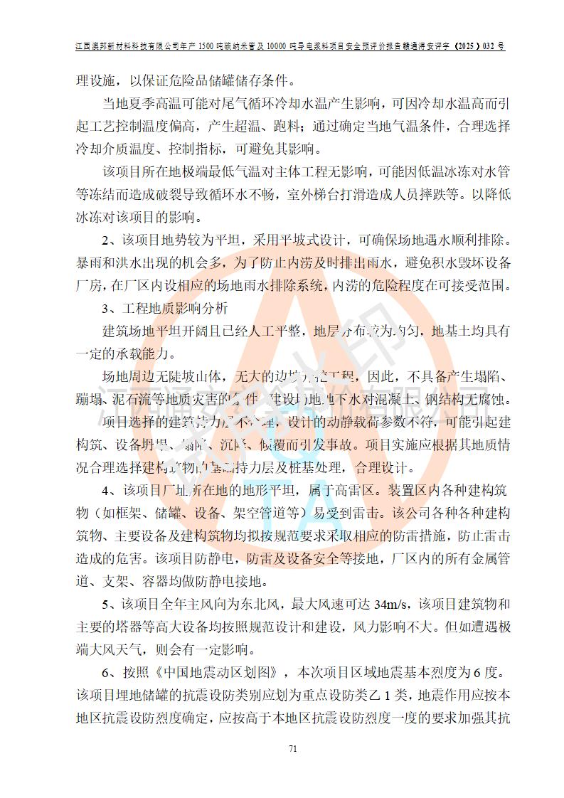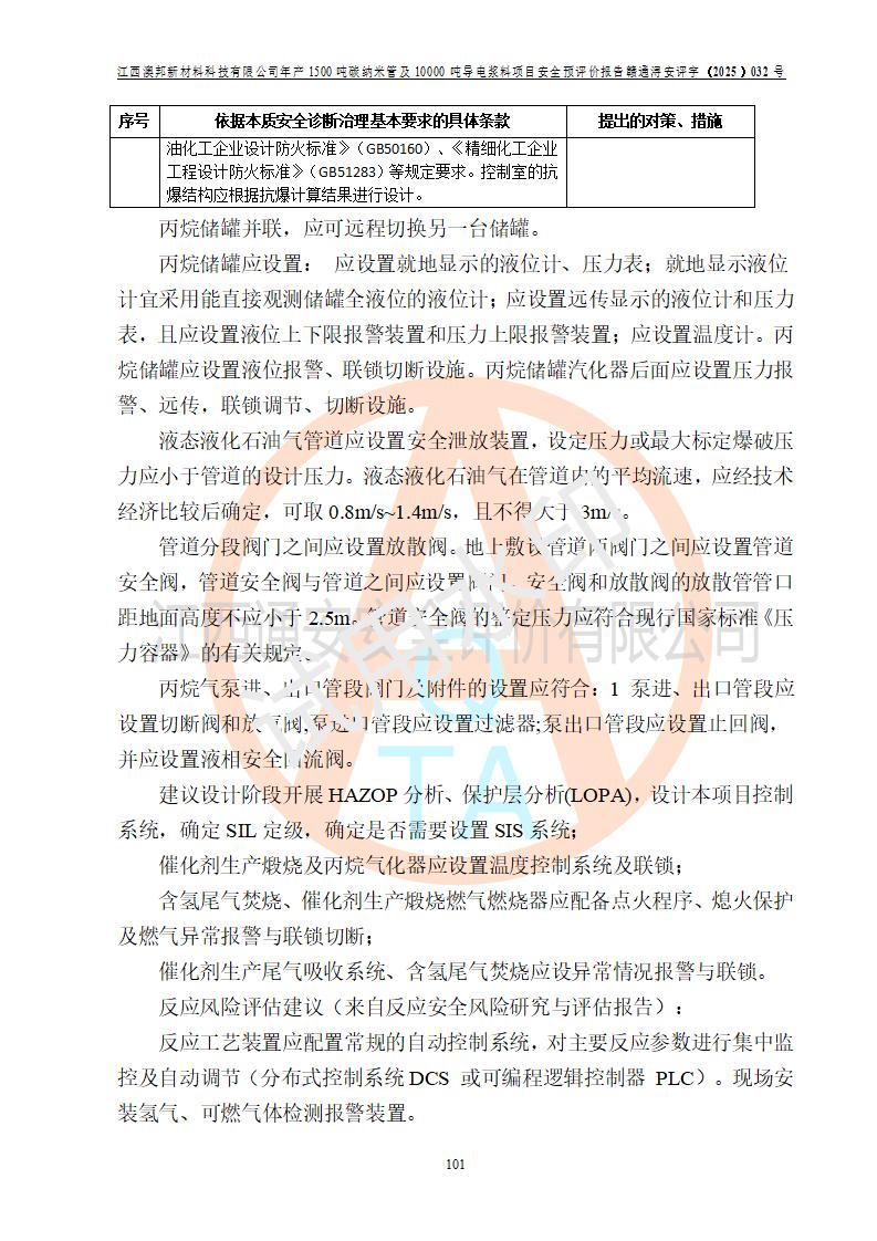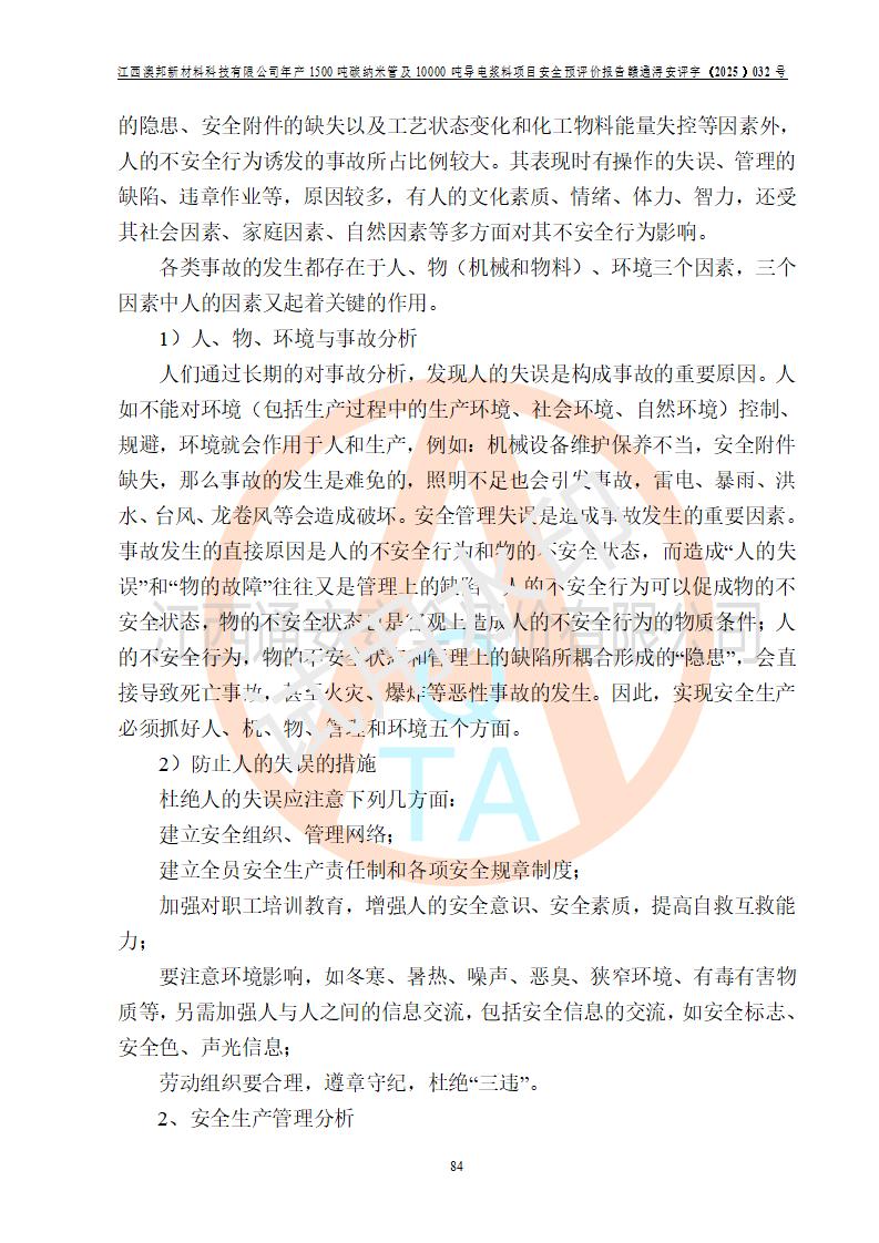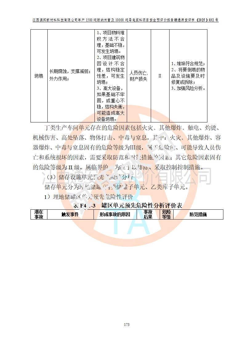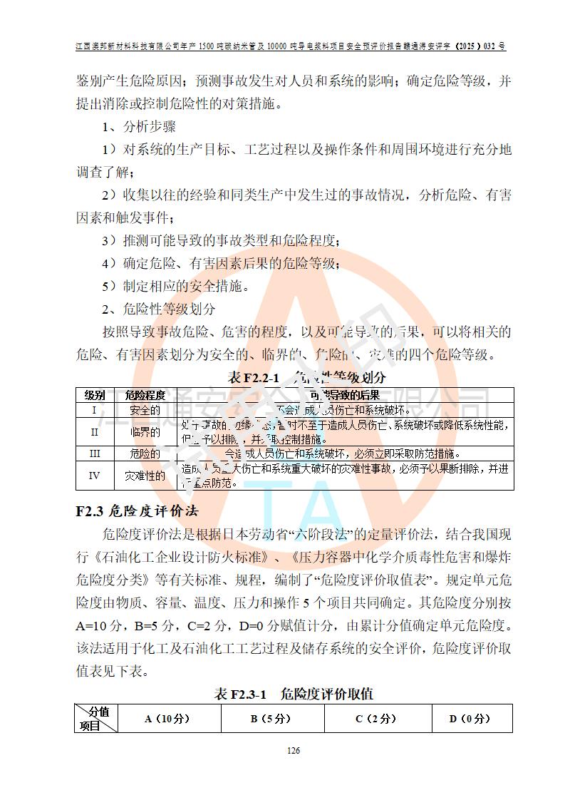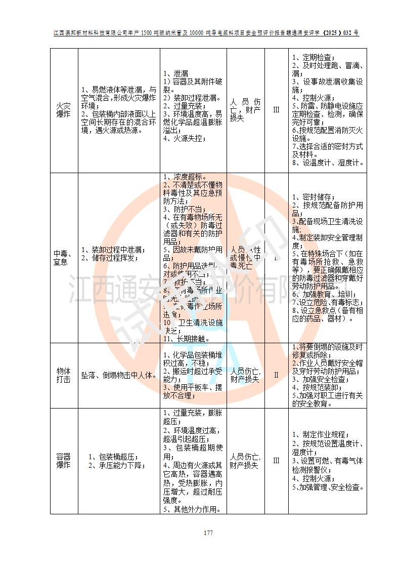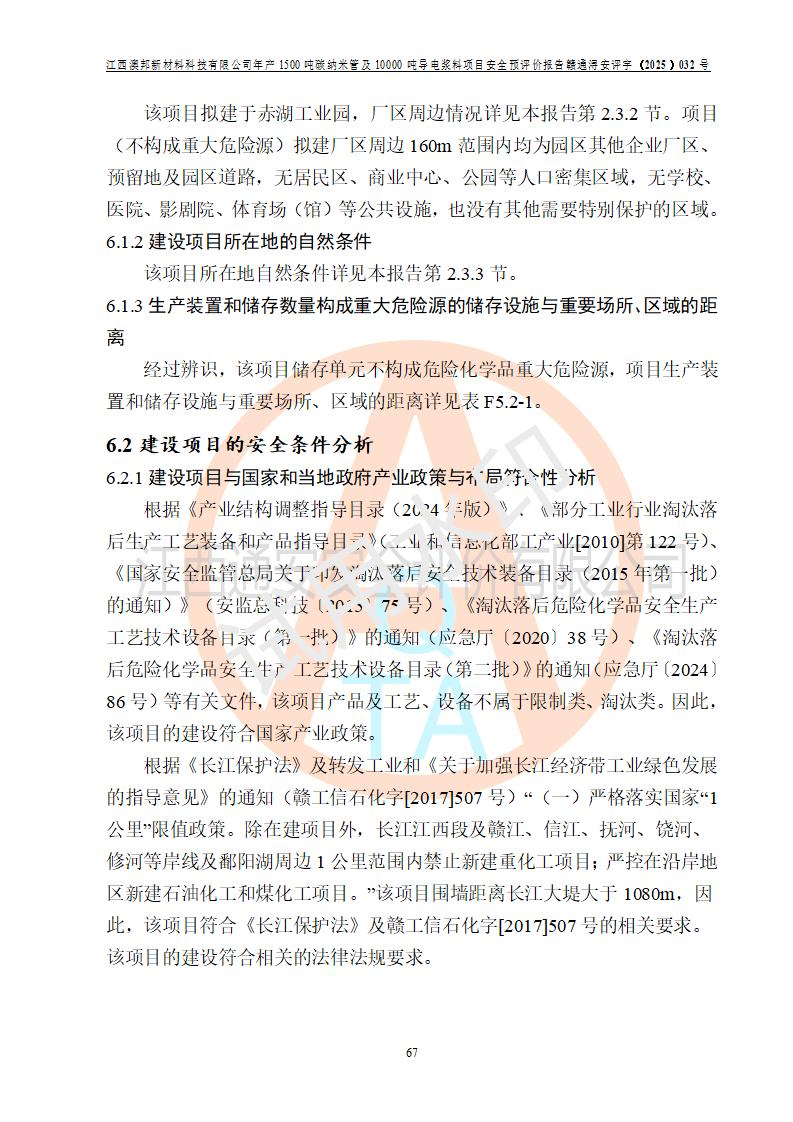 評(píng)價(jià)結(jié)論 | 江西澳邦新材料科技有限公司年產(chǎn) 1500 噸碳納米管及10000噸導(dǎo)電漿料項(xiàng)目的選址、總體布局、周邊環(huán)境、自然環(huán)境能滿足建設(shè)安全條件;項(xiàng)目選擇的工藝過程及設(shè)備設(shè)施的安全可靠性能達(dá)到**法規(guī)、標(biāo)準(zhǔn)規(guī)定要求。 項(xiàng)目存在的危險(xiǎn)有害因素可控,在落實(shí)本評(píng)價(jià)報(bào)告提出的有關(guān)安全對(duì)策措施后,其危險(xiǎn)有害程度能達(dá)到可以接受的程度,項(xiàng)目建設(shè)能夠?qū)崿F(xiàn)安全運(yùn)行的目標(biāo)。 | |||||