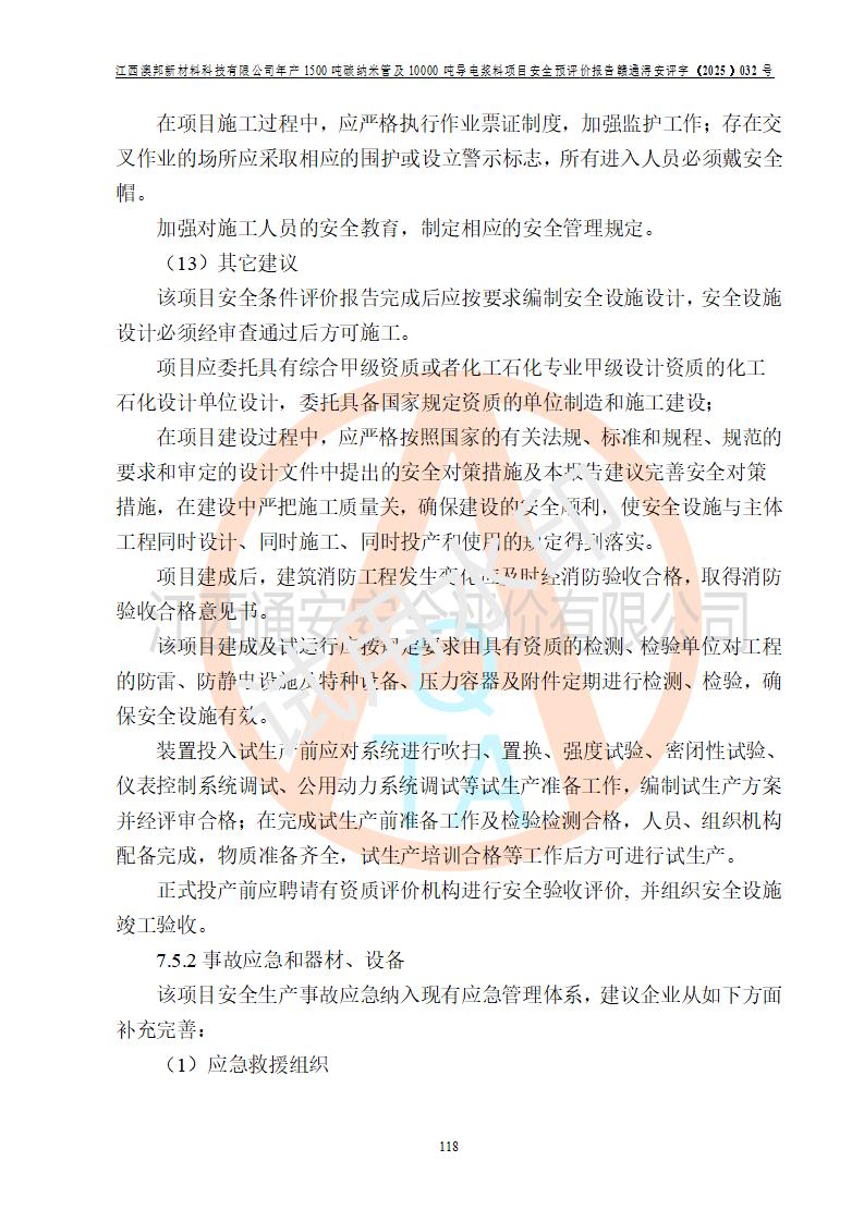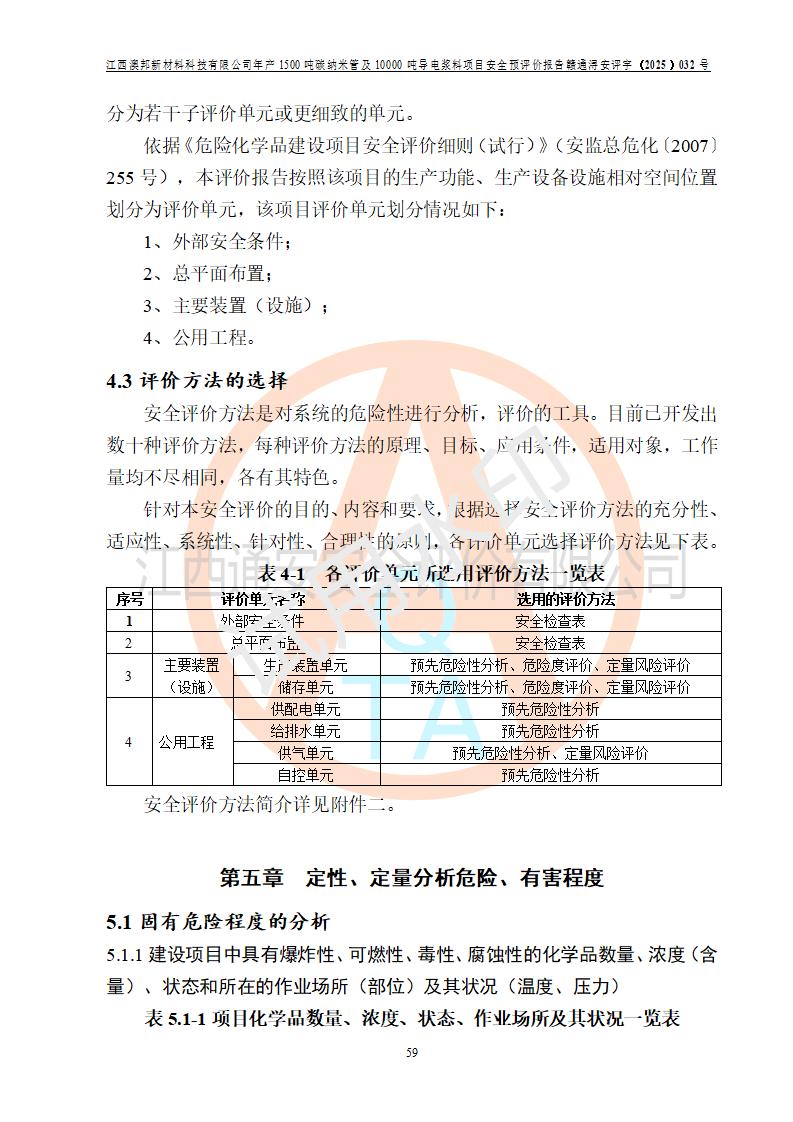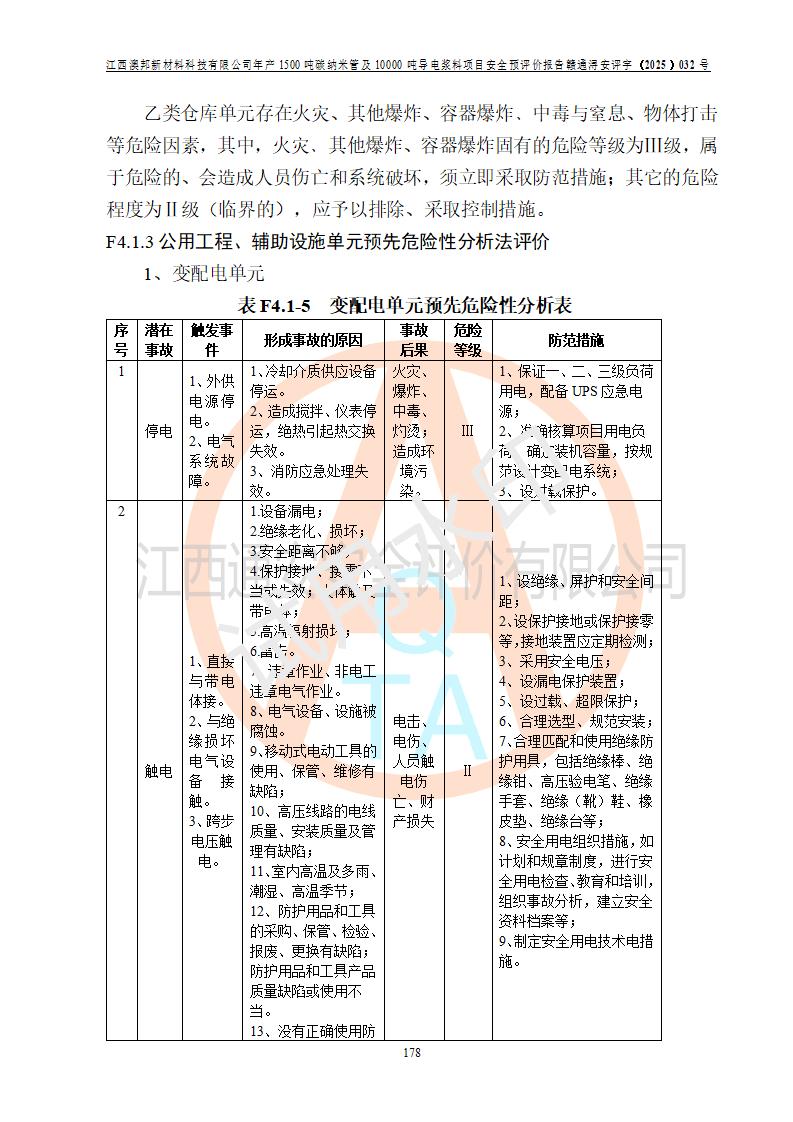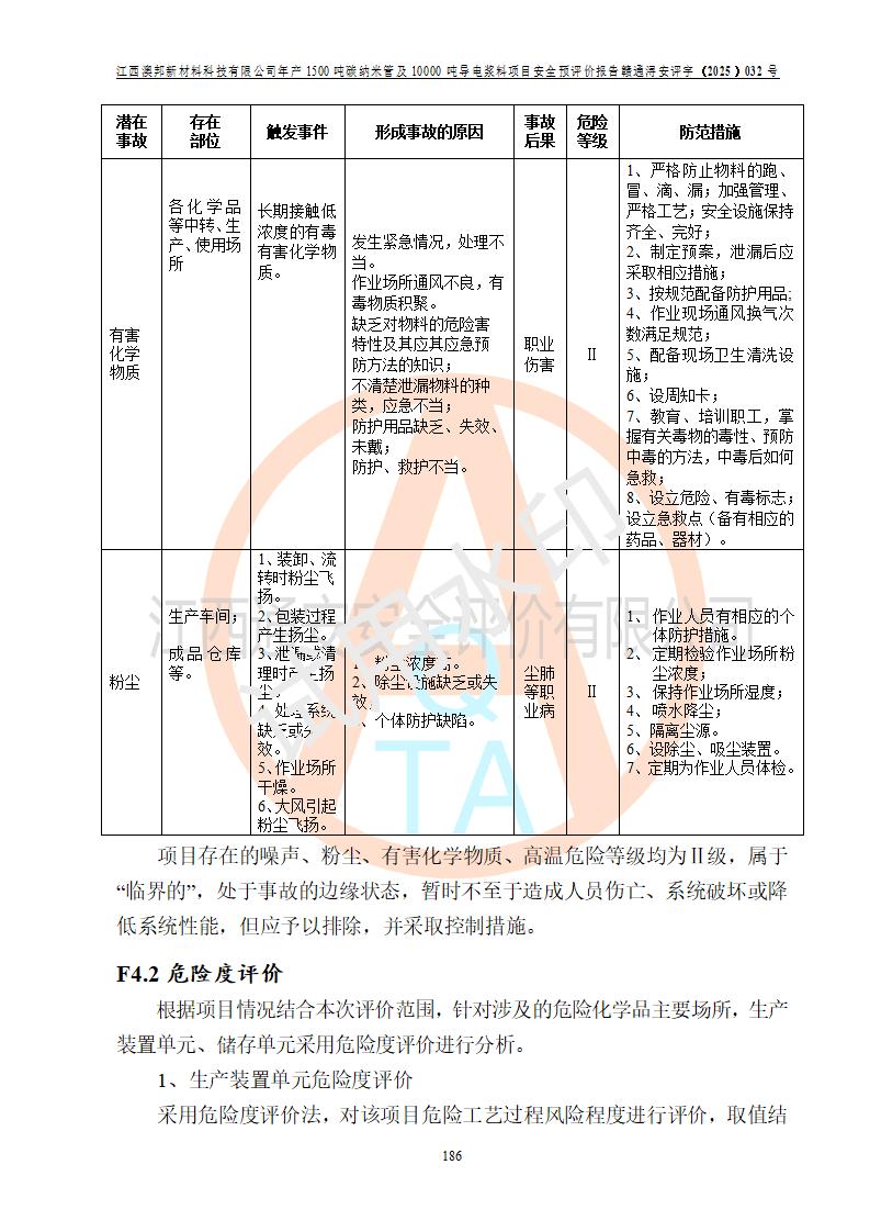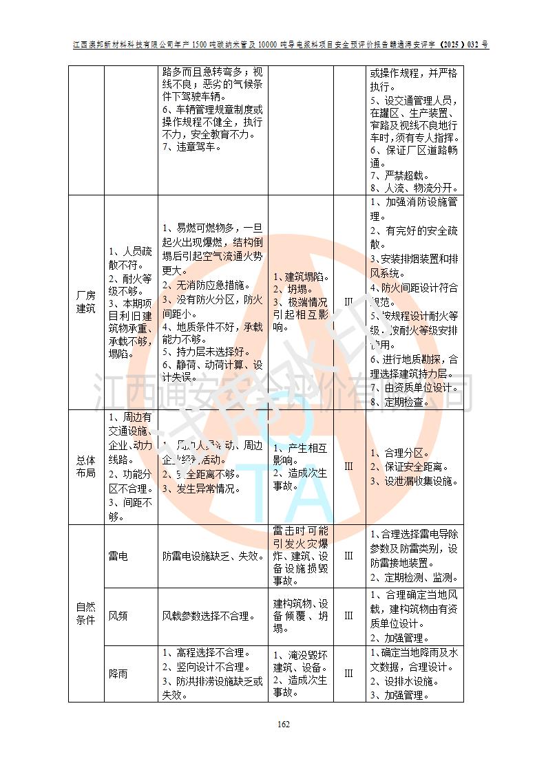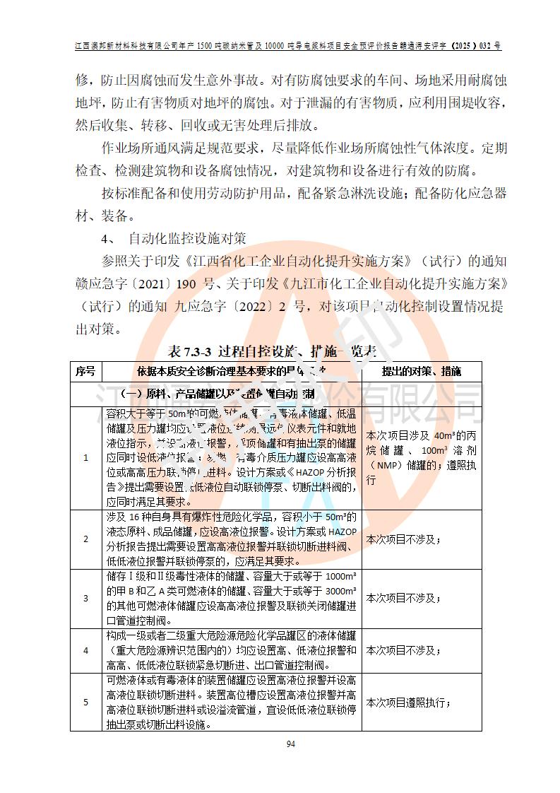 評(píng)價(jià)結(jié)論 | 江西澳邦新材料科技有限公司年產(chǎn) 1500 噸碳納米管及10000噸導(dǎo)電漿料項(xiàng)目的選址、總體布局、周邊環(huán)境、自然環(huán)境能滿足建設(shè)安全條件;項(xiàng)目選擇的工藝過程及設(shè)備設(shè)施的安全可靠性能達(dá)到**法規(guī)、標(biāo)準(zhǔn)規(guī)定要求。 項(xiàng)目存在的危險(xiǎn)有害因素可控,在落實(shí)本評(píng)價(jià)報(bào)告提出的有關(guān)安全對(duì)策措施后,其危險(xiǎn)有害程度能達(dá)到可以接受的程度,項(xiàng)目建設(shè)能夠?qū)崿F(xiàn)安全運(yùn)行的目標(biāo)。 | |||||