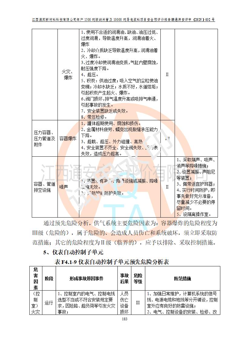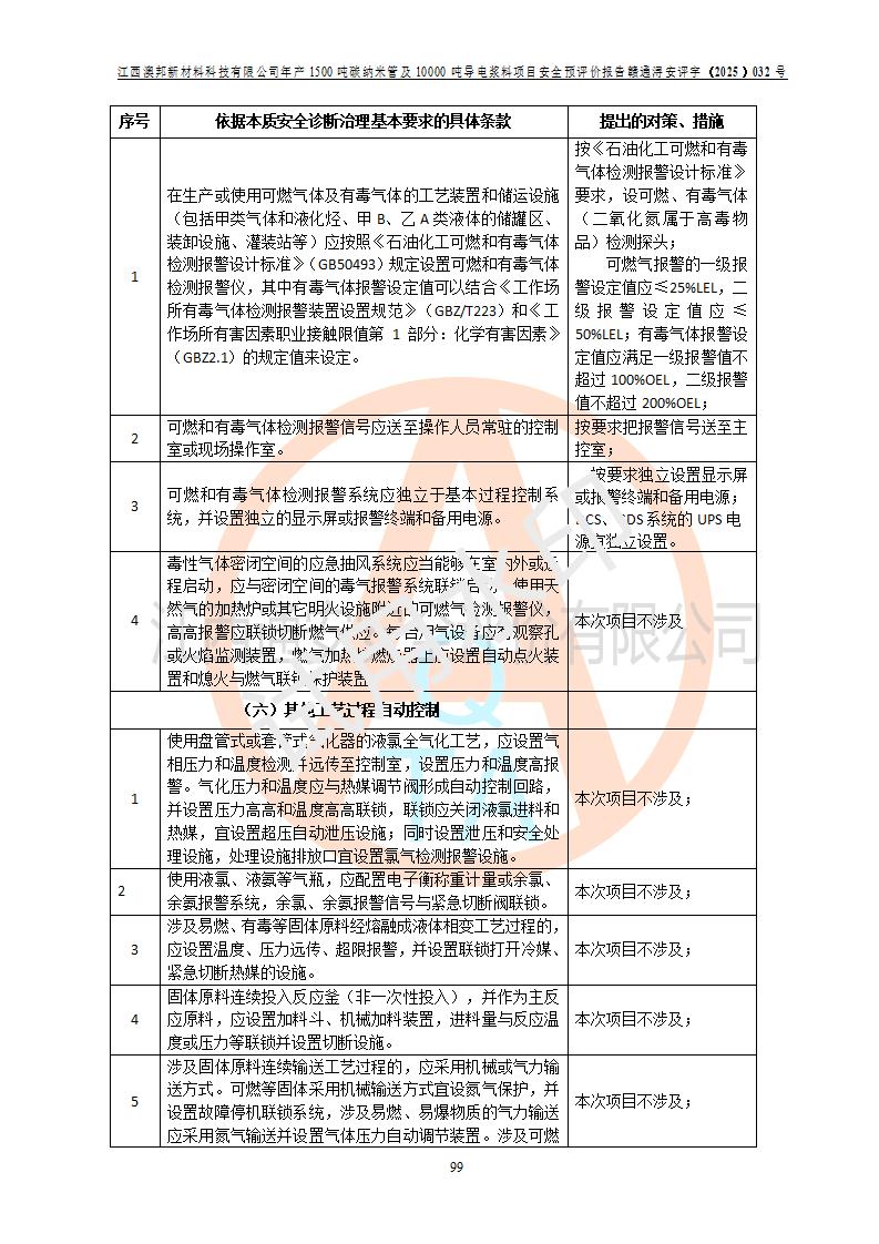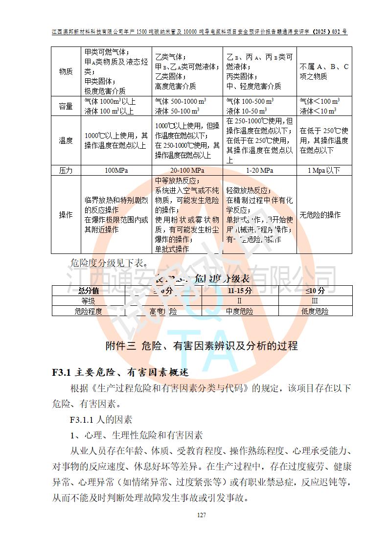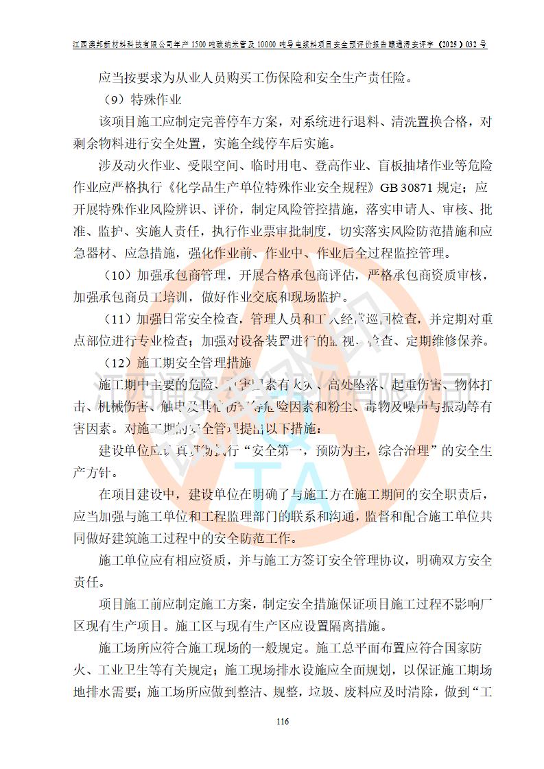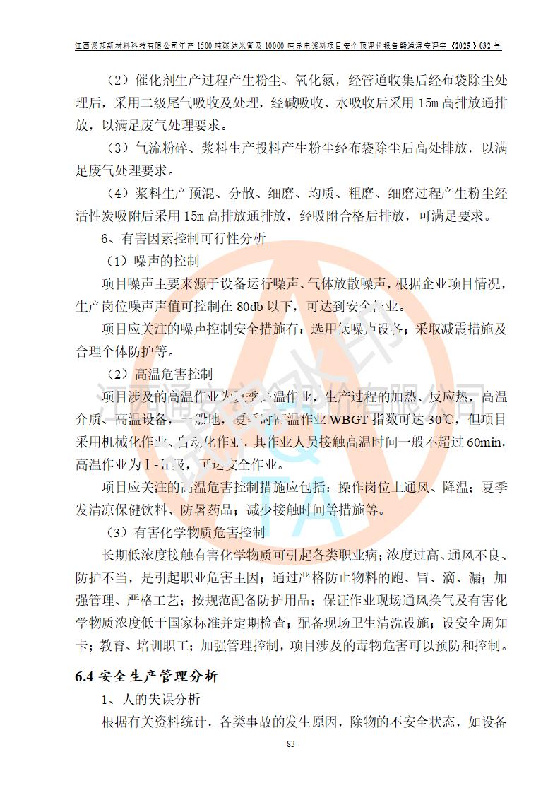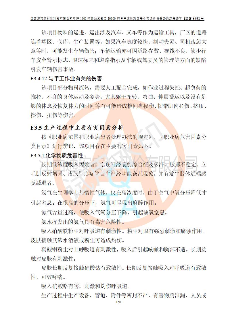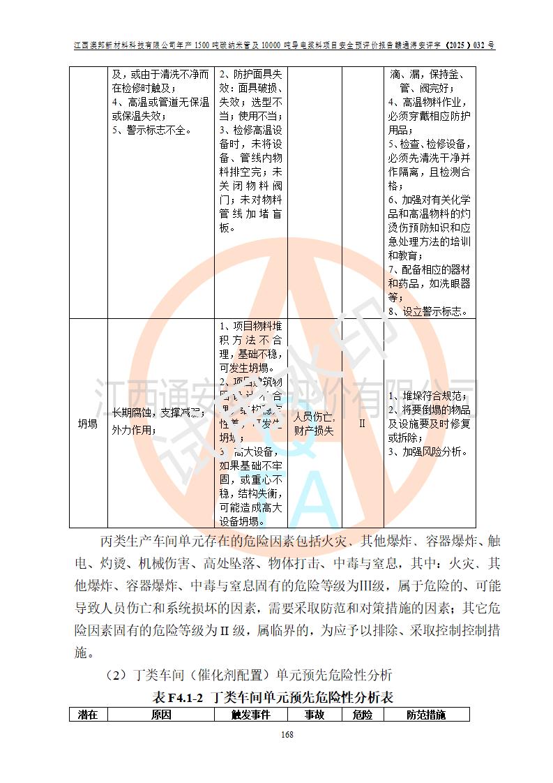 評(píng)價(jià)結(jié)論 | 江西澳邦新材料科技有限公司年產(chǎn) 1500 噸碳納米管及10000噸導(dǎo)電漿料項(xiàng)目的選址、總體布局、周邊環(huán)境、自然環(huán)境能滿足建設(shè)安全條件;項(xiàng)目選擇的工藝過程及設(shè)備設(shè)施的安全可靠性能達(dá)到**法規(guī)、標(biāo)準(zhǔn)規(guī)定要求。 項(xiàng)目存在的危險(xiǎn)有害因素可控,在落實(shí)本評(píng)價(jià)報(bào)告提出的有關(guān)安全對(duì)策措施后,其危險(xiǎn)有害程度能達(dá)到可以接受的程度,項(xiàng)目建設(shè)能夠?qū)崿F(xiàn)安全運(yùn)行的目標(biāo)。 | |||||