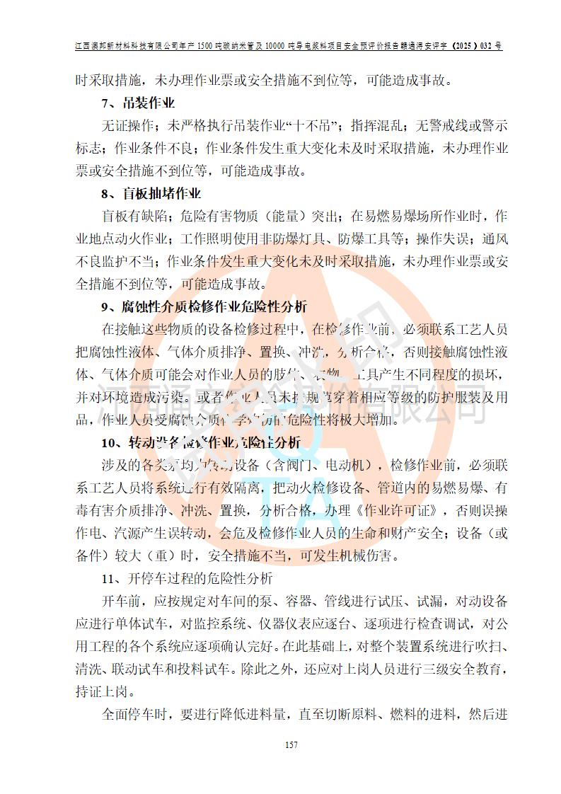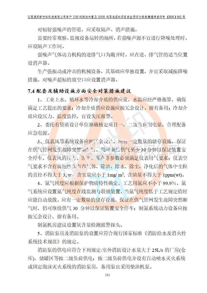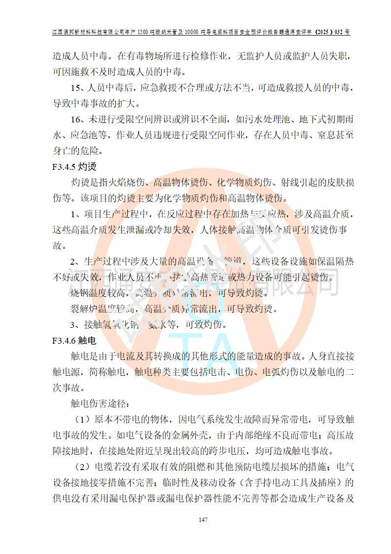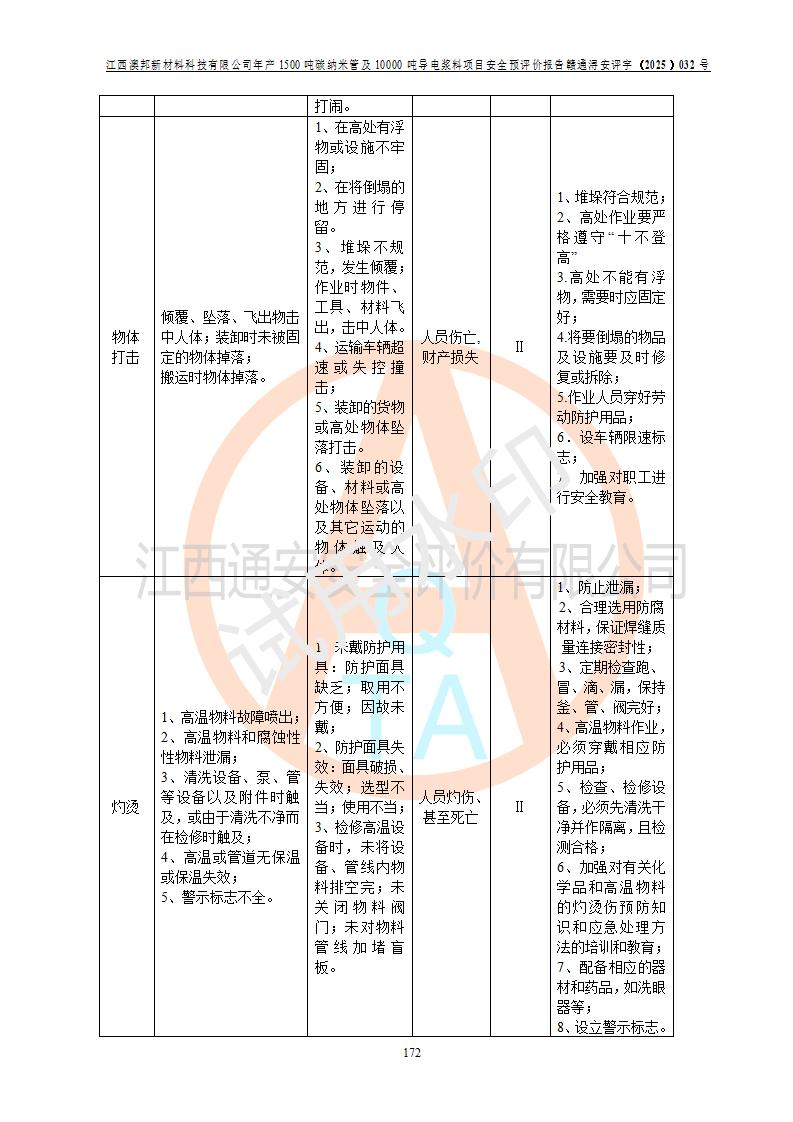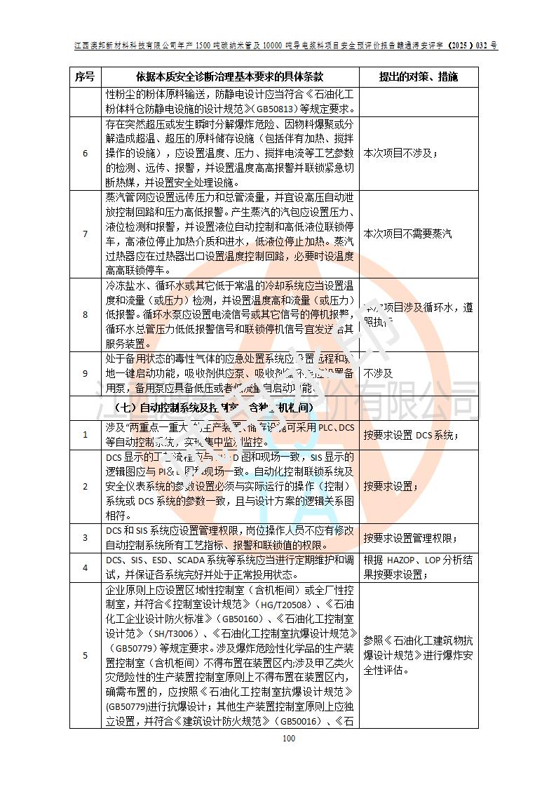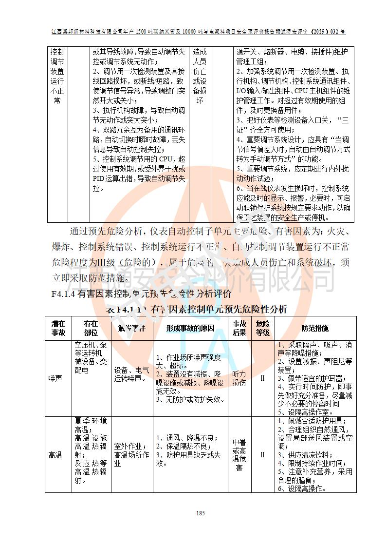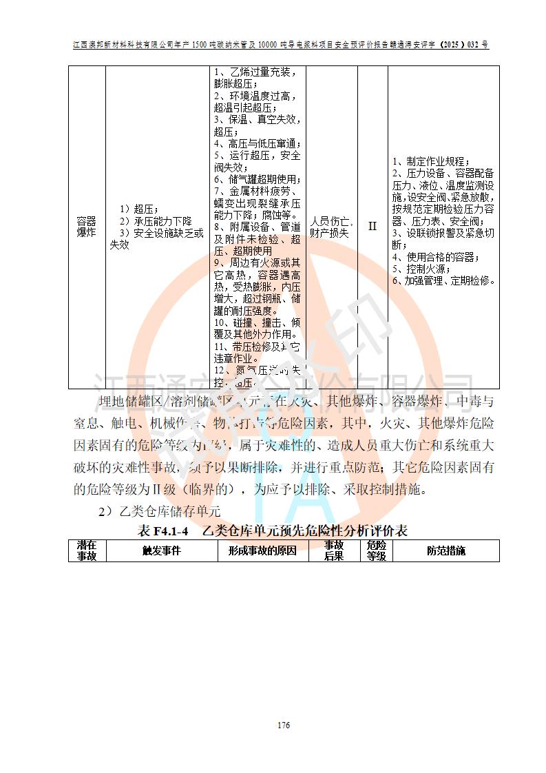 評(píng)價(jià)結(jié)論 | 江西澳邦新材料科技有限公司年產(chǎn) 1500 噸碳納米管及10000噸導(dǎo)電漿料項(xiàng)目的選址、總體布局、周邊環(huán)境、自然環(huán)境能滿足建設(shè)安全條件;項(xiàng)目選擇的工藝過程及設(shè)備設(shè)施的安全可靠性能達(dá)到**法規(guī)、標(biāo)準(zhǔn)規(guī)定要求。 項(xiàng)目存在的危險(xiǎn)有害因素可控,在落實(shí)本評(píng)價(jià)報(bào)告提出的有關(guān)安全對(duì)策措施后,其危險(xiǎn)有害程度能達(dá)到可以接受的程度,項(xiàng)目建設(shè)能夠?qū)崿F(xiàn)安全運(yùn)行的目標(biāo)。 | |||||