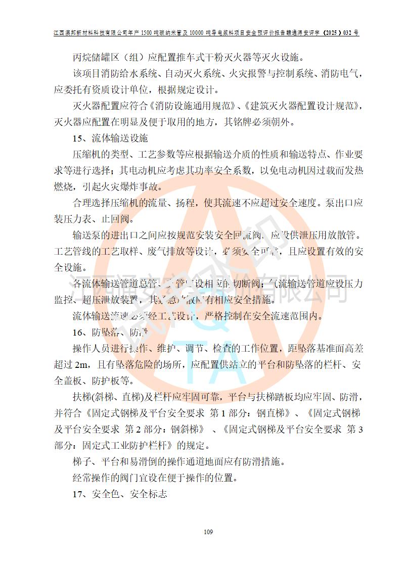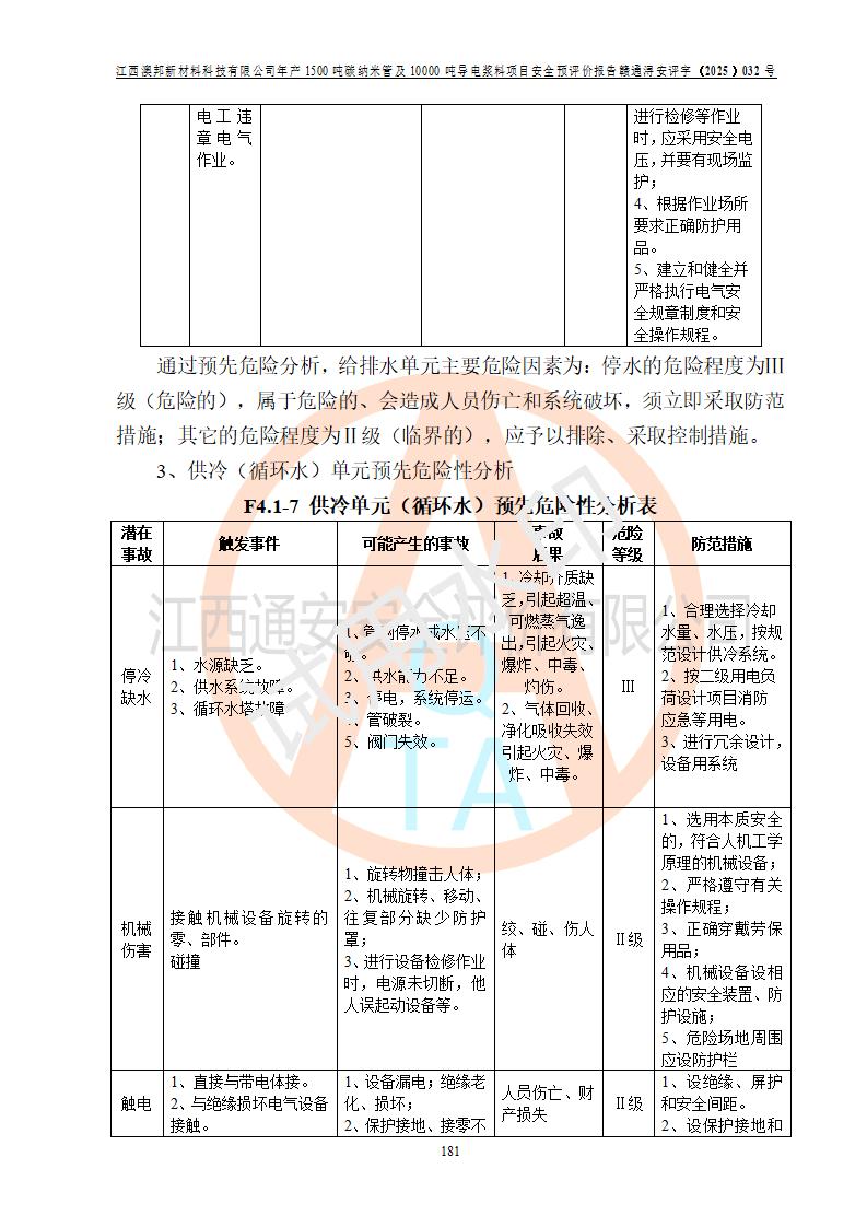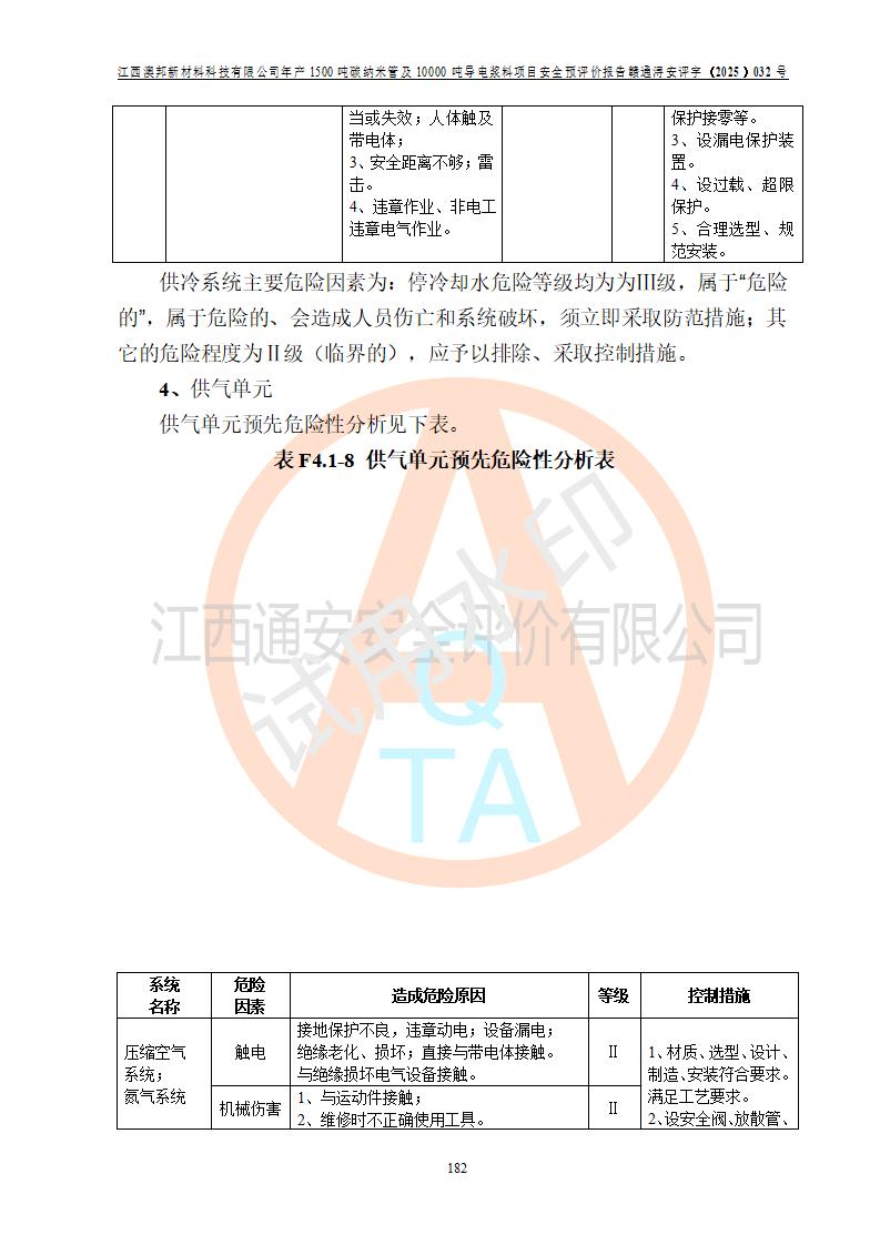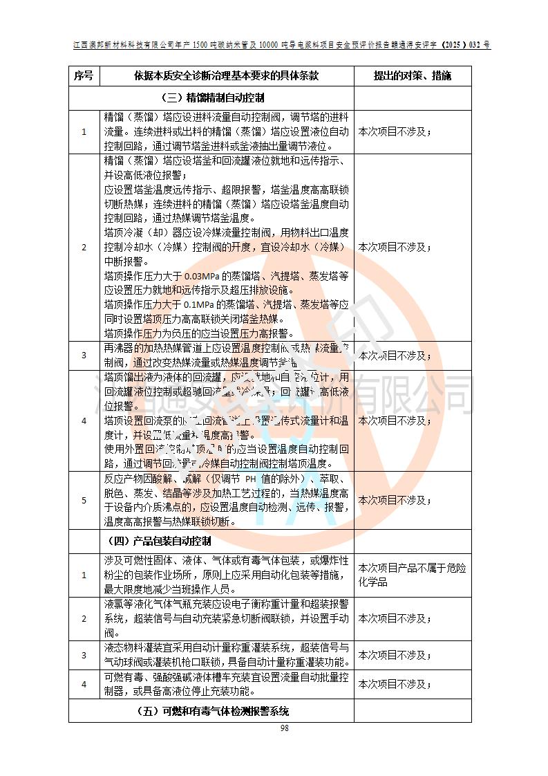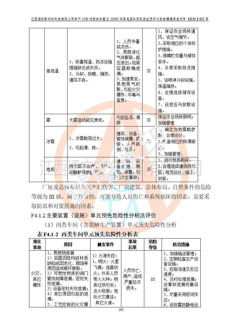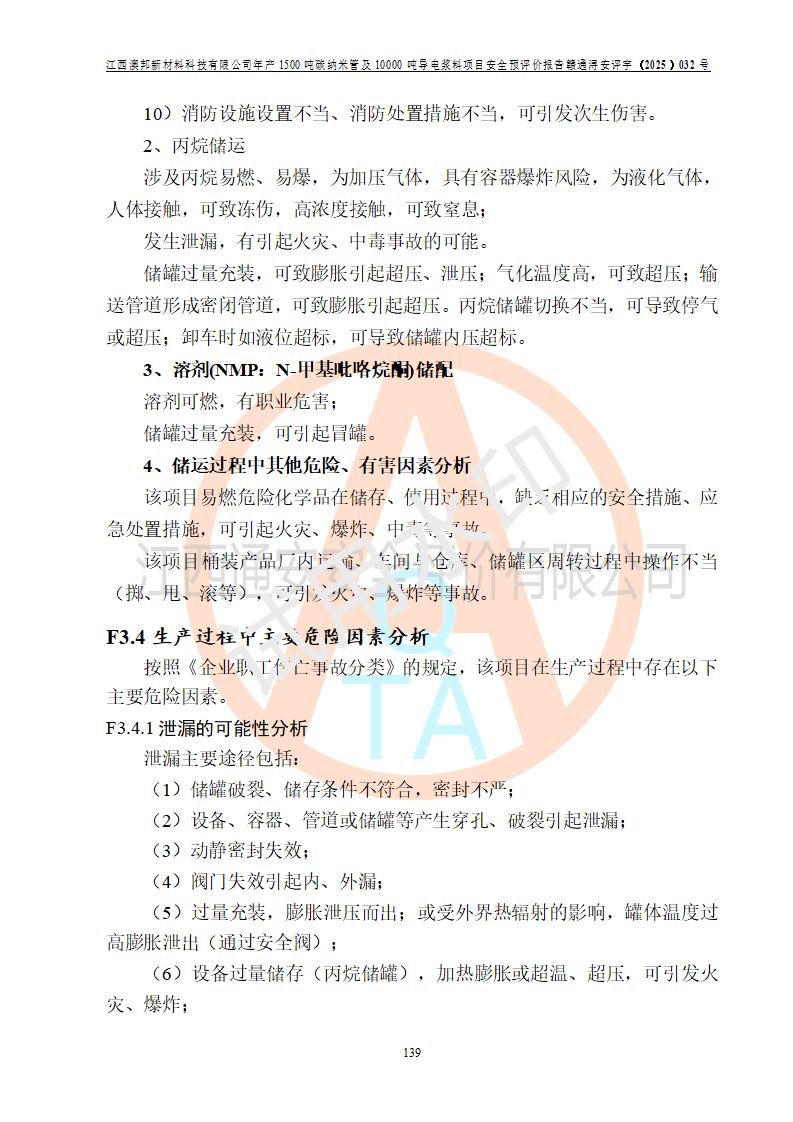 評(píng)價(jià)結(jié)論 | 江西澳邦新材料科技有限公司年產(chǎn) 1500 噸碳納米管及10000噸導(dǎo)電漿料項(xiàng)目的選址、總體布局、周邊環(huán)境、自然環(huán)境能滿足建設(shè)安全條件;項(xiàng)目選擇的工藝過程及設(shè)備設(shè)施的安全可靠性能達(dá)到**法規(guī)、標(biāo)準(zhǔn)規(guī)定要求。 項(xiàng)目存在的危險(xiǎn)有害因素可控,在落實(shí)本評(píng)價(jià)報(bào)告提出的有關(guān)安全對(duì)策措施后,其危險(xiǎn)有害程度能達(dá)到可以接受的程度,項(xiàng)目建設(shè)能夠?qū)崿F(xiàn)安全運(yùn)行的目標(biāo)。 | |||||