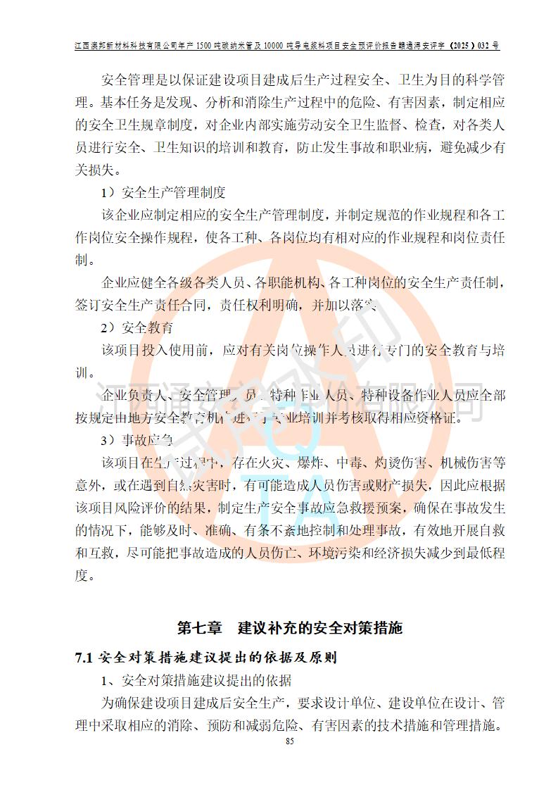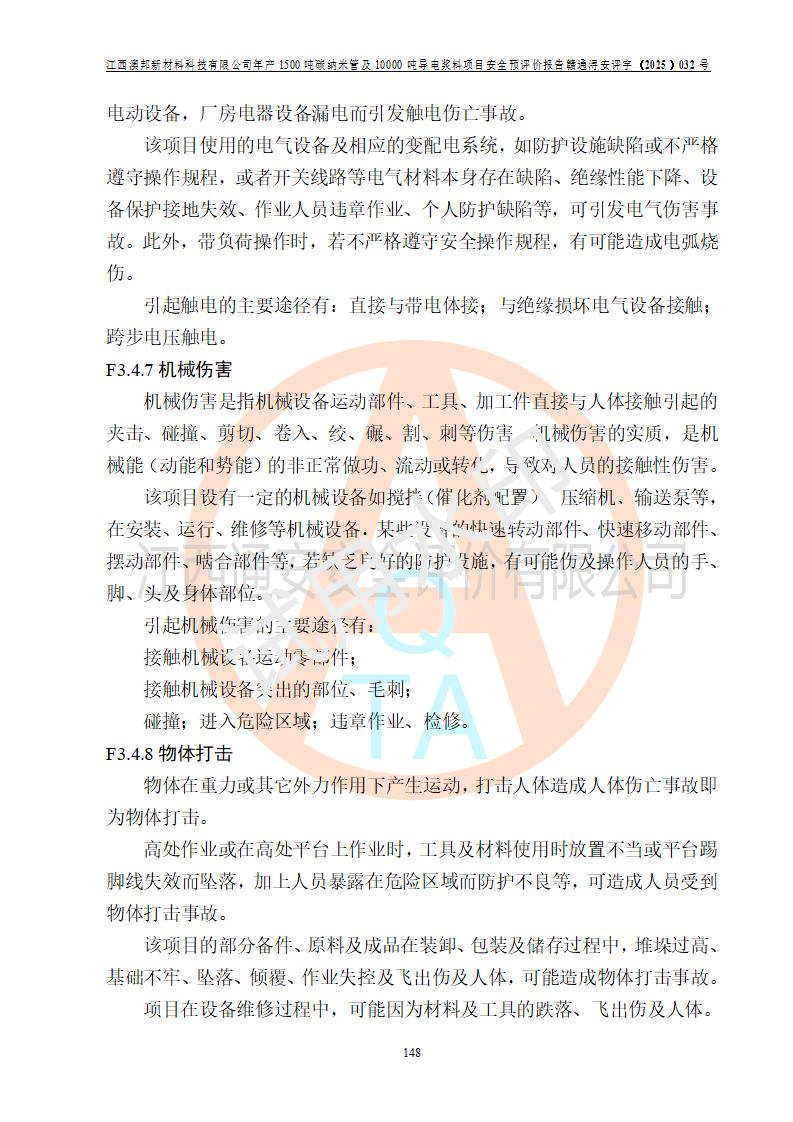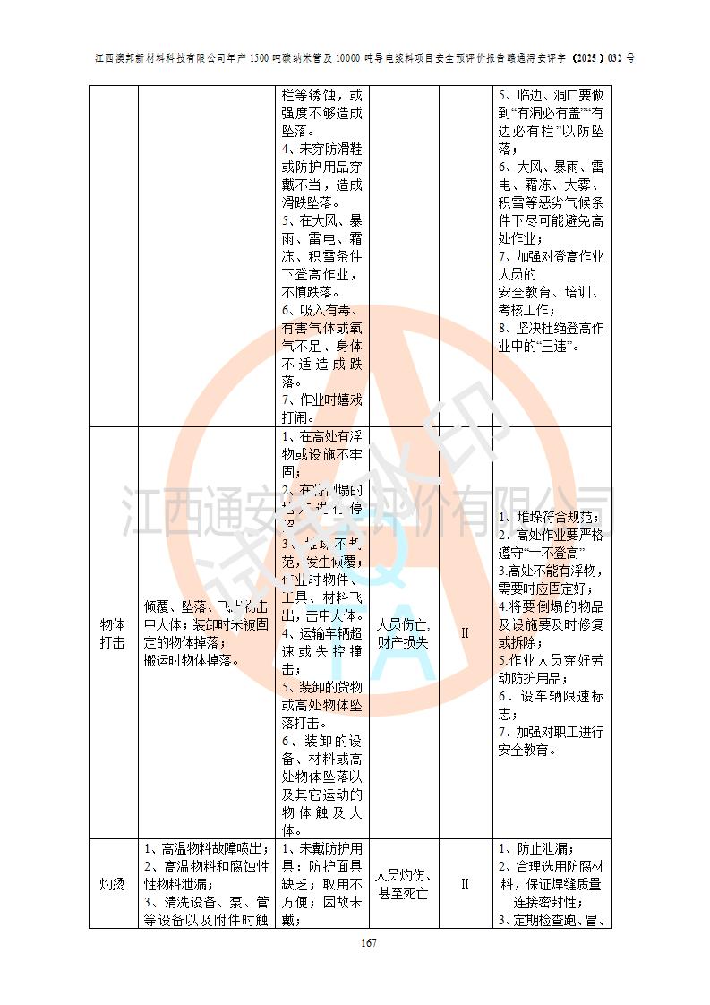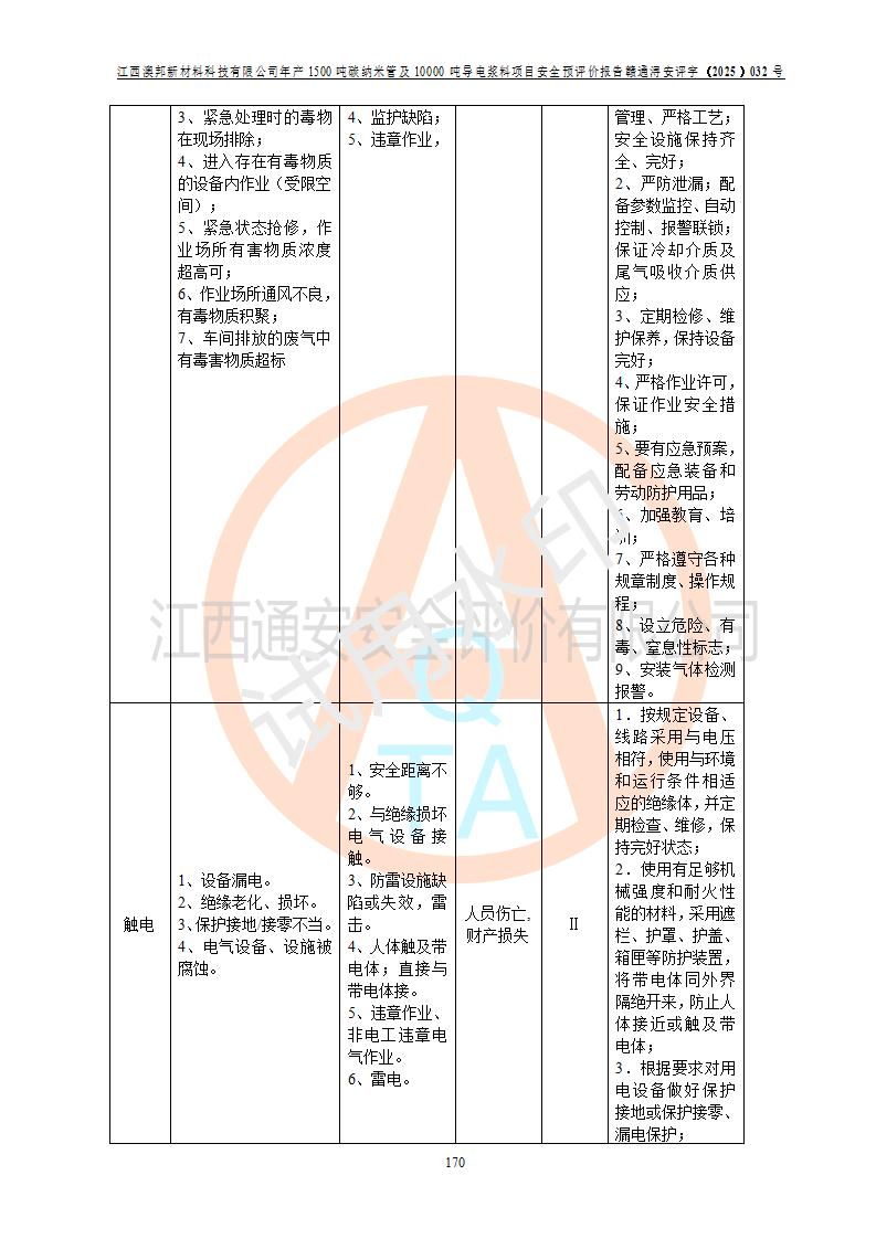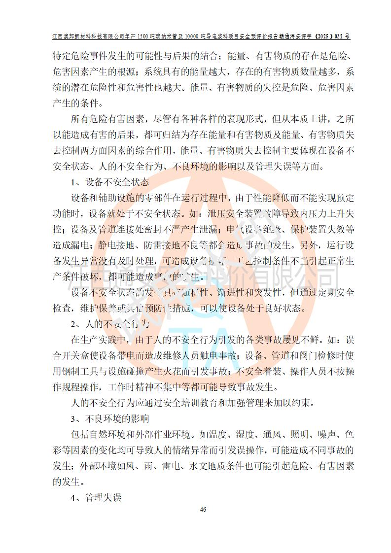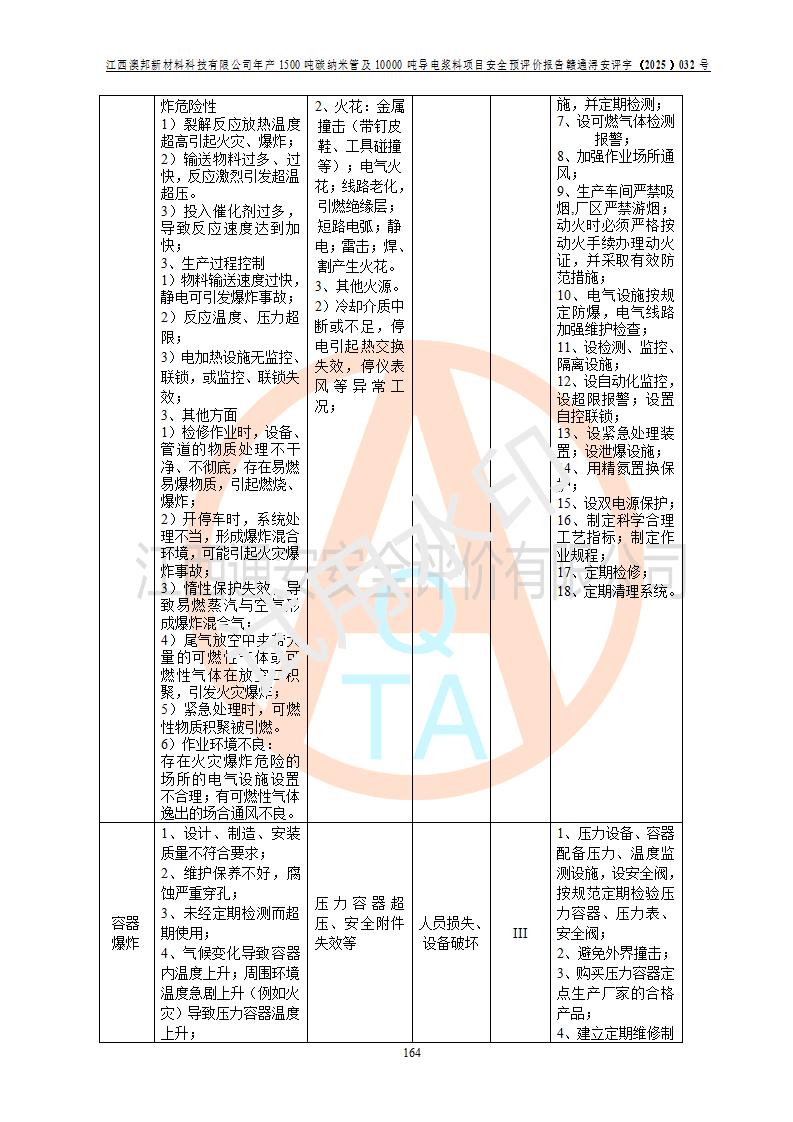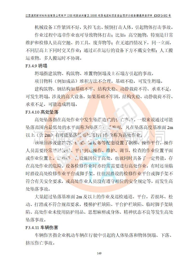 評(píng)價(jià)結(jié)論 | 江西澳邦新材料科技有限公司年產(chǎn) 1500 噸碳納米管及10000噸導(dǎo)電漿料項(xiàng)目的選址、總體布局、周邊環(huán)境、自然環(huán)境能滿足建設(shè)安全條件;項(xiàng)目選擇的工藝過程及設(shè)備設(shè)施的安全可靠性能達(dá)到**法規(guī)、標(biāo)準(zhǔn)規(guī)定要求。 項(xiàng)目存在的危險(xiǎn)有害因素可控,在落實(shí)本評(píng)價(jià)報(bào)告提出的有關(guān)安全對(duì)策措施后,其危險(xiǎn)有害程度能達(dá)到可以接受的程度,項(xiàng)目建設(shè)能夠?qū)崿F(xiàn)安全運(yùn)行的目標(biāo)。 | |||||