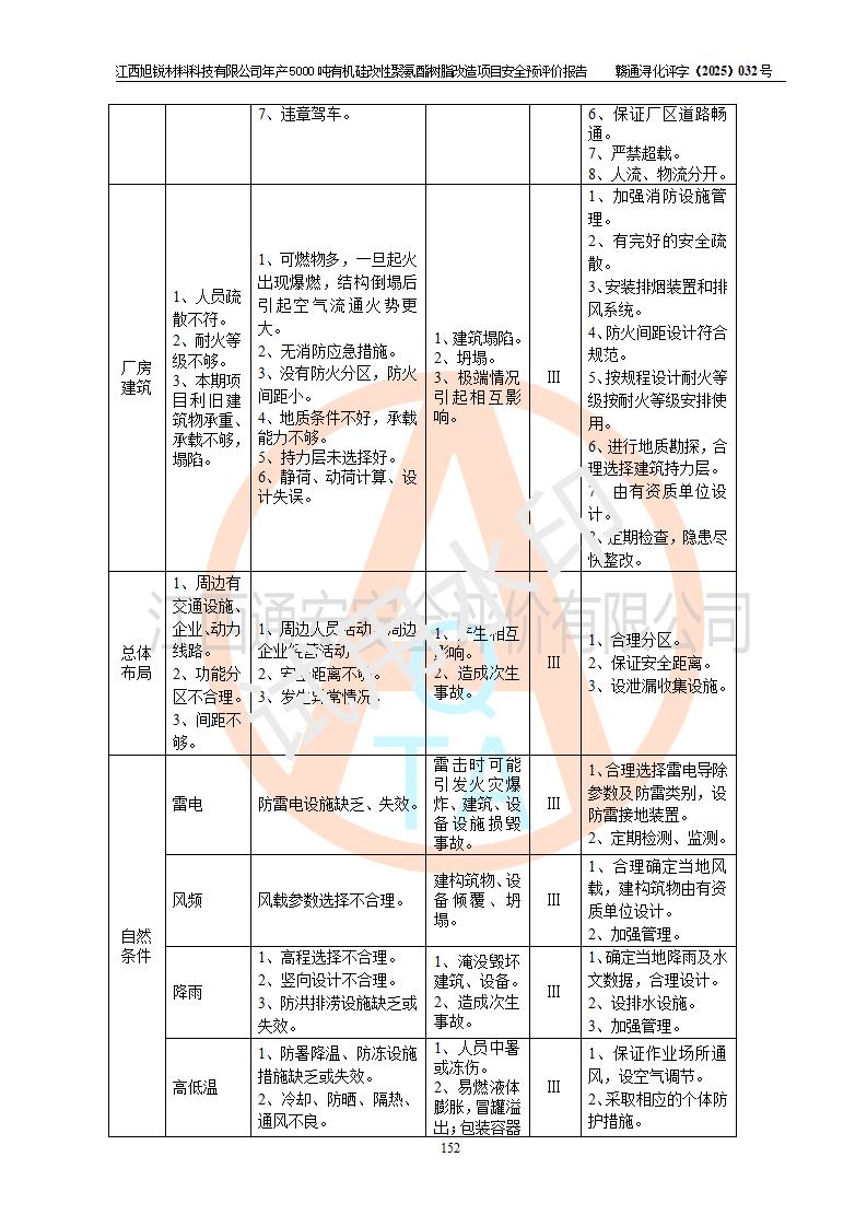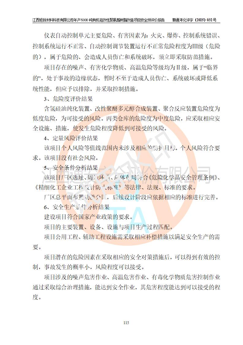 評價(jià)結(jié)論 | 江西旭銳材料科技有限公司年產(chǎn)5000噸有機(jī)硅改性聚氨酯樹脂改造項(xiàng)目的選址、總體布局、周邊環(huán)境、自然環(huán)境能滿足建設(shè)安全條件:項(xiàng)目選擇的工藝過程及設(shè)備設(shè)施的安全可靠性能達(dá)到**法規(guī)、標(biāo)準(zhǔn)規(guī)定要求。 項(xiàng)目存在的危險(xiǎn)有害因素可控,在落實(shí)本評價(jià)報(bào)告提出的有關(guān)安全對策措施后,其危險(xiǎn)有害程度能達(dá)到可以接受的程度,項(xiàng)目建設(shè)能夠?qū)崿F(xiàn)安全運(yùn)行的目標(biāo)。 | |||||