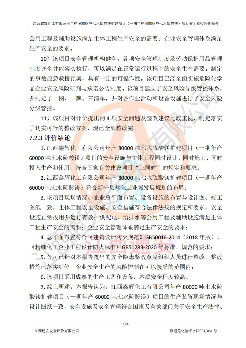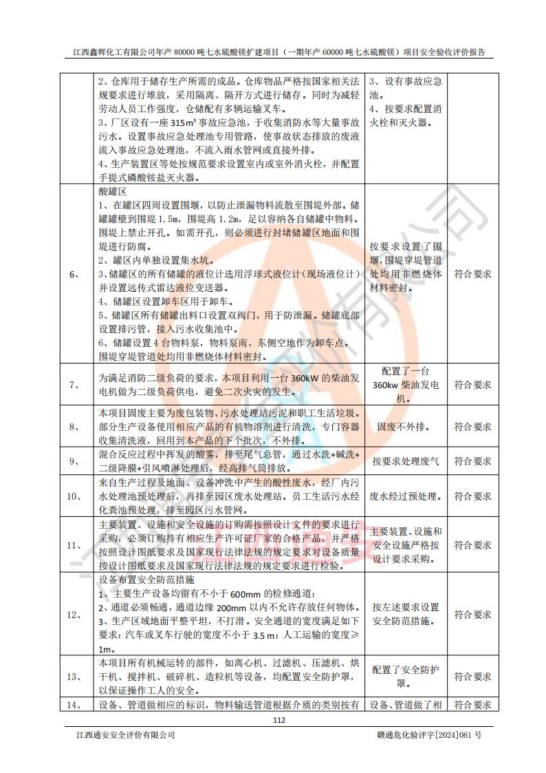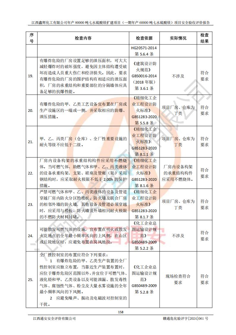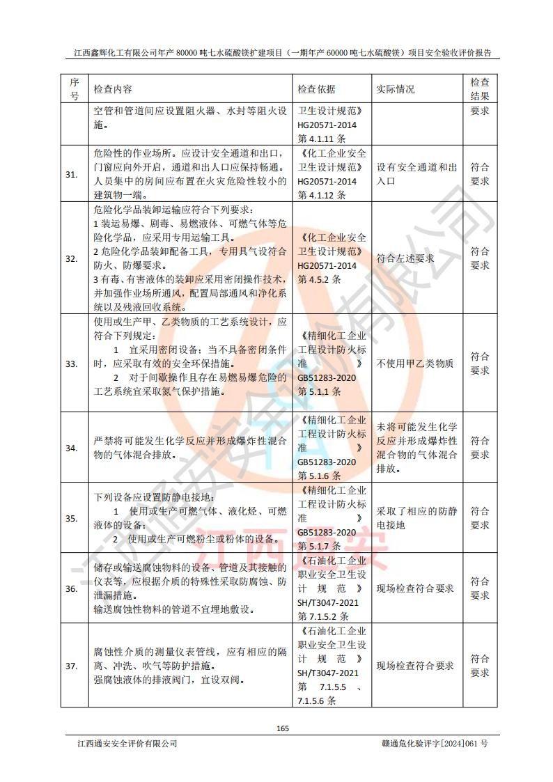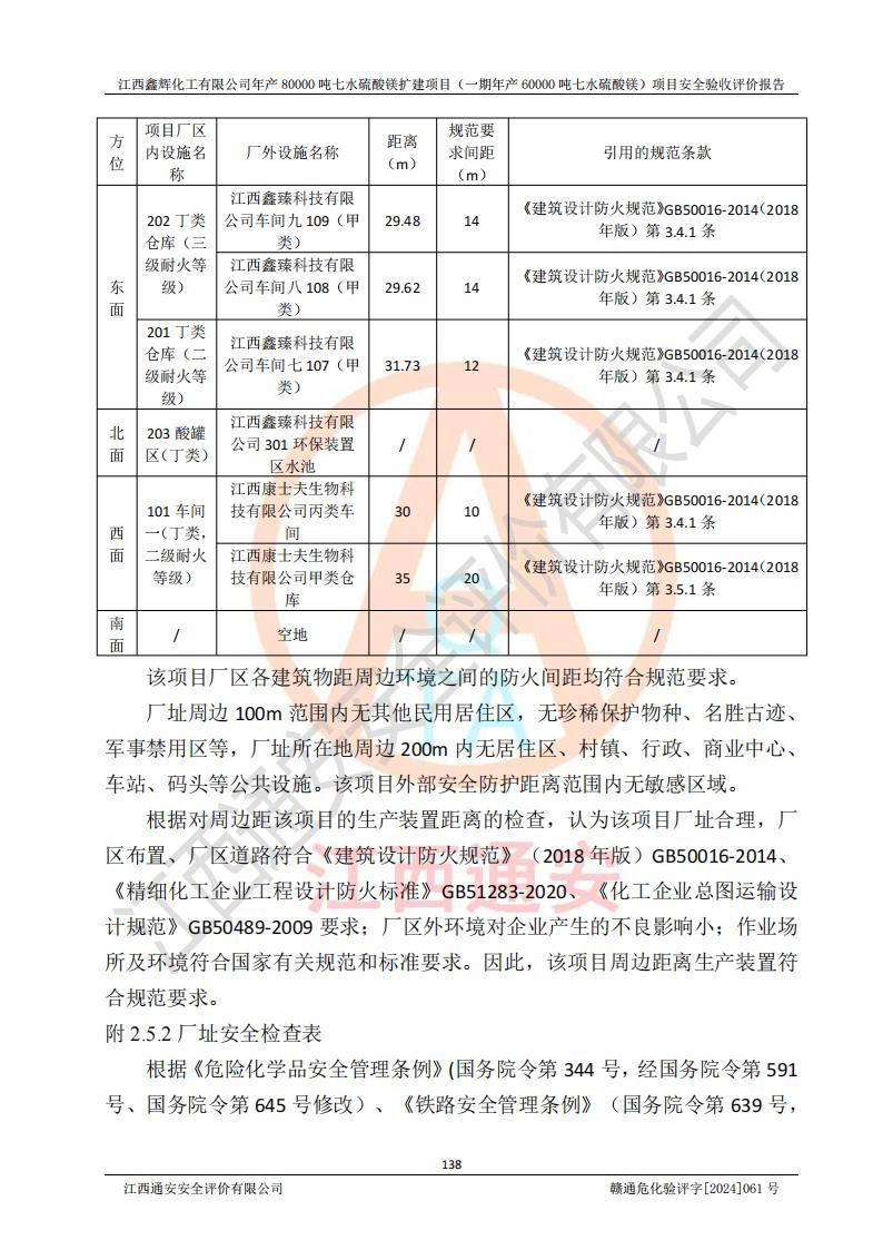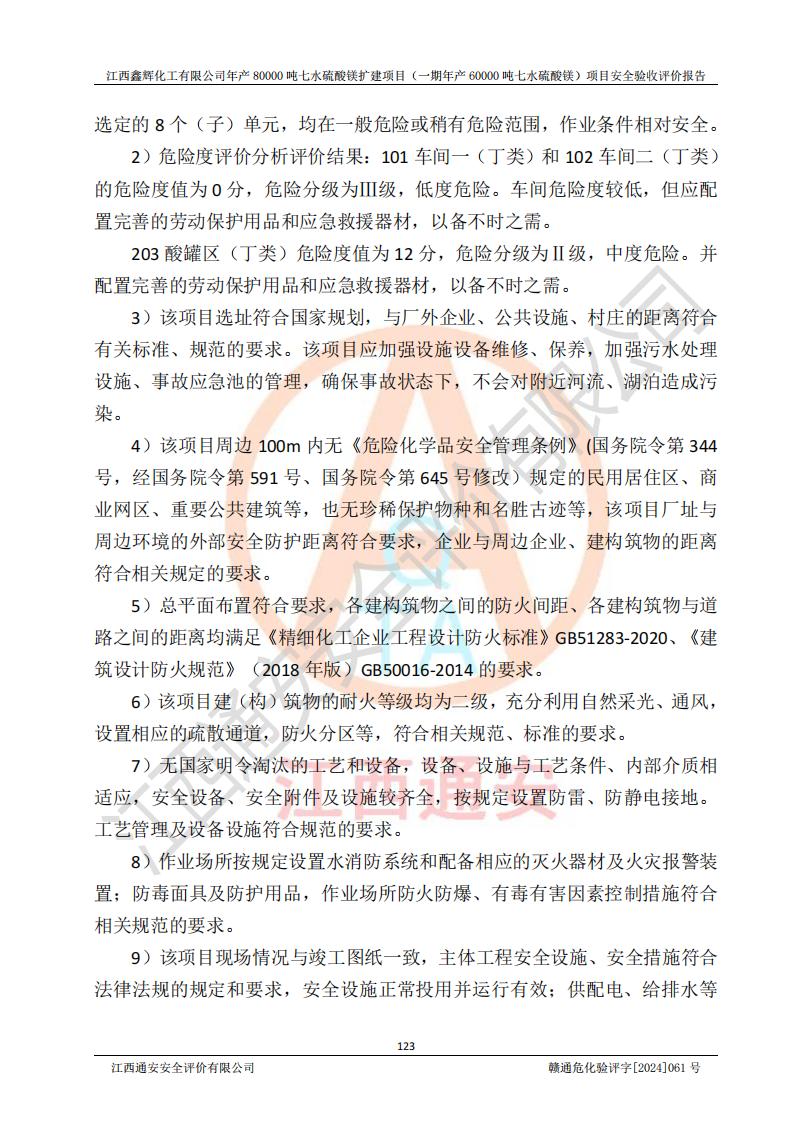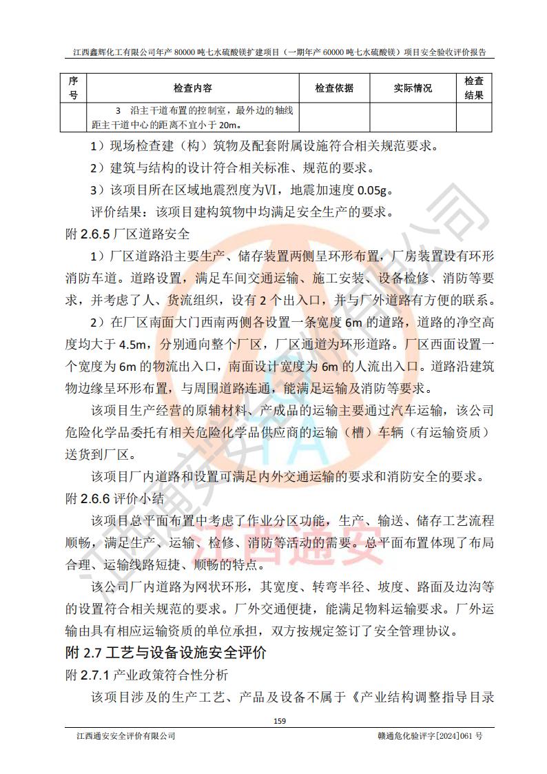 1. 江西鑫輝化工有限公司年產(chǎn)80000噸七水硫酸鎂擴(kuò)建項(xiàng)目(一期年產(chǎn)60000噸七水硫酸鎂)項(xiàng)目的安全設(shè)施與主體工程同時(shí)設(shè)計(jì)、同時(shí)施工、同時(shí)投入生產(chǎn)和使用,符合**有關(guān)建設(shè)項(xiàng)目“三同時(shí)”的規(guī)定和要求。 2. 江西鑫輝化工有限公司年產(chǎn)80000噸七水硫酸鎂擴(kuò)建項(xiàng)目(一期年產(chǎn)60000噸七水硫酸鎂)符合新干縣鹽化工業(yè)城發(fā)展規(guī)劃的布局; 3. 該項(xiàng)目現(xiàn)場情況、企業(yè)總平面布置、設(shè)備設(shè)施的布置與設(shè)計(jì)圖、竣工圖紙一致,主體工程安全設(shè)施、安全措施符合法律法規(guī)的規(guī)定和要求,安全設(shè)施正常投用并運(yùn)行**;供配電、給排水等公用工程及輔助設(shè)施滿足主體工程生產(chǎn)安全的需要;企業(yè)安全管理體系滿足生產(chǎn)安全的要求; 4. 總平面布置符合《建筑設(shè)計(jì)防火規(guī)范》GB50016-2014(2018年版)、《精細(xì)化工企業(yè)工程設(shè)計(jì)防火標(biāo)準(zhǔn)》GB51283-2020等標(biāo)準(zhǔn)、規(guī)范的要求; 5. 公司已針對(duì)本報(bào)告提出的安全隱患整改意見組織人員進(jìn)行整改,整改措施已落實(shí)到位,企業(yè)安全生產(chǎn)的風(fēng)險(xiǎn)控制在可以接受的范圍內(nèi); 6. 該項(xiàng)目采用成熟的生產(chǎn)工藝和設(shè)備,本質(zhì)安全程度較高。 7. 綜上所述:本報(bào)告認(rèn)為,江西鑫輝化工有限公司年產(chǎn)80000噸七水硫酸鎂擴(kuò)建項(xiàng)目(一期年產(chǎn)60000噸七水硫酸鎂)項(xiàng)目的生產(chǎn)裝置現(xiàn)場情況與設(shè)計(jì)圖紙一致,安全設(shè)施及安全管理符合**及有關(guān)部門關(guān)于安全生產(chǎn)法律、法規(guī)、標(biāo)準(zhǔn)的要求,安全風(fēng)險(xiǎn)是受控制的,其風(fēng)險(xiǎn)程度是可以接受的,符合安全生產(chǎn)條件,能夠滿足安全生產(chǎn)的要求,具備安全設(shè)施“三同時(shí)”驗(yàn)收條件。 |