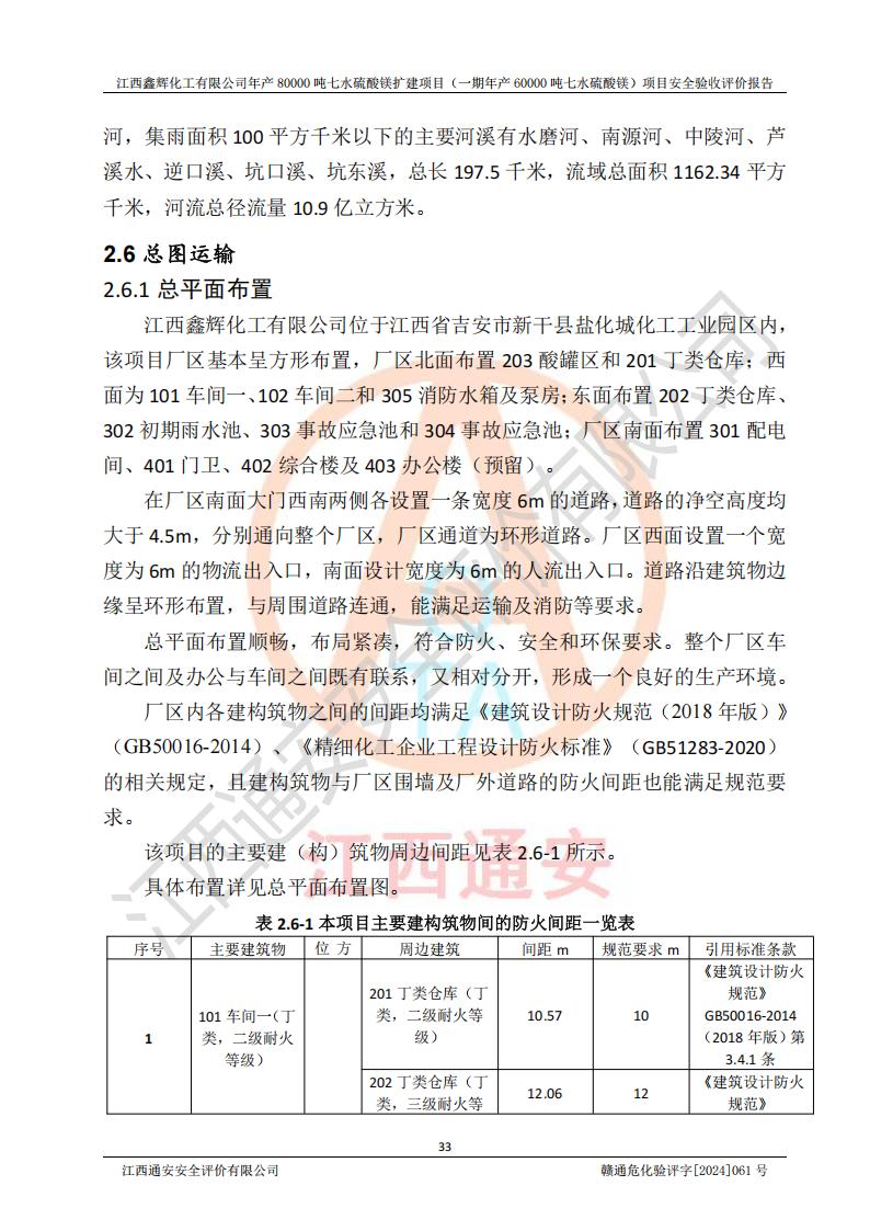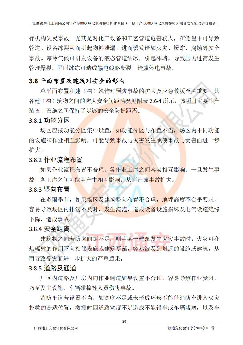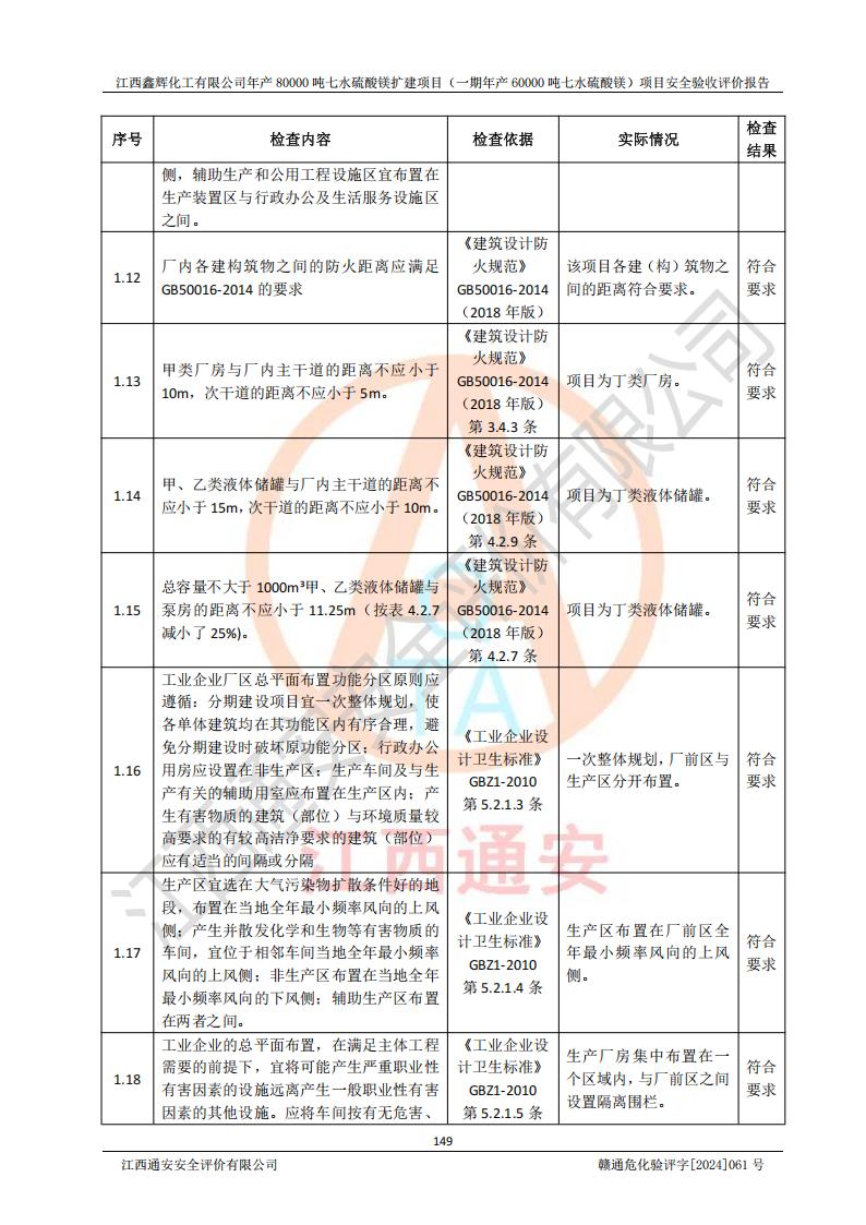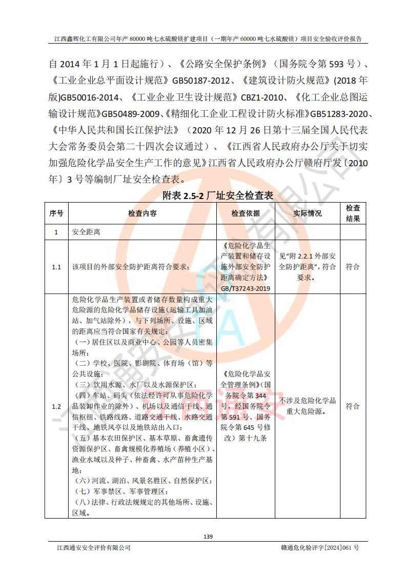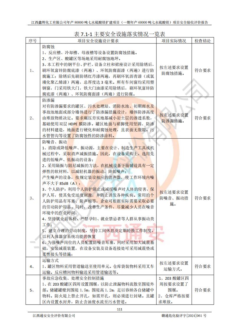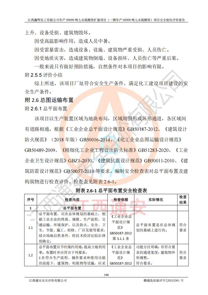 1. 江西鑫輝化工有限公司年產(chǎn)80000噸七水硫酸鎂擴(kuò)建項(xiàng)目(一期年產(chǎn)60000噸七水硫酸鎂)項(xiàng)目的安全設(shè)施與主體工程同時(shí)設(shè)計(jì)、同時(shí)施工、同時(shí)投入生產(chǎn)和使用,符合**有關(guān)建設(shè)項(xiàng)目“三同時(shí)”的規(guī)定和要求。 2. 江西鑫輝化工有限公司年產(chǎn)80000噸七水硫酸鎂擴(kuò)建項(xiàng)目(一期年產(chǎn)60000噸七水硫酸鎂)符合新干縣鹽化工業(yè)城發(fā)展規(guī)劃的布局; 3. 該項(xiàng)目現(xiàn)場情況、企業(yè)總平面布置、設(shè)備設(shè)施的布置與設(shè)計(jì)圖、竣工圖紙一致,主體工程安全設(shè)施、安全措施符合法律法規(guī)的規(guī)定和要求,安全設(shè)施正常投用并運(yùn)行**;供配電、給排水等公用工程及輔助設(shè)施滿足主體工程生產(chǎn)安全的需要;企業(yè)安全管理體系滿足生產(chǎn)安全的要求; 4. 總平面布置符合《建筑設(shè)計(jì)防火規(guī)范》GB50016-2014(2018年版)、《精細(xì)化工企業(yè)工程設(shè)計(jì)防火標(biāo)準(zhǔn)》GB51283-2020等標(biāo)準(zhǔn)、規(guī)范的要求; 5. 公司已針對(duì)本報(bào)告提出的安全隱患整改意見組織人員進(jìn)行整改,整改措施已落實(shí)到位,企業(yè)安全生產(chǎn)的風(fēng)險(xiǎn)控制在可以接受的范圍內(nèi); 6. 該項(xiàng)目采用成熟的生產(chǎn)工藝和設(shè)備,本質(zhì)安全程度較高。 7. 綜上所述:本報(bào)告認(rèn)為,江西鑫輝化工有限公司年產(chǎn)80000噸七水硫酸鎂擴(kuò)建項(xiàng)目(一期年產(chǎn)60000噸七水硫酸鎂)項(xiàng)目的生產(chǎn)裝置現(xiàn)場情況與設(shè)計(jì)圖紙一致,安全設(shè)施及安全管理符合**及有關(guān)部門關(guān)于安全生產(chǎn)法律、法規(guī)、標(biāo)準(zhǔn)的要求,安全風(fēng)險(xiǎn)是受控制的,其風(fēng)險(xiǎn)程度是可以接受的,符合安全生產(chǎn)條件,能夠滿足安全生產(chǎn)的要求,具備安全設(shè)施“三同時(shí)”驗(yàn)收條件。 |