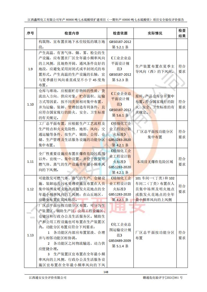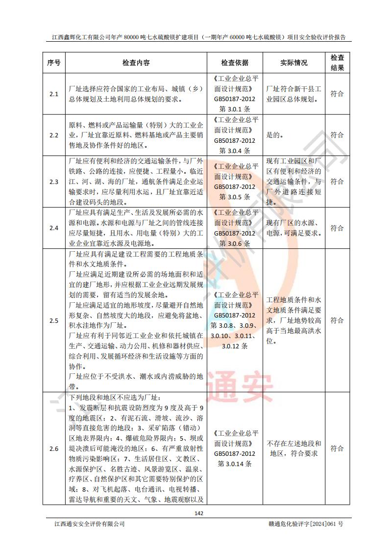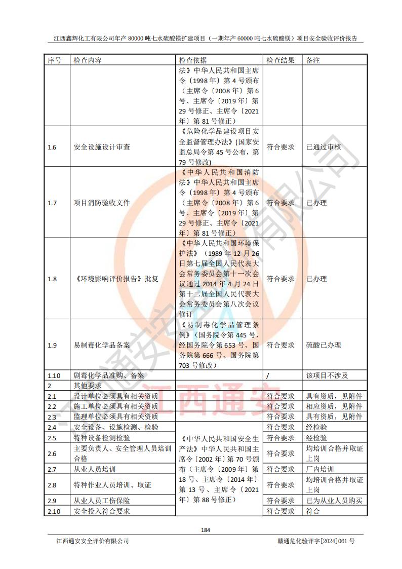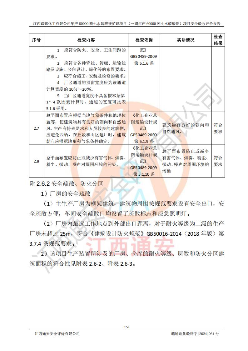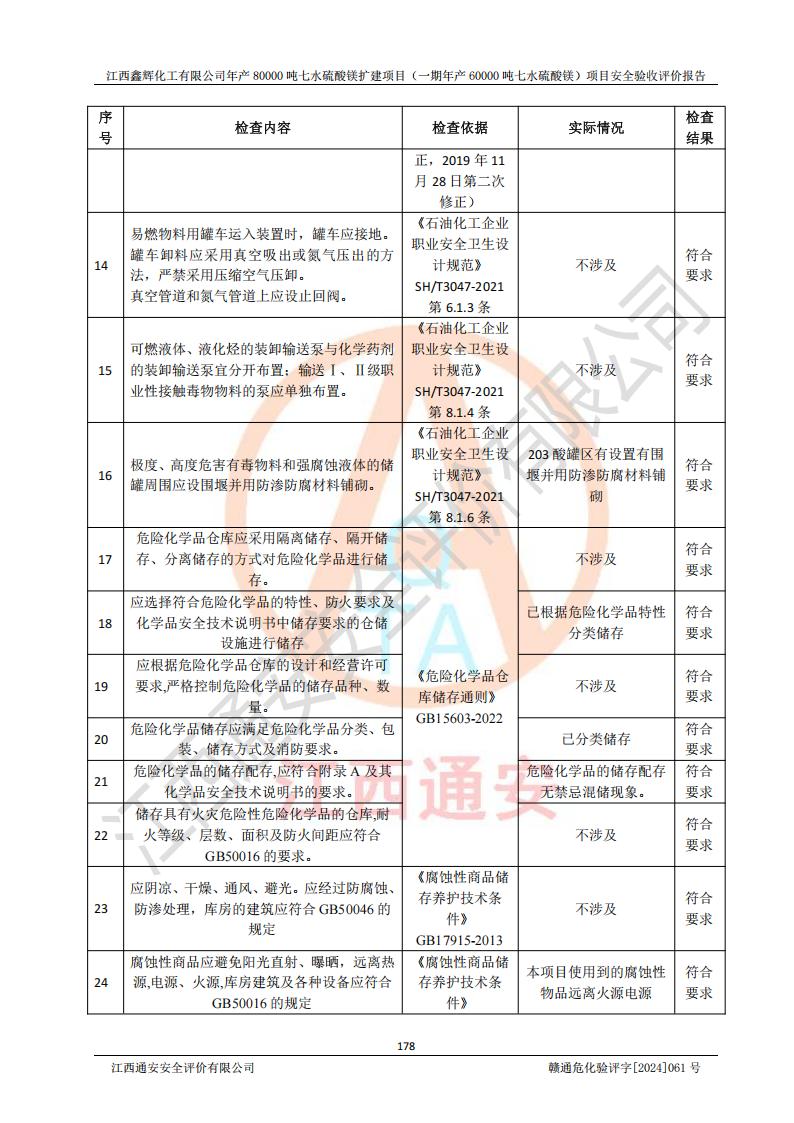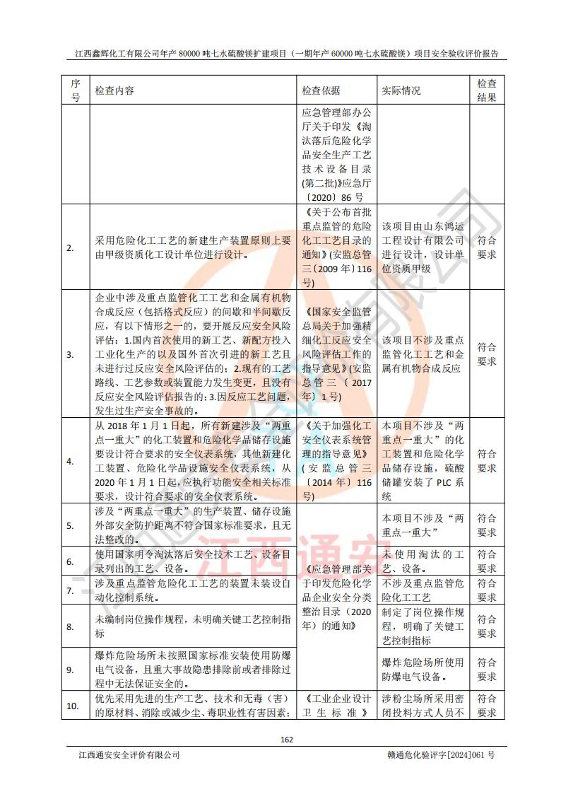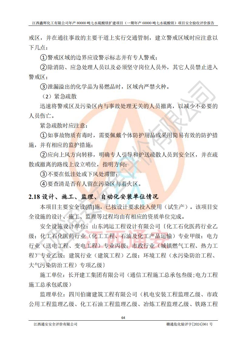 1. 江西鑫輝化工有限公司年產(chǎn)80000噸七水硫酸鎂擴(kuò)建項(xiàng)目(一期年產(chǎn)60000噸七水硫酸鎂)項(xiàng)目的安全設(shè)施與主體工程同時(shí)設(shè)計(jì)、同時(shí)施工、同時(shí)投入生產(chǎn)和使用,符合**有關(guān)建設(shè)項(xiàng)目“三同時(shí)”的規(guī)定和要求。 2. 江西鑫輝化工有限公司年產(chǎn)80000噸七水硫酸鎂擴(kuò)建項(xiàng)目(一期年產(chǎn)60000噸七水硫酸鎂)符合新干縣鹽化工業(yè)城發(fā)展規(guī)劃的布局; 3. 該項(xiàng)目現(xiàn)場情況、企業(yè)總平面布置、設(shè)備設(shè)施的布置與設(shè)計(jì)圖、竣工圖紙一致,主體工程安全設(shè)施、安全措施符合法律法規(guī)的規(guī)定和要求,安全設(shè)施正常投用并運(yùn)行**;供配電、給排水等公用工程及輔助設(shè)施滿足主體工程生產(chǎn)安全的需要;企業(yè)安全管理體系滿足生產(chǎn)安全的要求; 4. 總平面布置符合《建筑設(shè)計(jì)防火規(guī)范》GB50016-2014(2018年版)、《精細(xì)化工企業(yè)工程設(shè)計(jì)防火標(biāo)準(zhǔn)》GB51283-2020等標(biāo)準(zhǔn)、規(guī)范的要求; 5. 公司已針對(duì)本報(bào)告提出的安全隱患整改意見組織人員進(jìn)行整改,整改措施已落實(shí)到位,企業(yè)安全生產(chǎn)的風(fēng)險(xiǎn)控制在可以接受的范圍內(nèi); 6. 該項(xiàng)目采用成熟的生產(chǎn)工藝和設(shè)備,本質(zhì)安全程度較高。 7. 綜上所述:本報(bào)告認(rèn)為,江西鑫輝化工有限公司年產(chǎn)80000噸七水硫酸鎂擴(kuò)建項(xiàng)目(一期年產(chǎn)60000噸七水硫酸鎂)項(xiàng)目的生產(chǎn)裝置現(xiàn)場情況與設(shè)計(jì)圖紙一致,安全設(shè)施及安全管理符合**及有關(guān)部門關(guān)于安全生產(chǎn)法律、法規(guī)、標(biāo)準(zhǔn)的要求,安全風(fēng)險(xiǎn)是受控制的,其風(fēng)險(xiǎn)程度是可以接受的,符合安全生產(chǎn)條件,能夠滿足安全生產(chǎn)的要求,具備安全設(shè)施“三同時(shí)”驗(yàn)收條件。 |