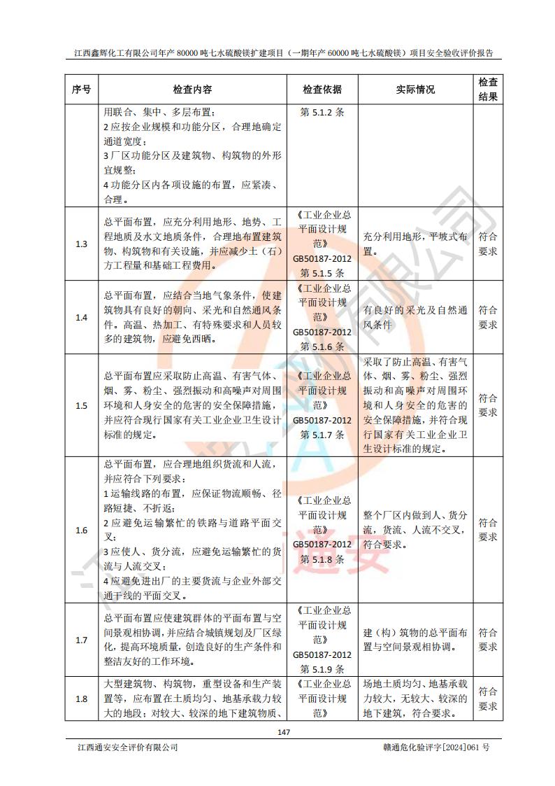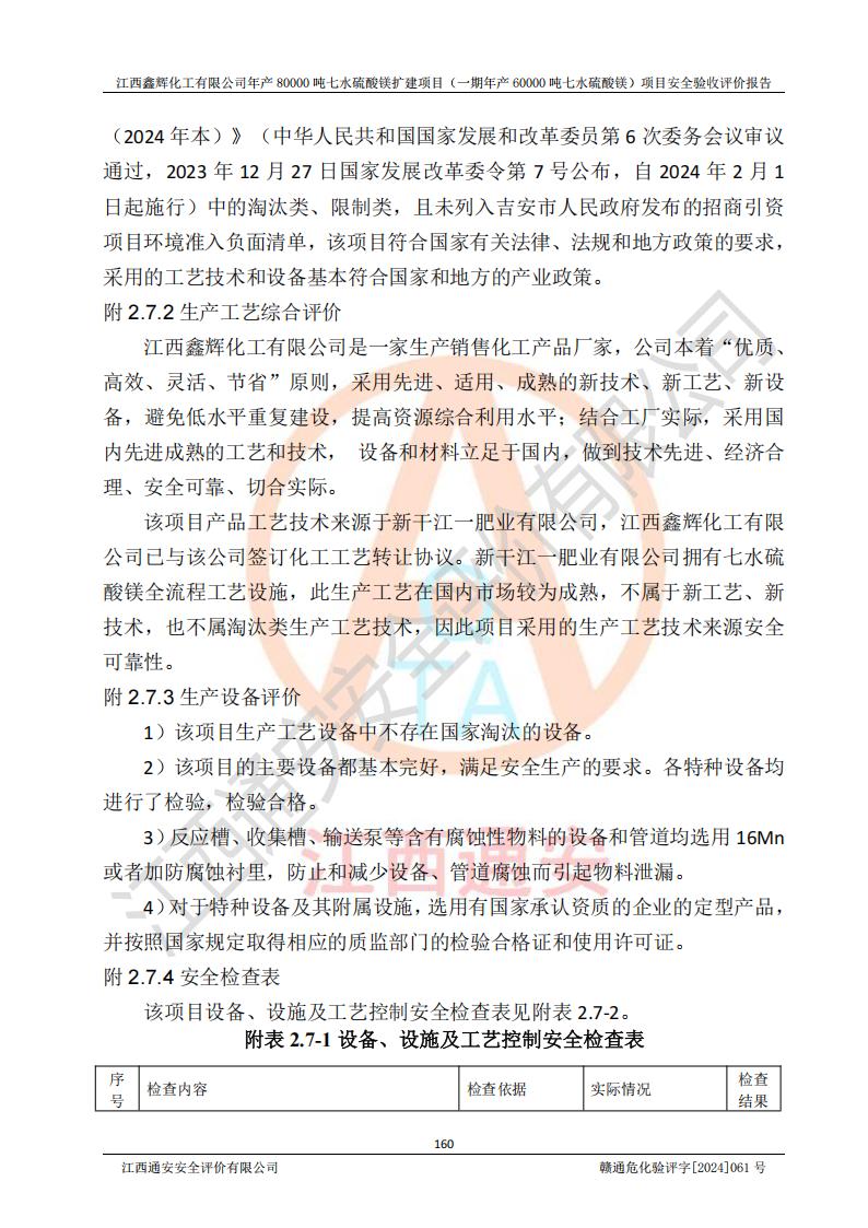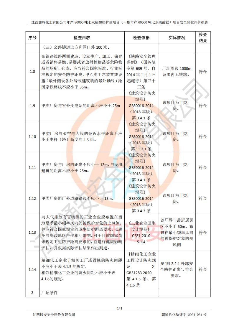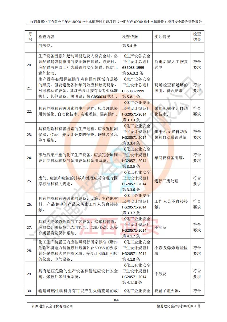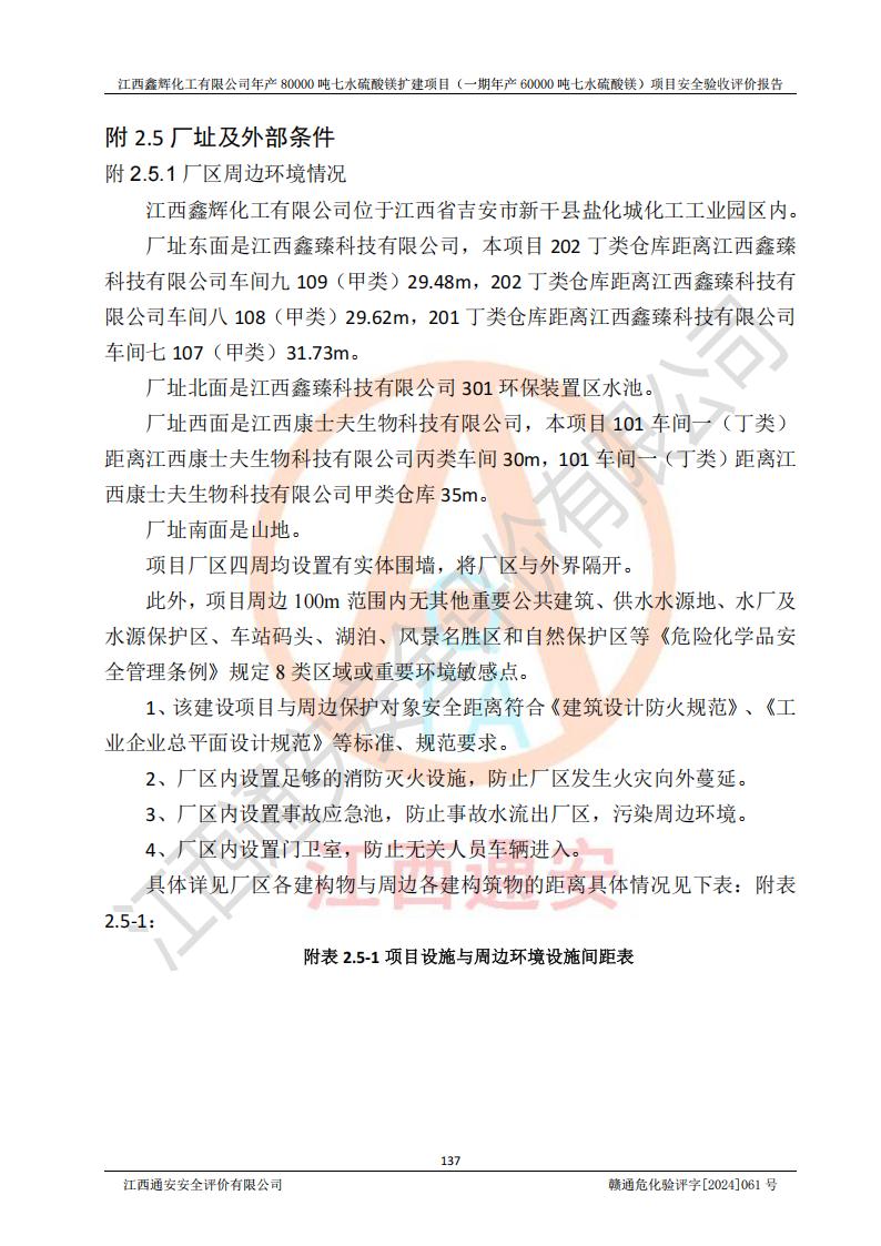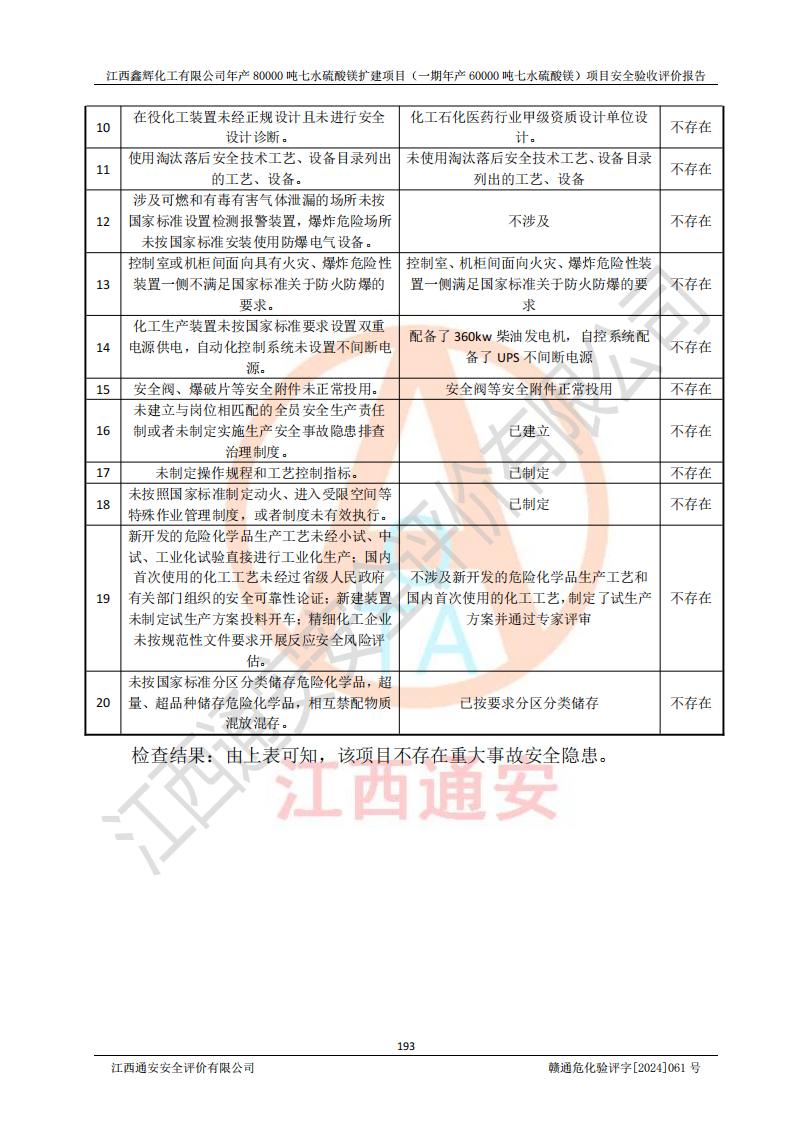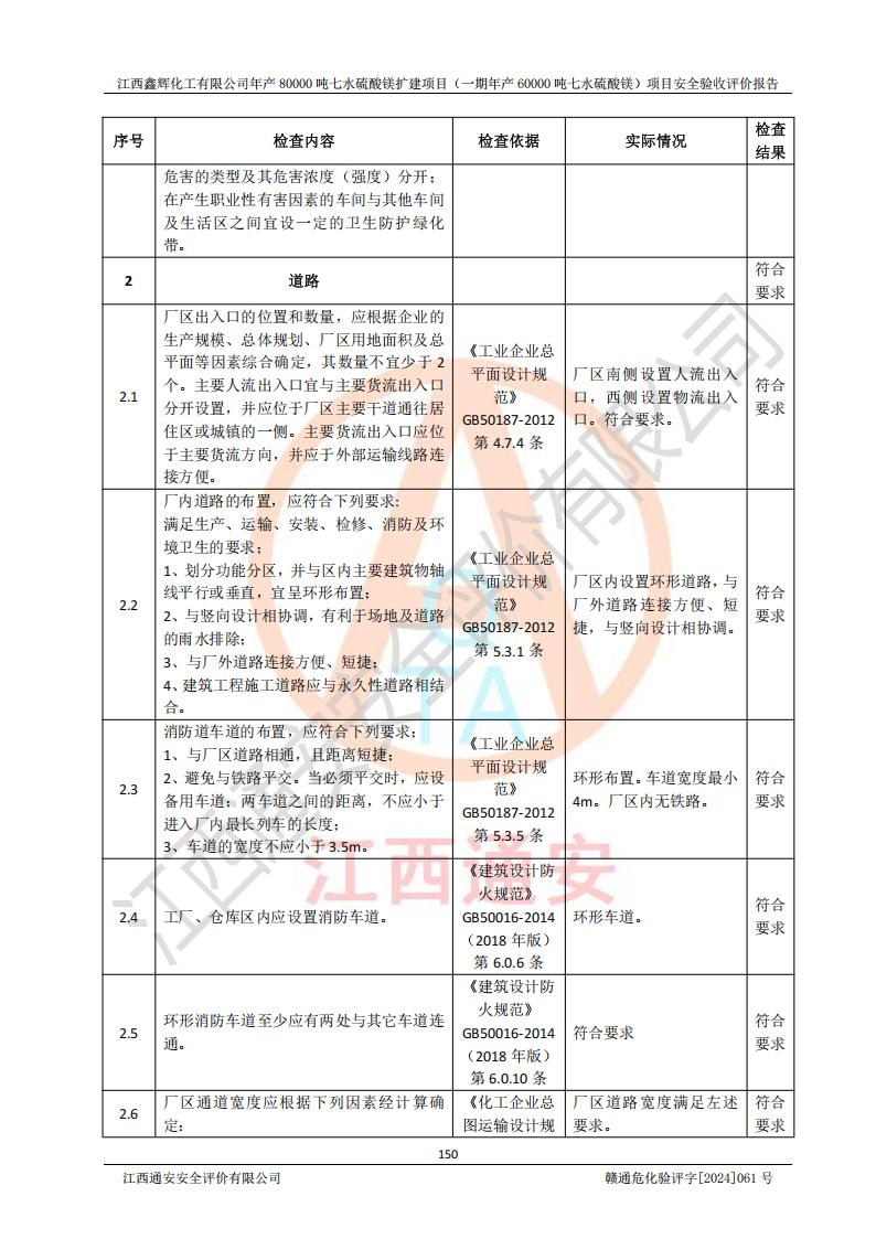 1. 江西鑫輝化工有限公司年產(chǎn)80000噸七水硫酸鎂擴(kuò)建項(xiàng)目(一期年產(chǎn)60000噸七水硫酸鎂)項(xiàng)目的安全設(shè)施與主體工程同時(shí)設(shè)計(jì)、同時(shí)施工、同時(shí)投入生產(chǎn)和使用,符合**有關(guān)建設(shè)項(xiàng)目“三同時(shí)”的規(guī)定和要求。 2. 江西鑫輝化工有限公司年產(chǎn)80000噸七水硫酸鎂擴(kuò)建項(xiàng)目(一期年產(chǎn)60000噸七水硫酸鎂)符合新干縣鹽化工業(yè)城發(fā)展規(guī)劃的布局; 3. 該項(xiàng)目現(xiàn)場情況、企業(yè)總平面布置、設(shè)備設(shè)施的布置與設(shè)計(jì)圖、竣工圖紙一致,主體工程安全設(shè)施、安全措施符合法律法規(guī)的規(guī)定和要求,安全設(shè)施正常投用并運(yùn)行**;供配電、給排水等公用工程及輔助設(shè)施滿足主體工程生產(chǎn)安全的需要;企業(yè)安全管理體系滿足生產(chǎn)安全的要求; 4. 總平面布置符合《建筑設(shè)計(jì)防火規(guī)范》GB50016-2014(2018年版)、《精細(xì)化工企業(yè)工程設(shè)計(jì)防火標(biāo)準(zhǔn)》GB51283-2020等標(biāo)準(zhǔn)、規(guī)范的要求; 5. 公司已針對(duì)本報(bào)告提出的安全隱患整改意見組織人員進(jìn)行整改,整改措施已落實(shí)到位,企業(yè)安全生產(chǎn)的風(fēng)險(xiǎn)控制在可以接受的范圍內(nèi); 6. 該項(xiàng)目采用成熟的生產(chǎn)工藝和設(shè)備,本質(zhì)安全程度較高。 7. 綜上所述:本報(bào)告認(rèn)為,江西鑫輝化工有限公司年產(chǎn)80000噸七水硫酸鎂擴(kuò)建項(xiàng)目(一期年產(chǎn)60000噸七水硫酸鎂)項(xiàng)目的生產(chǎn)裝置現(xiàn)場情況與設(shè)計(jì)圖紙一致,安全設(shè)施及安全管理符合**及有關(guān)部門關(guān)于安全生產(chǎn)法律、法規(guī)、標(biāo)準(zhǔn)的要求,安全風(fēng)險(xiǎn)是受控制的,其風(fēng)險(xiǎn)程度是可以接受的,符合安全生產(chǎn)條件,能夠滿足安全生產(chǎn)的要求,具備安全設(shè)施“三同時(shí)”驗(yàn)收條件。 |