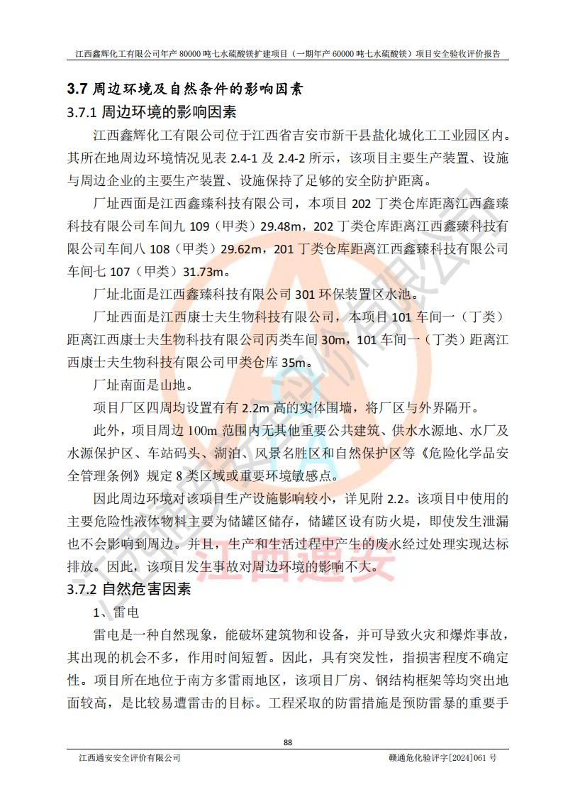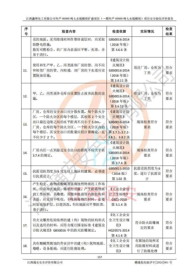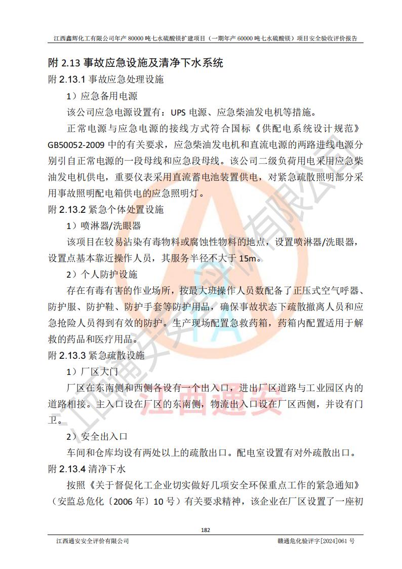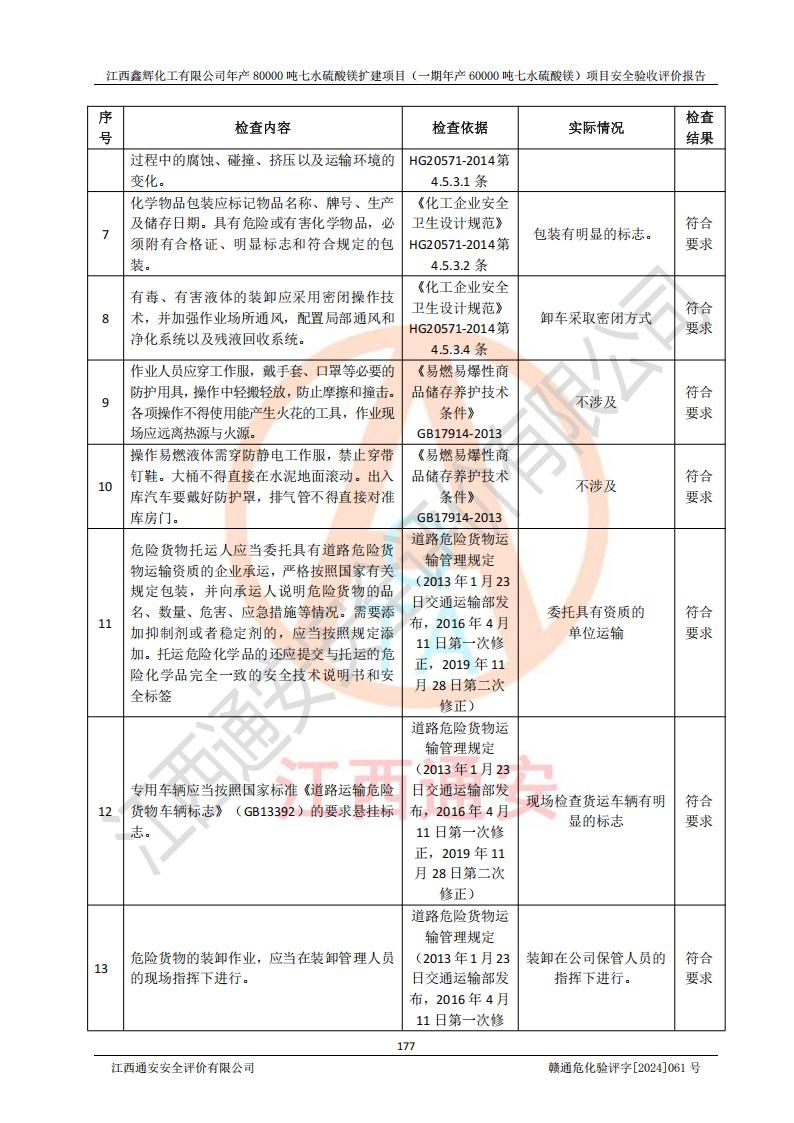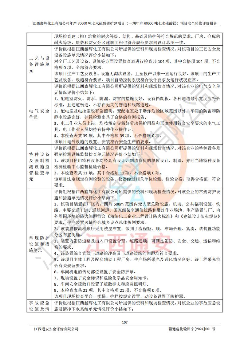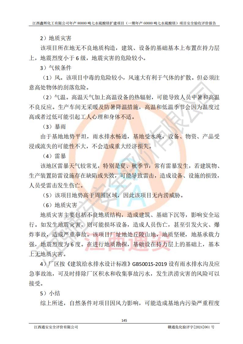 1. 江西鑫輝化工有限公司年產(chǎn)80000噸七水硫酸鎂擴(kuò)建項(xiàng)目(一期年產(chǎn)60000噸七水硫酸鎂)項(xiàng)目的安全設(shè)施與主體工程同時(shí)設(shè)計(jì)、同時(shí)施工、同時(shí)投入生產(chǎn)和使用,符合**有關(guān)建設(shè)項(xiàng)目“三同時(shí)”的規(guī)定和要求。 2. 江西鑫輝化工有限公司年產(chǎn)80000噸七水硫酸鎂擴(kuò)建項(xiàng)目(一期年產(chǎn)60000噸七水硫酸鎂)符合新干縣鹽化工業(yè)城發(fā)展規(guī)劃的布局; 3. 該項(xiàng)目現(xiàn)場情況、企業(yè)總平面布置、設(shè)備設(shè)施的布置與設(shè)計(jì)圖、竣工圖紙一致,主體工程安全設(shè)施、安全措施符合法律法規(guī)的規(guī)定和要求,安全設(shè)施正常投用并運(yùn)行**;供配電、給排水等公用工程及輔助設(shè)施滿足主體工程生產(chǎn)安全的需要;企業(yè)安全管理體系滿足生產(chǎn)安全的要求; 4. 總平面布置符合《建筑設(shè)計(jì)防火規(guī)范》GB50016-2014(2018年版)、《精細(xì)化工企業(yè)工程設(shè)計(jì)防火標(biāo)準(zhǔn)》GB51283-2020等標(biāo)準(zhǔn)、規(guī)范的要求; 5. 公司已針對(duì)本報(bào)告提出的安全隱患整改意見組織人員進(jìn)行整改,整改措施已落實(shí)到位,企業(yè)安全生產(chǎn)的風(fēng)險(xiǎn)控制在可以接受的范圍內(nèi); 6. 該項(xiàng)目采用成熟的生產(chǎn)工藝和設(shè)備,本質(zhì)安全程度較高。 7. 綜上所述:本報(bào)告認(rèn)為,江西鑫輝化工有限公司年產(chǎn)80000噸七水硫酸鎂擴(kuò)建項(xiàng)目(一期年產(chǎn)60000噸七水硫酸鎂)項(xiàng)目的生產(chǎn)裝置現(xiàn)場情況與設(shè)計(jì)圖紙一致,安全設(shè)施及安全管理符合**及有關(guān)部門關(guān)于安全生產(chǎn)法律、法規(guī)、標(biāo)準(zhǔn)的要求,安全風(fēng)險(xiǎn)是受控制的,其風(fēng)險(xiǎn)程度是可以接受的,符合安全生產(chǎn)條件,能夠滿足安全生產(chǎn)的要求,具備安全設(shè)施“三同時(shí)”驗(yàn)收條件。 |