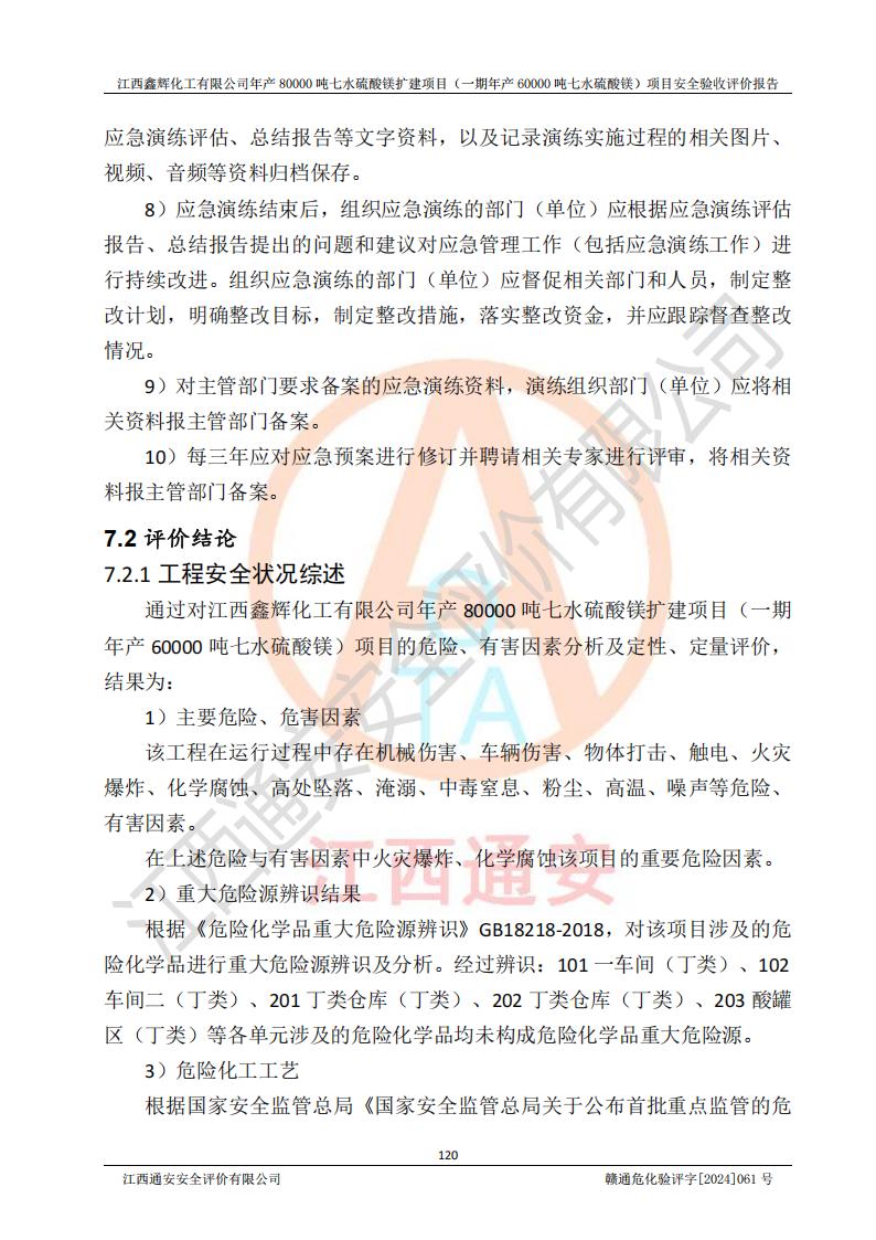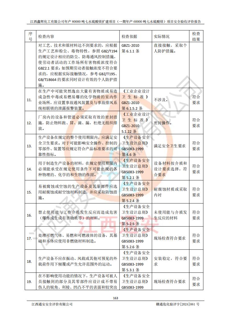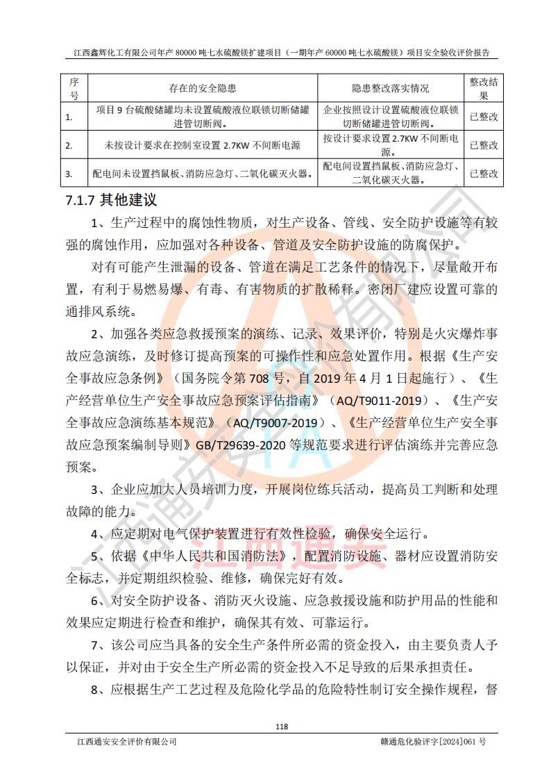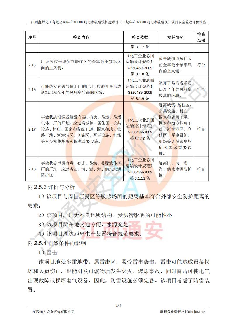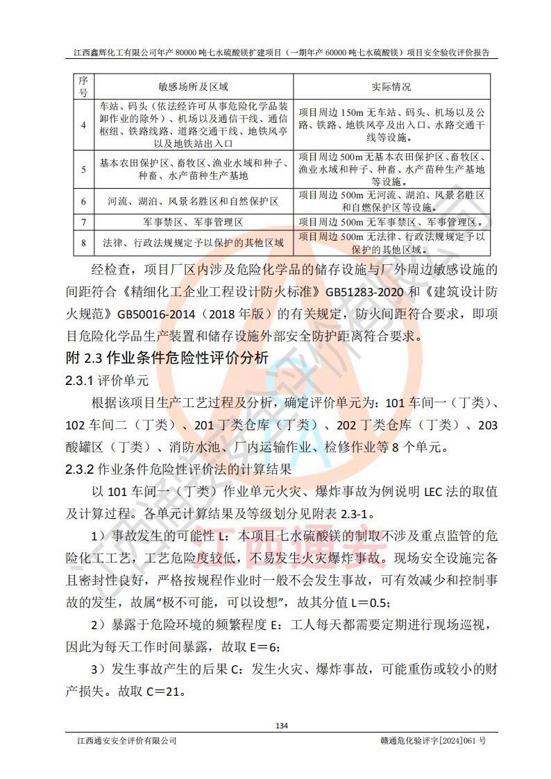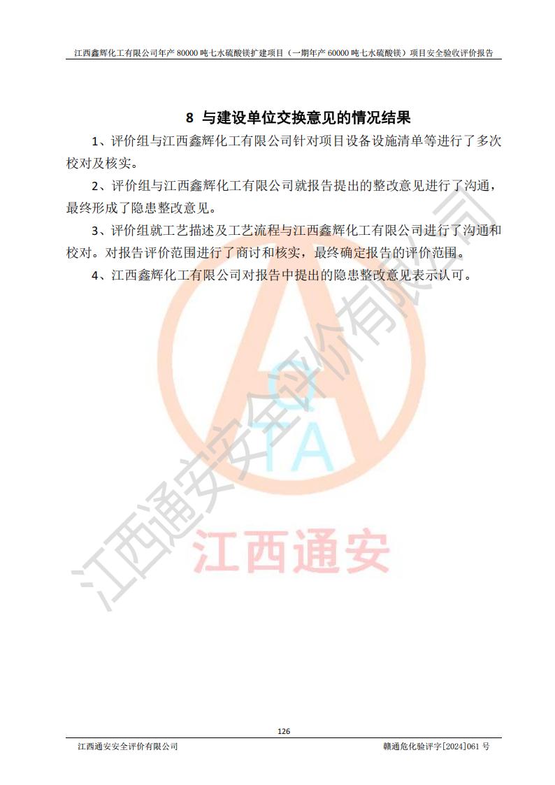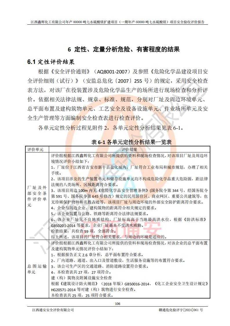 1. 江西鑫輝化工有限公司年產(chǎn)80000噸七水硫酸鎂擴(kuò)建項(xiàng)目(一期年產(chǎn)60000噸七水硫酸鎂)項(xiàng)目的安全設(shè)施與主體工程同時(shí)設(shè)計(jì)、同時(shí)施工、同時(shí)投入生產(chǎn)和使用,符合**有關(guān)建設(shè)項(xiàng)目“三同時(shí)”的規(guī)定和要求。 2. 江西鑫輝化工有限公司年產(chǎn)80000噸七水硫酸鎂擴(kuò)建項(xiàng)目(一期年產(chǎn)60000噸七水硫酸鎂)符合新干縣鹽化工業(yè)城發(fā)展規(guī)劃的布局; 3. 該項(xiàng)目現(xiàn)場情況、企業(yè)總平面布置、設(shè)備設(shè)施的布置與設(shè)計(jì)圖、竣工圖紙一致,主體工程安全設(shè)施、安全措施符合法律法規(guī)的規(guī)定和要求,安全設(shè)施正常投用并運(yùn)行**;供配電、給排水等公用工程及輔助設(shè)施滿足主體工程生產(chǎn)安全的需要;企業(yè)安全管理體系滿足生產(chǎn)安全的要求; 4. 總平面布置符合《建筑設(shè)計(jì)防火規(guī)范》GB50016-2014(2018年版)、《精細(xì)化工企業(yè)工程設(shè)計(jì)防火標(biāo)準(zhǔn)》GB51283-2020等標(biāo)準(zhǔn)、規(guī)范的要求; 5. 公司已針對(duì)本報(bào)告提出的安全隱患整改意見組織人員進(jìn)行整改,整改措施已落實(shí)到位,企業(yè)安全生產(chǎn)的風(fēng)險(xiǎn)控制在可以接受的范圍內(nèi); 6. 該項(xiàng)目采用成熟的生產(chǎn)工藝和設(shè)備,本質(zhì)安全程度較高。 7. 綜上所述:本報(bào)告認(rèn)為,江西鑫輝化工有限公司年產(chǎn)80000噸七水硫酸鎂擴(kuò)建項(xiàng)目(一期年產(chǎn)60000噸七水硫酸鎂)項(xiàng)目的生產(chǎn)裝置現(xiàn)場情況與設(shè)計(jì)圖紙一致,安全設(shè)施及安全管理符合**及有關(guān)部門關(guān)于安全生產(chǎn)法律、法規(guī)、標(biāo)準(zhǔn)的要求,安全風(fēng)險(xiǎn)是受控制的,其風(fēng)險(xiǎn)程度是可以接受的,符合安全生產(chǎn)條件,能夠滿足安全生產(chǎn)的要求,具備安全設(shè)施“三同時(shí)”驗(yàn)收條件。 |
