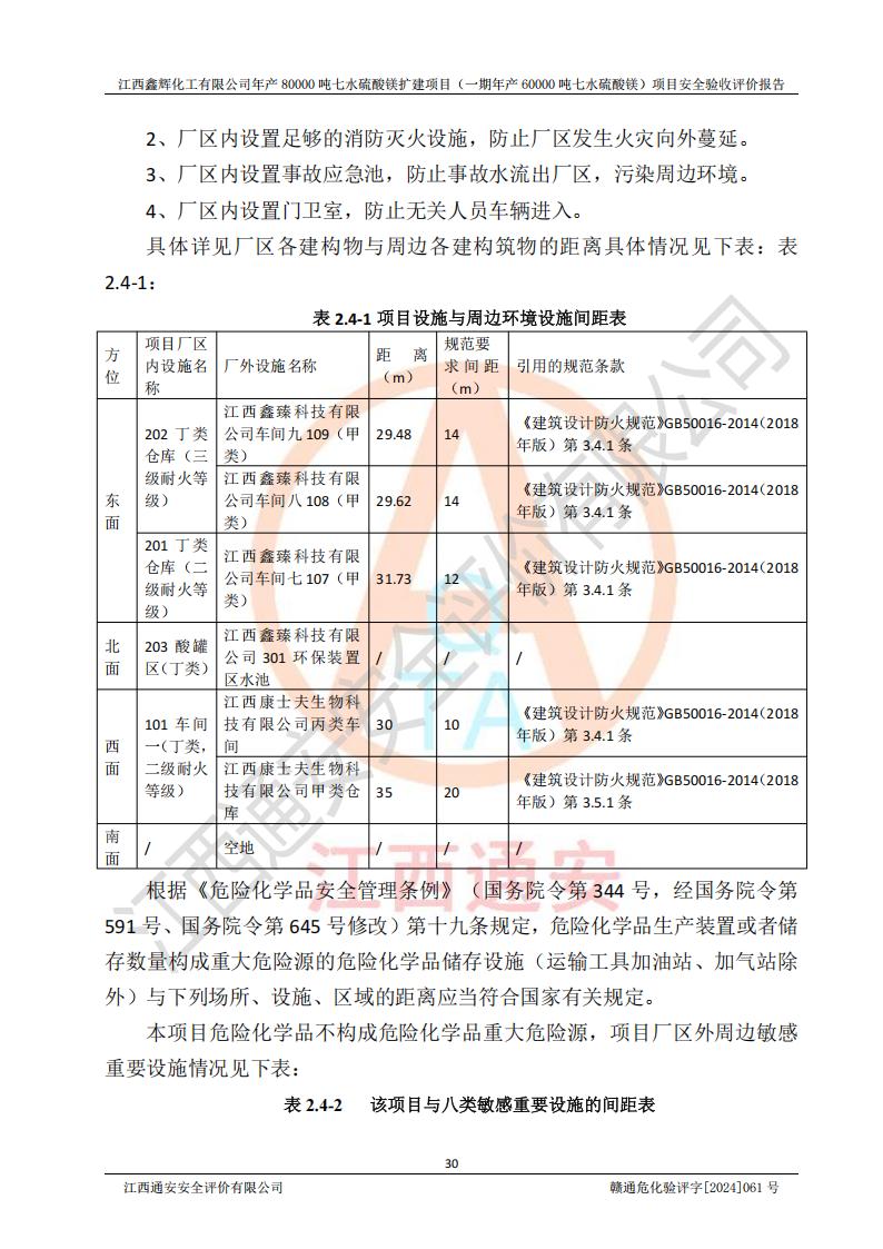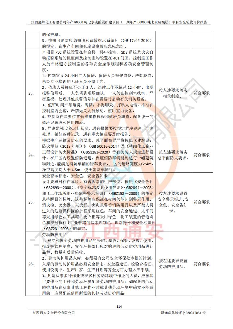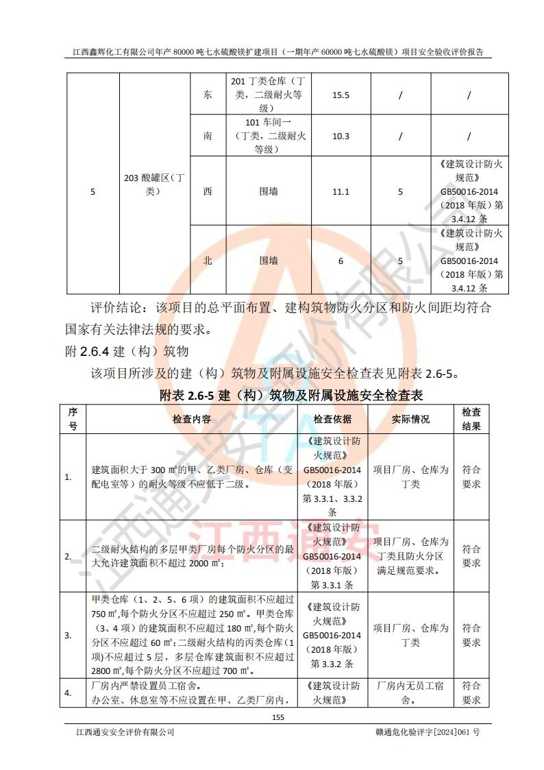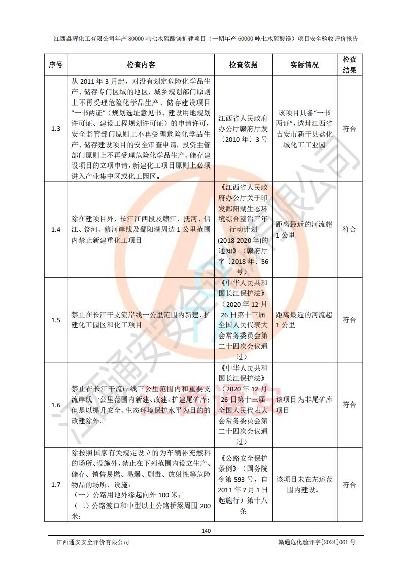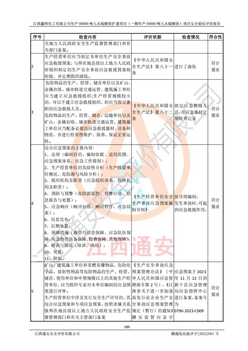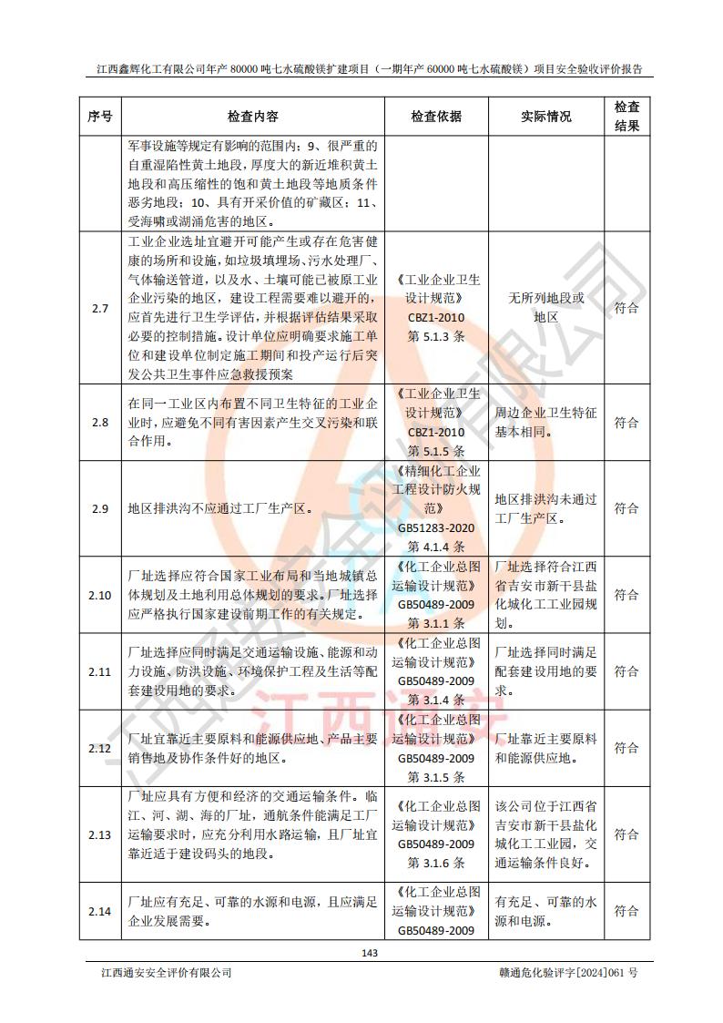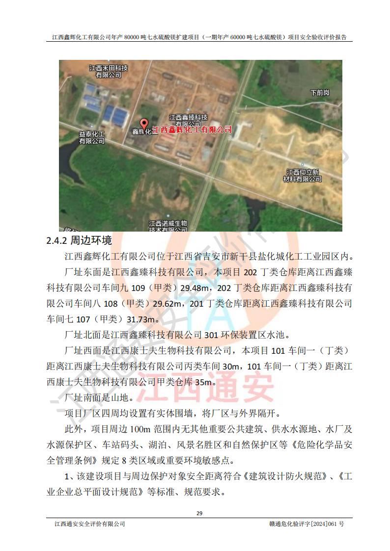 1. 江西鑫輝化工有限公司年產(chǎn)80000噸七水硫酸鎂擴(kuò)建項(xiàng)目(一期年產(chǎn)60000噸七水硫酸鎂)項(xiàng)目的安全設(shè)施與主體工程同時(shí)設(shè)計(jì)、同時(shí)施工、同時(shí)投入生產(chǎn)和使用,符合**有關(guān)建設(shè)項(xiàng)目“三同時(shí)”的規(guī)定和要求。 2. 江西鑫輝化工有限公司年產(chǎn)80000噸七水硫酸鎂擴(kuò)建項(xiàng)目(一期年產(chǎn)60000噸七水硫酸鎂)符合新干縣鹽化工業(yè)城發(fā)展規(guī)劃的布局; 3. 該項(xiàng)目現(xiàn)場情況、企業(yè)總平面布置、設(shè)備設(shè)施的布置與設(shè)計(jì)圖、竣工圖紙一致,主體工程安全設(shè)施、安全措施符合法律法規(guī)的規(guī)定和要求,安全設(shè)施正常投用并運(yùn)行**;供配電、給排水等公用工程及輔助設(shè)施滿足主體工程生產(chǎn)安全的需要;企業(yè)安全管理體系滿足生產(chǎn)安全的要求; 4. 總平面布置符合《建筑設(shè)計(jì)防火規(guī)范》GB50016-2014(2018年版)、《精細(xì)化工企業(yè)工程設(shè)計(jì)防火標(biāo)準(zhǔn)》GB51283-2020等標(biāo)準(zhǔn)、規(guī)范的要求; 5. 公司已針對(duì)本報(bào)告提出的安全隱患整改意見組織人員進(jìn)行整改,整改措施已落實(shí)到位,企業(yè)安全生產(chǎn)的風(fēng)險(xiǎn)控制在可以接受的范圍內(nèi); 6. 該項(xiàng)目采用成熟的生產(chǎn)工藝和設(shè)備,本質(zhì)安全程度較高。 7. 綜上所述:本報(bào)告認(rèn)為,江西鑫輝化工有限公司年產(chǎn)80000噸七水硫酸鎂擴(kuò)建項(xiàng)目(一期年產(chǎn)60000噸七水硫酸鎂)項(xiàng)目的生產(chǎn)裝置現(xiàn)場情況與設(shè)計(jì)圖紙一致,安全設(shè)施及安全管理符合**及有關(guān)部門關(guān)于安全生產(chǎn)法律、法規(guī)、標(biāo)準(zhǔn)的要求,安全風(fēng)險(xiǎn)是受控制的,其風(fēng)險(xiǎn)程度是可以接受的,符合安全生產(chǎn)條件,能夠滿足安全生產(chǎn)的要求,具備安全設(shè)施“三同時(shí)”驗(yàn)收條件。 |