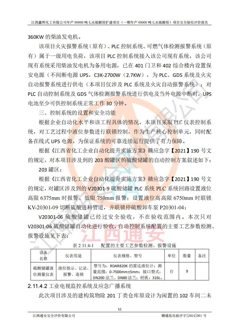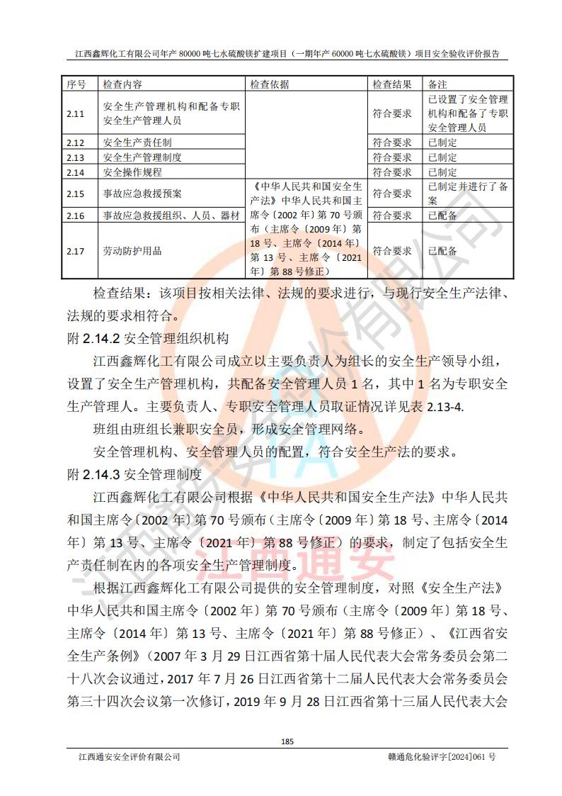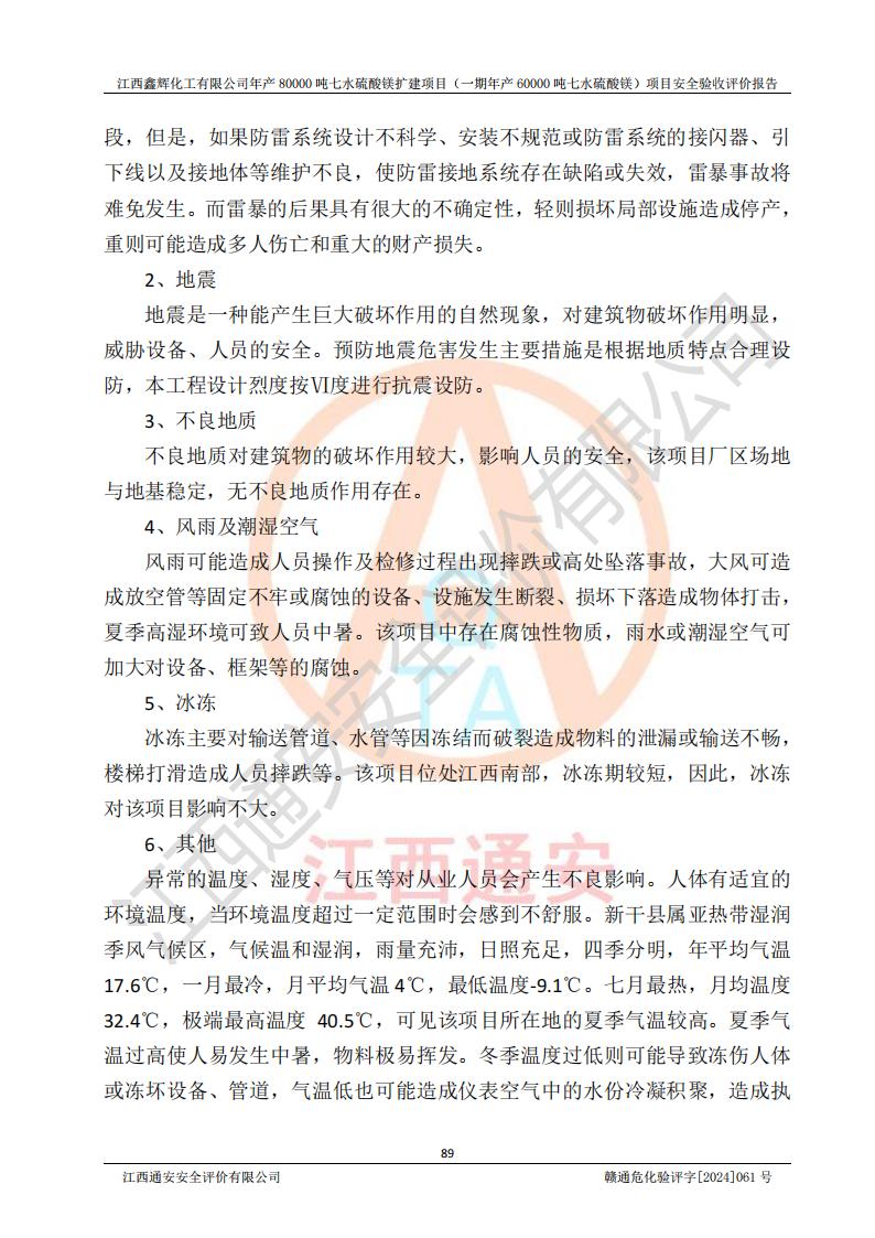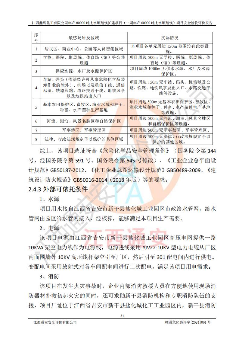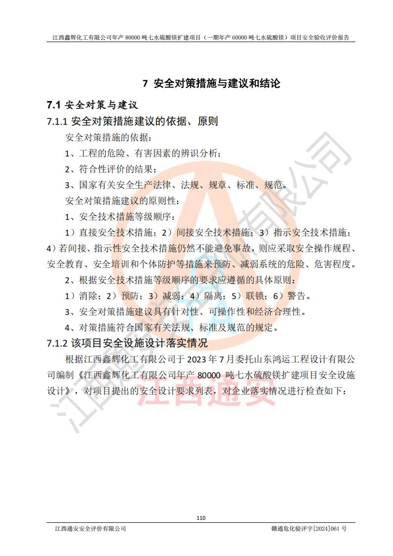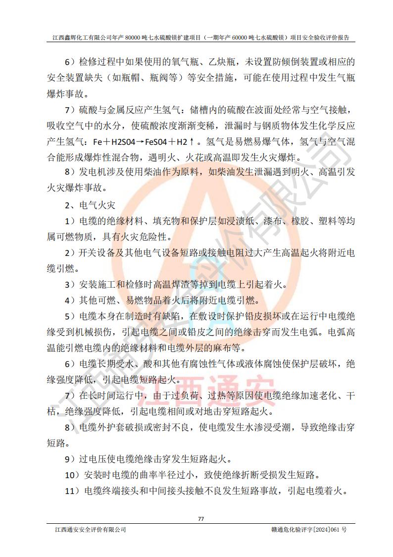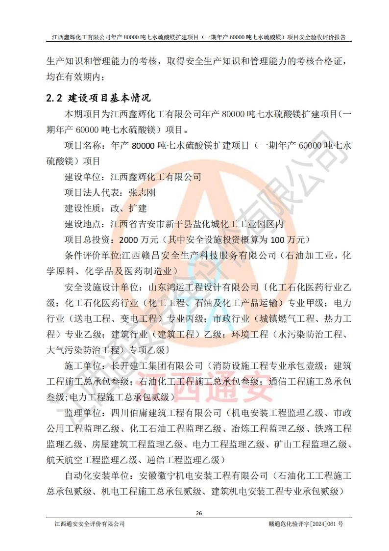 1. 江西鑫輝化工有限公司年產(chǎn)80000噸七水硫酸鎂擴(kuò)建項(xiàng)目(一期年產(chǎn)60000噸七水硫酸鎂)項(xiàng)目的安全設(shè)施與主體工程同時(shí)設(shè)計(jì)、同時(shí)施工、同時(shí)投入生產(chǎn)和使用,符合**有關(guān)建設(shè)項(xiàng)目“三同時(shí)”的規(guī)定和要求。 2. 江西鑫輝化工有限公司年產(chǎn)80000噸七水硫酸鎂擴(kuò)建項(xiàng)目(一期年產(chǎn)60000噸七水硫酸鎂)符合新干縣鹽化工業(yè)城發(fā)展規(guī)劃的布局; 3. 該項(xiàng)目現(xiàn)場情況、企業(yè)總平面布置、設(shè)備設(shè)施的布置與設(shè)計(jì)圖、竣工圖紙一致,主體工程安全設(shè)施、安全措施符合法律法規(guī)的規(guī)定和要求,安全設(shè)施正常投用并運(yùn)行**;供配電、給排水等公用工程及輔助設(shè)施滿足主體工程生產(chǎn)安全的需要;企業(yè)安全管理體系滿足生產(chǎn)安全的要求; 4. 總平面布置符合《建筑設(shè)計(jì)防火規(guī)范》GB50016-2014(2018年版)、《精細(xì)化工企業(yè)工程設(shè)計(jì)防火標(biāo)準(zhǔn)》GB51283-2020等標(biāo)準(zhǔn)、規(guī)范的要求; 5. 公司已針對(duì)本報(bào)告提出的安全隱患整改意見組織人員進(jìn)行整改,整改措施已落實(shí)到位,企業(yè)安全生產(chǎn)的風(fēng)險(xiǎn)控制在可以接受的范圍內(nèi); 6. 該項(xiàng)目采用成熟的生產(chǎn)工藝和設(shè)備,本質(zhì)安全程度較高。 7. 綜上所述:本報(bào)告認(rèn)為,江西鑫輝化工有限公司年產(chǎn)80000噸七水硫酸鎂擴(kuò)建項(xiàng)目(一期年產(chǎn)60000噸七水硫酸鎂)項(xiàng)目的生產(chǎn)裝置現(xiàn)場情況與設(shè)計(jì)圖紙一致,安全設(shè)施及安全管理符合**及有關(guān)部門關(guān)于安全生產(chǎn)法律、法規(guī)、標(biāo)準(zhǔn)的要求,安全風(fēng)險(xiǎn)是受控制的,其風(fēng)險(xiǎn)程度是可以接受的,符合安全生產(chǎn)條件,能夠滿足安全生產(chǎn)的要求,具備安全設(shè)施“三同時(shí)”驗(yàn)收條件。 |