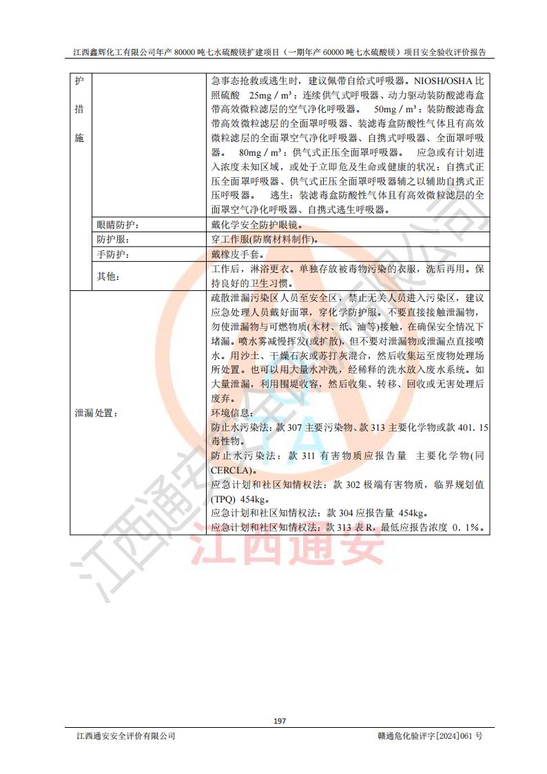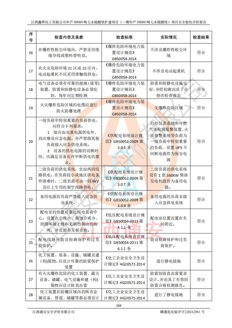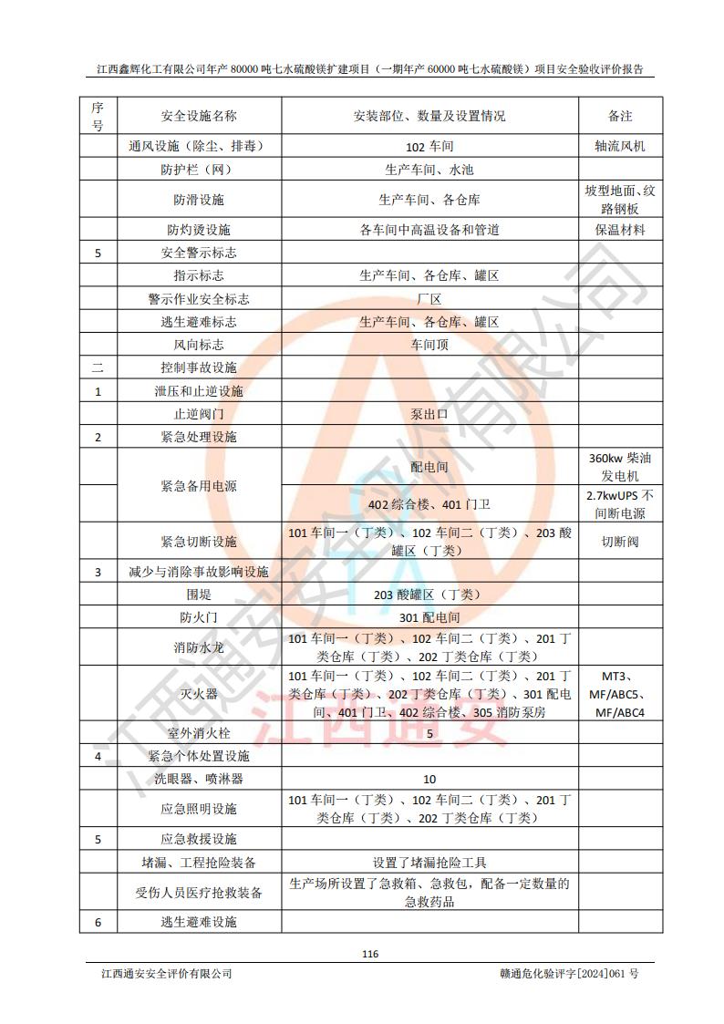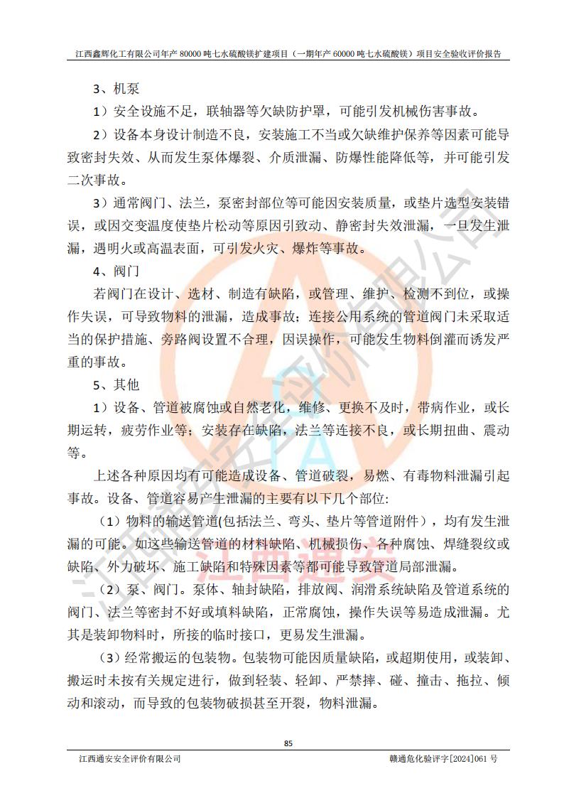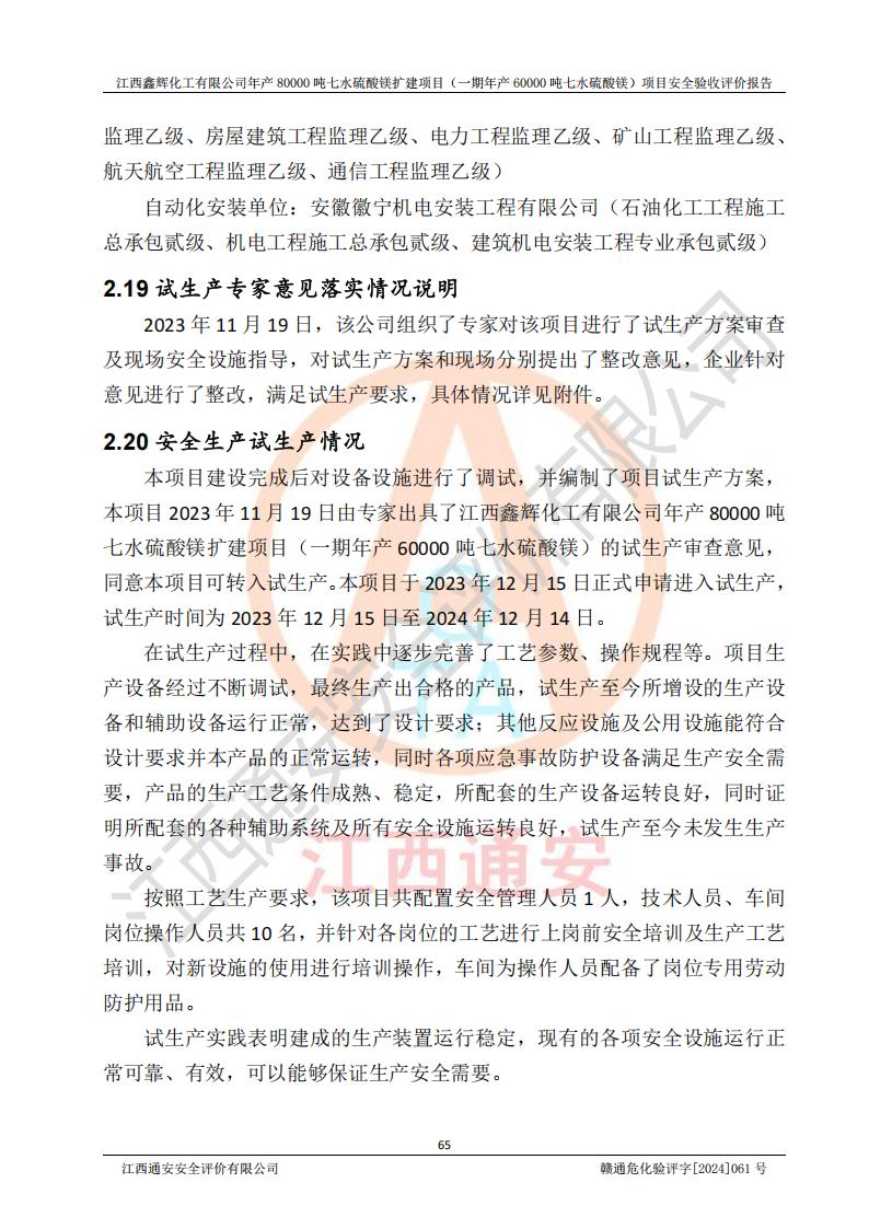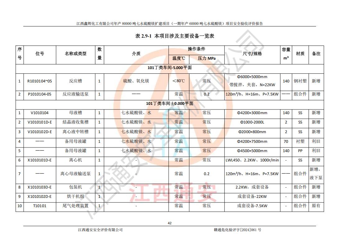 1. 江西鑫輝化工有限公司年產(chǎn)80000噸七水硫酸鎂擴(kuò)建項(xiàng)目(一期年產(chǎn)60000噸七水硫酸鎂)項(xiàng)目的安全設(shè)施與主體工程同時(shí)設(shè)計(jì)、同時(shí)施工、同時(shí)投入生產(chǎn)和使用,符合**有關(guān)建設(shè)項(xiàng)目“三同時(shí)”的規(guī)定和要求。 2. 江西鑫輝化工有限公司年產(chǎn)80000噸七水硫酸鎂擴(kuò)建項(xiàng)目(一期年產(chǎn)60000噸七水硫酸鎂)符合新干縣鹽化工業(yè)城發(fā)展規(guī)劃的布局; 3. 該項(xiàng)目現(xiàn)場情況、企業(yè)總平面布置、設(shè)備設(shè)施的布置與設(shè)計(jì)圖、竣工圖紙一致,主體工程安全設(shè)施、安全措施符合法律法規(guī)的規(guī)定和要求,安全設(shè)施正常投用并運(yùn)行**;供配電、給排水等公用工程及輔助設(shè)施滿足主體工程生產(chǎn)安全的需要;企業(yè)安全管理體系滿足生產(chǎn)安全的要求; 4. 總平面布置符合《建筑設(shè)計(jì)防火規(guī)范》GB50016-2014(2018年版)、《精細(xì)化工企業(yè)工程設(shè)計(jì)防火標(biāo)準(zhǔn)》GB51283-2020等標(biāo)準(zhǔn)、規(guī)范的要求; 5. 公司已針對(duì)本報(bào)告提出的安全隱患整改意見組織人員進(jìn)行整改,整改措施已落實(shí)到位,企業(yè)安全生產(chǎn)的風(fēng)險(xiǎn)控制在可以接受的范圍內(nèi); 6. 該項(xiàng)目采用成熟的生產(chǎn)工藝和設(shè)備,本質(zhì)安全程度較高。 7. 綜上所述:本報(bào)告認(rèn)為,江西鑫輝化工有限公司年產(chǎn)80000噸七水硫酸鎂擴(kuò)建項(xiàng)目(一期年產(chǎn)60000噸七水硫酸鎂)項(xiàng)目的生產(chǎn)裝置現(xiàn)場情況與設(shè)計(jì)圖紙一致,安全設(shè)施及安全管理符合**及有關(guān)部門關(guān)于安全生產(chǎn)法律、法規(guī)、標(biāo)準(zhǔn)的要求,安全風(fēng)險(xiǎn)是受控制的,其風(fēng)險(xiǎn)程度是可以接受的,符合安全生產(chǎn)條件,能夠滿足安全生產(chǎn)的要求,具備安全設(shè)施“三同時(shí)”驗(yàn)收條件。 |
