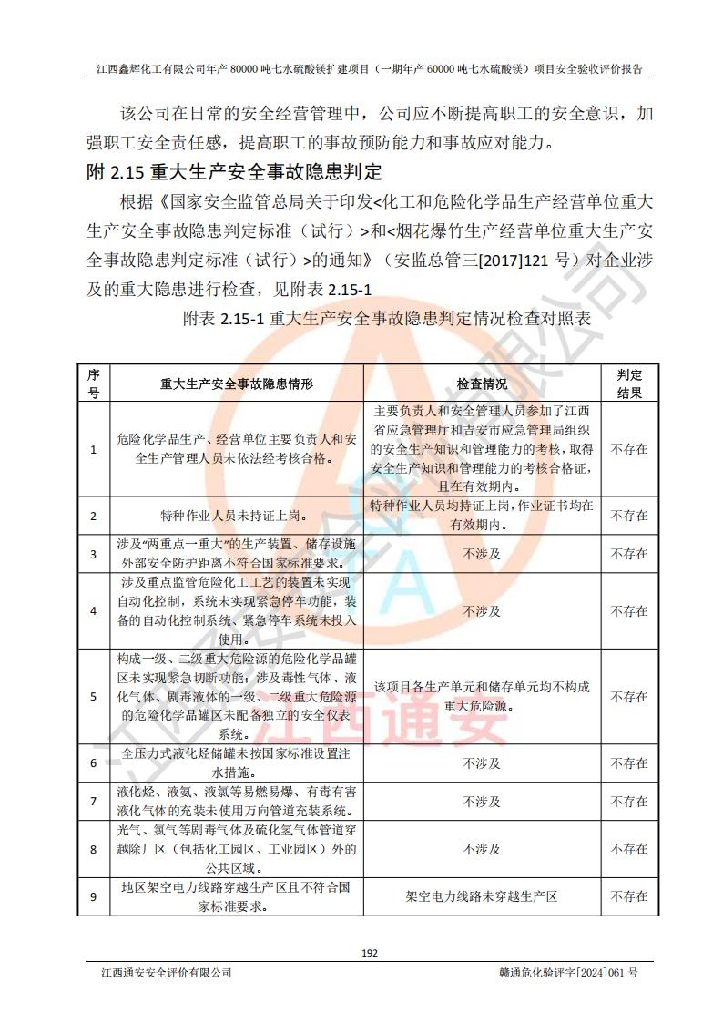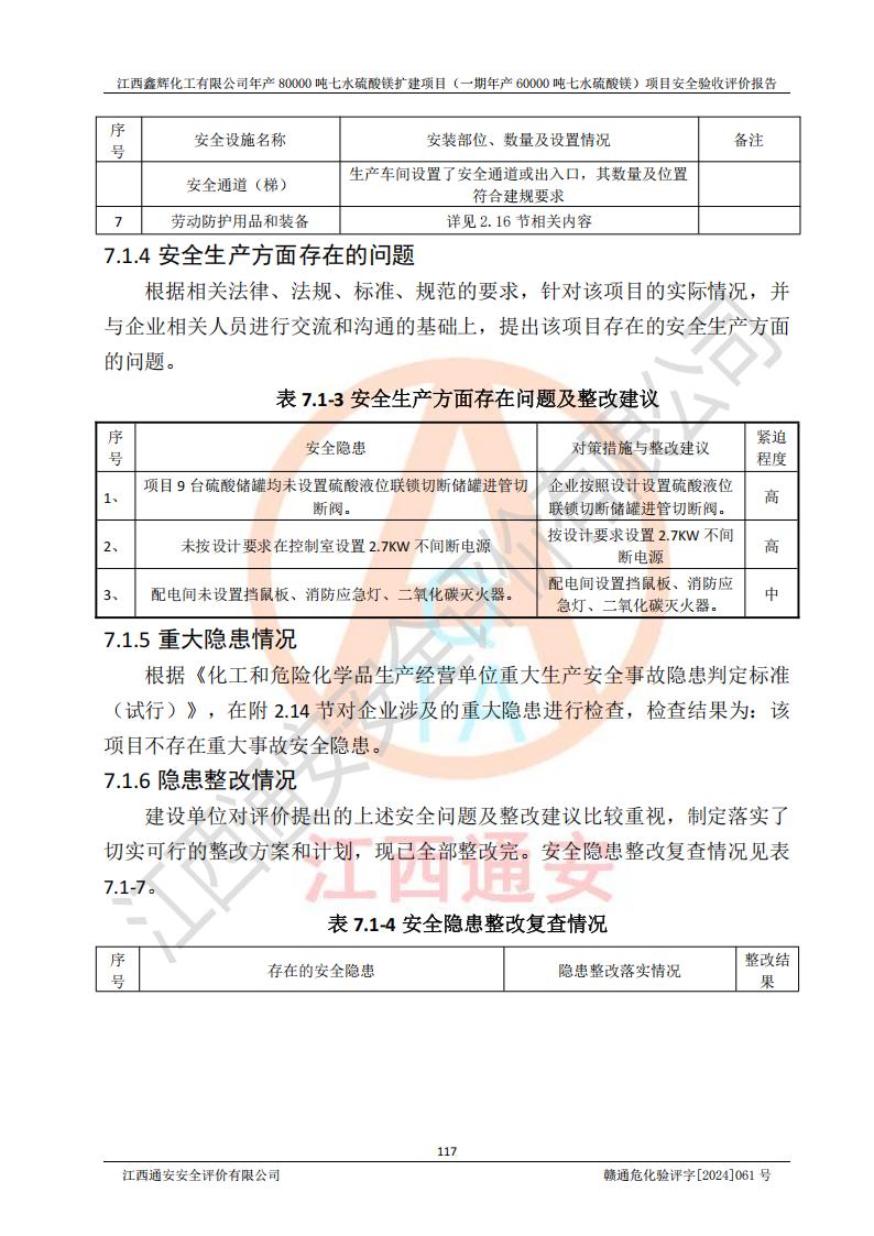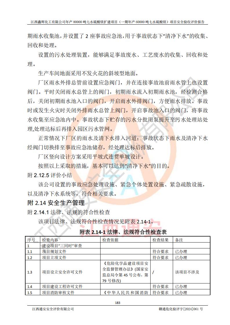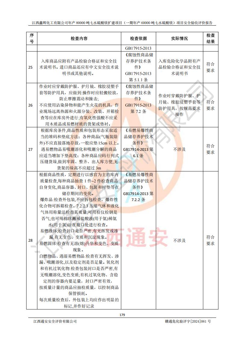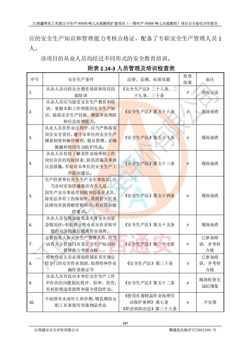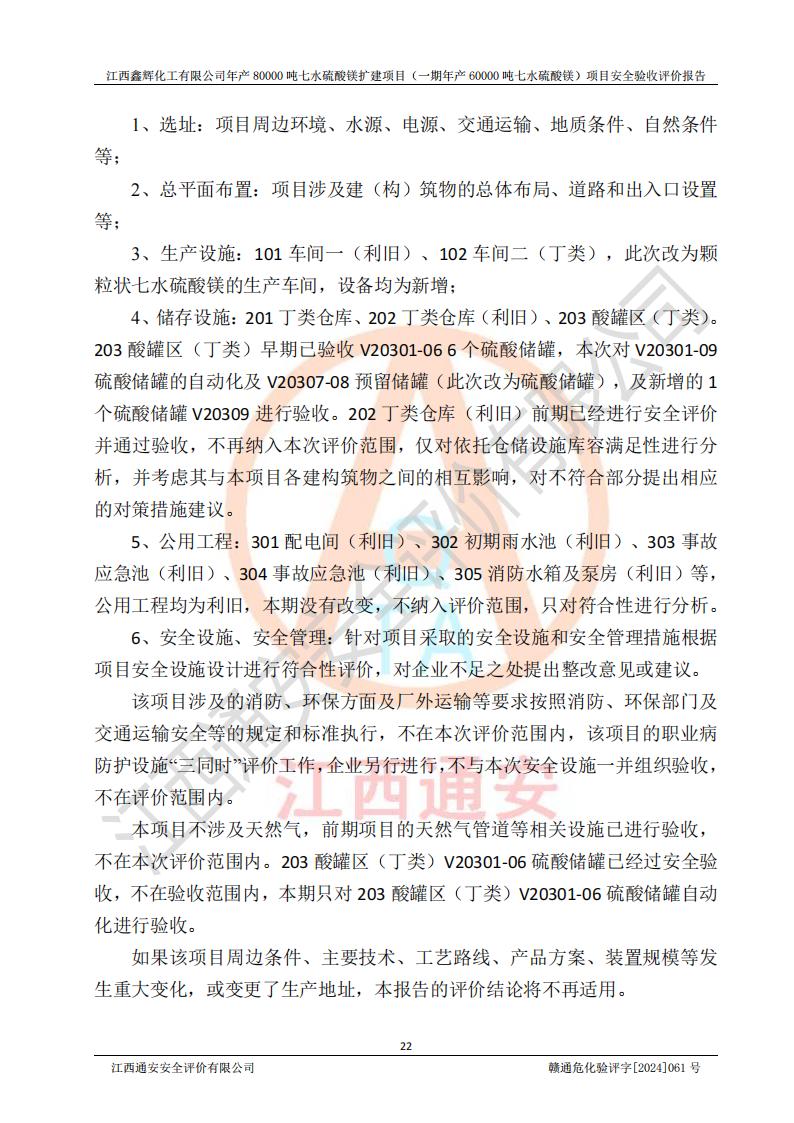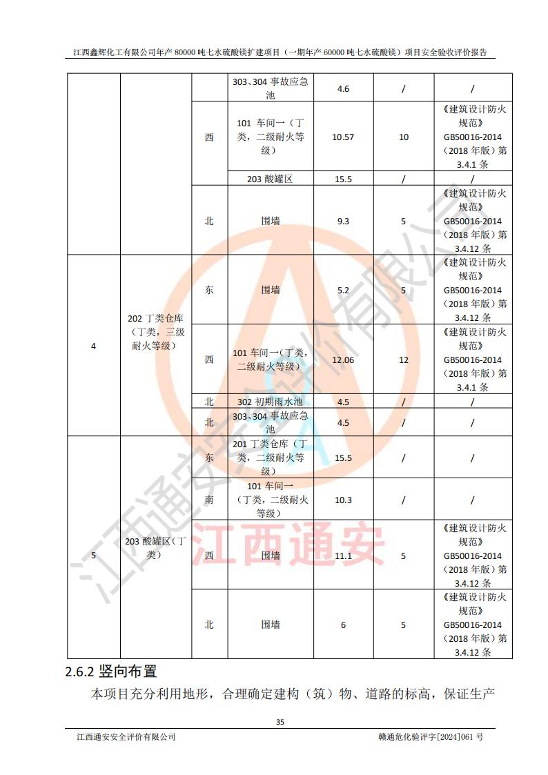 1. 江西鑫輝化工有限公司年產(chǎn)80000噸七水硫酸鎂擴(kuò)建項(xiàng)目(一期年產(chǎn)60000噸七水硫酸鎂)項(xiàng)目的安全設(shè)施與主體工程同時(shí)設(shè)計(jì)、同時(shí)施工、同時(shí)投入生產(chǎn)和使用,符合**有關(guān)建設(shè)項(xiàng)目“三同時(shí)”的規(guī)定和要求。 2. 江西鑫輝化工有限公司年產(chǎn)80000噸七水硫酸鎂擴(kuò)建項(xiàng)目(一期年產(chǎn)60000噸七水硫酸鎂)符合新干縣鹽化工業(yè)城發(fā)展規(guī)劃的布局; 3. 該項(xiàng)目現(xiàn)場情況、企業(yè)總平面布置、設(shè)備設(shè)施的布置與設(shè)計(jì)圖、竣工圖紙一致,主體工程安全設(shè)施、安全措施符合法律法規(guī)的規(guī)定和要求,安全設(shè)施正常投用并運(yùn)行**;供配電、給排水等公用工程及輔助設(shè)施滿足主體工程生產(chǎn)安全的需要;企業(yè)安全管理體系滿足生產(chǎn)安全的要求; 4. 總平面布置符合《建筑設(shè)計(jì)防火規(guī)范》GB50016-2014(2018年版)、《精細(xì)化工企業(yè)工程設(shè)計(jì)防火標(biāo)準(zhǔn)》GB51283-2020等標(biāo)準(zhǔn)、規(guī)范的要求; 5. 公司已針對(duì)本報(bào)告提出的安全隱患整改意見組織人員進(jìn)行整改,整改措施已落實(shí)到位,企業(yè)安全生產(chǎn)的風(fēng)險(xiǎn)控制在可以接受的范圍內(nèi); 6. 該項(xiàng)目采用成熟的生產(chǎn)工藝和設(shè)備,本質(zhì)安全程度較高。 7. 綜上所述:本報(bào)告認(rèn)為,江西鑫輝化工有限公司年產(chǎn)80000噸七水硫酸鎂擴(kuò)建項(xiàng)目(一期年產(chǎn)60000噸七水硫酸鎂)項(xiàng)目的生產(chǎn)裝置現(xiàn)場情況與設(shè)計(jì)圖紙一致,安全設(shè)施及安全管理符合**及有關(guān)部門關(guān)于安全生產(chǎn)法律、法規(guī)、標(biāo)準(zhǔn)的要求,安全風(fēng)險(xiǎn)是受控制的,其風(fēng)險(xiǎn)程度是可以接受的,符合安全生產(chǎn)條件,能夠滿足安全生產(chǎn)的要求,具備安全設(shè)施“三同時(shí)”驗(yàn)收條件。 |