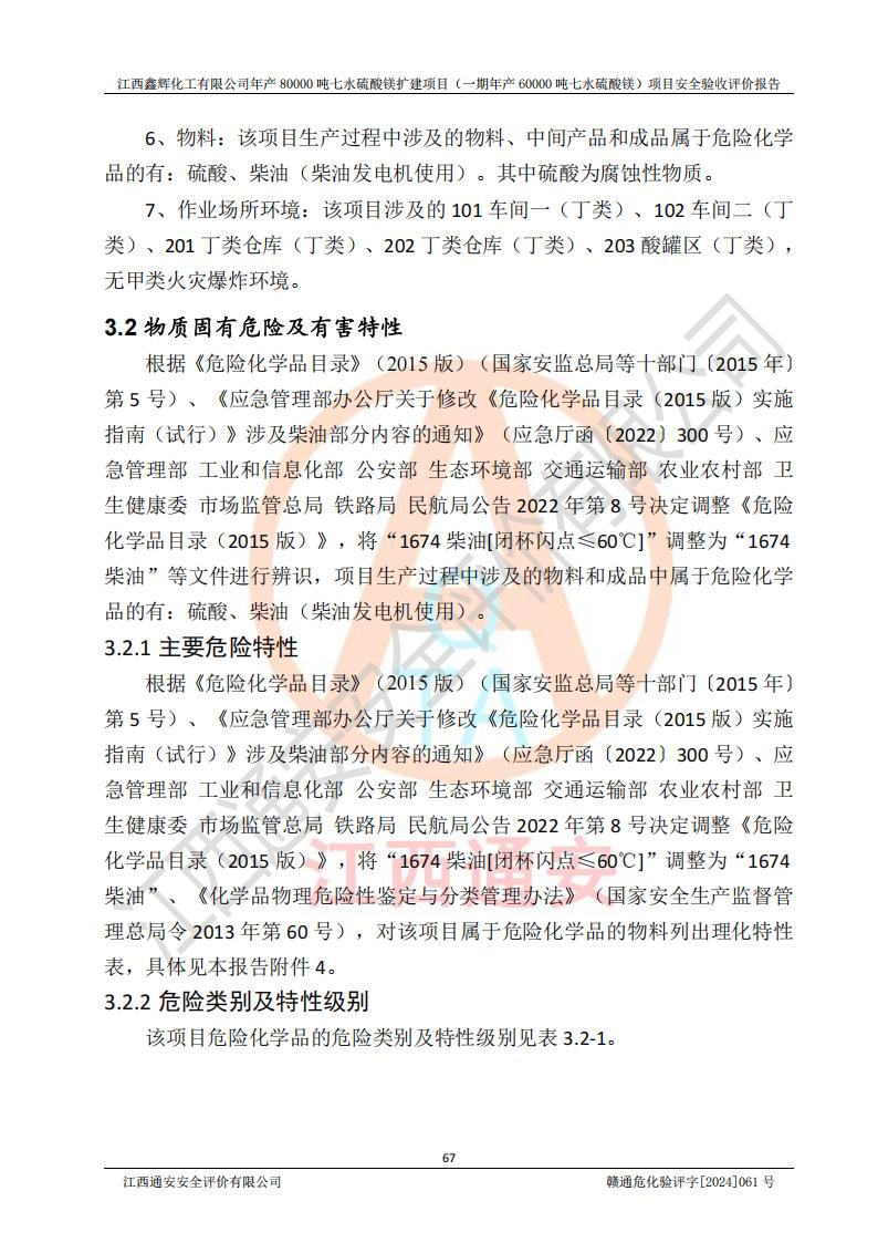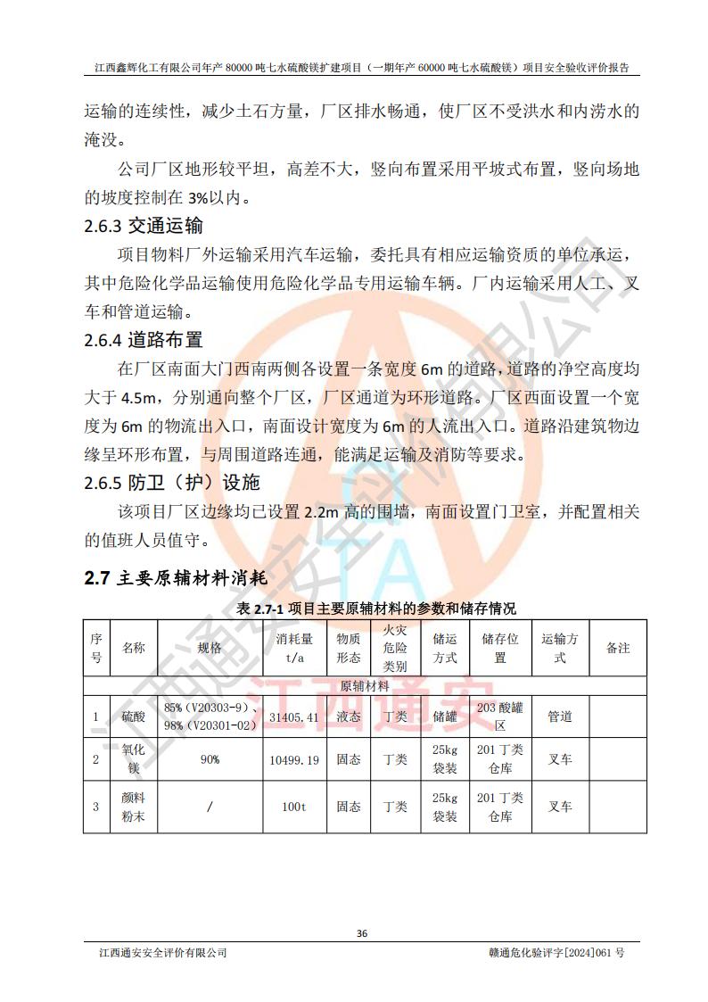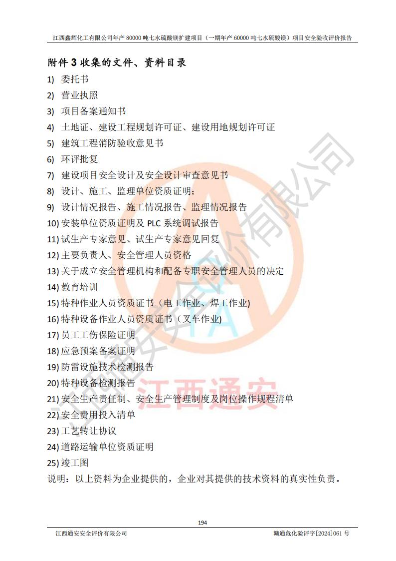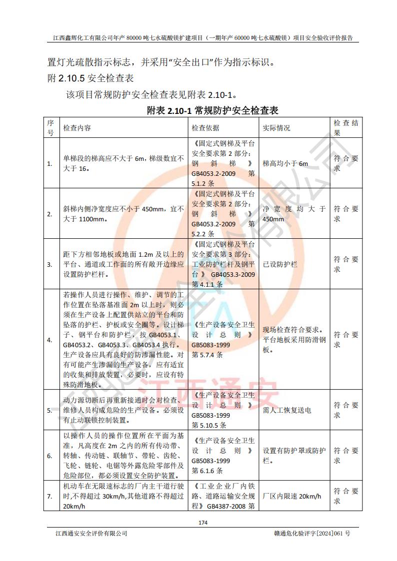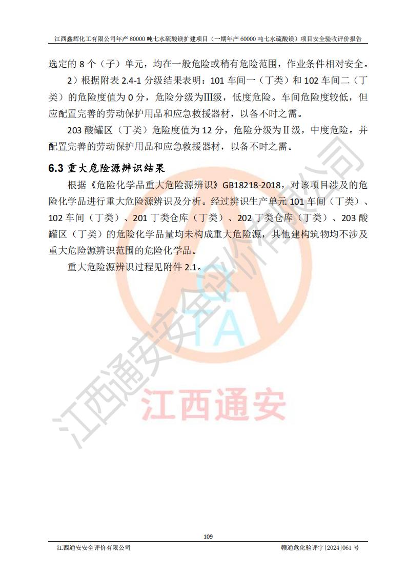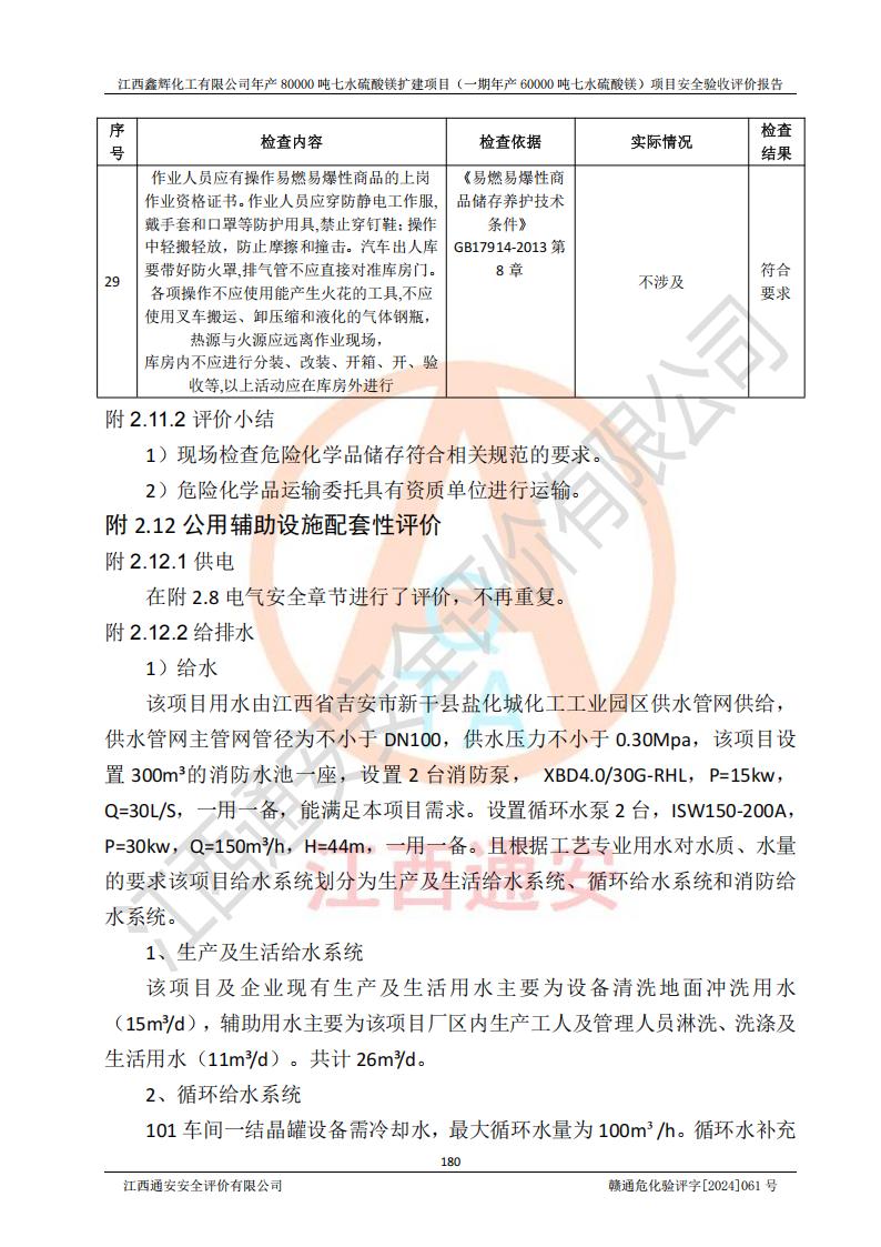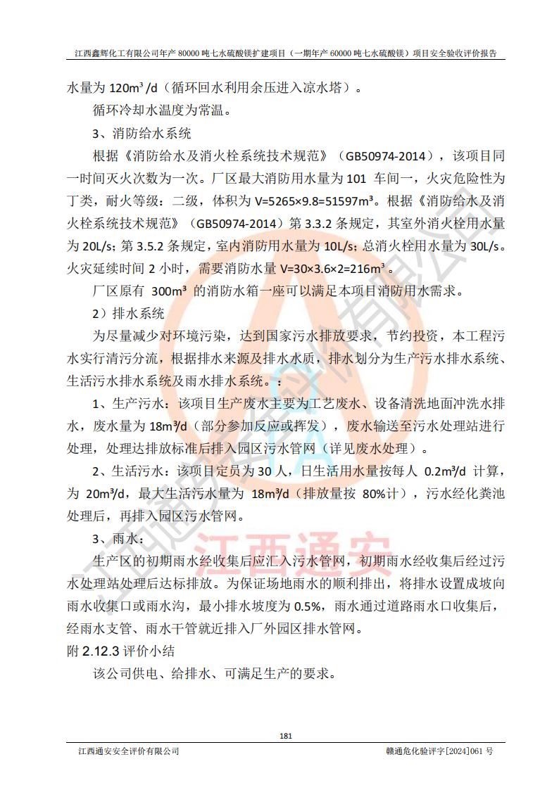 1. 江西鑫輝化工有限公司年產(chǎn)80000噸七水硫酸鎂擴(kuò)建項(xiàng)目(一期年產(chǎn)60000噸七水硫酸鎂)項(xiàng)目的安全設(shè)施與主體工程同時(shí)設(shè)計(jì)、同時(shí)施工、同時(shí)投入生產(chǎn)和使用,符合**有關(guān)建設(shè)項(xiàng)目“三同時(shí)”的規(guī)定和要求。 2. 江西鑫輝化工有限公司年產(chǎn)80000噸七水硫酸鎂擴(kuò)建項(xiàng)目(一期年產(chǎn)60000噸七水硫酸鎂)符合新干縣鹽化工業(yè)城發(fā)展規(guī)劃的布局; 3. 該項(xiàng)目現(xiàn)場情況、企業(yè)總平面布置、設(shè)備設(shè)施的布置與設(shè)計(jì)圖、竣工圖紙一致,主體工程安全設(shè)施、安全措施符合法律法規(guī)的規(guī)定和要求,安全設(shè)施正常投用并運(yùn)行**;供配電、給排水等公用工程及輔助設(shè)施滿足主體工程生產(chǎn)安全的需要;企業(yè)安全管理體系滿足生產(chǎn)安全的要求; 4. 總平面布置符合《建筑設(shè)計(jì)防火規(guī)范》GB50016-2014(2018年版)、《精細(xì)化工企業(yè)工程設(shè)計(jì)防火標(biāo)準(zhǔn)》GB51283-2020等標(biāo)準(zhǔn)、規(guī)范的要求; 5. 公司已針對(duì)本報(bào)告提出的安全隱患整改意見組織人員進(jìn)行整改,整改措施已落實(shí)到位,企業(yè)安全生產(chǎn)的風(fēng)險(xiǎn)控制在可以接受的范圍內(nèi); 6. 該項(xiàng)目采用成熟的生產(chǎn)工藝和設(shè)備,本質(zhì)安全程度較高。 7. 綜上所述:本報(bào)告認(rèn)為,江西鑫輝化工有限公司年產(chǎn)80000噸七水硫酸鎂擴(kuò)建項(xiàng)目(一期年產(chǎn)60000噸七水硫酸鎂)項(xiàng)目的生產(chǎn)裝置現(xiàn)場情況與設(shè)計(jì)圖紙一致,安全設(shè)施及安全管理符合**及有關(guān)部門關(guān)于安全生產(chǎn)法律、法規(guī)、標(biāo)準(zhǔn)的要求,安全風(fēng)險(xiǎn)是受控制的,其風(fēng)險(xiǎn)程度是可以接受的,符合安全生產(chǎn)條件,能夠滿足安全生產(chǎn)的要求,具備安全設(shè)施“三同時(shí)”驗(yàn)收條件。 |