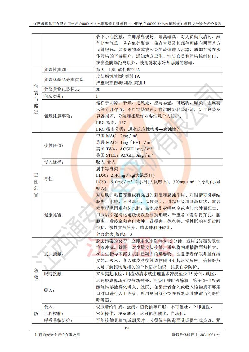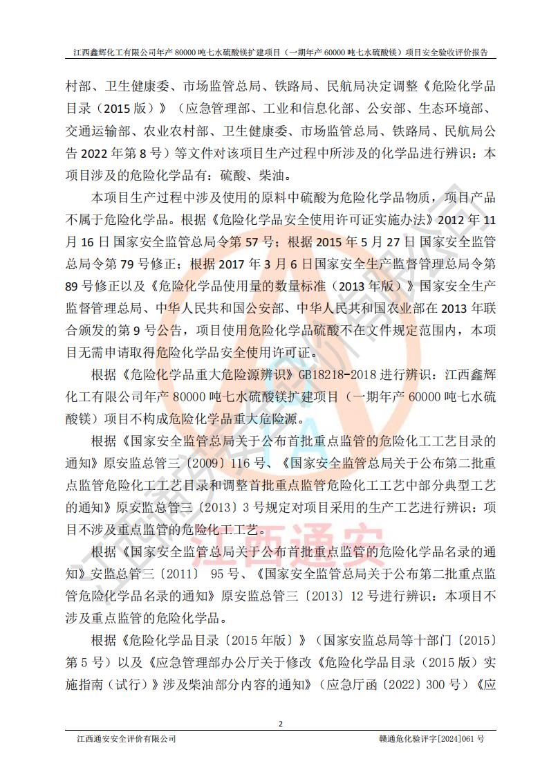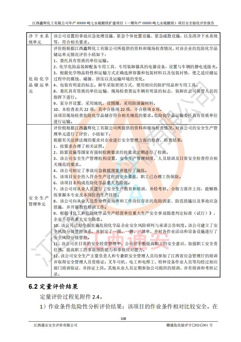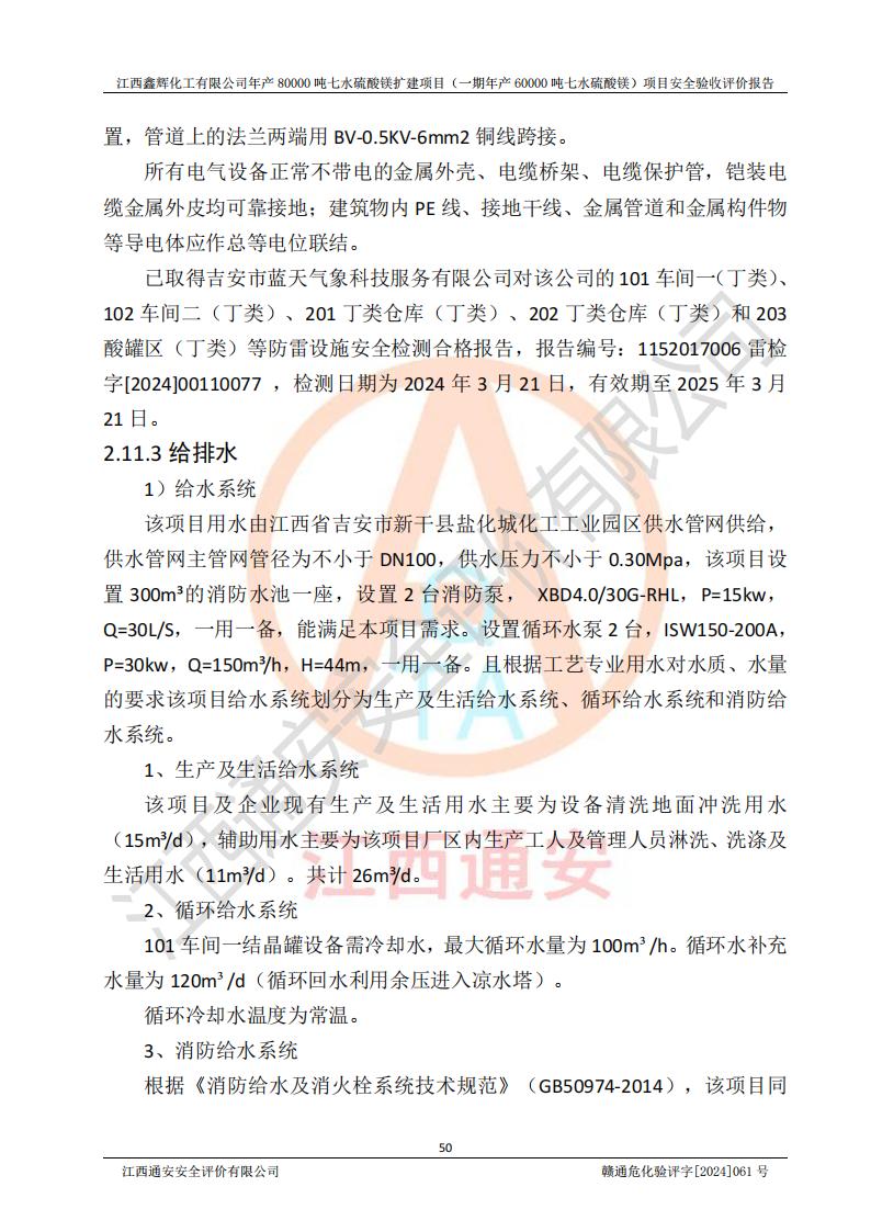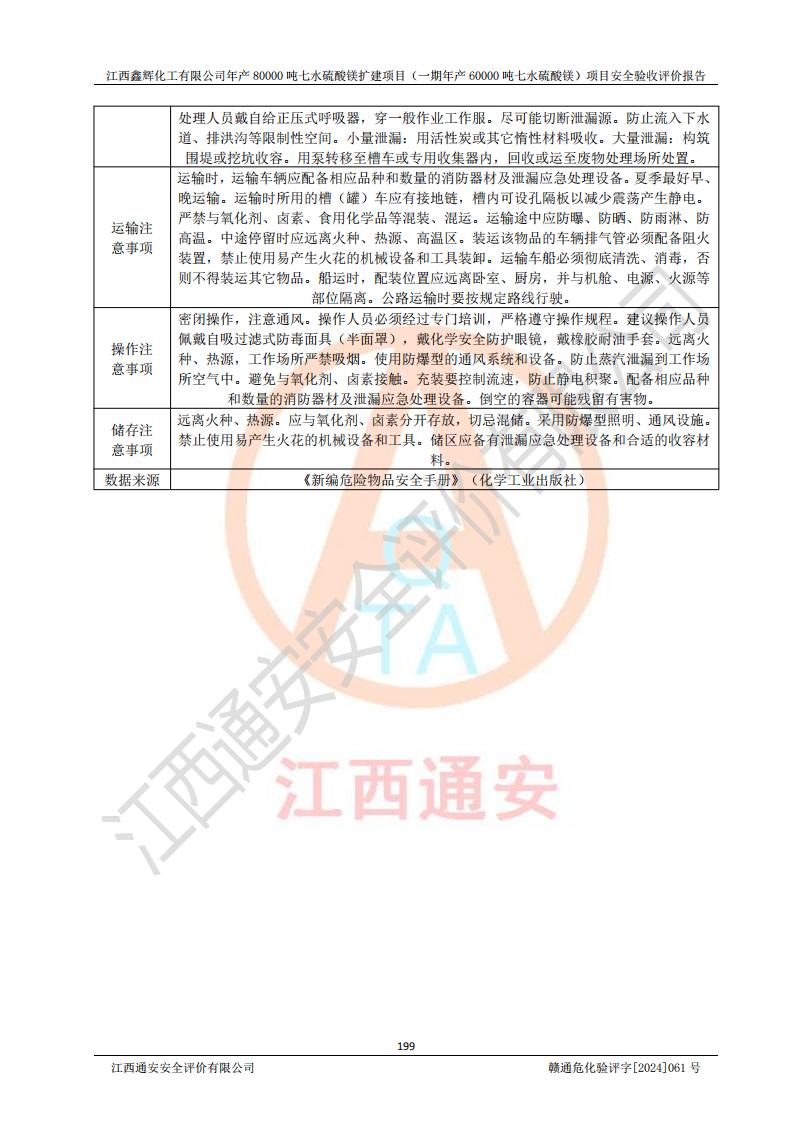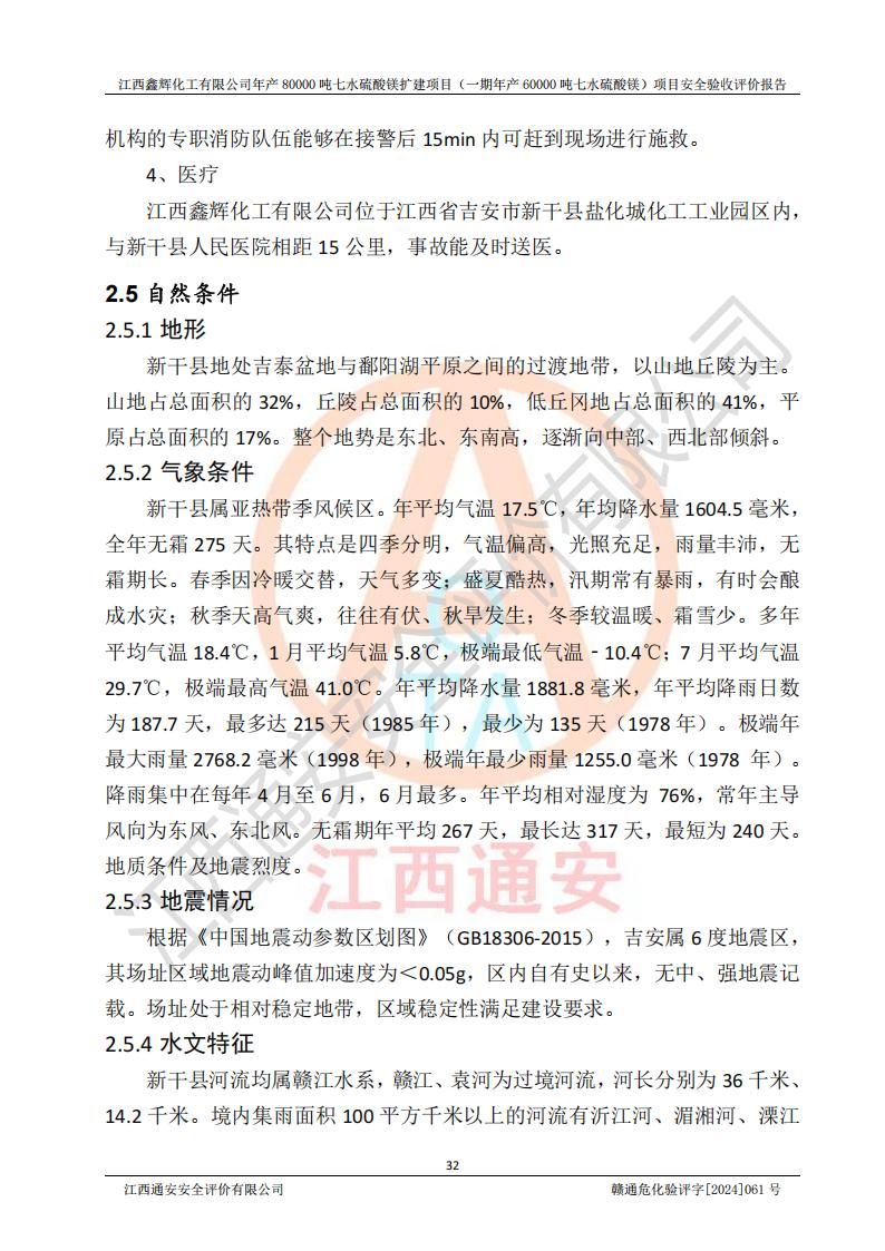 1. 江西鑫輝化工有限公司年產(chǎn)80000噸七水硫酸鎂擴(kuò)建項(xiàng)目(一期年產(chǎn)60000噸七水硫酸鎂)項(xiàng)目的安全設(shè)施與主體工程同時(shí)設(shè)計(jì)、同時(shí)施工、同時(shí)投入生產(chǎn)和使用,符合**有關(guān)建設(shè)項(xiàng)目“三同時(shí)”的規(guī)定和要求。 2. 江西鑫輝化工有限公司年產(chǎn)80000噸七水硫酸鎂擴(kuò)建項(xiàng)目(一期年產(chǎn)60000噸七水硫酸鎂)符合新干縣鹽化工業(yè)城發(fā)展規(guī)劃的布局; 3. 該項(xiàng)目現(xiàn)場情況、企業(yè)總平面布置、設(shè)備設(shè)施的布置與設(shè)計(jì)圖、竣工圖紙一致,主體工程安全設(shè)施、安全措施符合法律法規(guī)的規(guī)定和要求,安全設(shè)施正常投用并運(yùn)行**;供配電、給排水等公用工程及輔助設(shè)施滿足主體工程生產(chǎn)安全的需要;企業(yè)安全管理體系滿足生產(chǎn)安全的要求; 4. 總平面布置符合《建筑設(shè)計(jì)防火規(guī)范》GB50016-2014(2018年版)、《精細(xì)化工企業(yè)工程設(shè)計(jì)防火標(biāo)準(zhǔn)》GB51283-2020等標(biāo)準(zhǔn)、規(guī)范的要求; 5. 公司已針對(duì)本報(bào)告提出的安全隱患整改意見組織人員進(jìn)行整改,整改措施已落實(shí)到位,企業(yè)安全生產(chǎn)的風(fēng)險(xiǎn)控制在可以接受的范圍內(nèi); 6. 該項(xiàng)目采用成熟的生產(chǎn)工藝和設(shè)備,本質(zhì)安全程度較高。 7. 綜上所述:本報(bào)告認(rèn)為,江西鑫輝化工有限公司年產(chǎn)80000噸七水硫酸鎂擴(kuò)建項(xiàng)目(一期年產(chǎn)60000噸七水硫酸鎂)項(xiàng)目的生產(chǎn)裝置現(xiàn)場情況與設(shè)計(jì)圖紙一致,安全設(shè)施及安全管理符合**及有關(guān)部門關(guān)于安全生產(chǎn)法律、法規(guī)、標(biāo)準(zhǔn)的要求,安全風(fēng)險(xiǎn)是受控制的,其風(fēng)險(xiǎn)程度是可以接受的,符合安全生產(chǎn)條件,能夠滿足安全生產(chǎn)的要求,具備安全設(shè)施“三同時(shí)”驗(yàn)收條件。 |