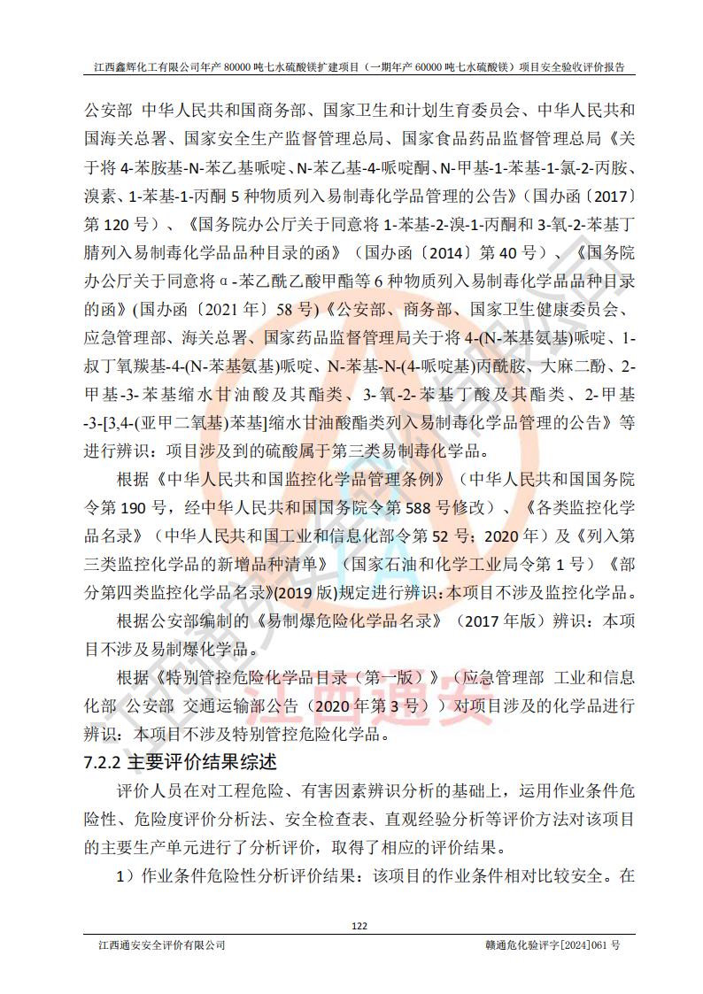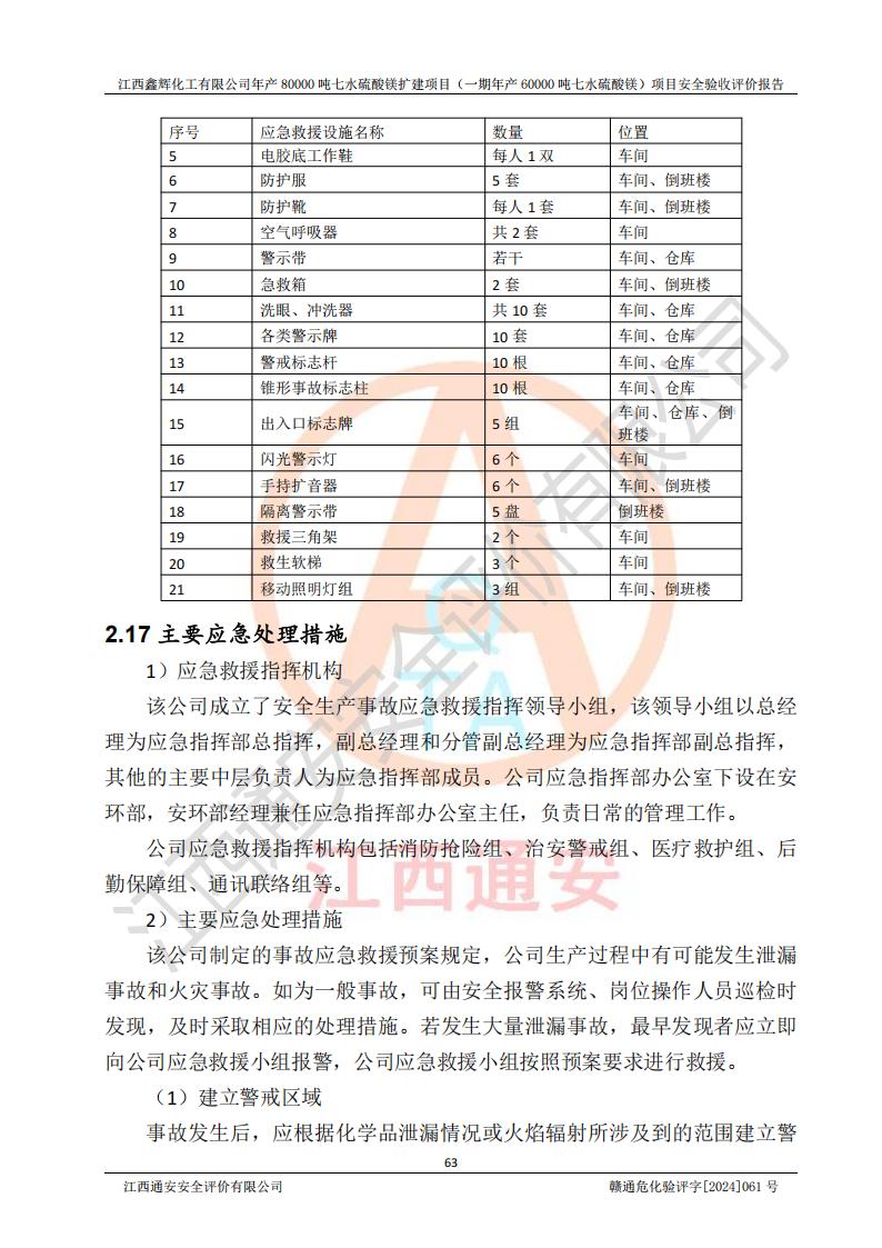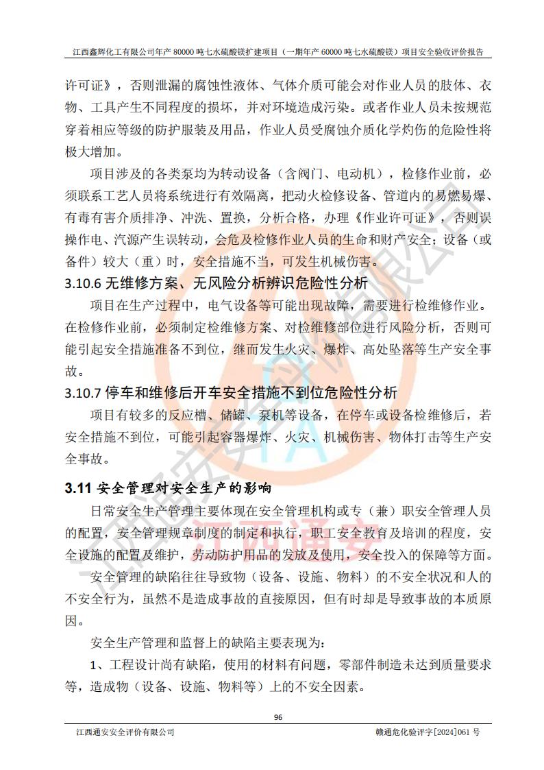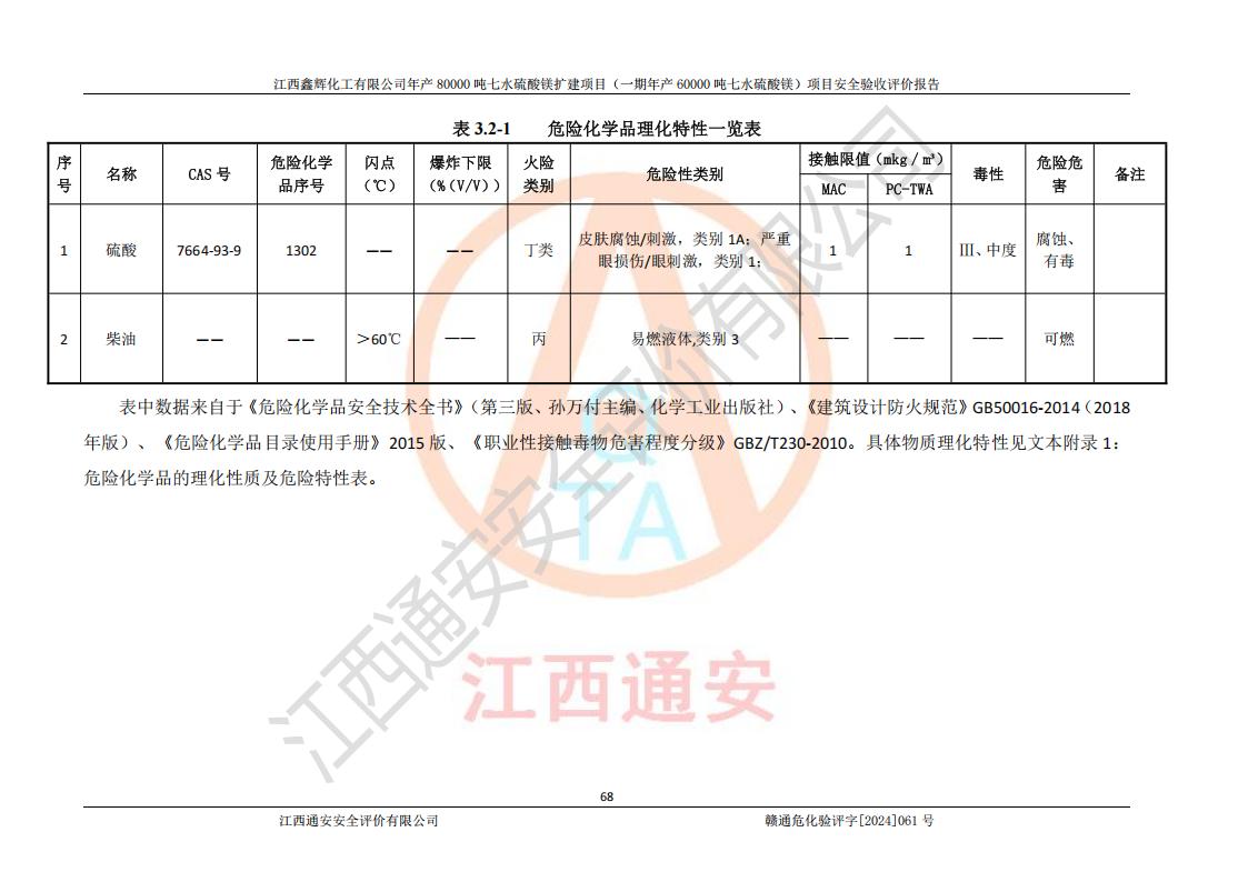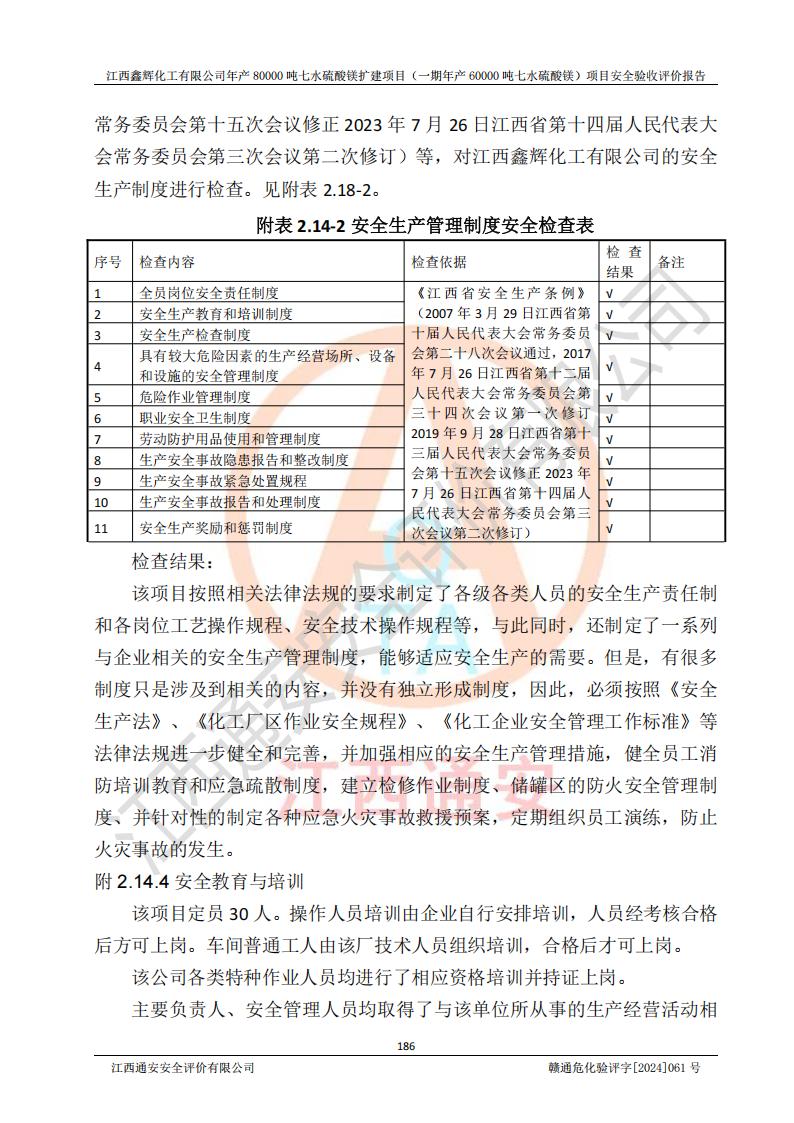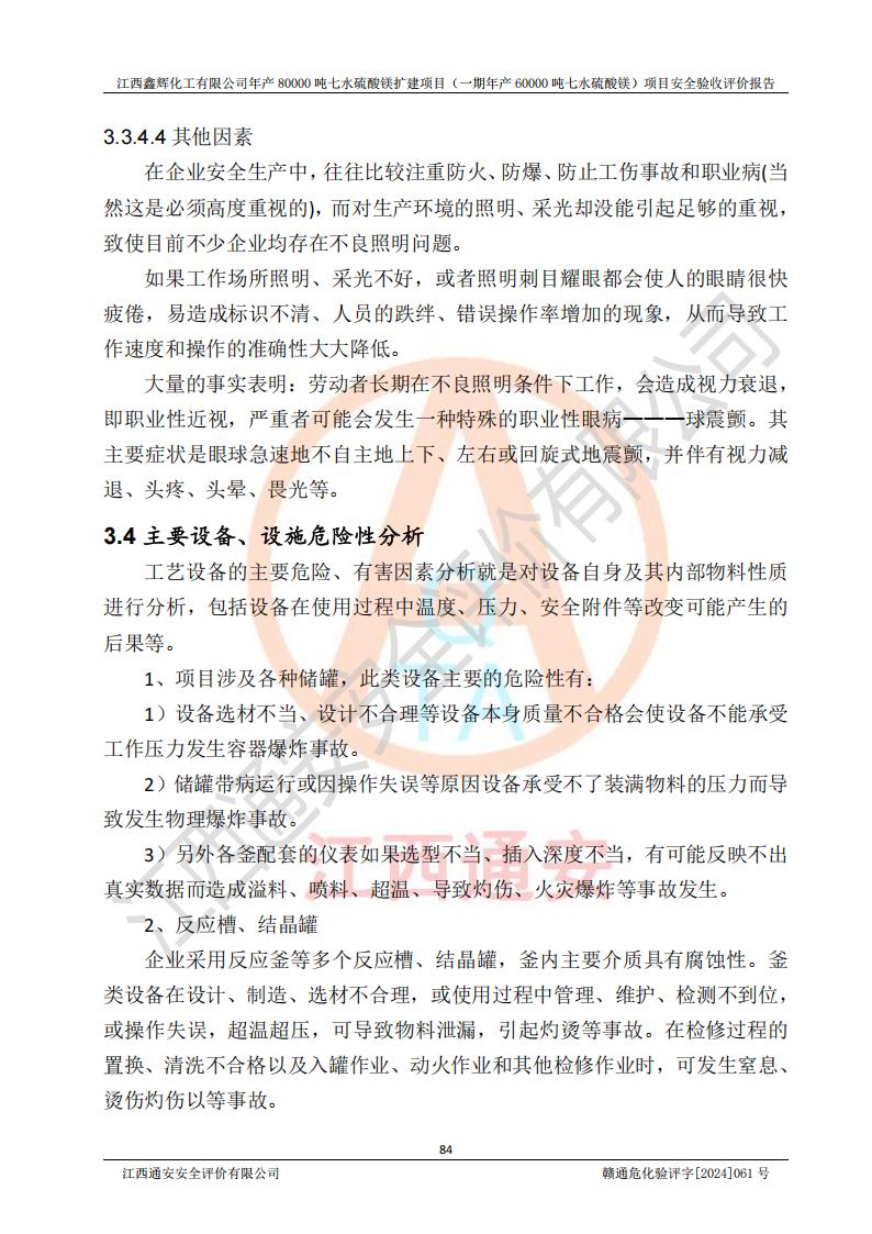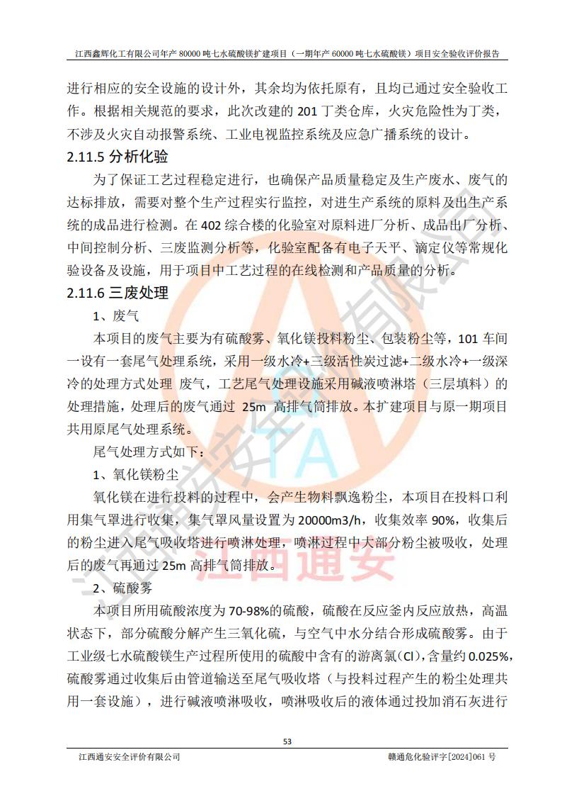 1. 江西鑫輝化工有限公司年產(chǎn)80000噸七水硫酸鎂擴(kuò)建項(xiàng)目(一期年產(chǎn)60000噸七水硫酸鎂)項(xiàng)目的安全設(shè)施與主體工程同時(shí)設(shè)計(jì)、同時(shí)施工、同時(shí)投入生產(chǎn)和使用,符合**有關(guān)建設(shè)項(xiàng)目“三同時(shí)”的規(guī)定和要求。 2. 江西鑫輝化工有限公司年產(chǎn)80000噸七水硫酸鎂擴(kuò)建項(xiàng)目(一期年產(chǎn)60000噸七水硫酸鎂)符合新干縣鹽化工業(yè)城發(fā)展規(guī)劃的布局; 3. 該項(xiàng)目現(xiàn)場情況、企業(yè)總平面布置、設(shè)備設(shè)施的布置與設(shè)計(jì)圖、竣工圖紙一致,主體工程安全設(shè)施、安全措施符合法律法規(guī)的規(guī)定和要求,安全設(shè)施正常投用并運(yùn)行**;供配電、給排水等公用工程及輔助設(shè)施滿足主體工程生產(chǎn)安全的需要;企業(yè)安全管理體系滿足生產(chǎn)安全的要求; 4. 總平面布置符合《建筑設(shè)計(jì)防火規(guī)范》GB50016-2014(2018年版)、《精細(xì)化工企業(yè)工程設(shè)計(jì)防火標(biāo)準(zhǔn)》GB51283-2020等標(biāo)準(zhǔn)、規(guī)范的要求; 5. 公司已針對(duì)本報(bào)告提出的安全隱患整改意見組織人員進(jìn)行整改,整改措施已落實(shí)到位,企業(yè)安全生產(chǎn)的風(fēng)險(xiǎn)控制在可以接受的范圍內(nèi); 6. 該項(xiàng)目采用成熟的生產(chǎn)工藝和設(shè)備,本質(zhì)安全程度較高。 7. 綜上所述:本報(bào)告認(rèn)為,江西鑫輝化工有限公司年產(chǎn)80000噸七水硫酸鎂擴(kuò)建項(xiàng)目(一期年產(chǎn)60000噸七水硫酸鎂)項(xiàng)目的生產(chǎn)裝置現(xiàn)場情況與設(shè)計(jì)圖紙一致,安全設(shè)施及安全管理符合**及有關(guān)部門關(guān)于安全生產(chǎn)法律、法規(guī)、標(biāo)準(zhǔn)的要求,安全風(fēng)險(xiǎn)是受控制的,其風(fēng)險(xiǎn)程度是可以接受的,符合安全生產(chǎn)條件,能夠滿足安全生產(chǎn)的要求,具備安全設(shè)施“三同時(shí)”驗(yàn)收條件。 |